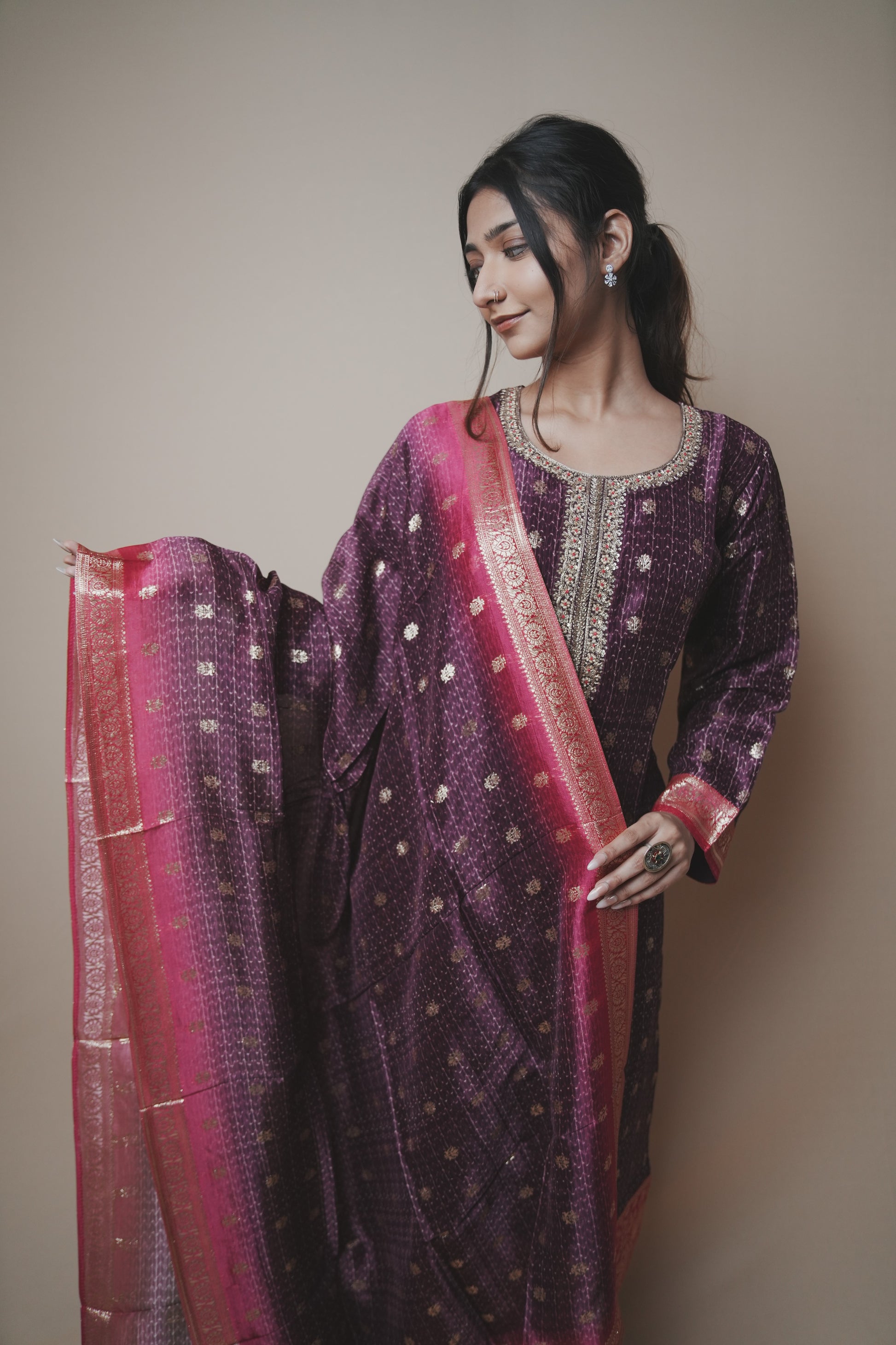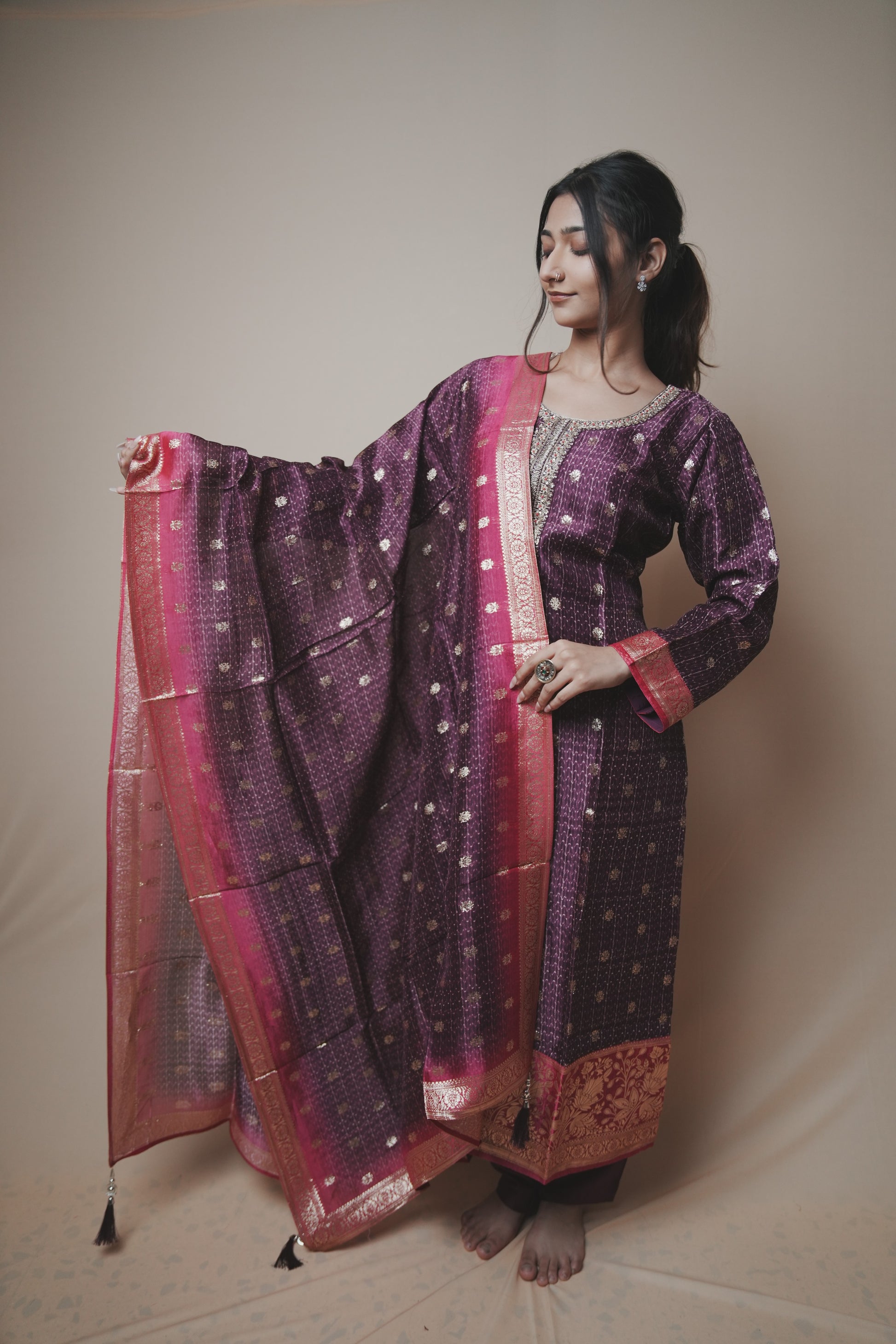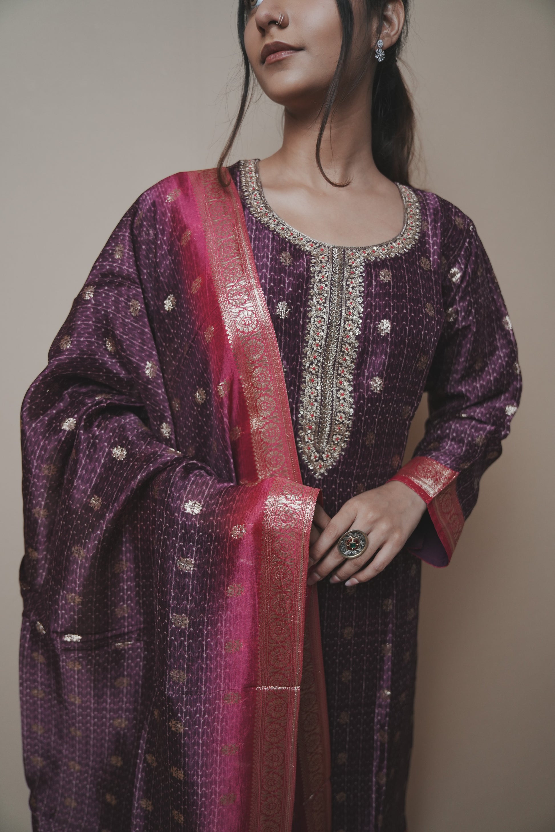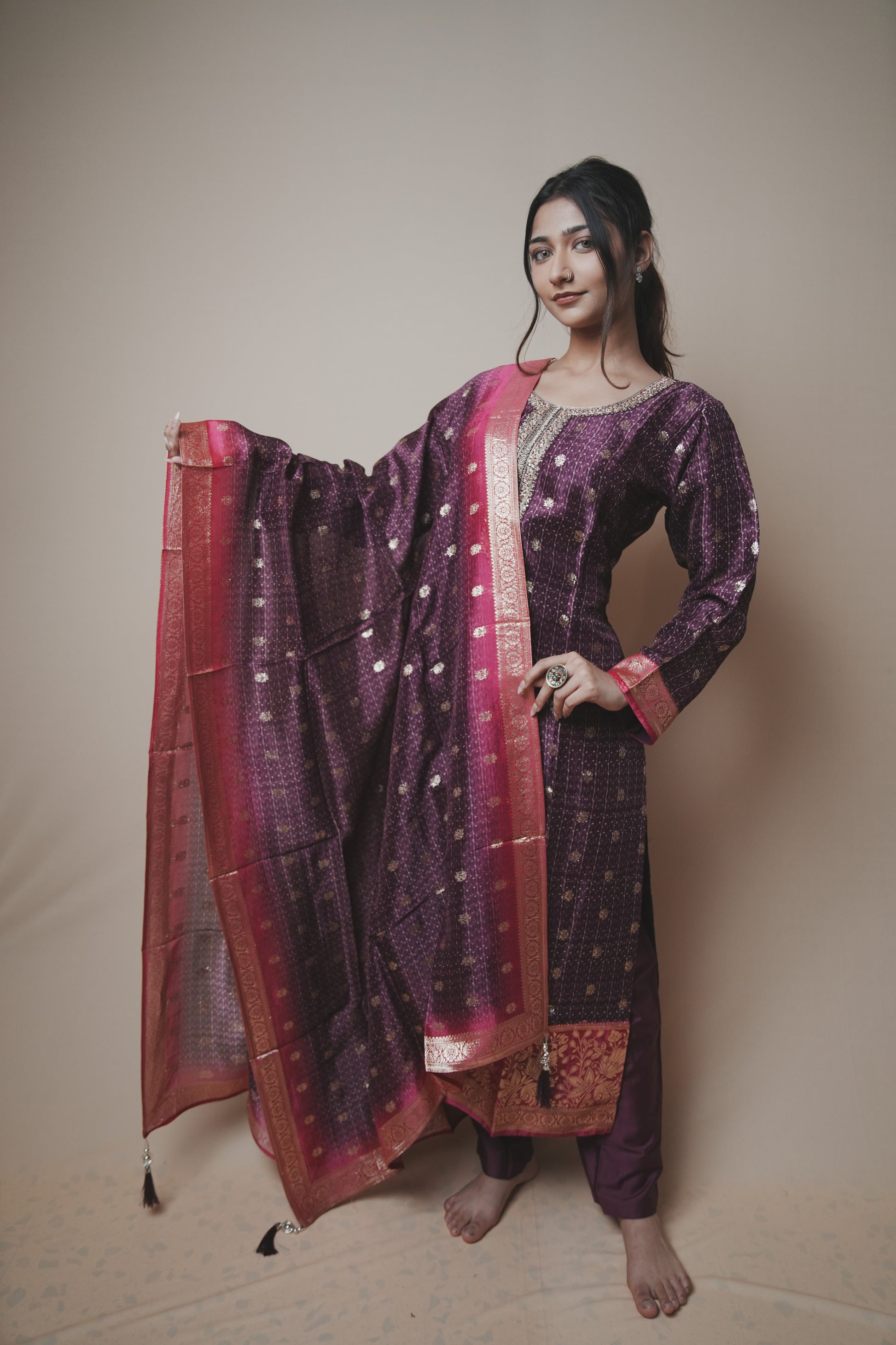 Step into elegance with this Banarasi straight Punjabi suit featuring a delicately handworked neckline. The rich fabric lends a regal touch, while the straight-cut design ensures a flattering silhouette. Perfect for festive gatherings, traditional functions, or cultural celebrations.