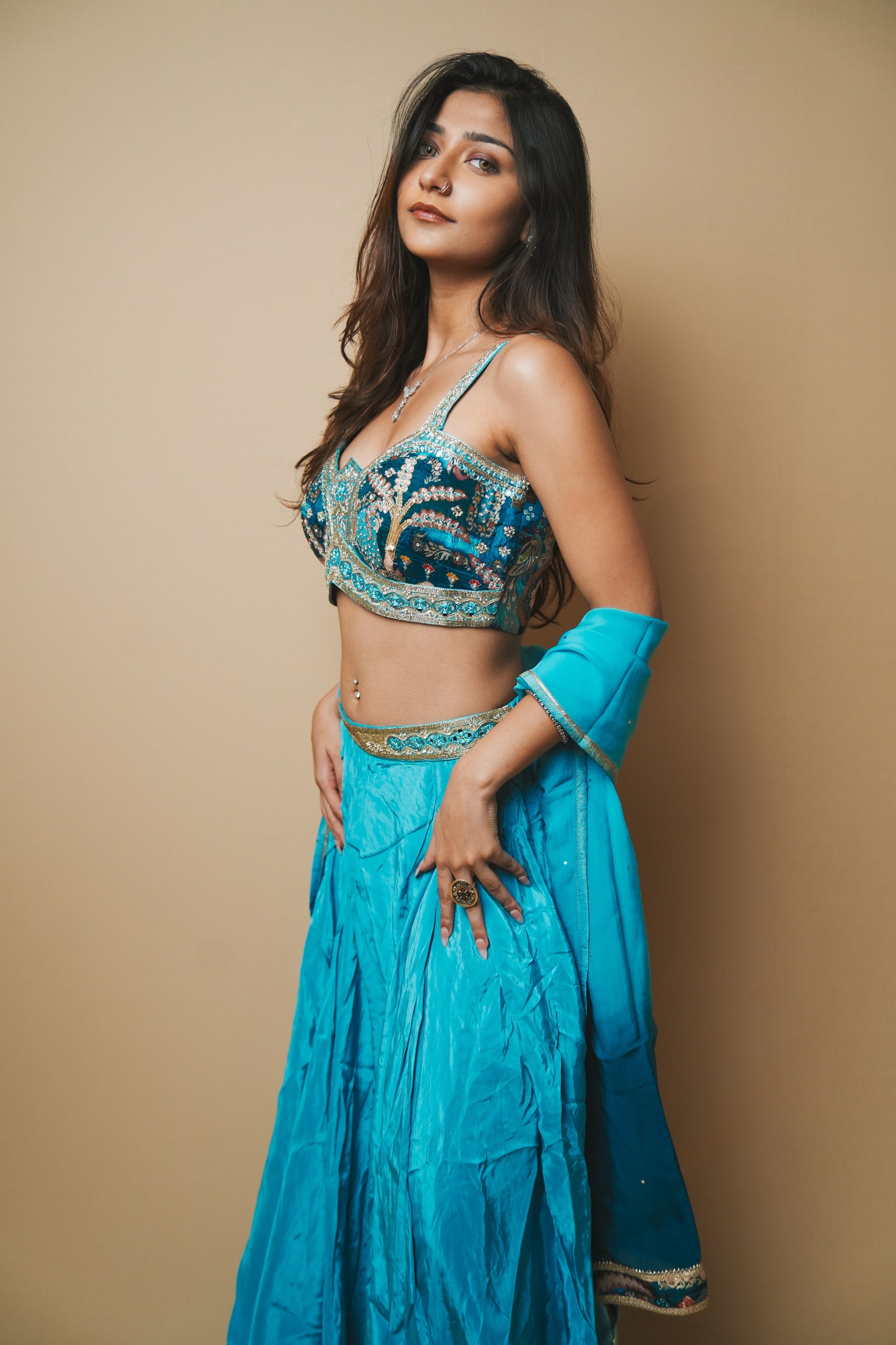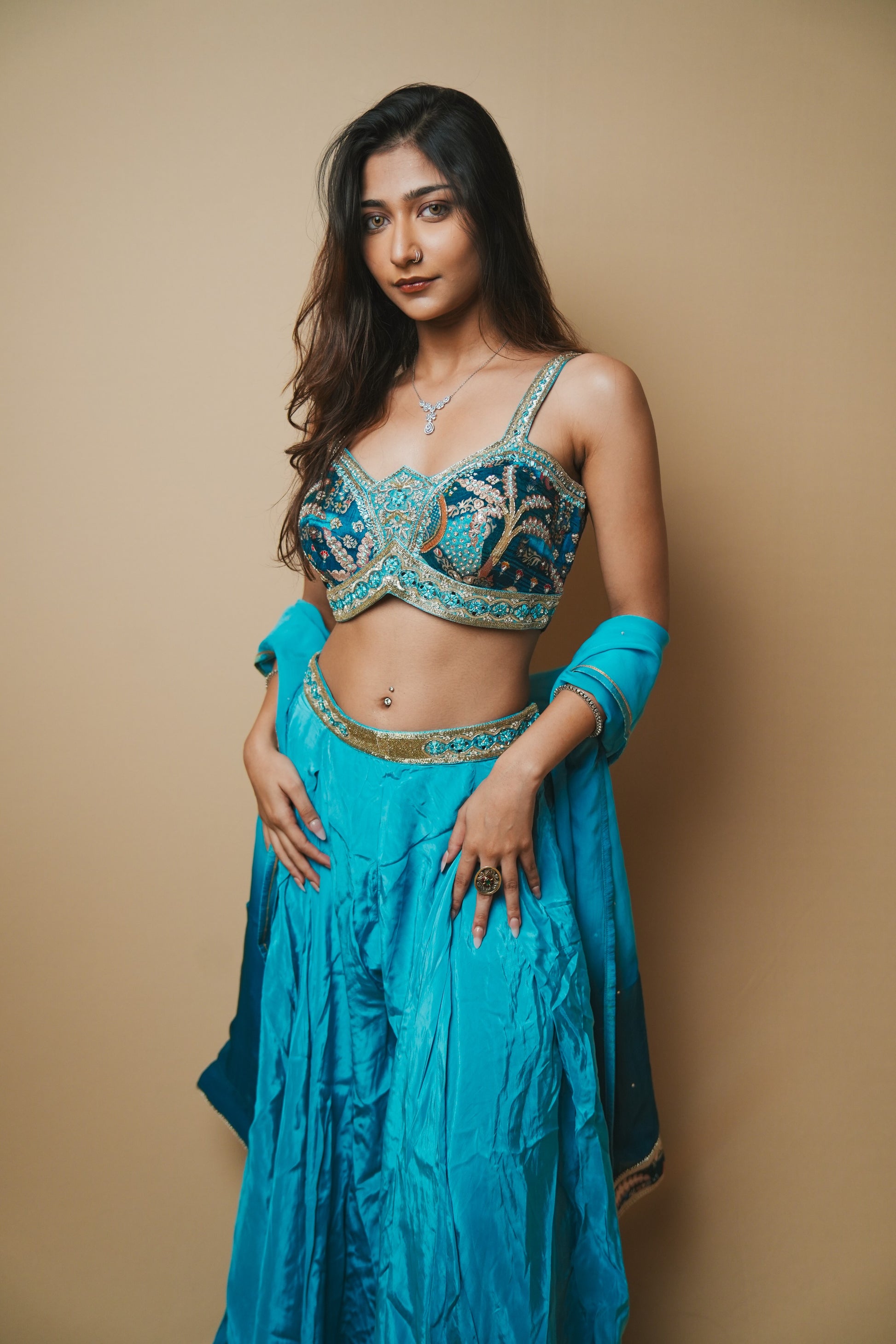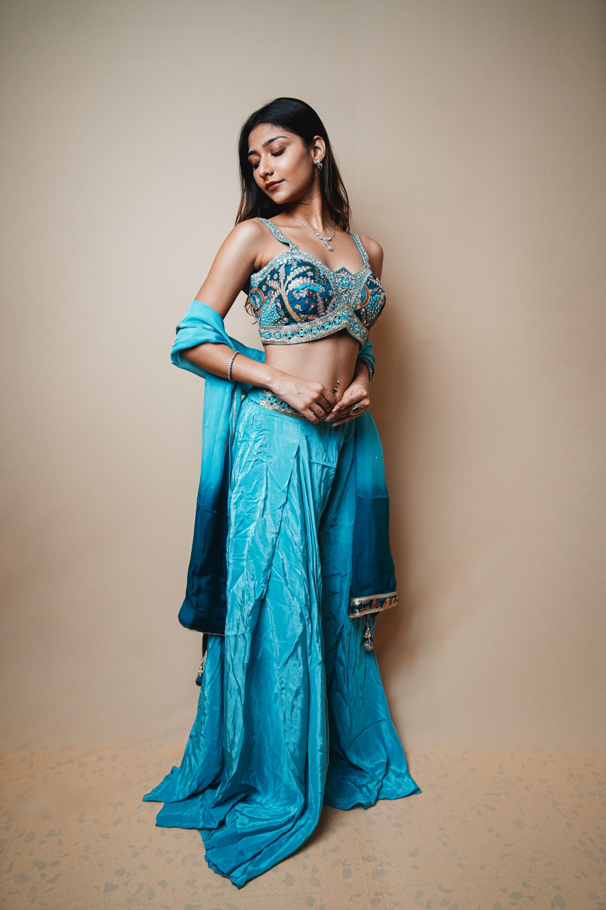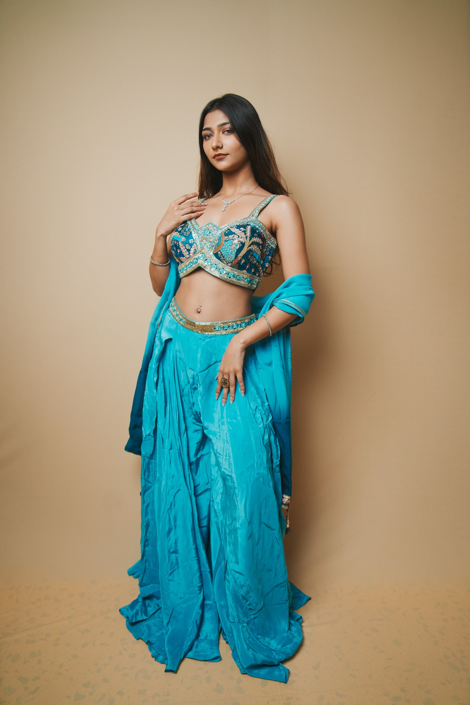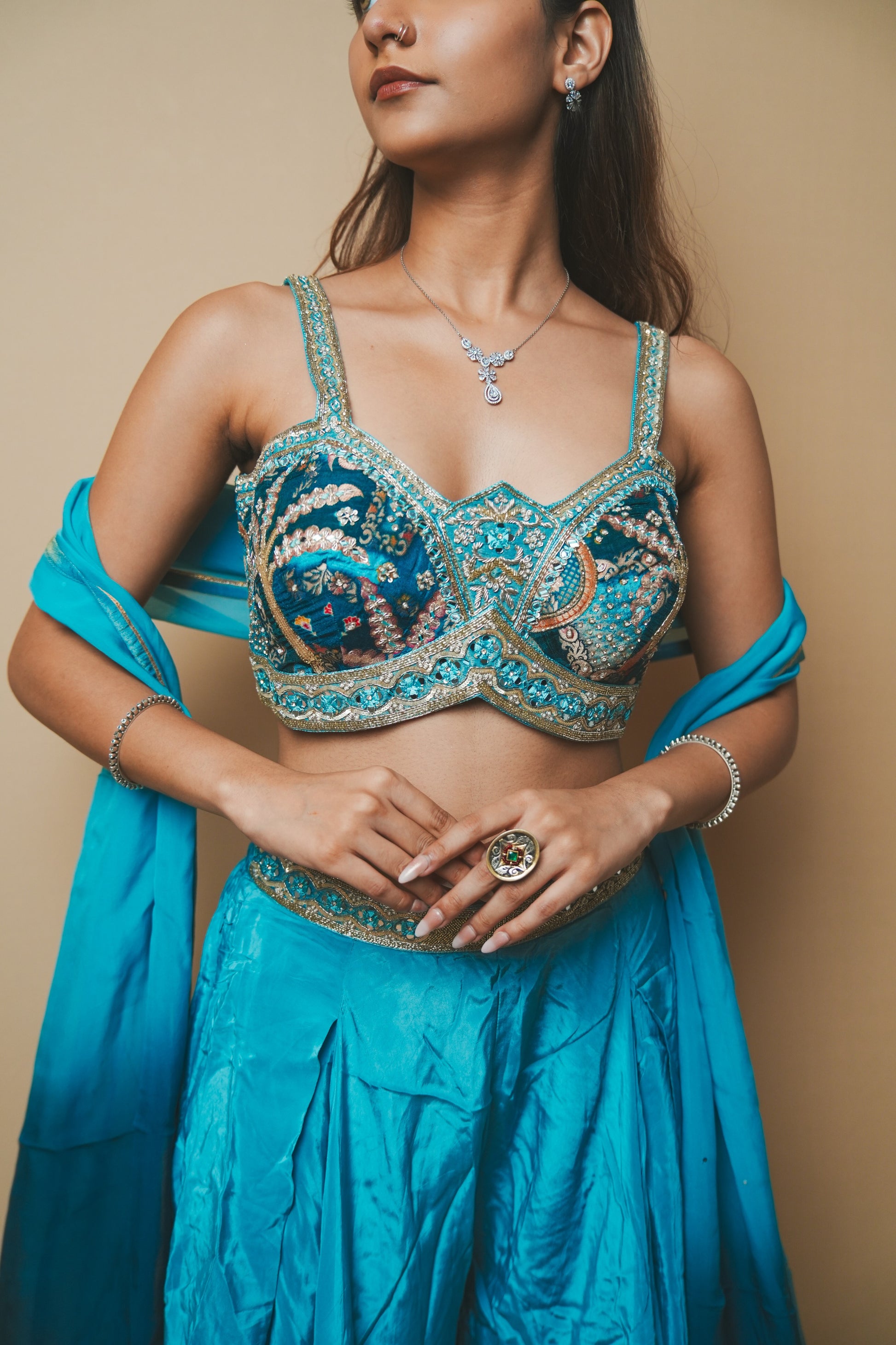 Blue Crab Silk Alia Cut Blouse Plazo Set with Pitta, Resham & Jardozi Work