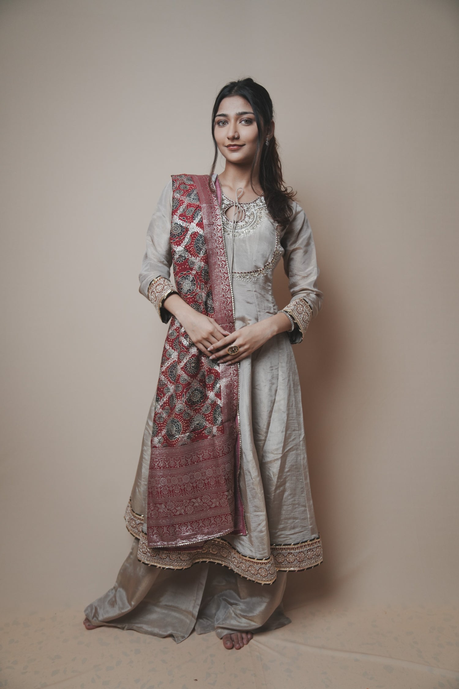 Make a bold statement with this glamorous Alia cut blouse plazo set, crafted in luxurious fabric with a rich finish. The chic spaghetti strap blouse is exquisitely embellished with intricate Pitta, Resham, and Jardozi handwork, creating a perfect blend of traditional elegance and modern design. Paired with a flowy matching plazo and a subtle ombré dupatta, this ensemble is ideal for festive occasions and celebrations.