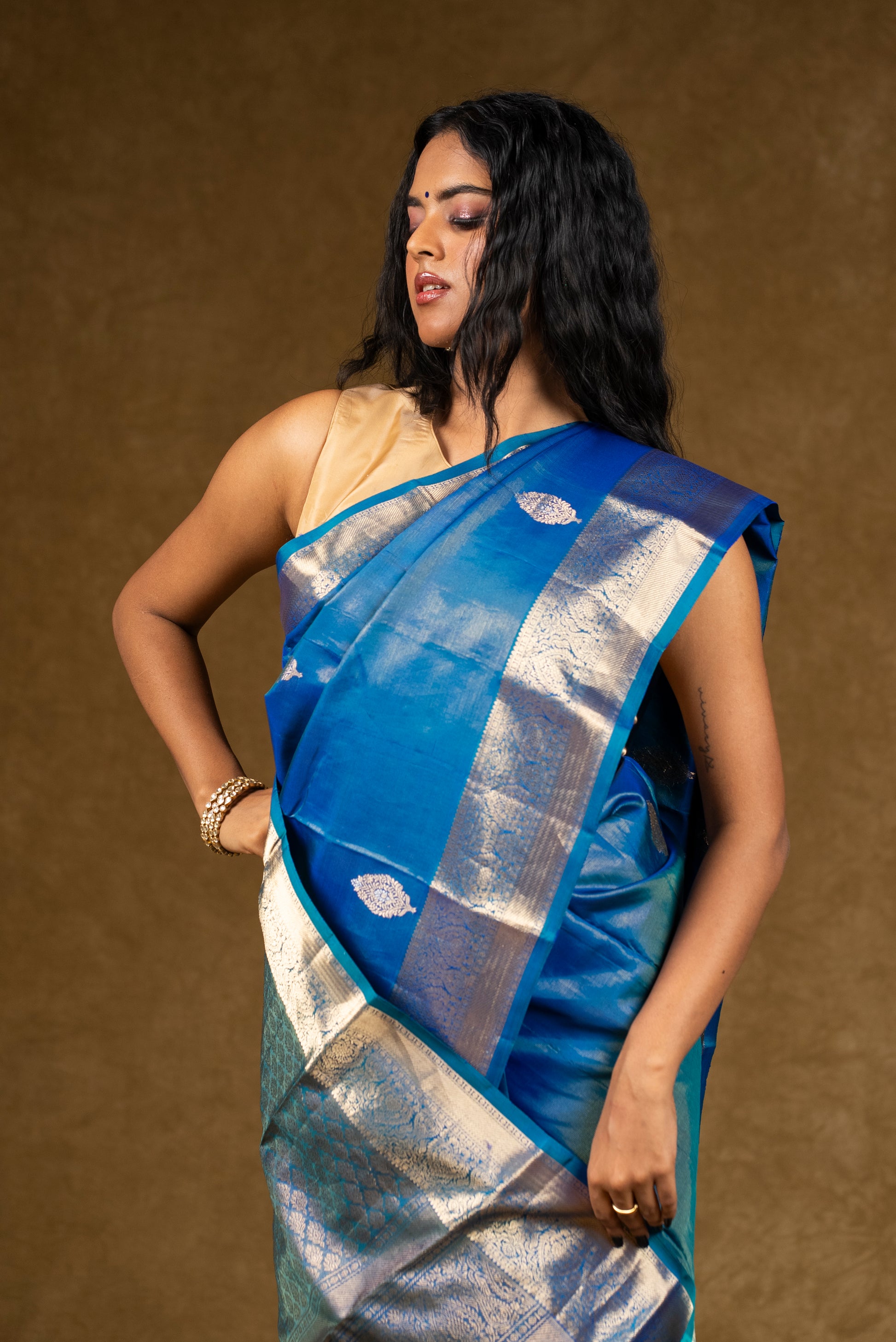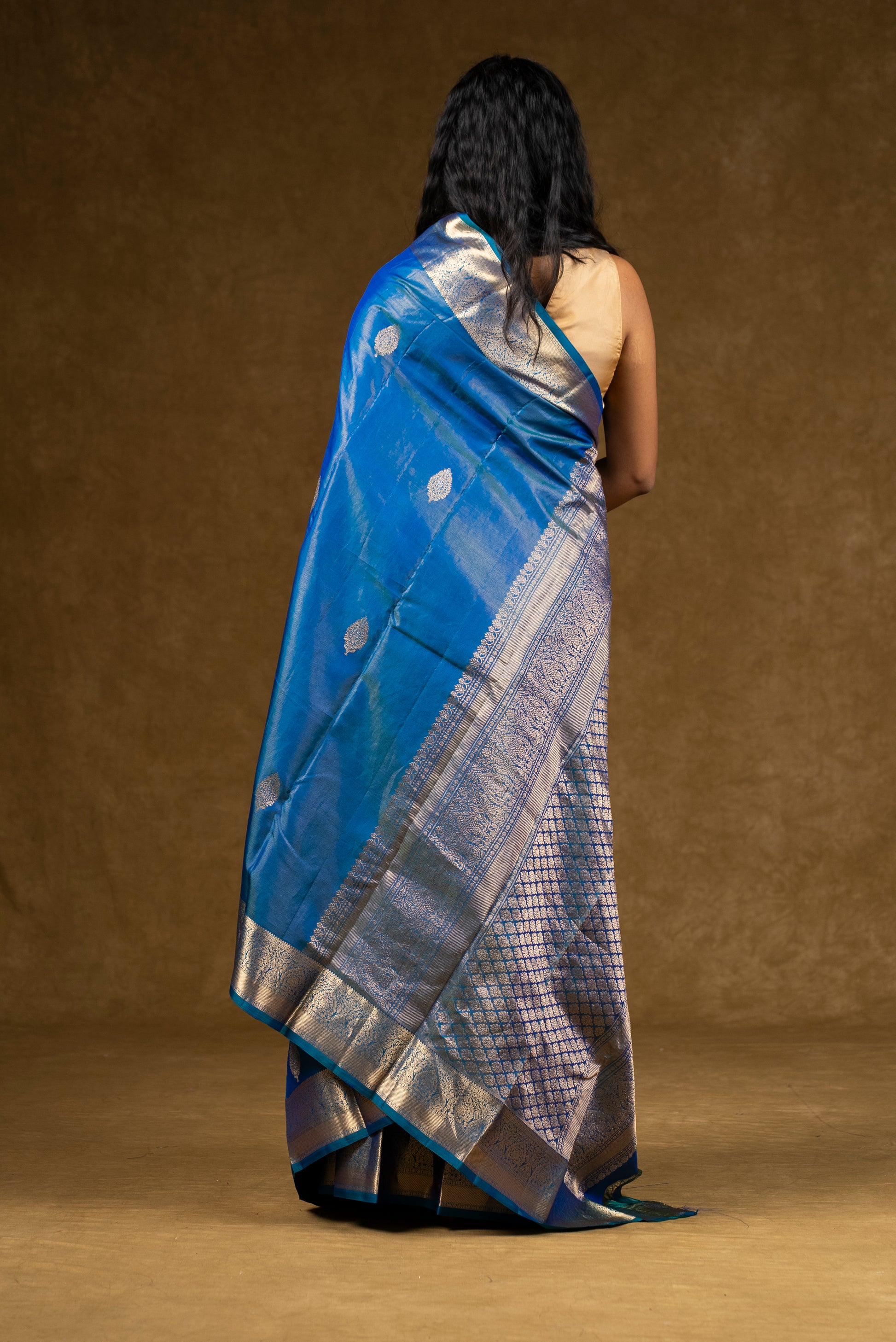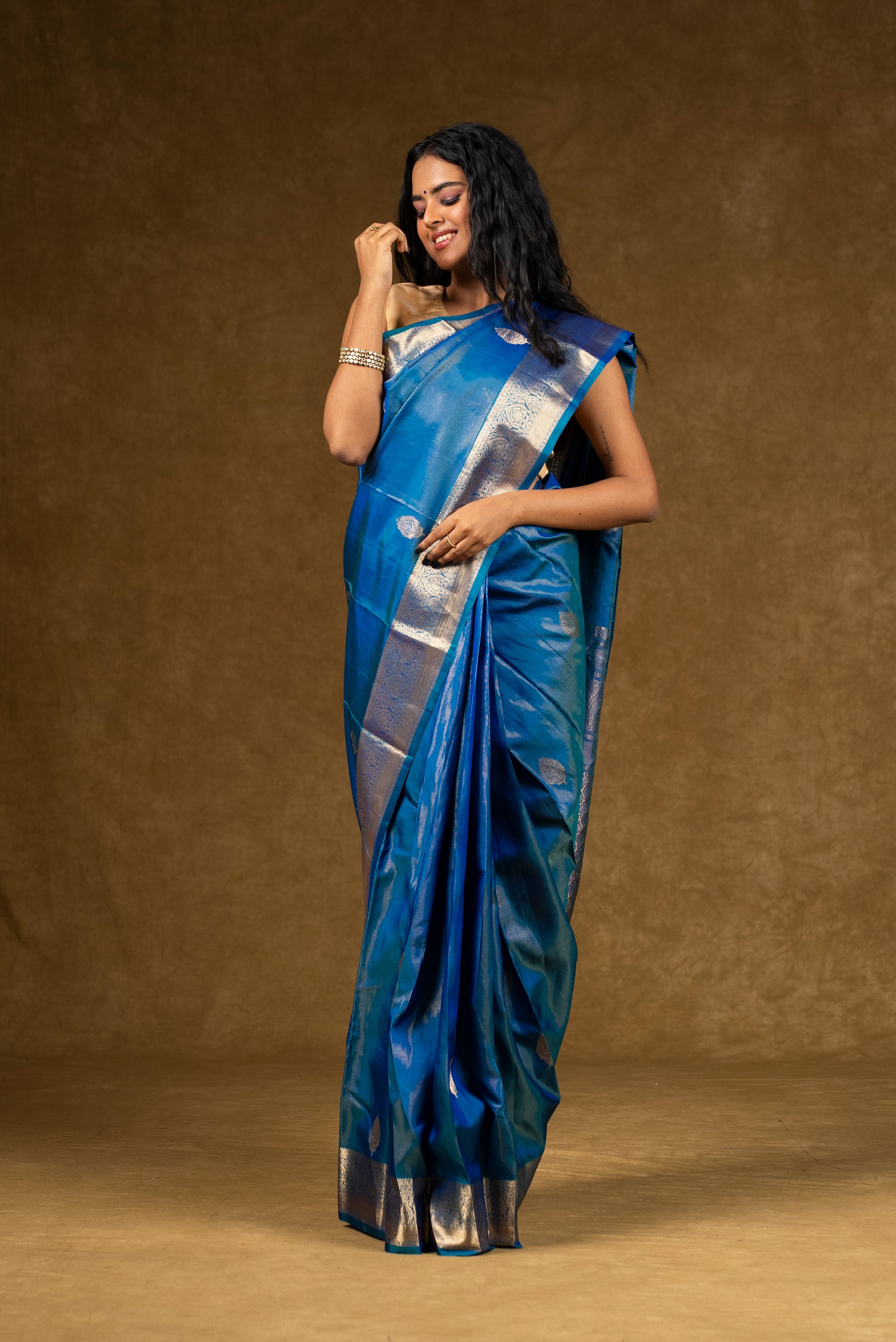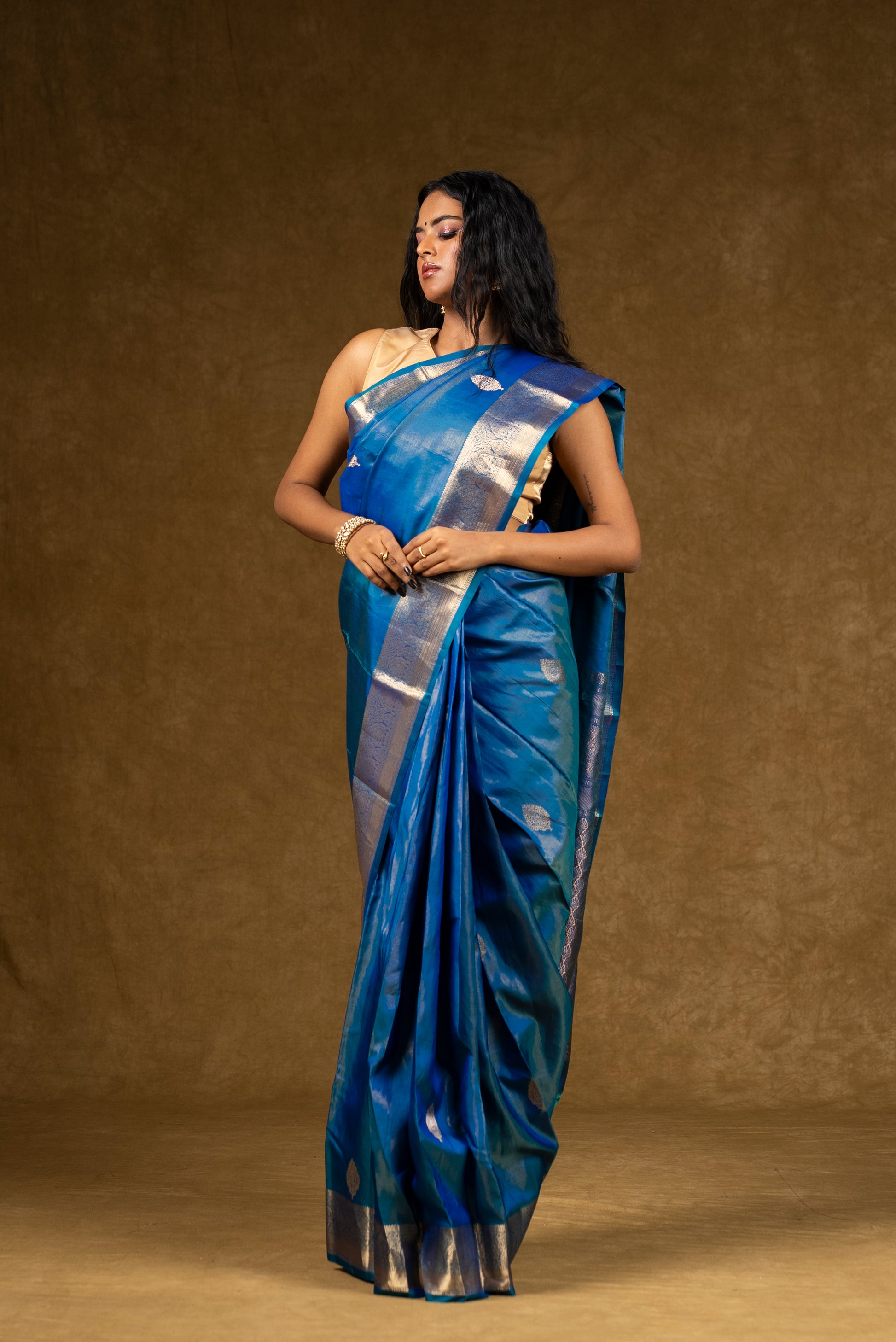 A stunning blue silk saree highlighted with silver zari accents for a contemporary yet traditional look.