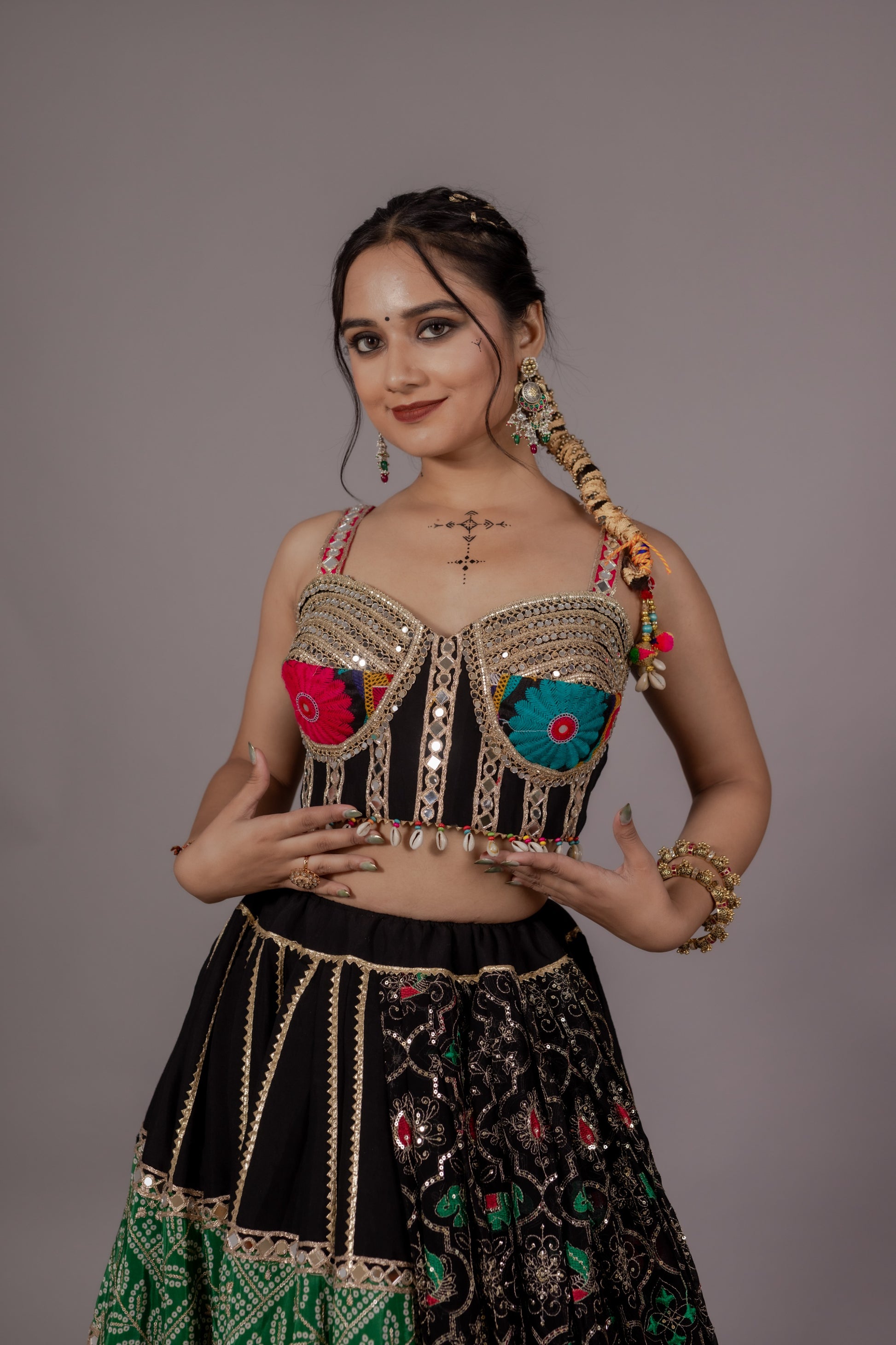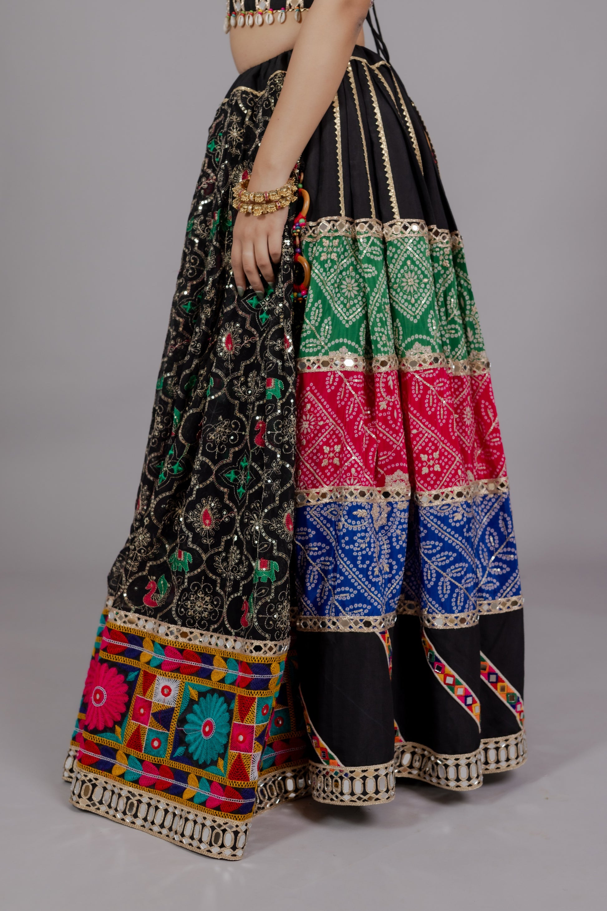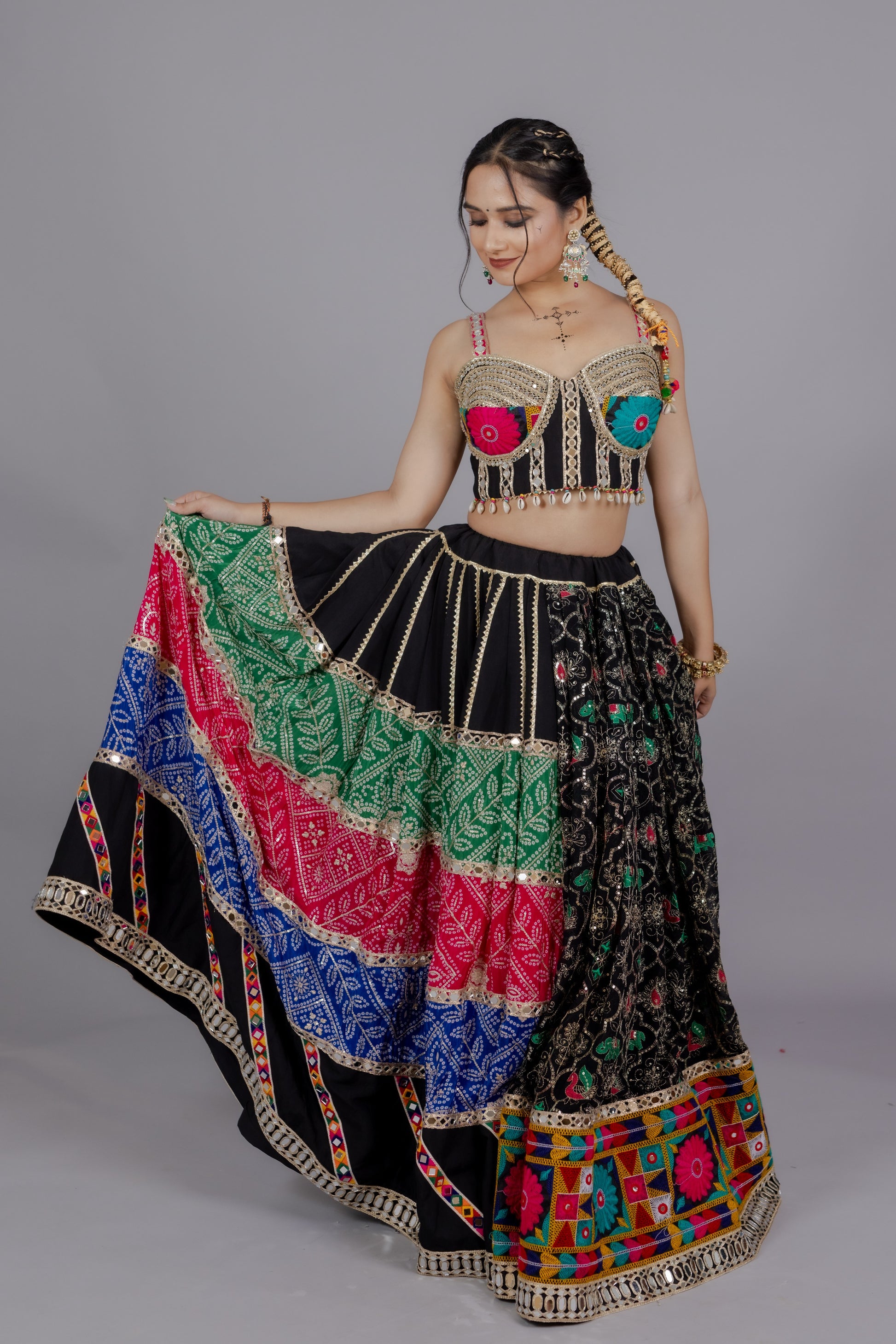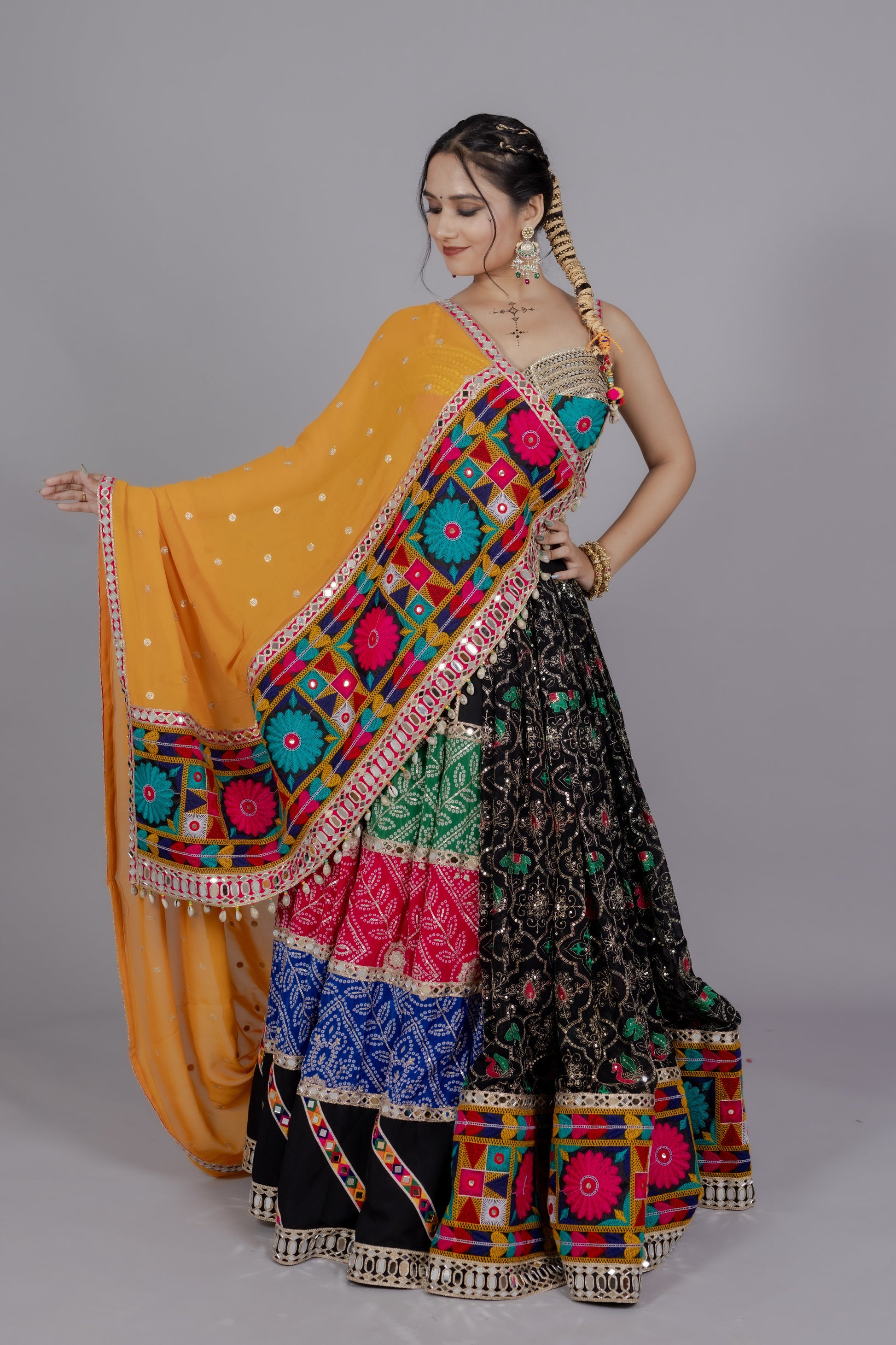 Celebrate Navratri in vivid hues with this eye-catching chaniya choli set. The lehenga features a mix of chiffon kali panels in festive colors, detailed with traditional prints and abhla (mirror) embroidery near the hem. The strapless blouse is a stunner with its multicolor mirror and kodi detailing, designed to flatter and dazzle.