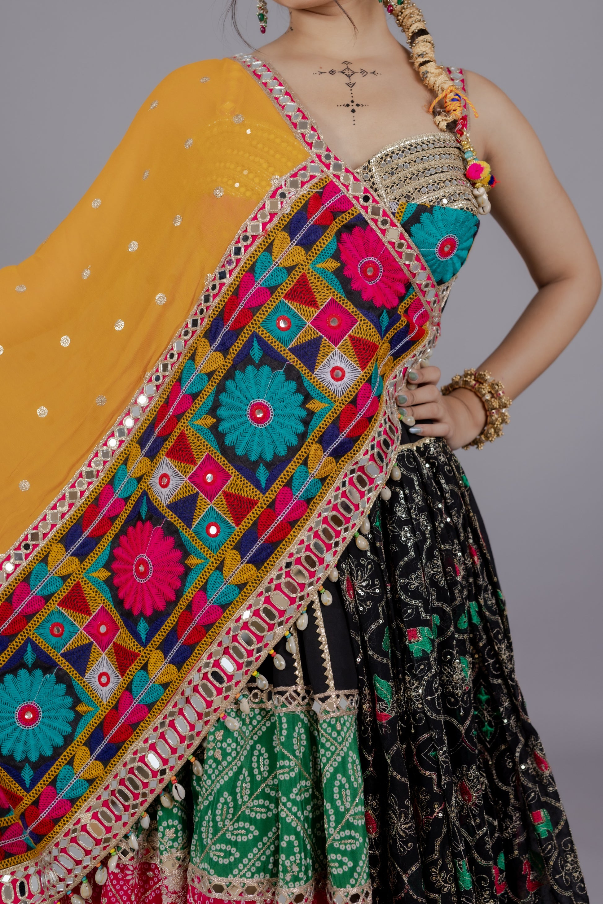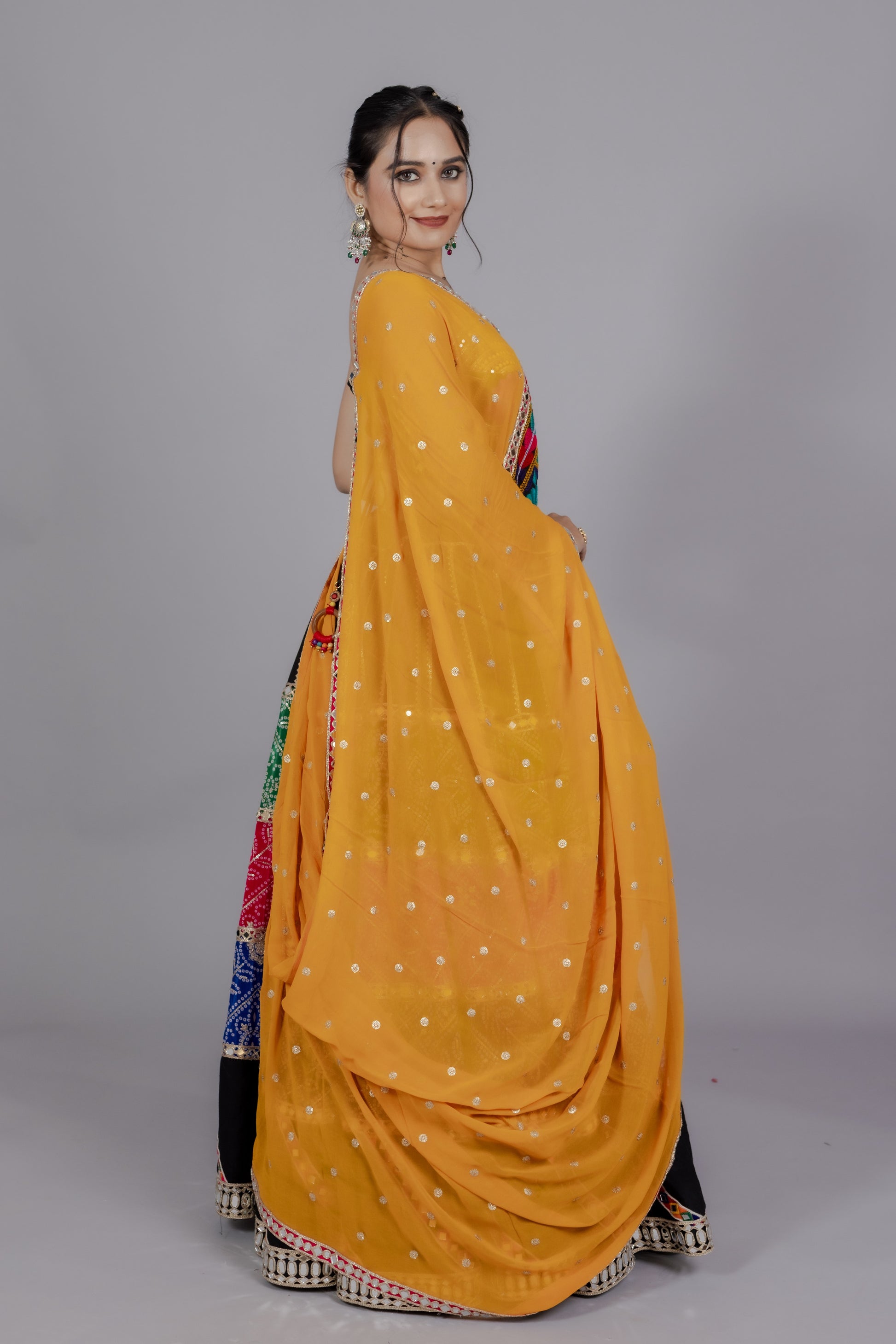 The ensemble is elevated with a mustard chiffon dupatta, highlighted with mirror motifs and a vibrant embroidered border, making it perfect for Garba nights, sangeet events, or any festive celebration.