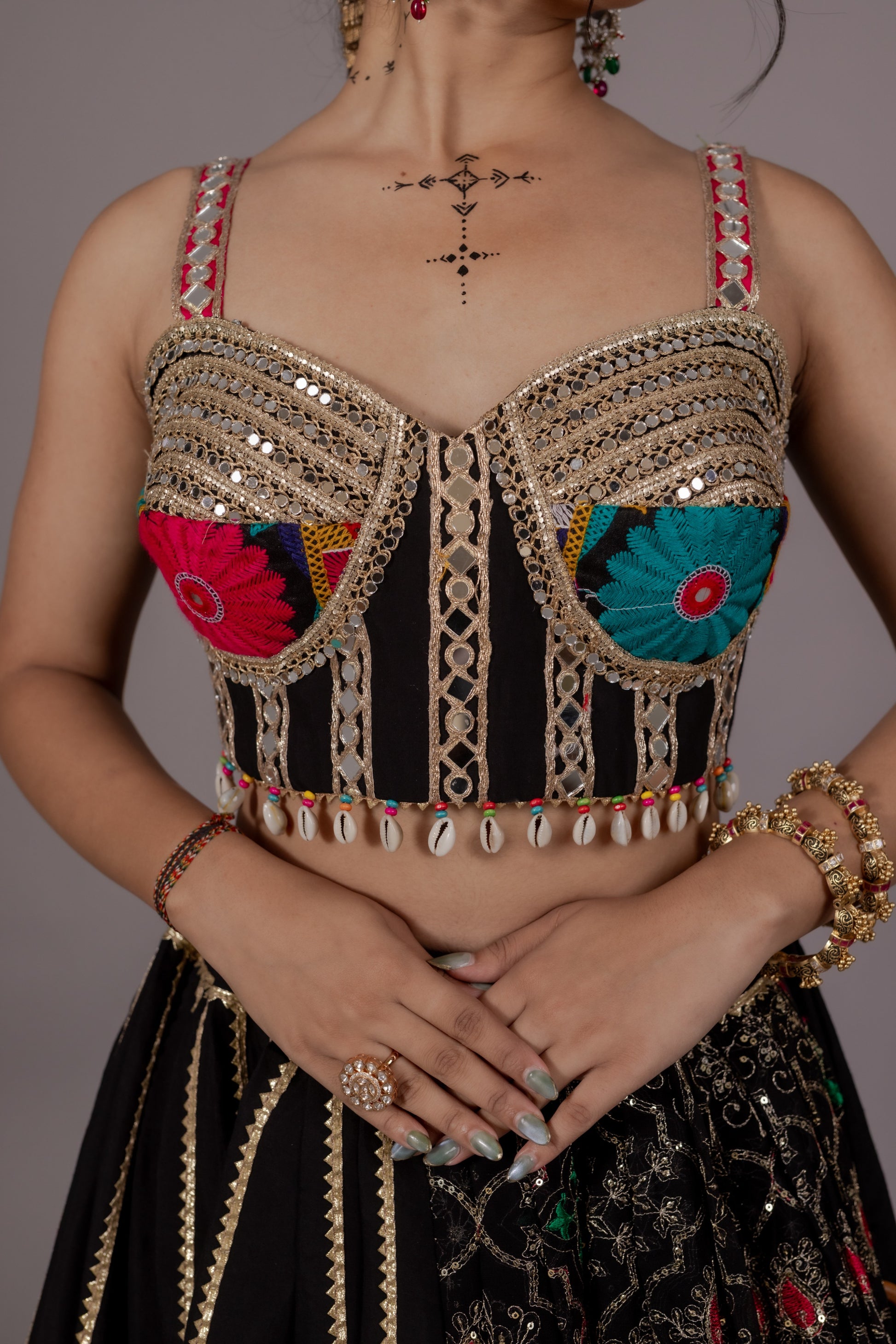 Strapless mirror work blouse adorned with multicolor kodi (cowrie shell) lace and embroidery highlights that complement the skirt perfectly.