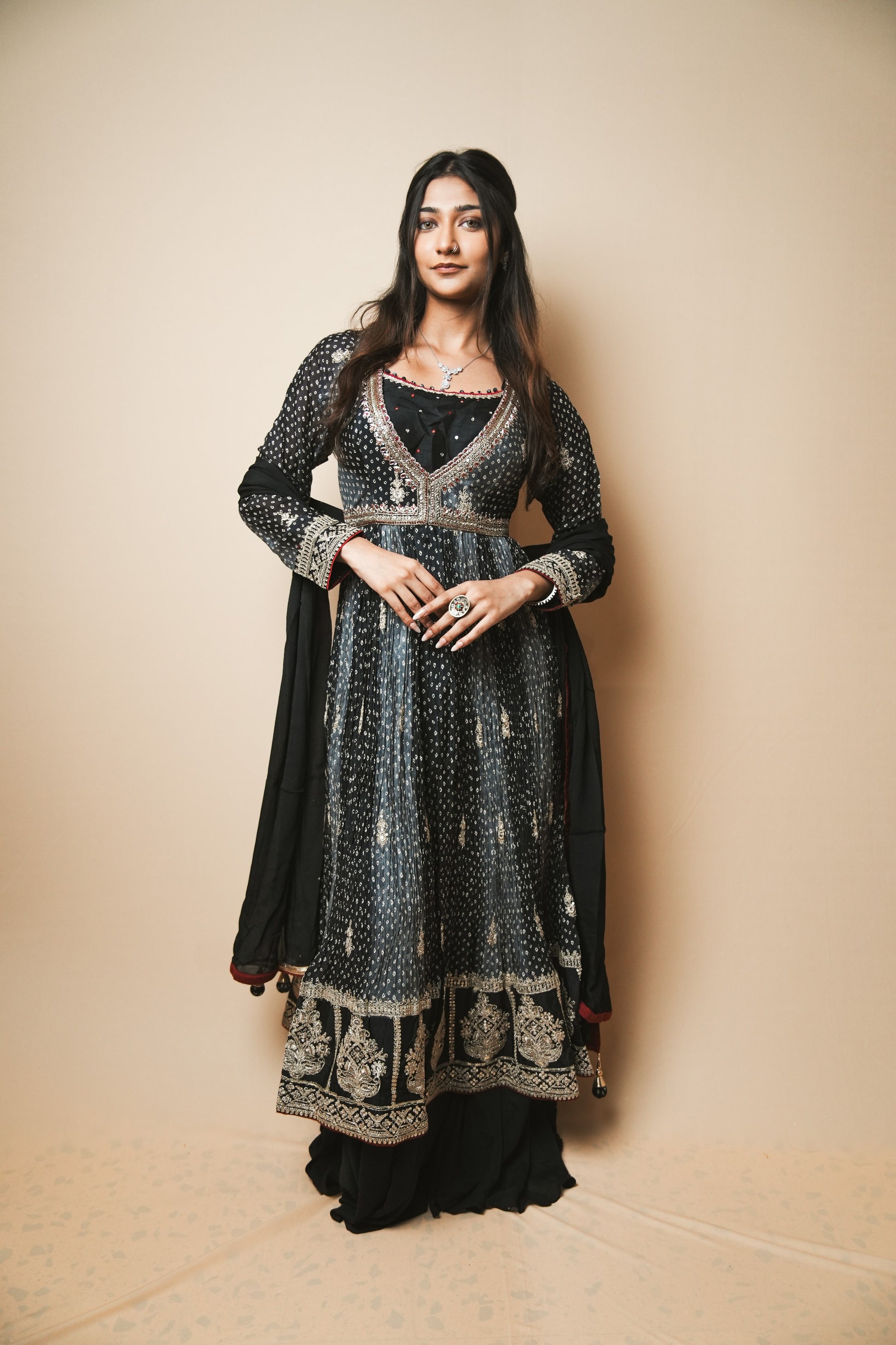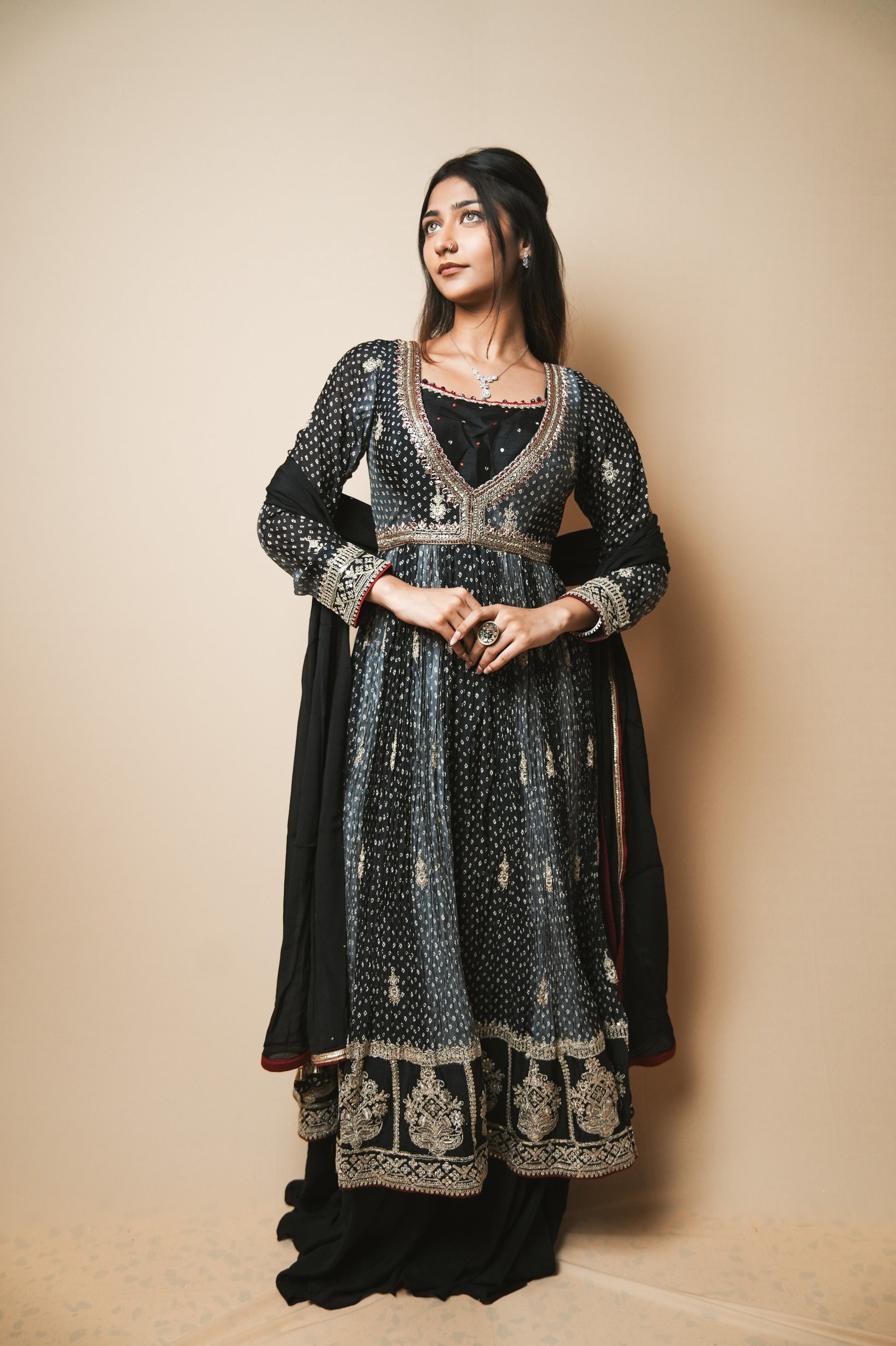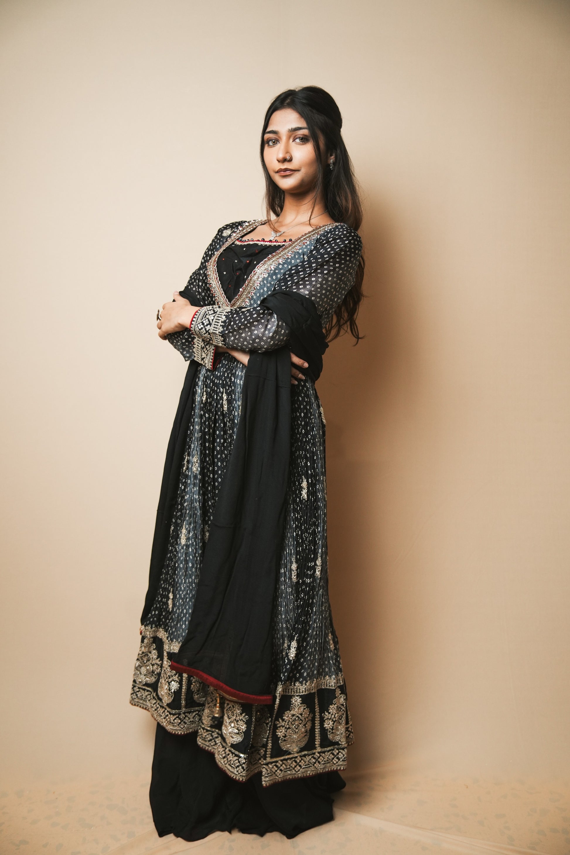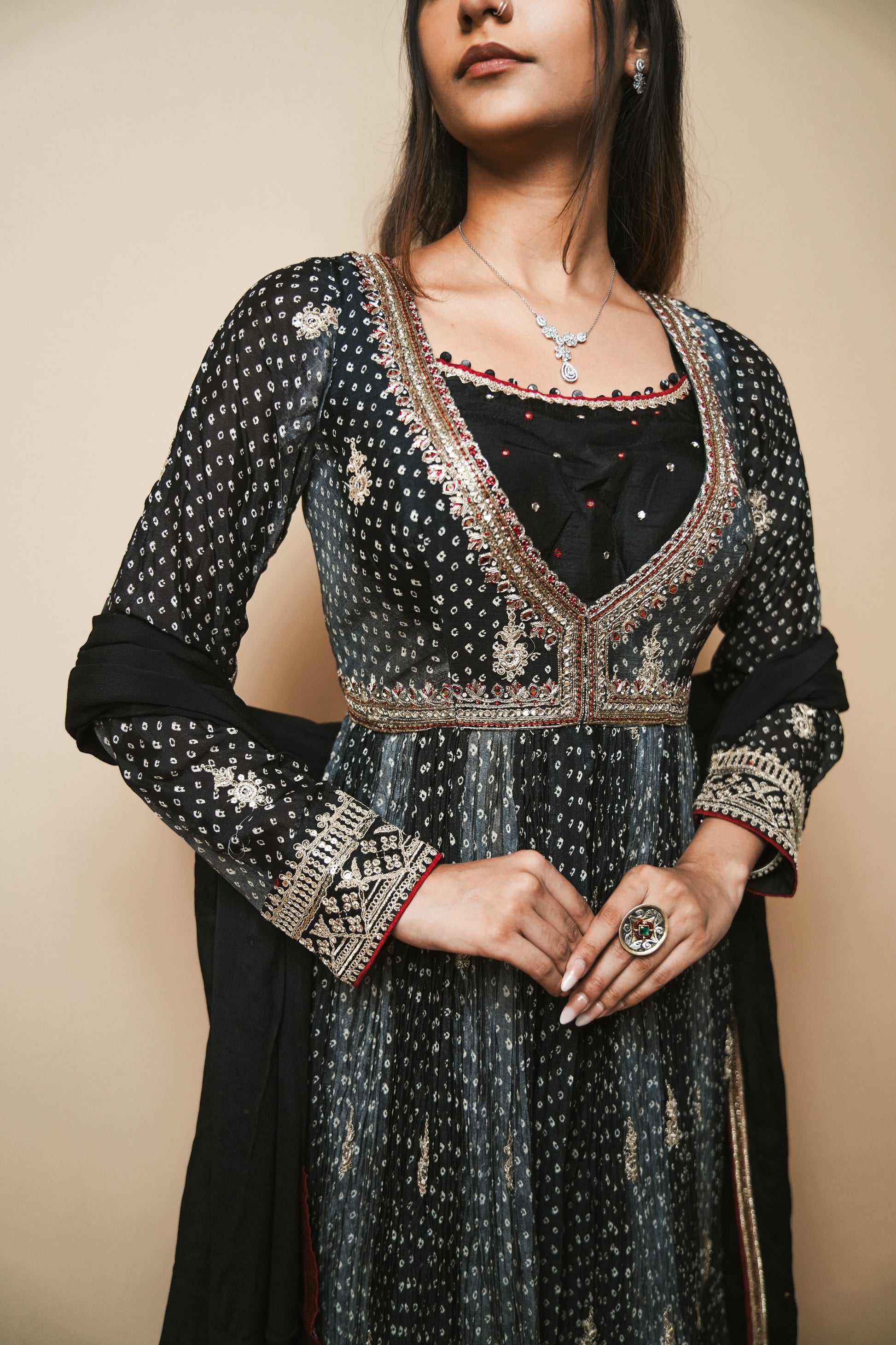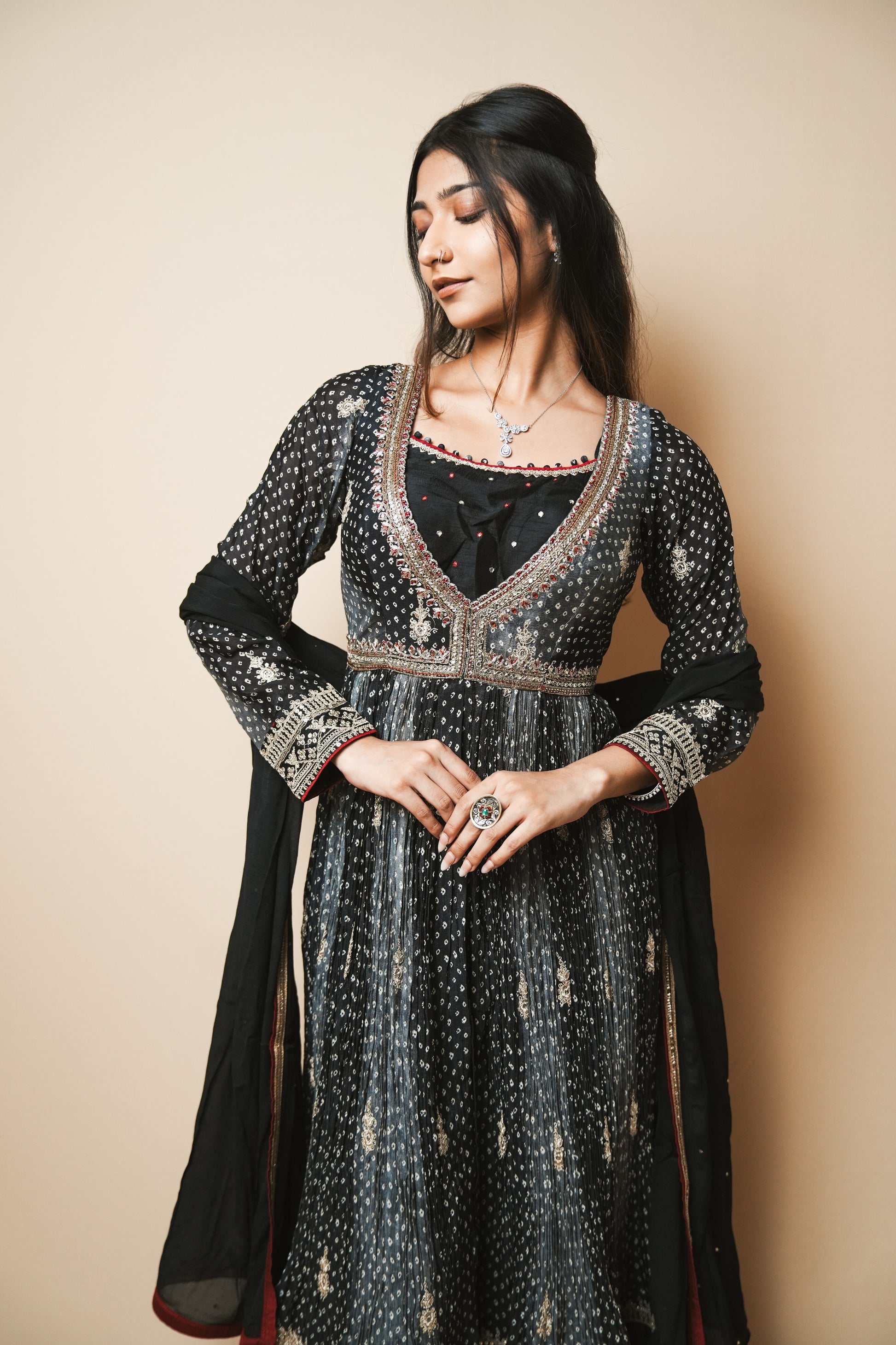 Make a statement in this stunning black crepe silk anarkali, featuring traditional bandhej print beautifully enhanced with intricate kasab and pita embroidery. The flared silhouette is adorned with ornate motifs along the hemline and detailed handwork on the neckline and sleeves. Paired with a solid dupatta and flared bottoms, this look is perfect for festive evenings and cultural celebrations.