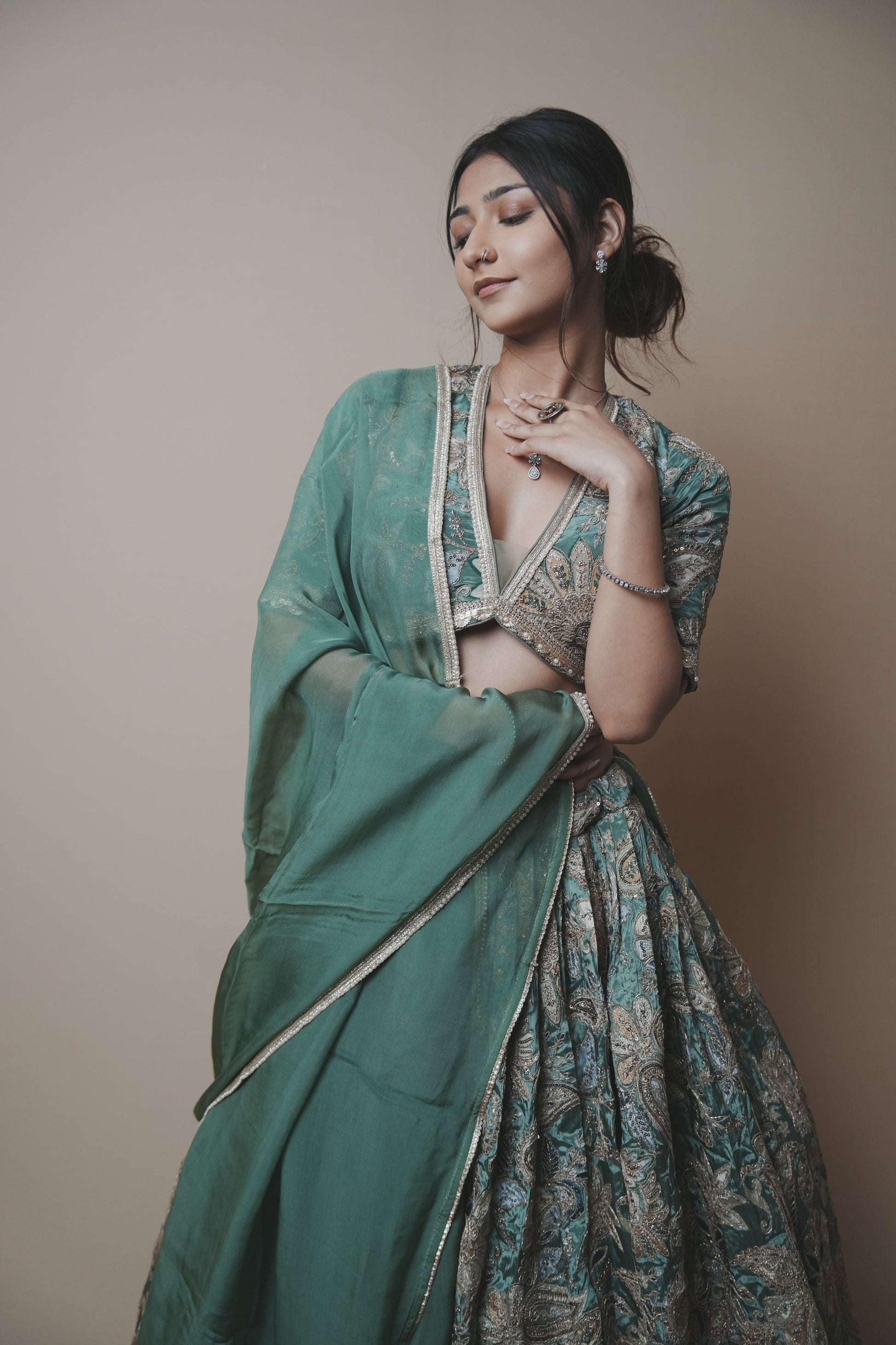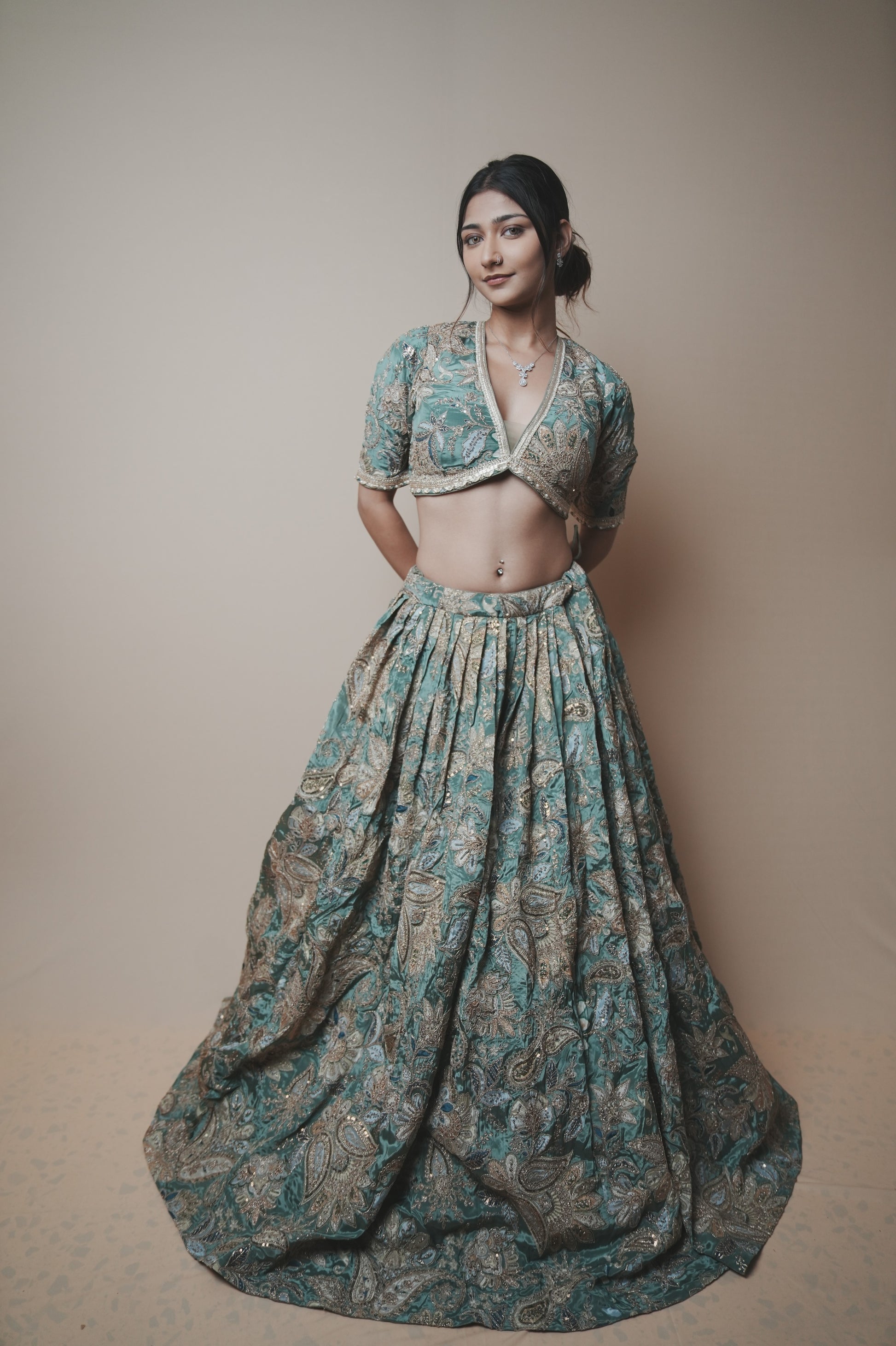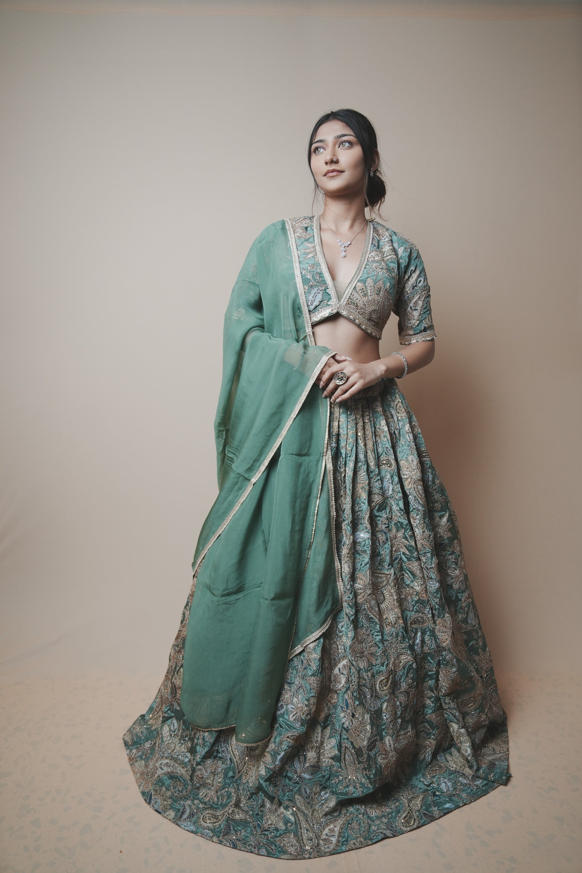 Step into effortless elegance with this intricately designed lehenga set, crafted in soft Crepe Silk featuring a beautiful paisley print and delicate Kasab embroidery. The ensemble is paired with a stitched blouse and a flowy Organza dupatta finished with a fine border perfect for festive and wedding occasions.