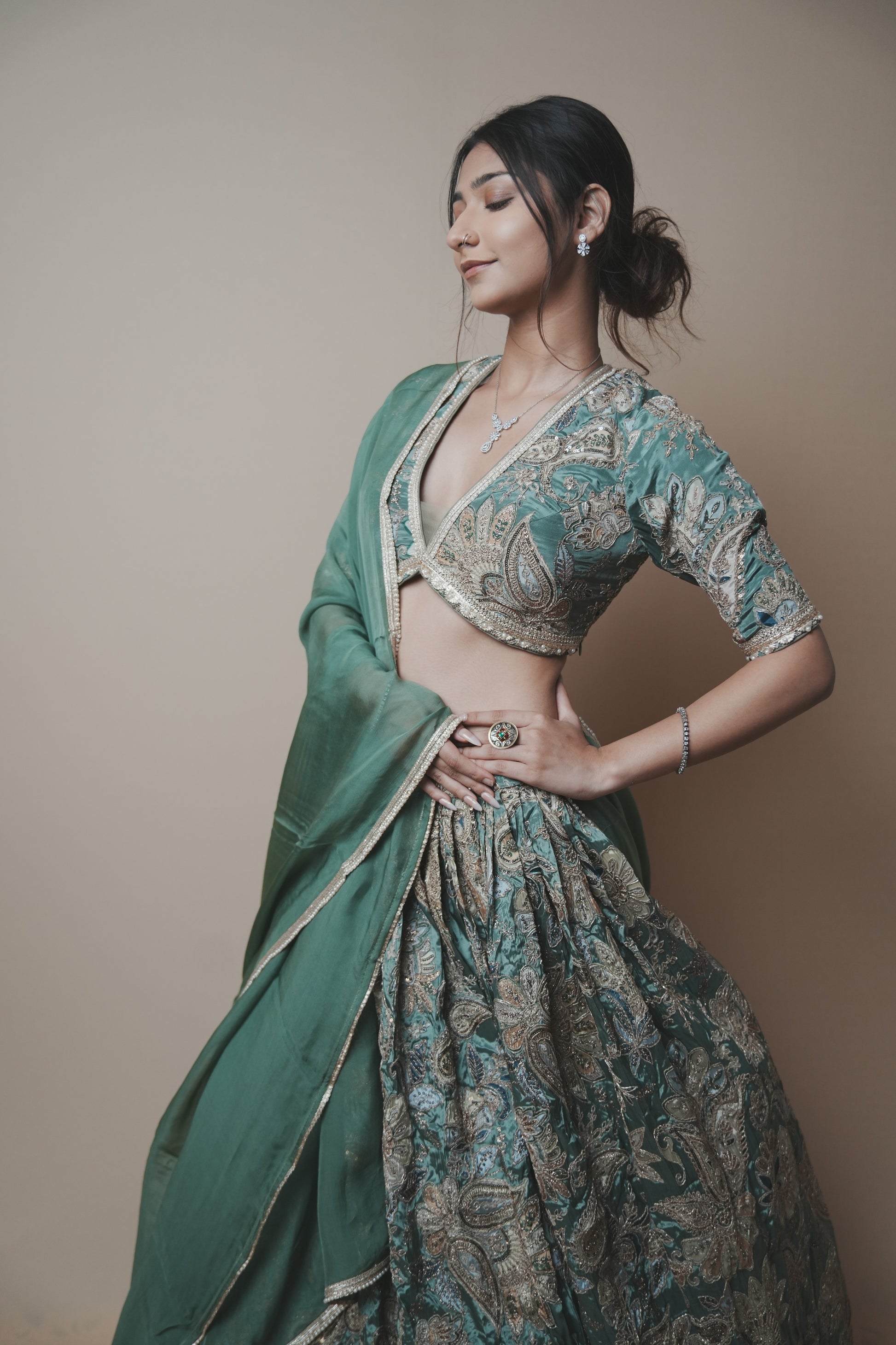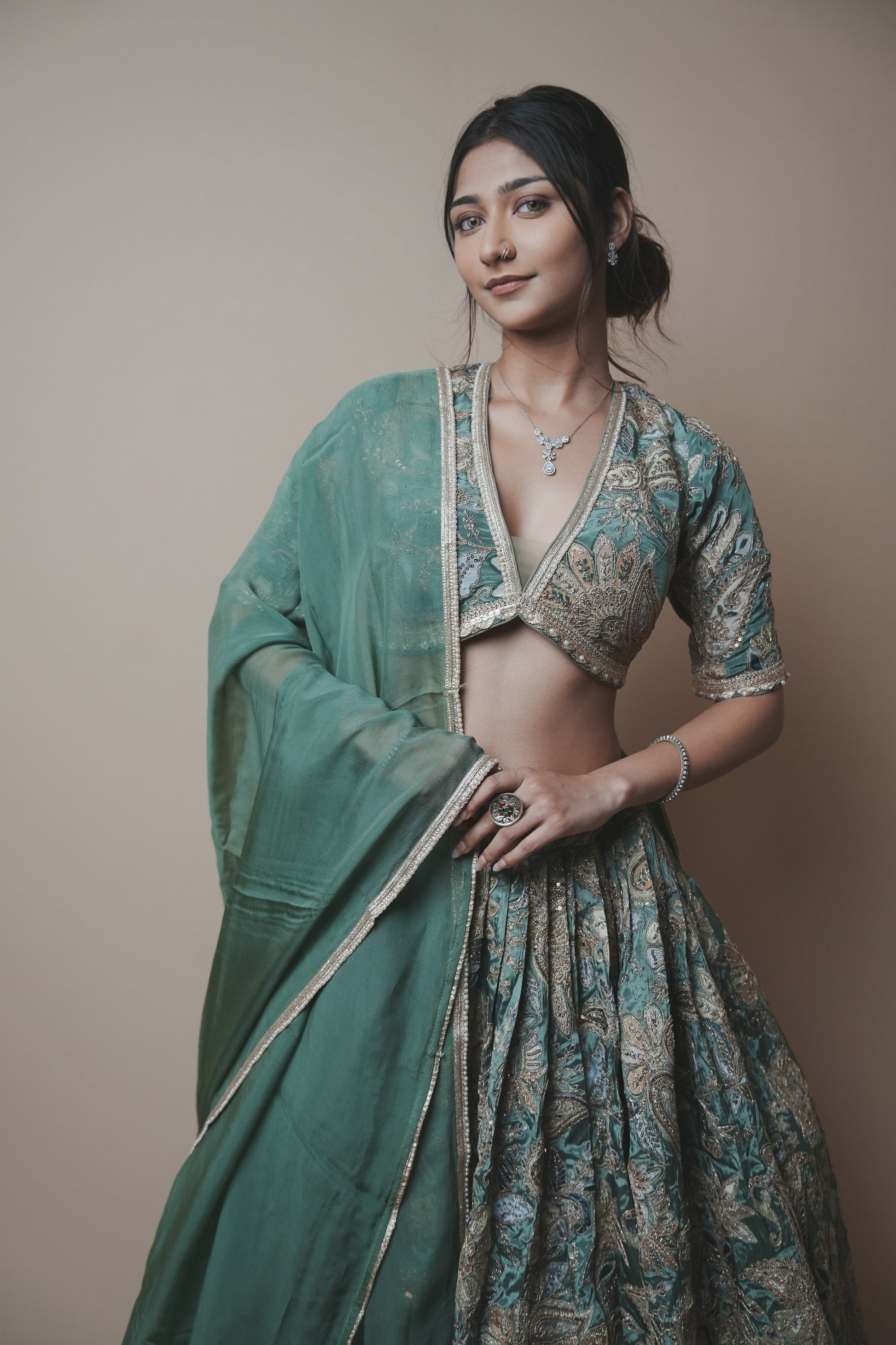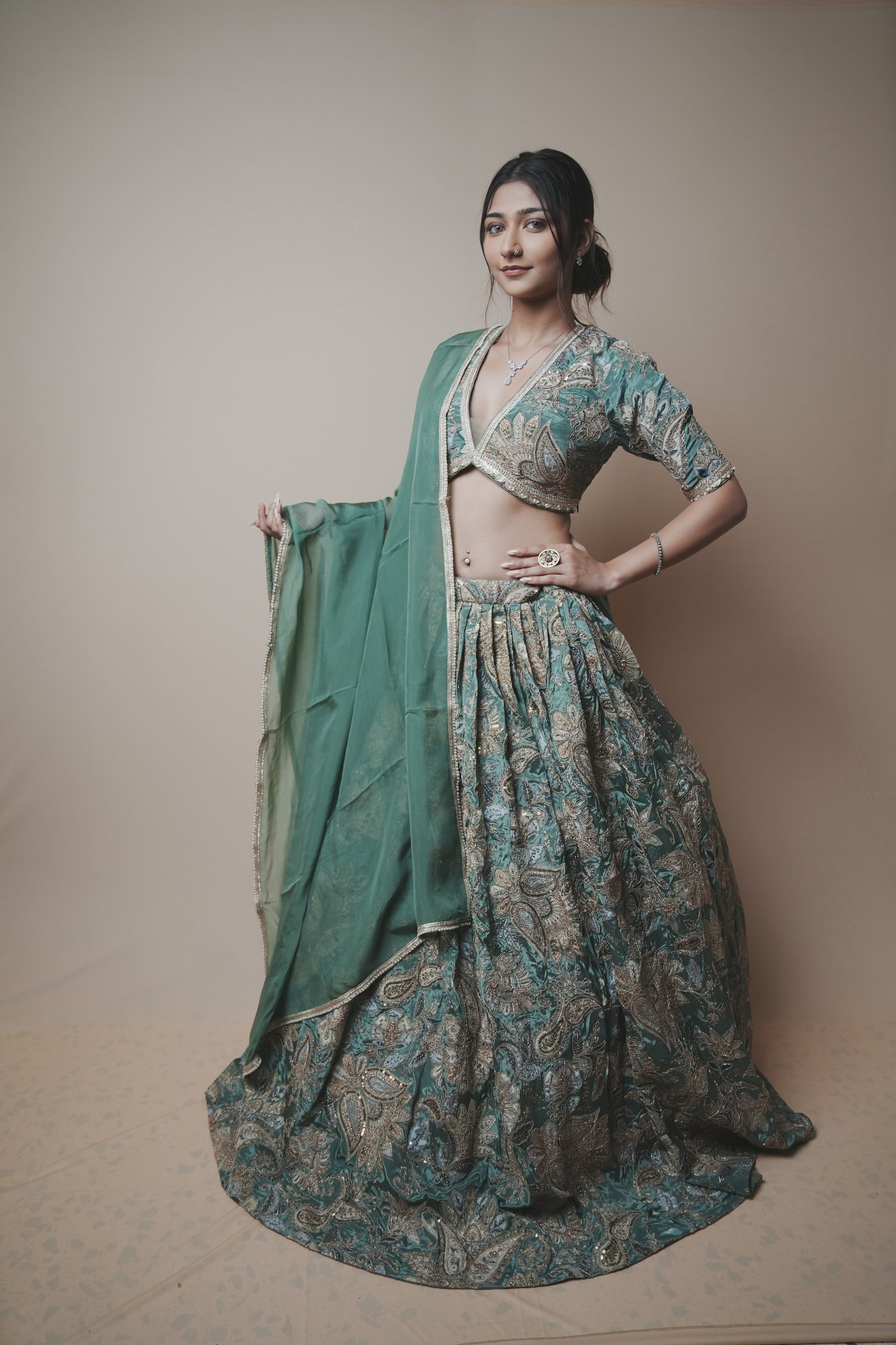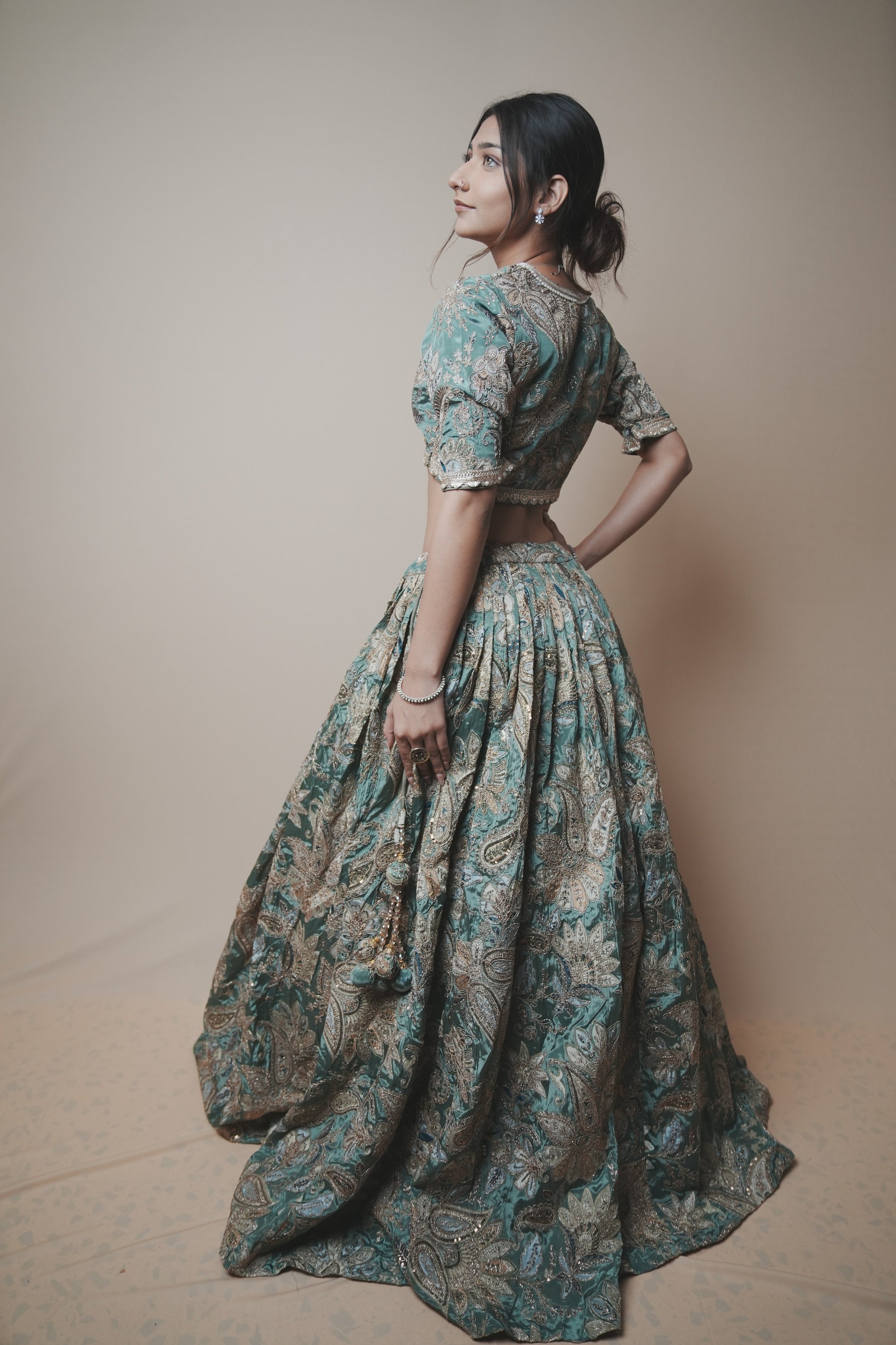 Step into effortless elegance with this intricately designed lehenga set, crafted in soft Crepe Silk featuring a beautiful paisley print and delicate Kasab embroidery. The ensemble is paired with a stitched blouse and a flowy Organza dupatta finished with a fine border perfect for festive and wedding occasions.