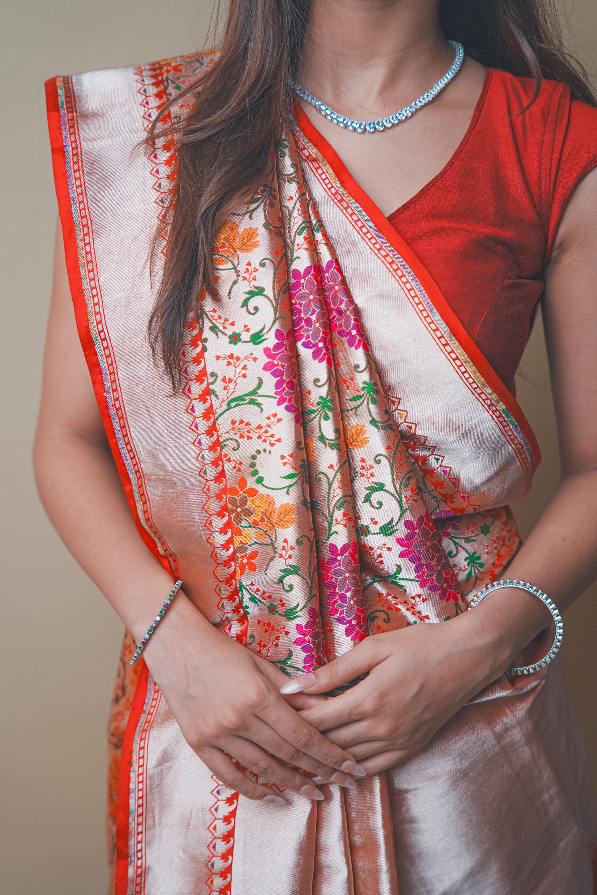The rich texture and detailed craftsmanship make it ideal for weddings and festive occasions.