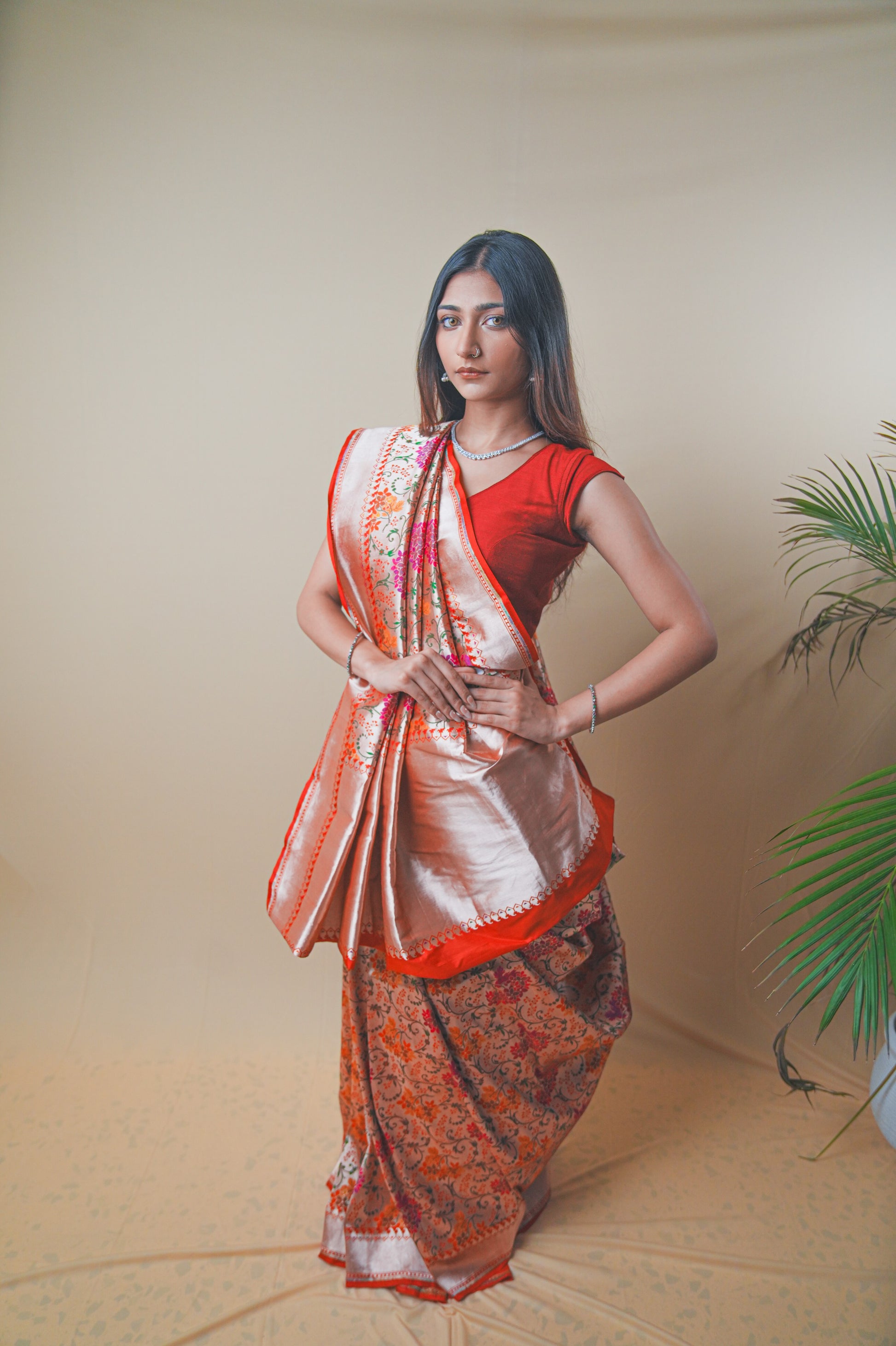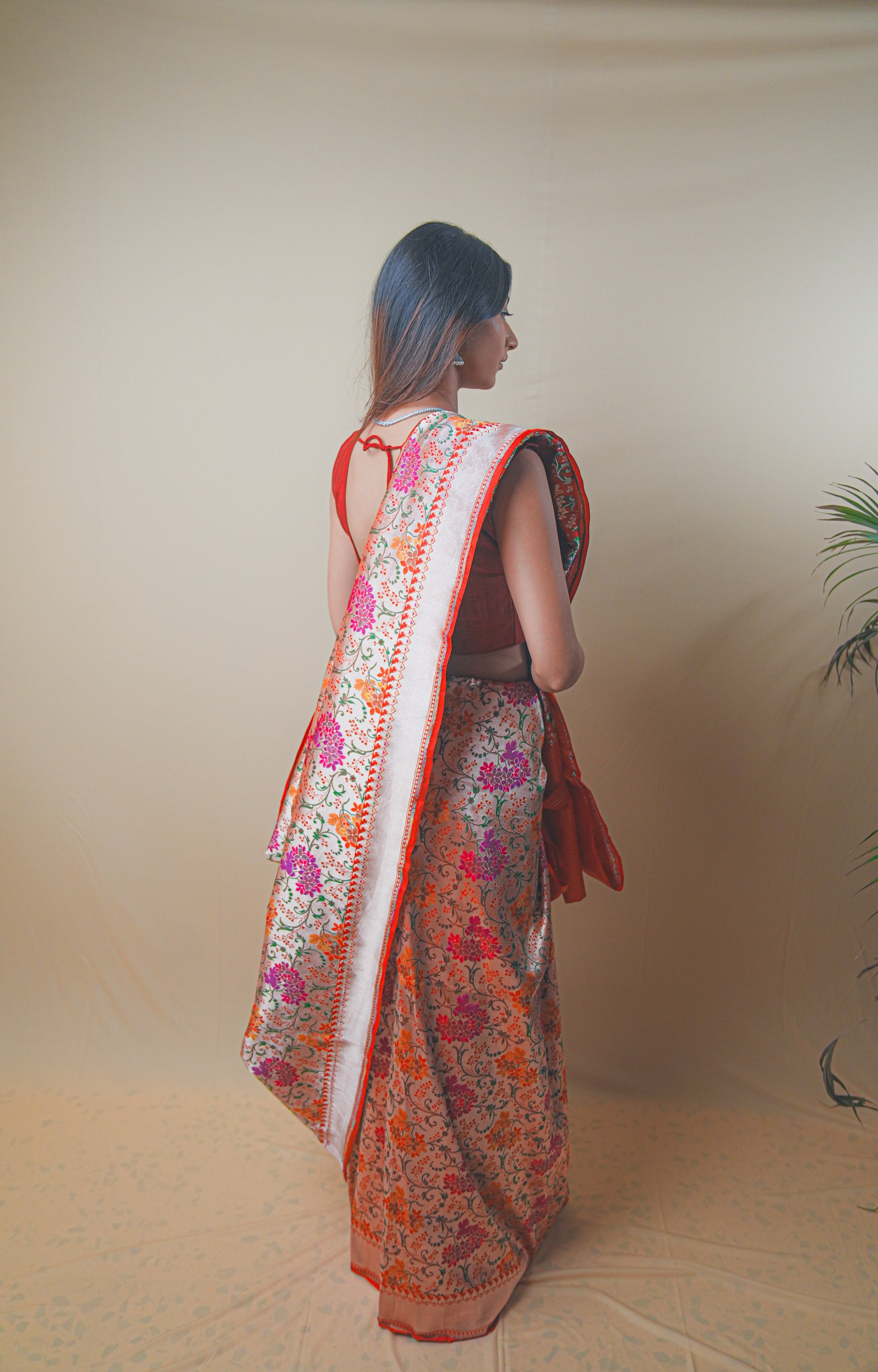 Featuring intricate Meenakari weaving in vibrant hues, it blends luxury with heritage.
