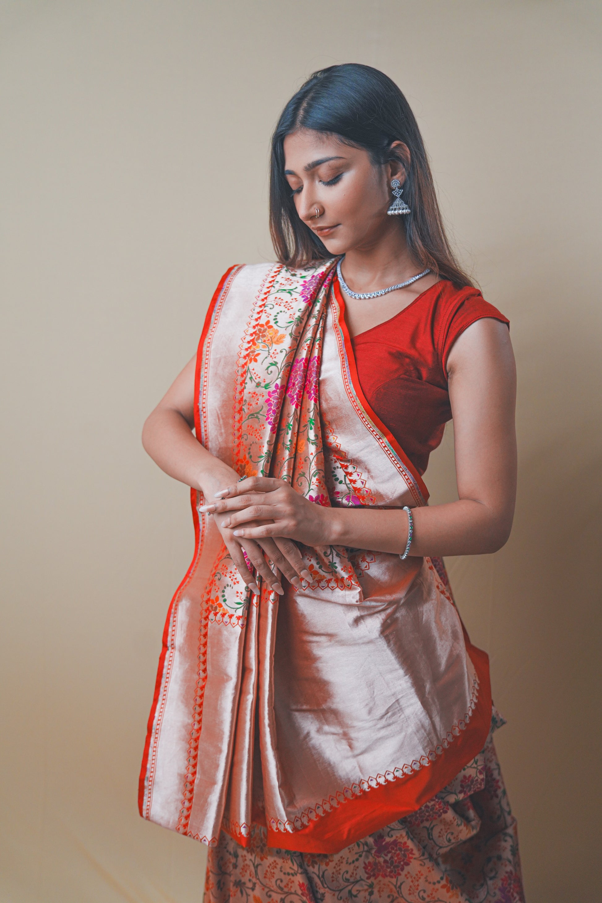 Experience traditional elegance with this beautifully woven Katan Jari Silk saree.