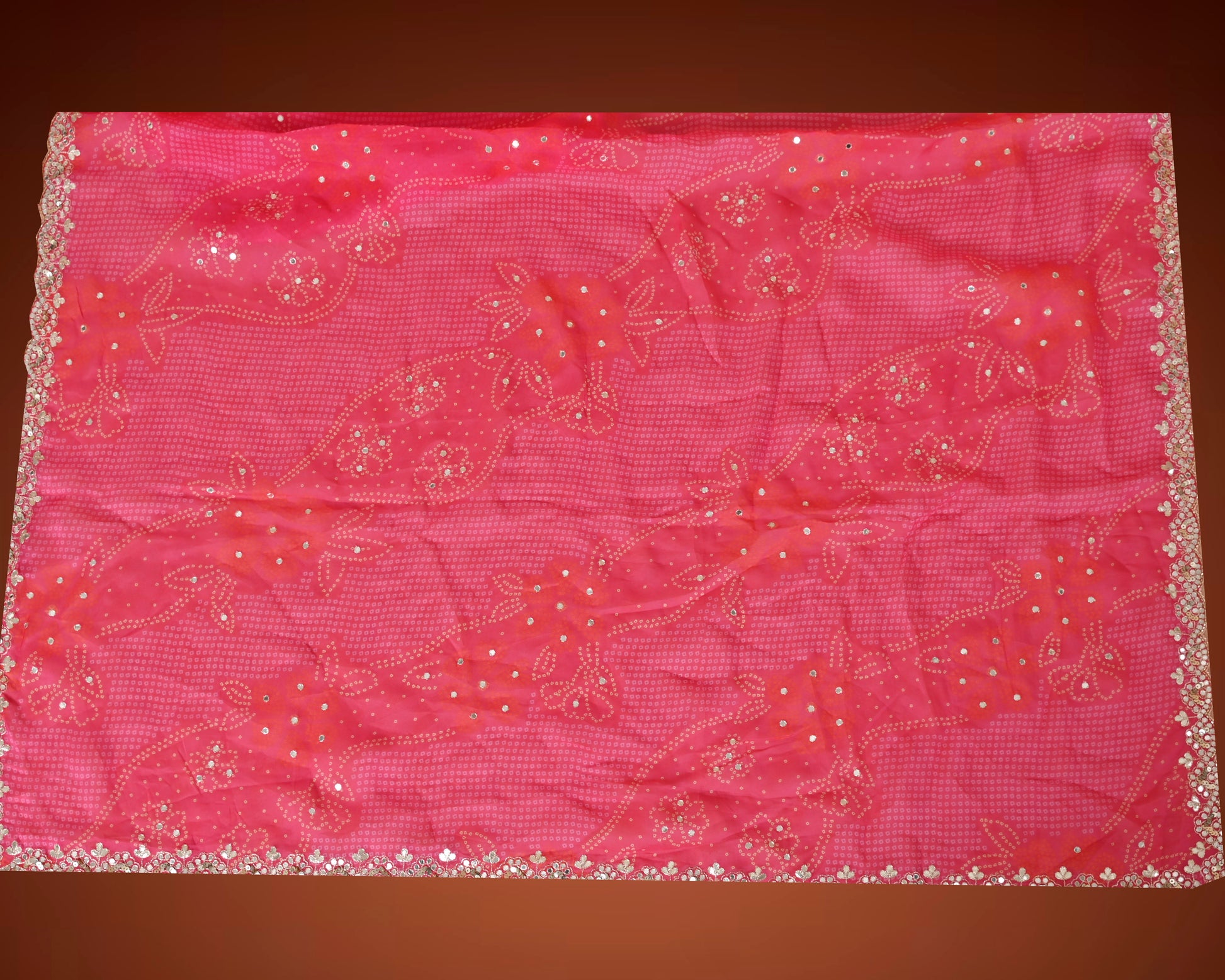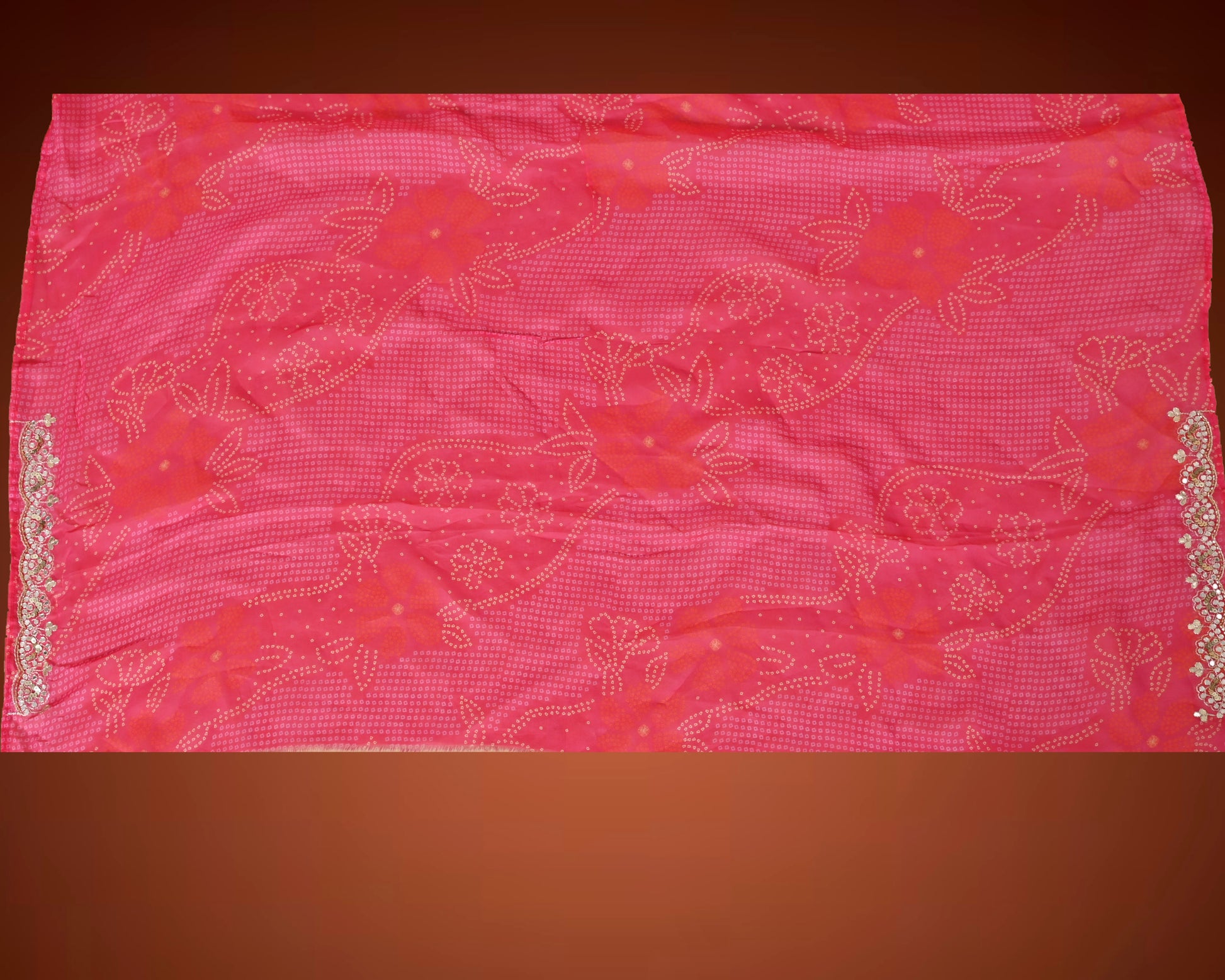 Graceful and vibrant, this crape georgette saree in a bright pink hue is adorned with fine Gota Patti and sequence work, giving it a perfect festive sparkle. The light, flowy fabric drapes beautifully, while the contrast mustard blouse adds a bold touch to the overall look. Ideal for weddings, receptions, and festive gatherings where elegance meets comfort.
