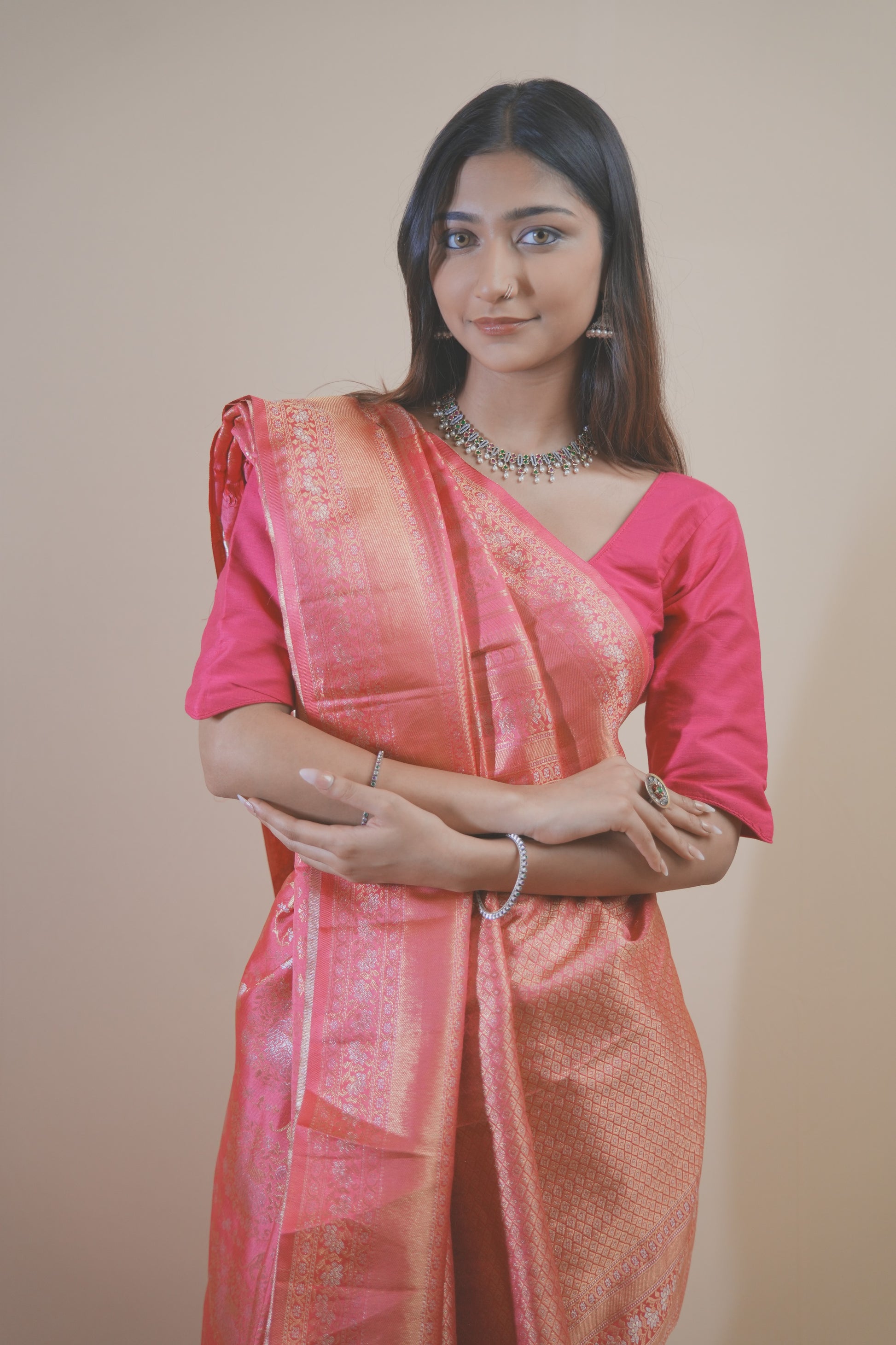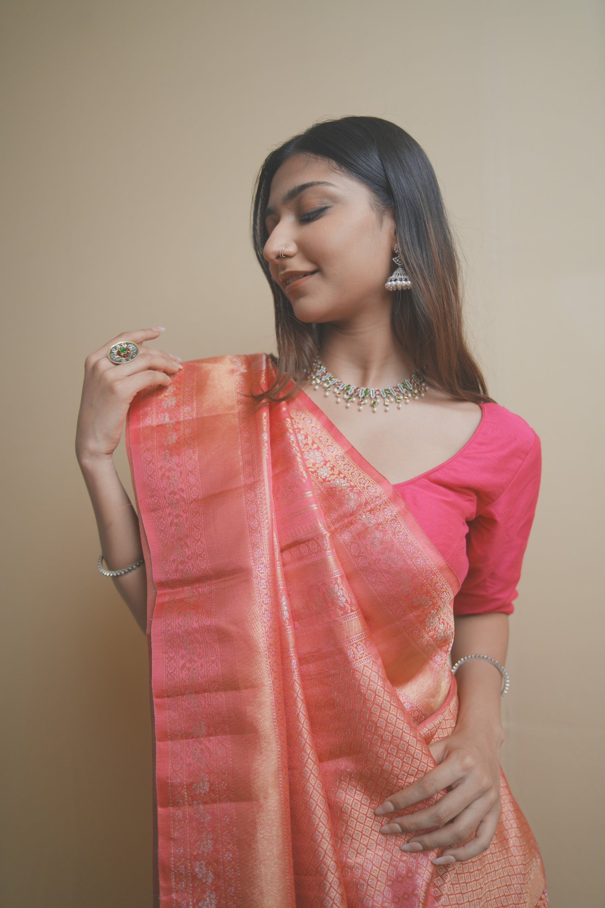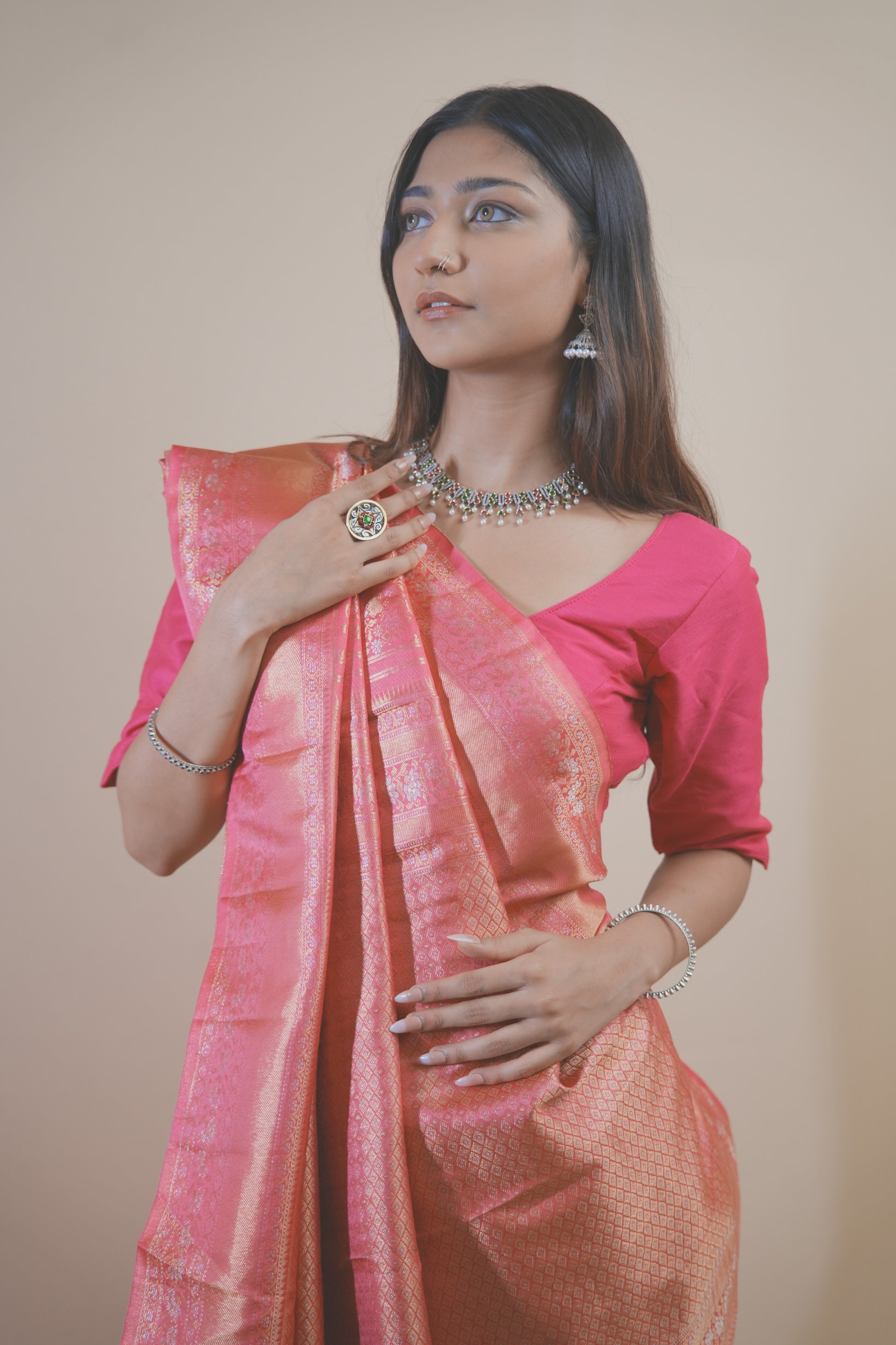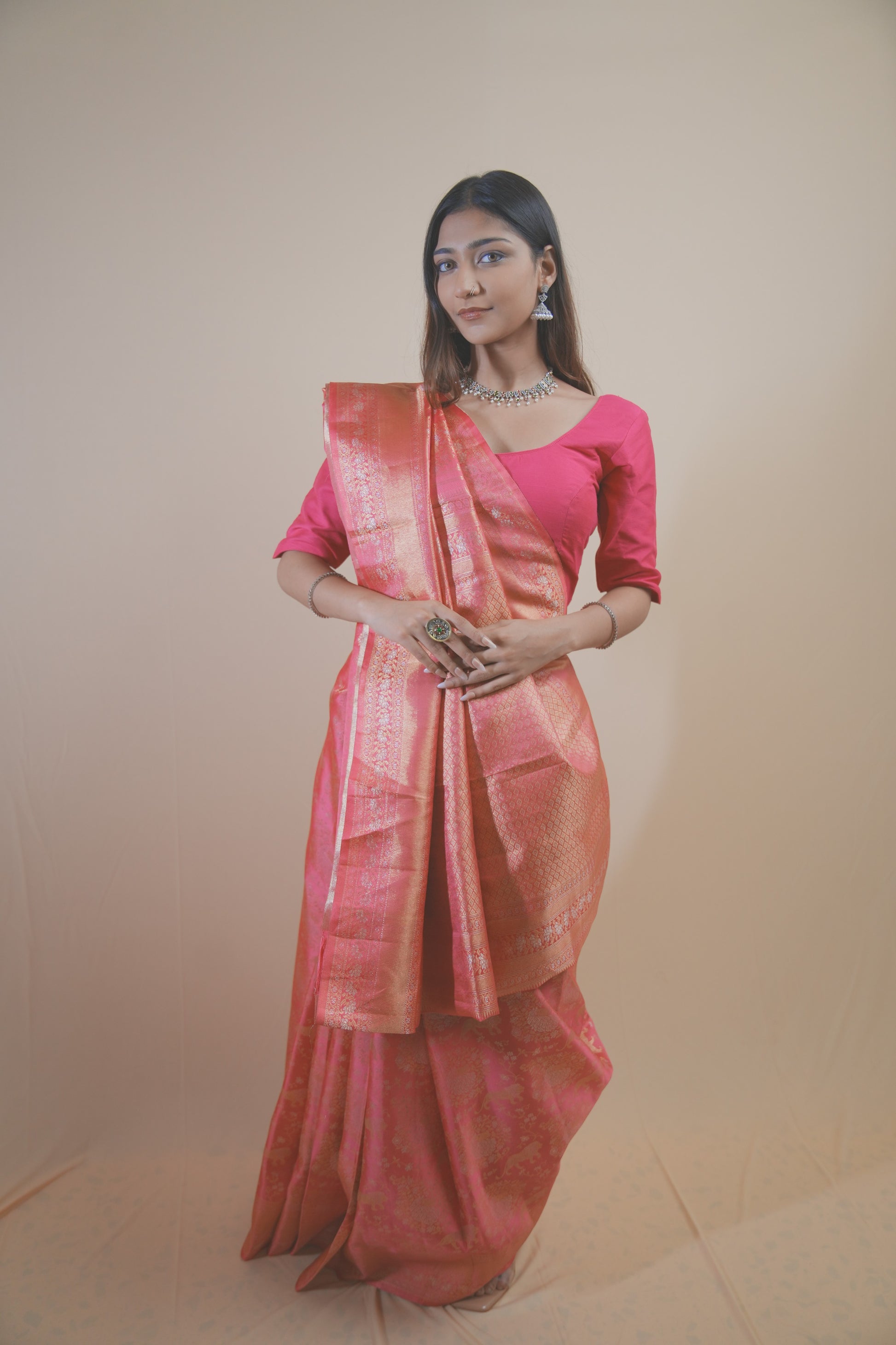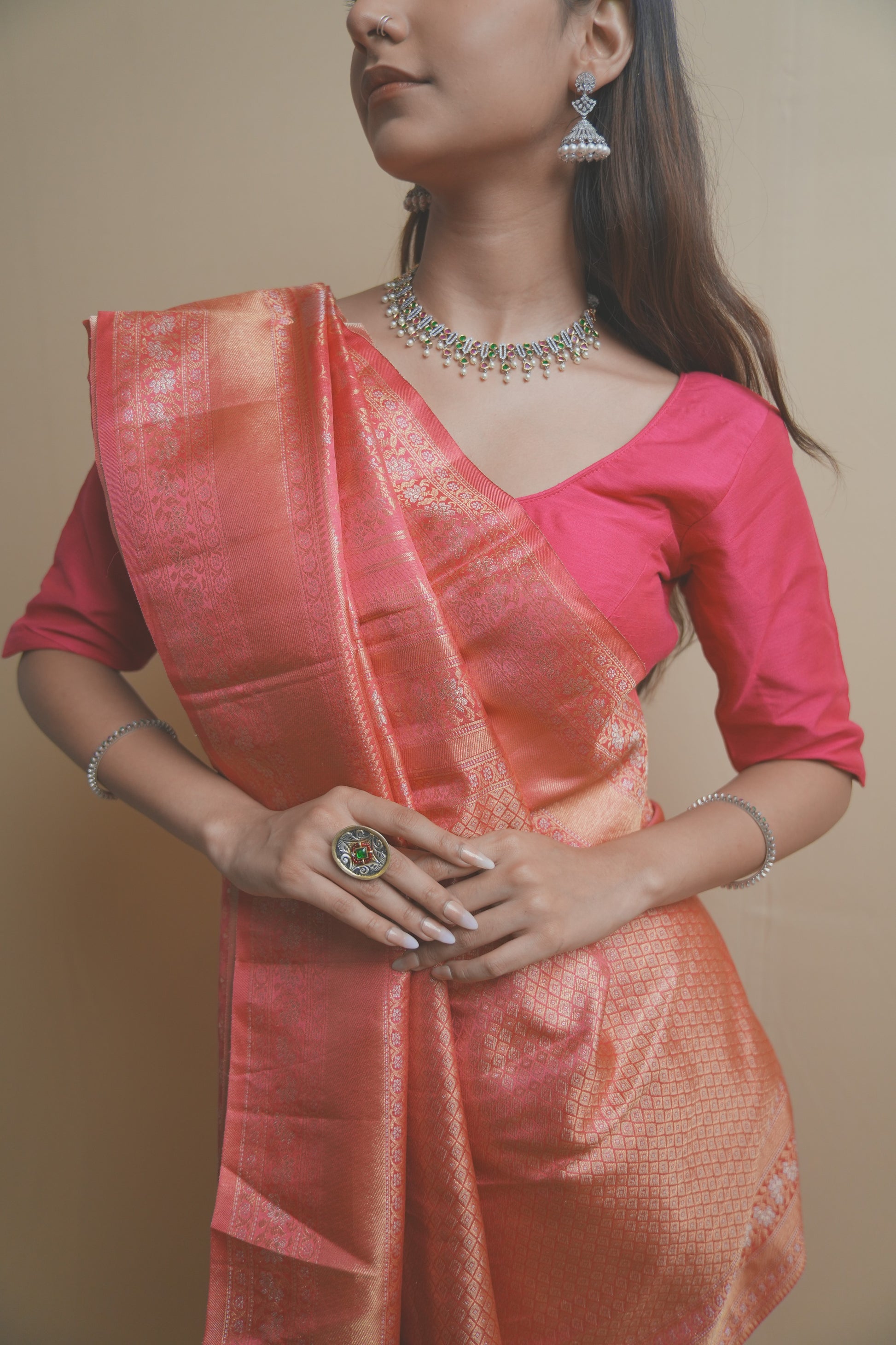 Step into timeless elegance with this exquisite Dharamavaram silk saree, drenched in a soft peach hue and adorned with detailed zari weaving. The rich pallu and intricate border showcase traditional craftsmanship at its finest, making it an ideal choice for weddings, festive occasions, and special celebrations. Paired with a matching blouse, this saree blends regal charm with modern grace.