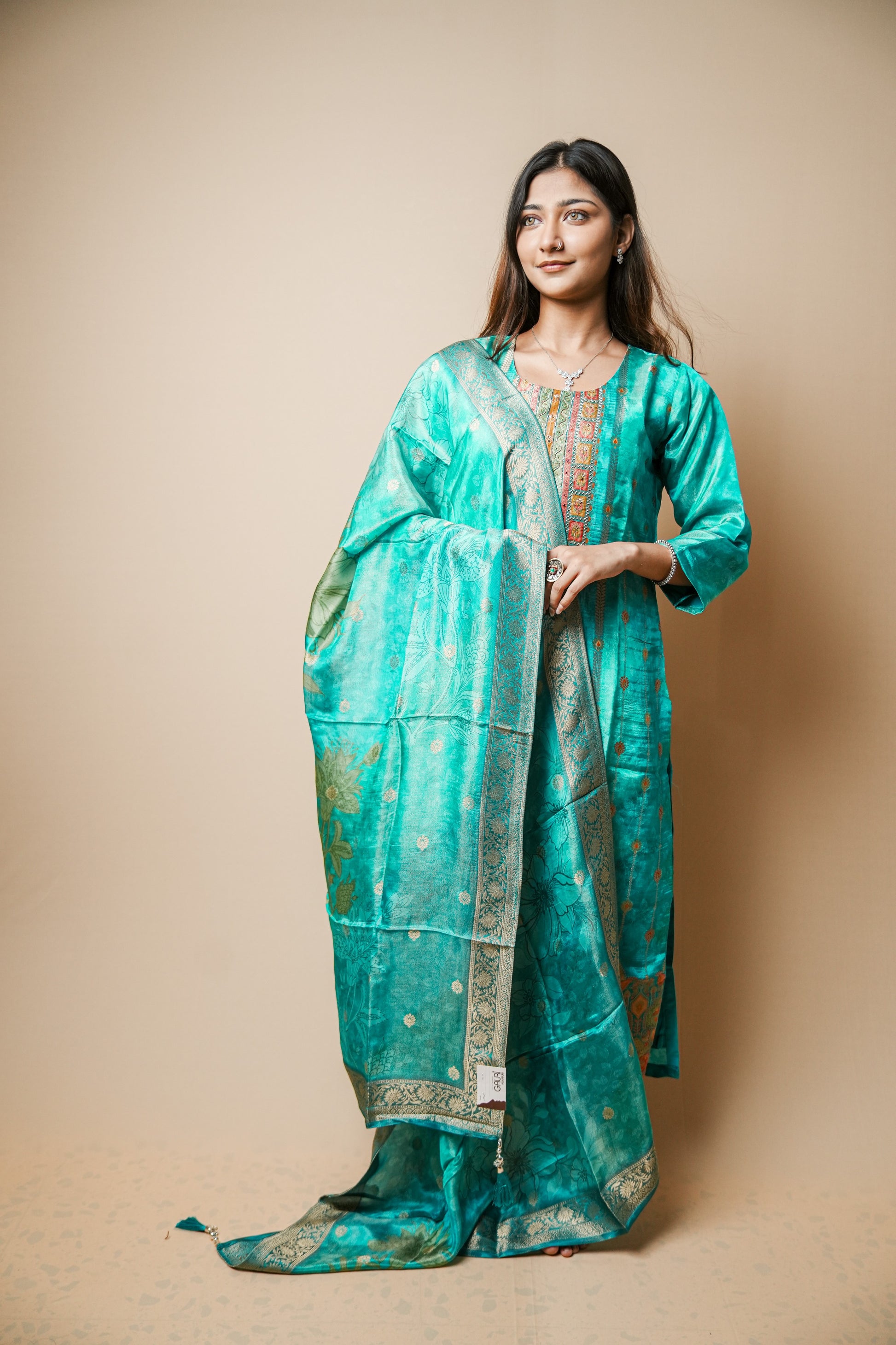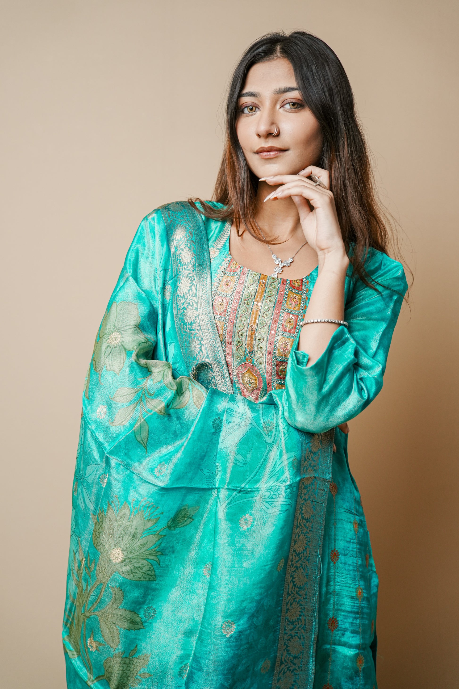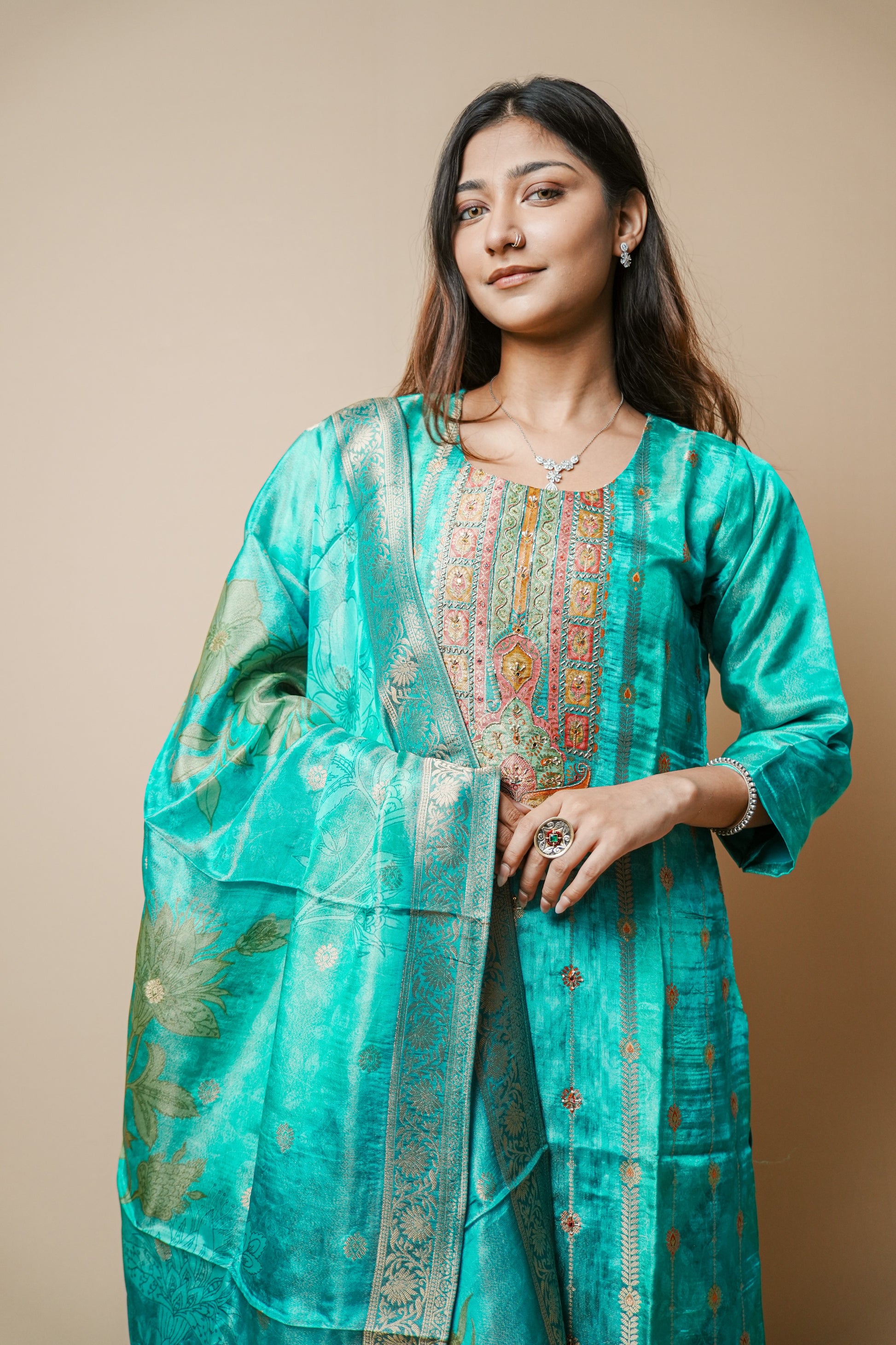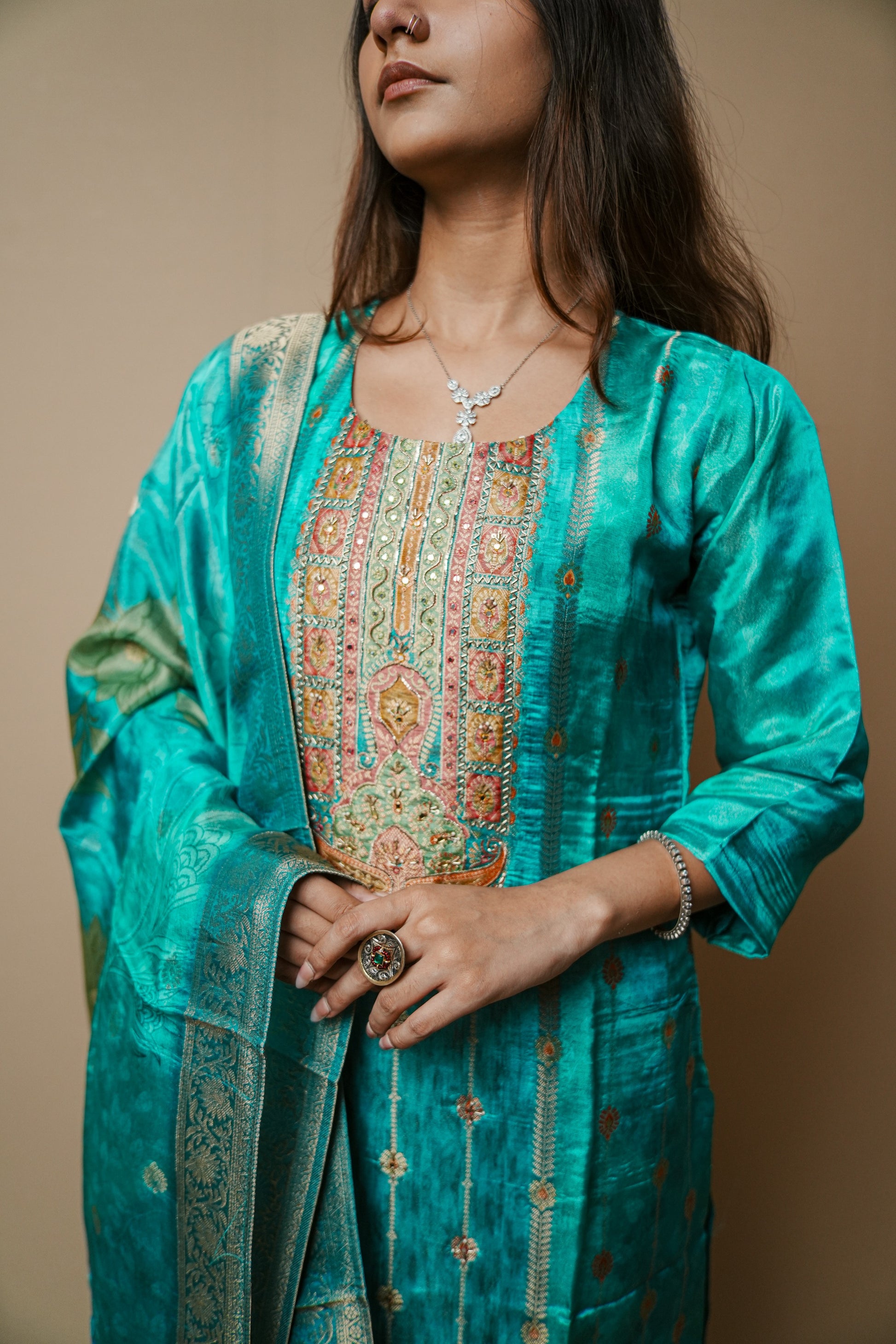 Elegant Teal Printed Silk Suit with Kardana & Mirror Embroidery
