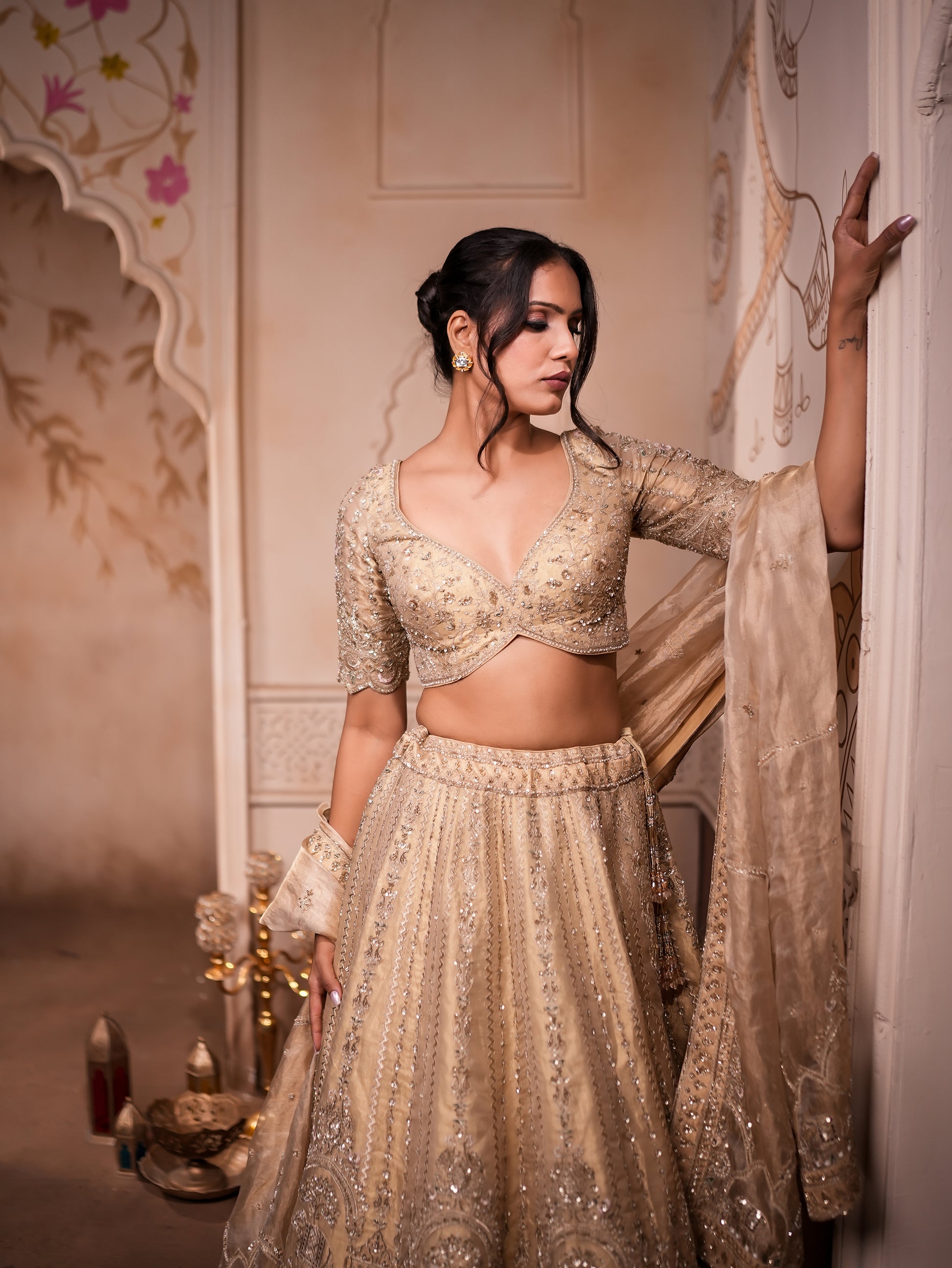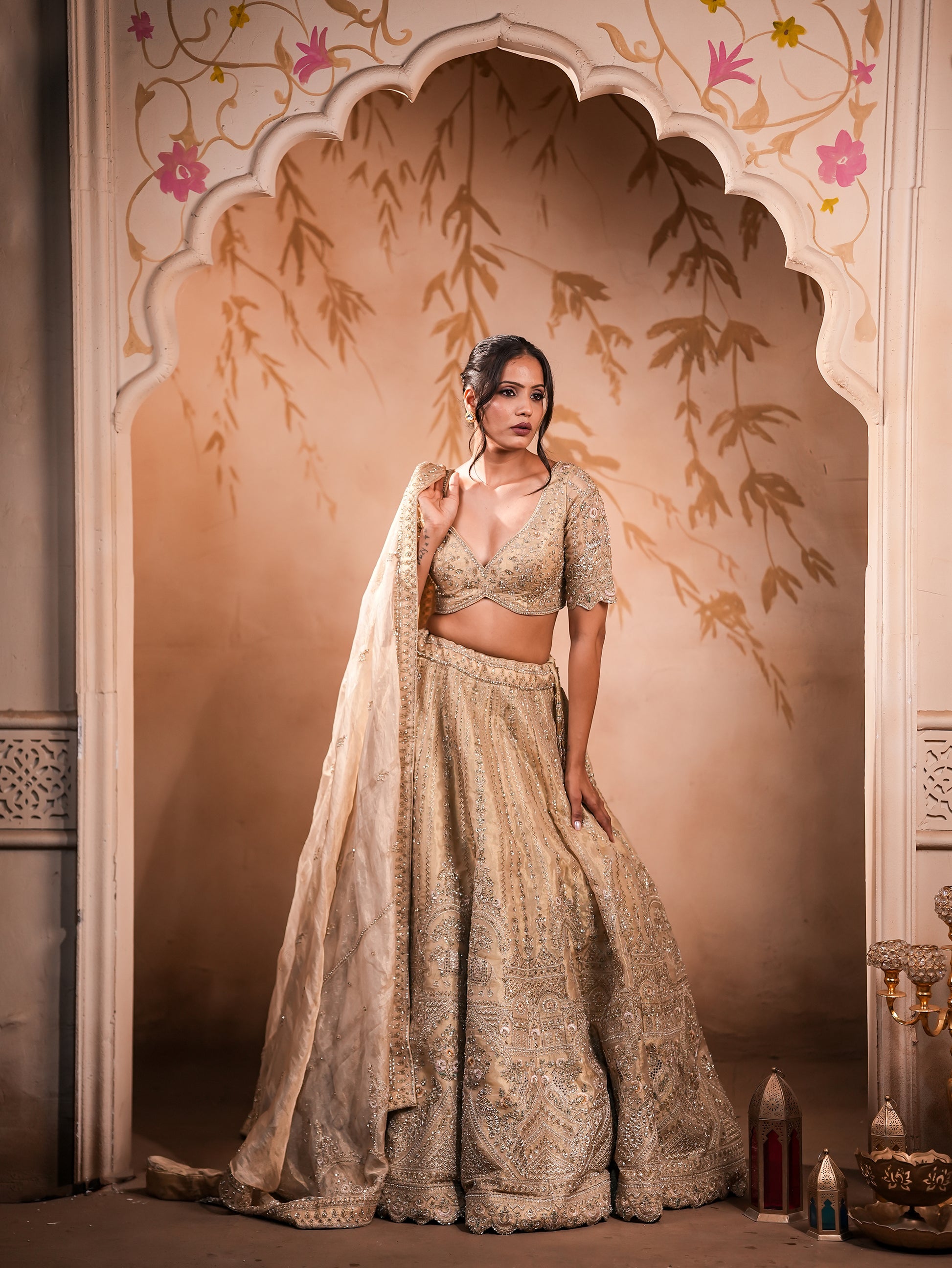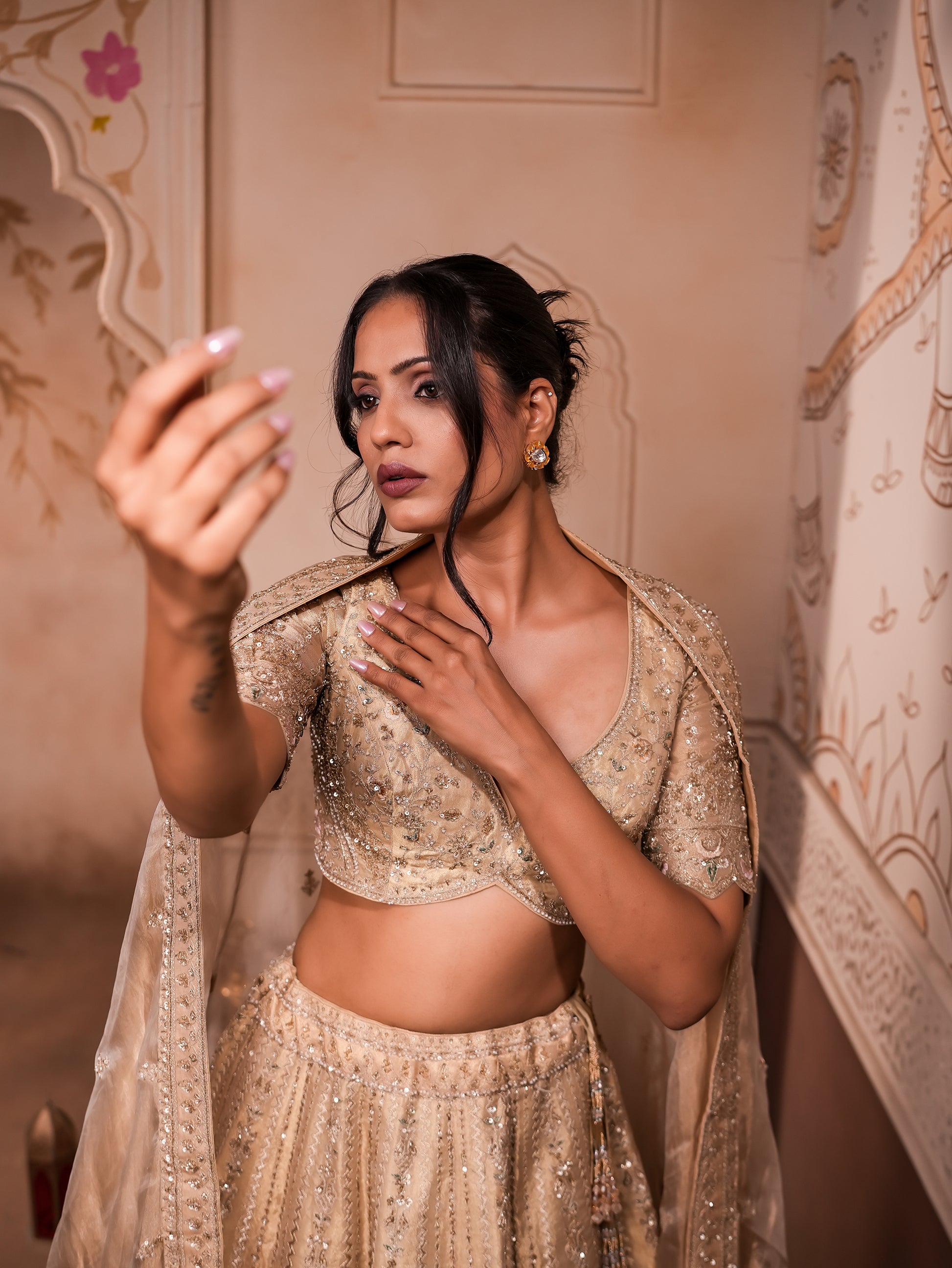 This tissue silk lehenga is crafted with rich tanchoi weaving and highlighted with intricate kardana handwork. The outfit includes a stitched blouse designed for comfort and style, a flared lehenga that exudes grandeur, and a matching single dupatta for a graceful finish. Ideal for weddings, sangeet, and festive occasions, this lehenga showcases a fine balance of traditional craftsmanship and timeless elegance.