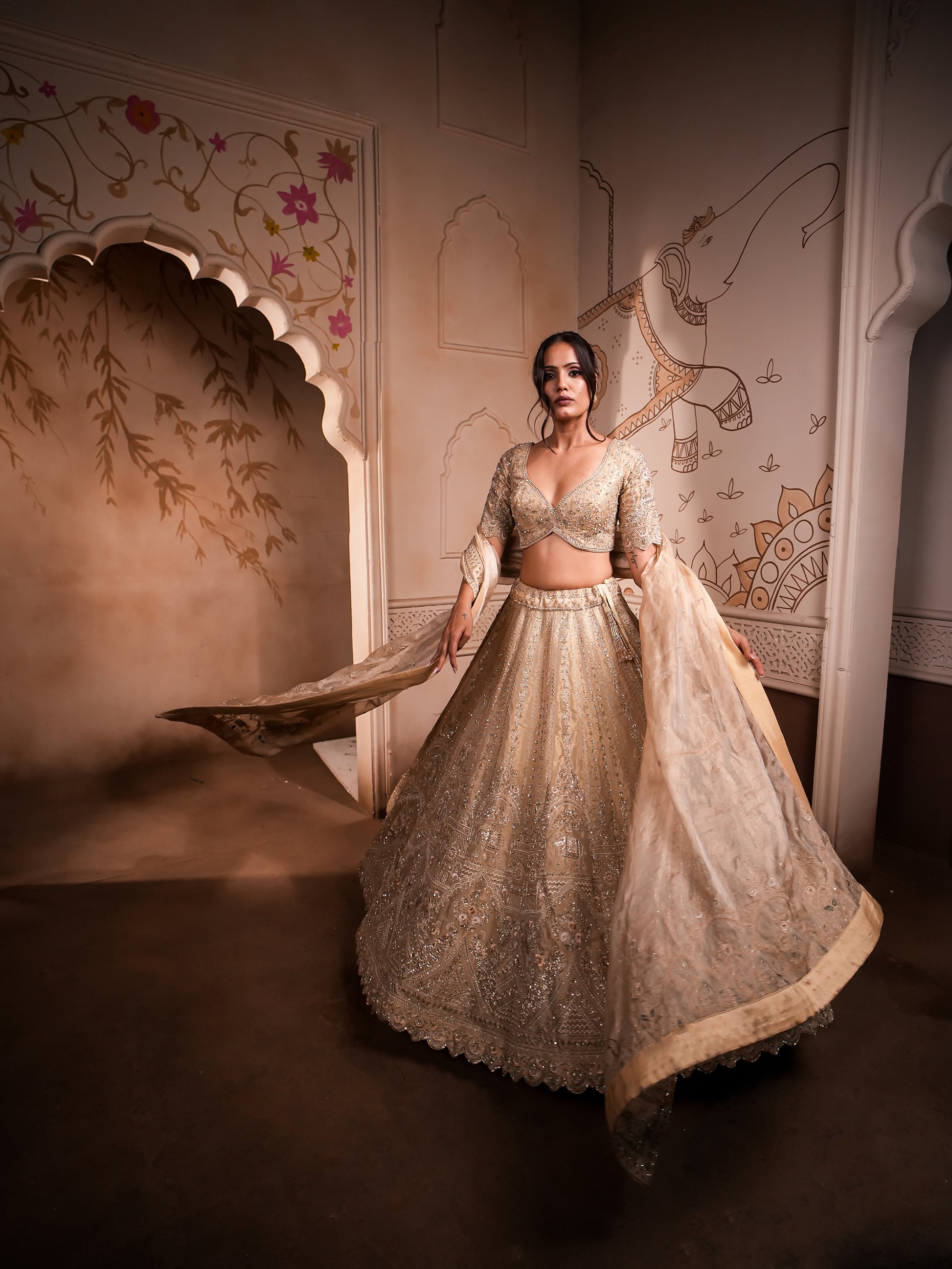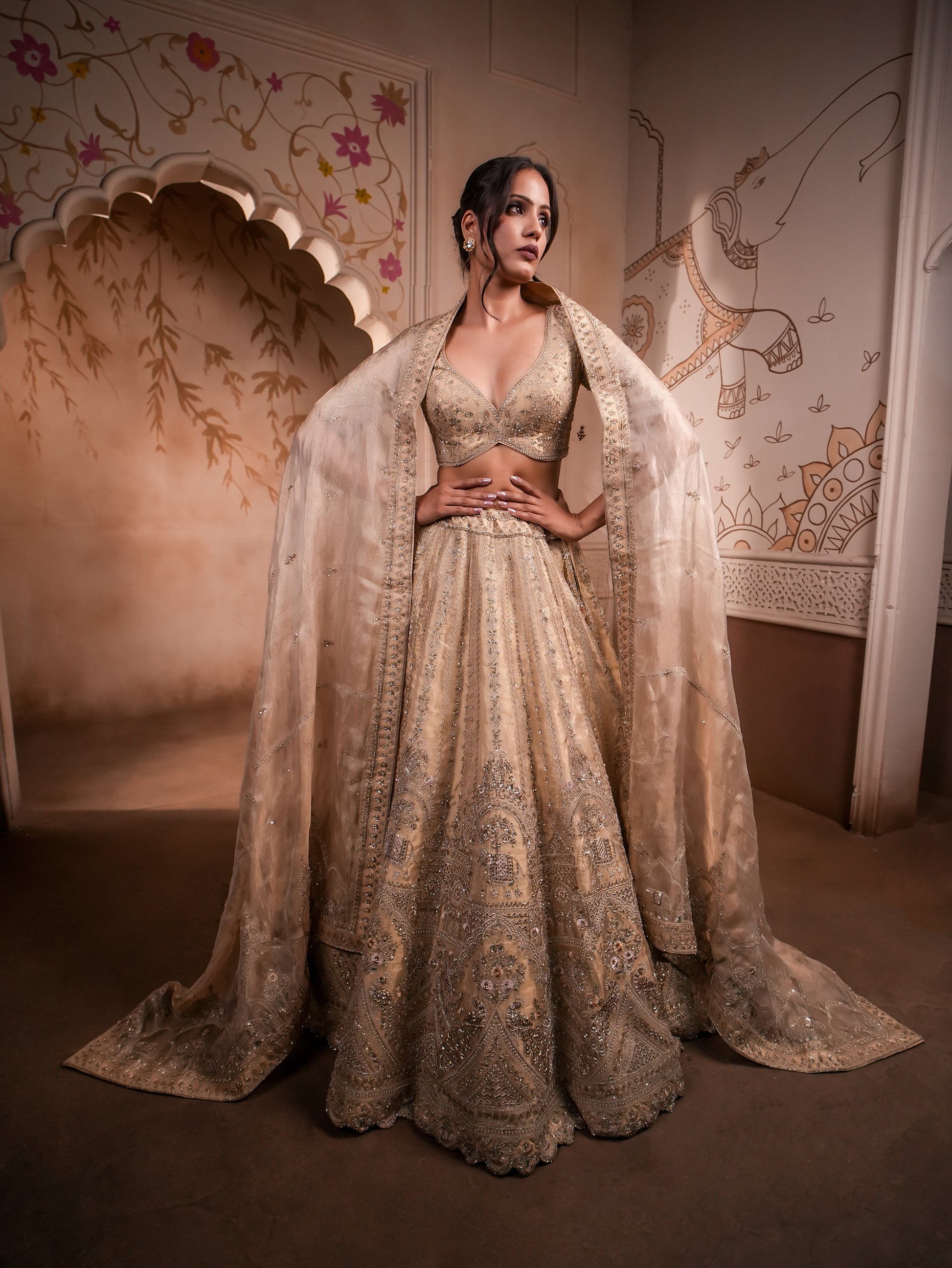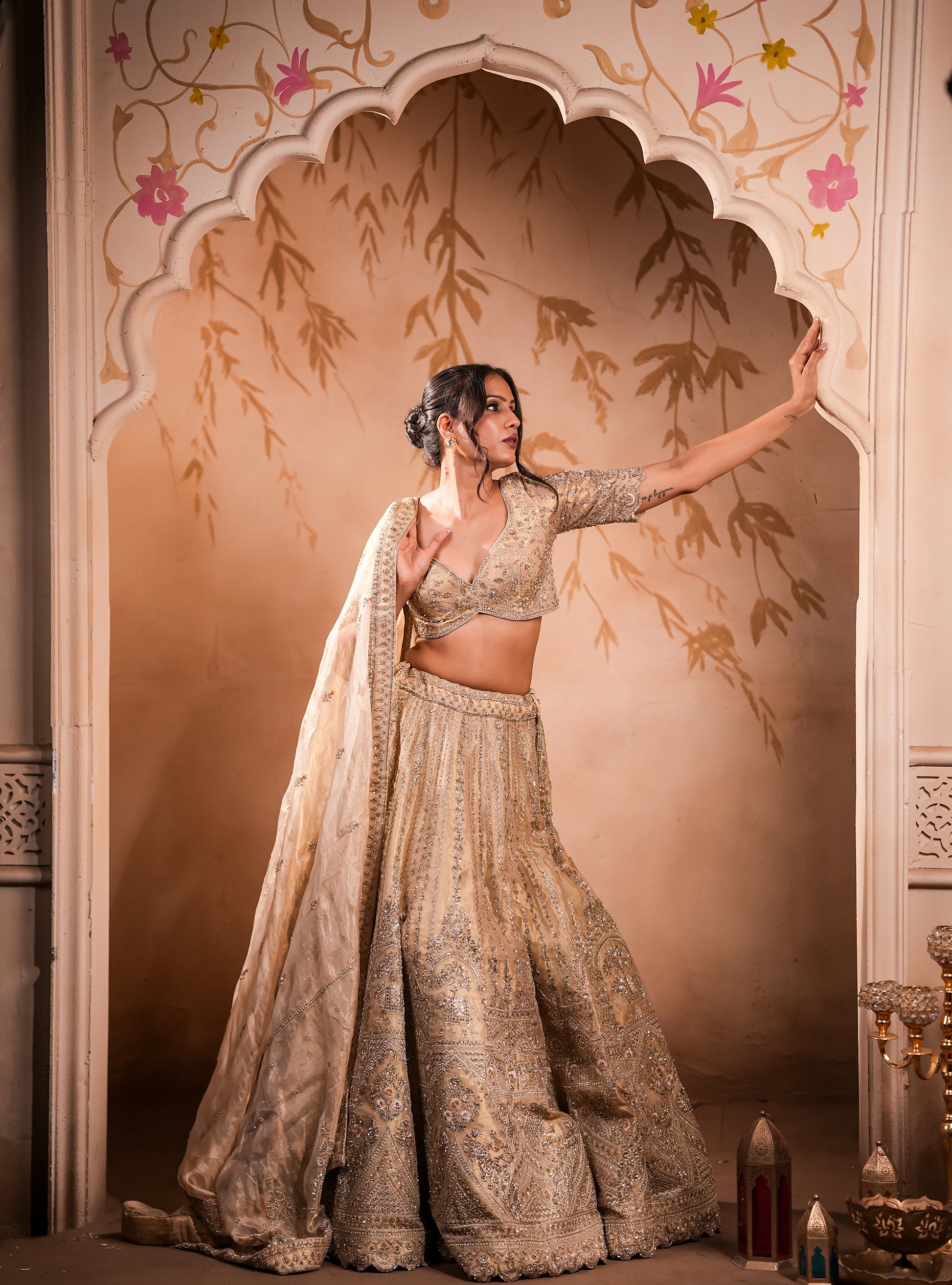 This tissue silk lehenga is crafted with rich tanchoi weaving and highlighted with intricate kardana handwork. The outfit includes a stitched blouse designed for comfort and style, a flared lehenga that exudes grandeur, and a matching single dupatta for a graceful finish. Ideal for weddings, sangeet, and festive occasions, this lehenga showcases a fine balance of traditional craftsmanship and timeless elegance.