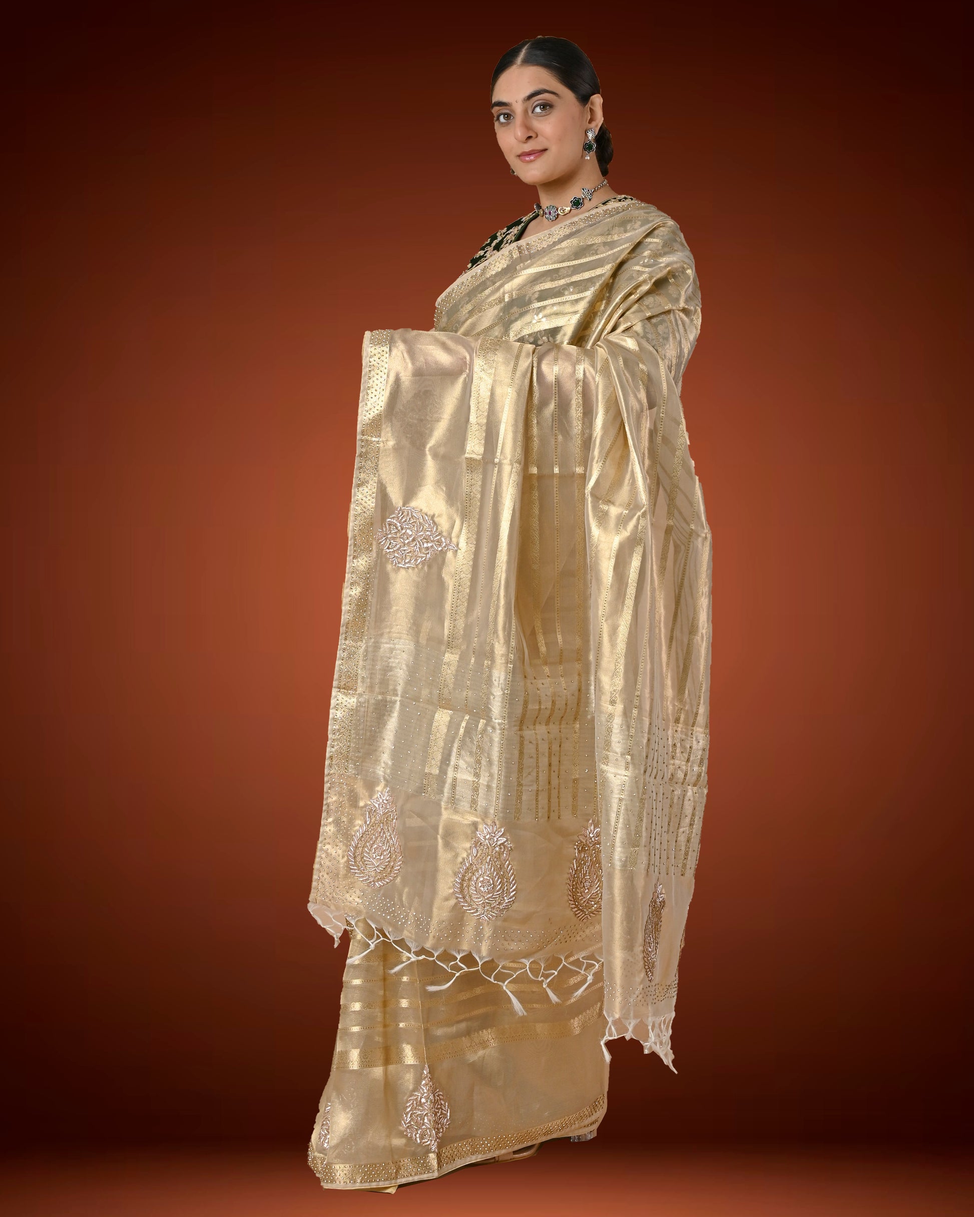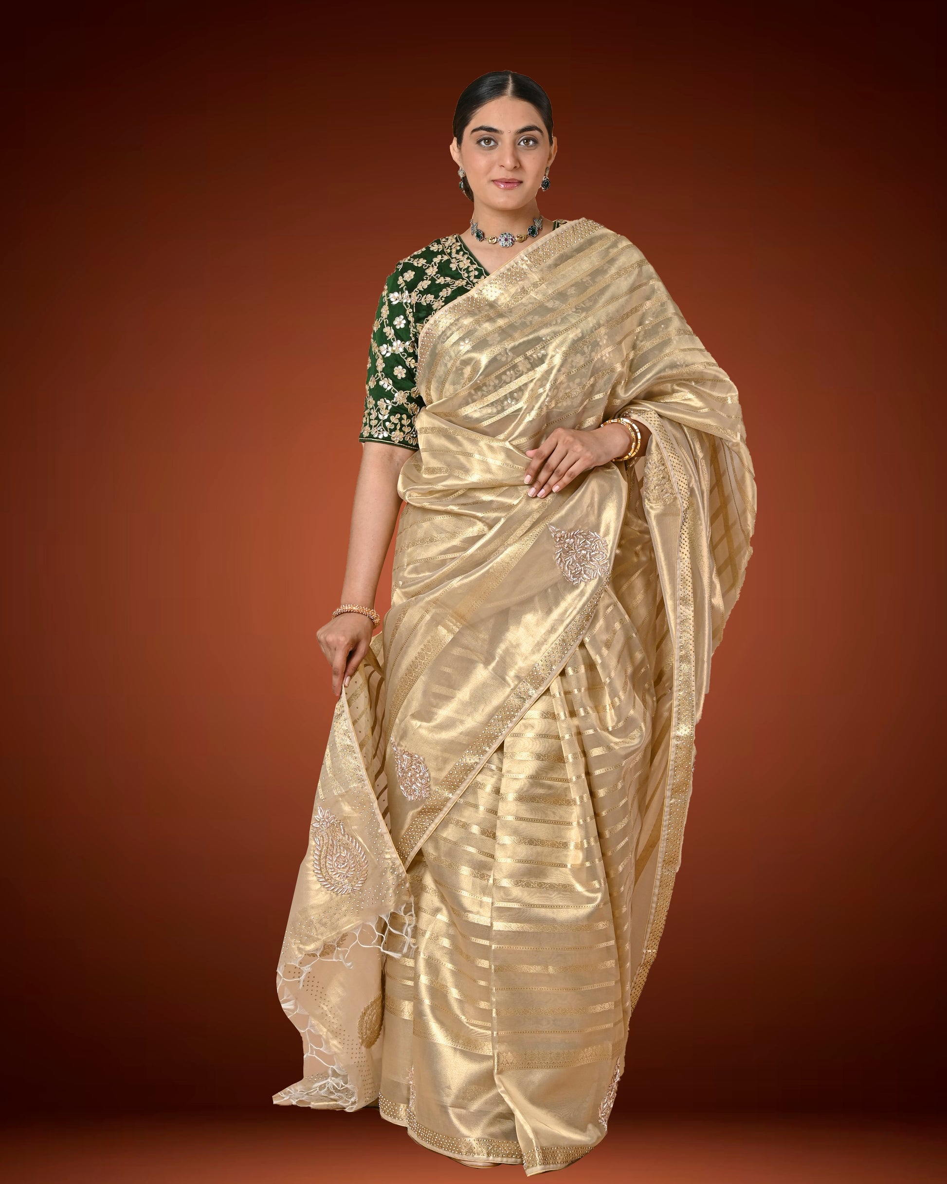 Gold Tissue Silk Saree with Jardosi and Diamond Embellishment & Green Embroidered Blouse