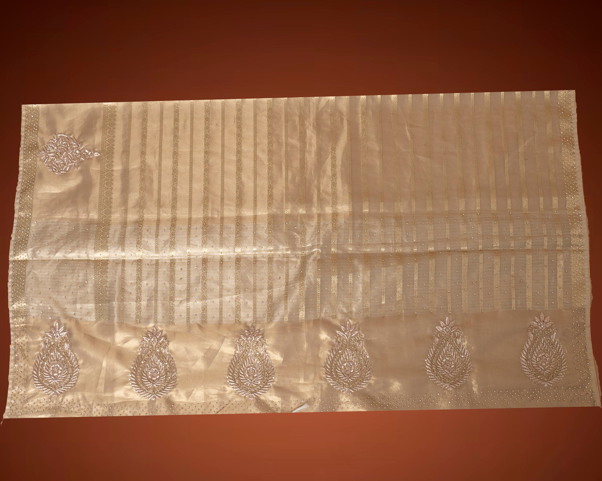 Make a regal statement with this golden tissue silk saree, featuring intricate jardosi work and diamond embellishments. The shimmering fabric drapes gracefully, while the rich green embroidered blouse adds a striking contrast. Perfect for weddings, festive occasions, and celebrations.