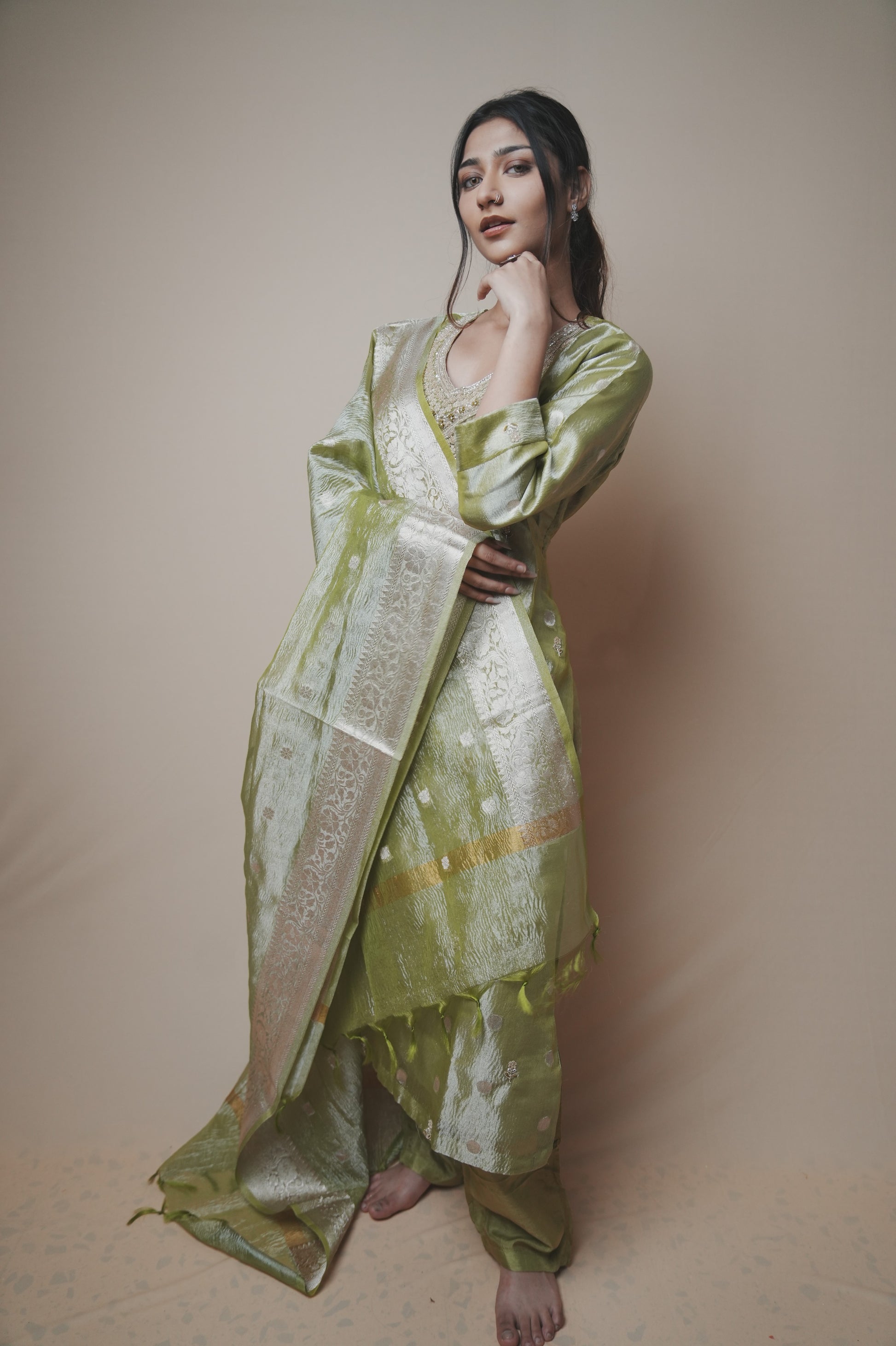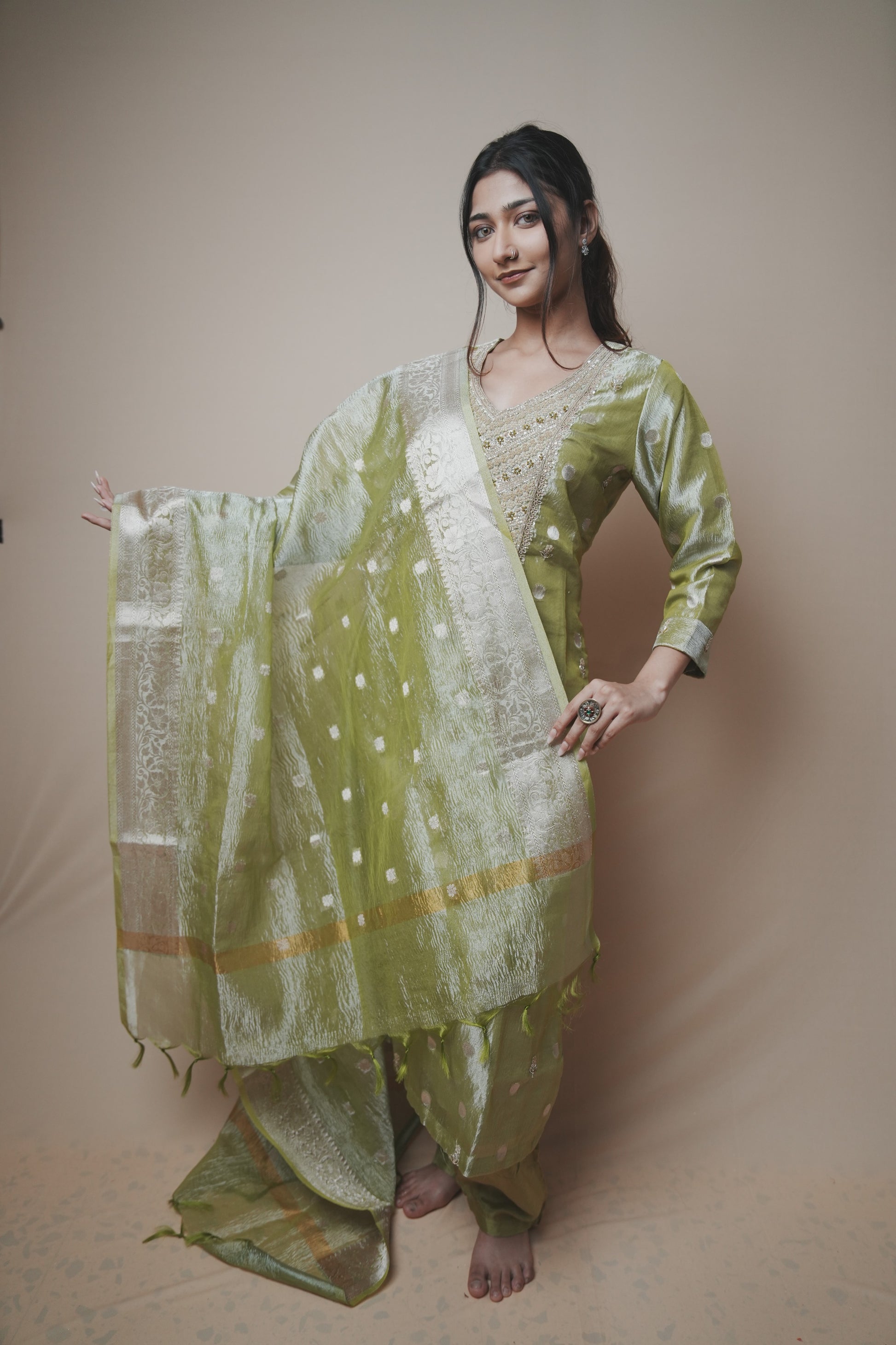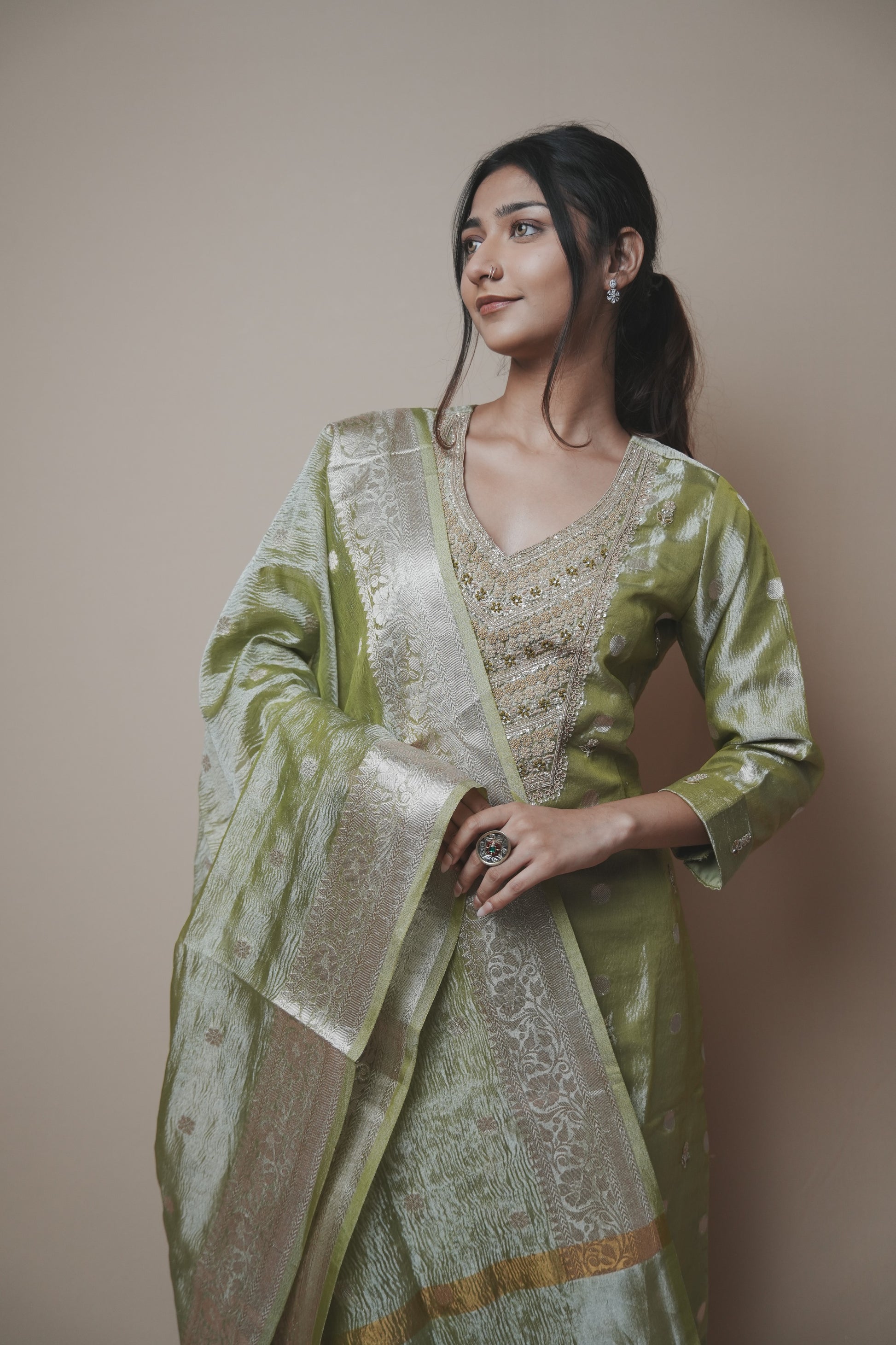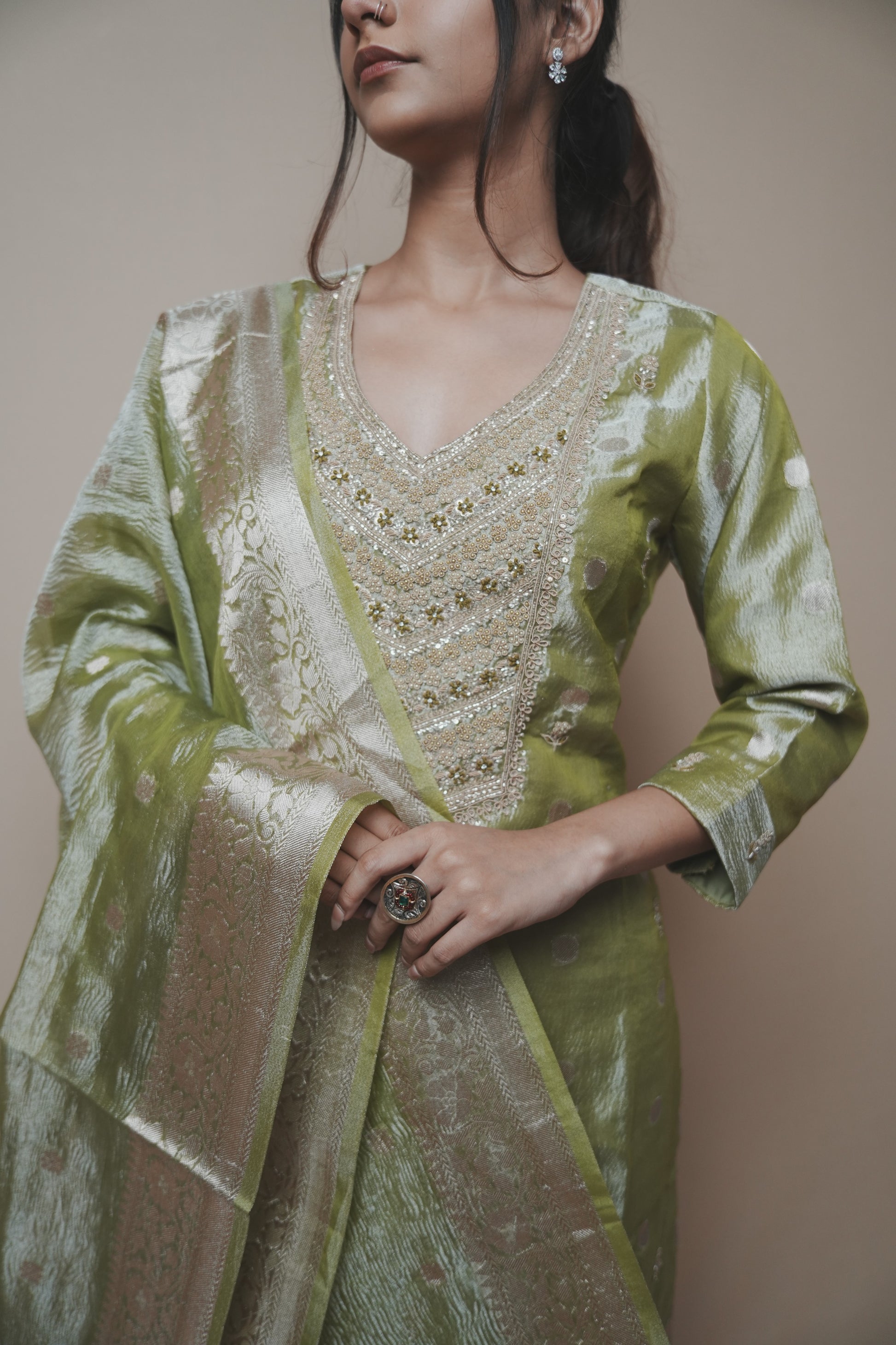 Green Tissue Banarasi Silk Suit Set with Hand-Embroidered Neckline