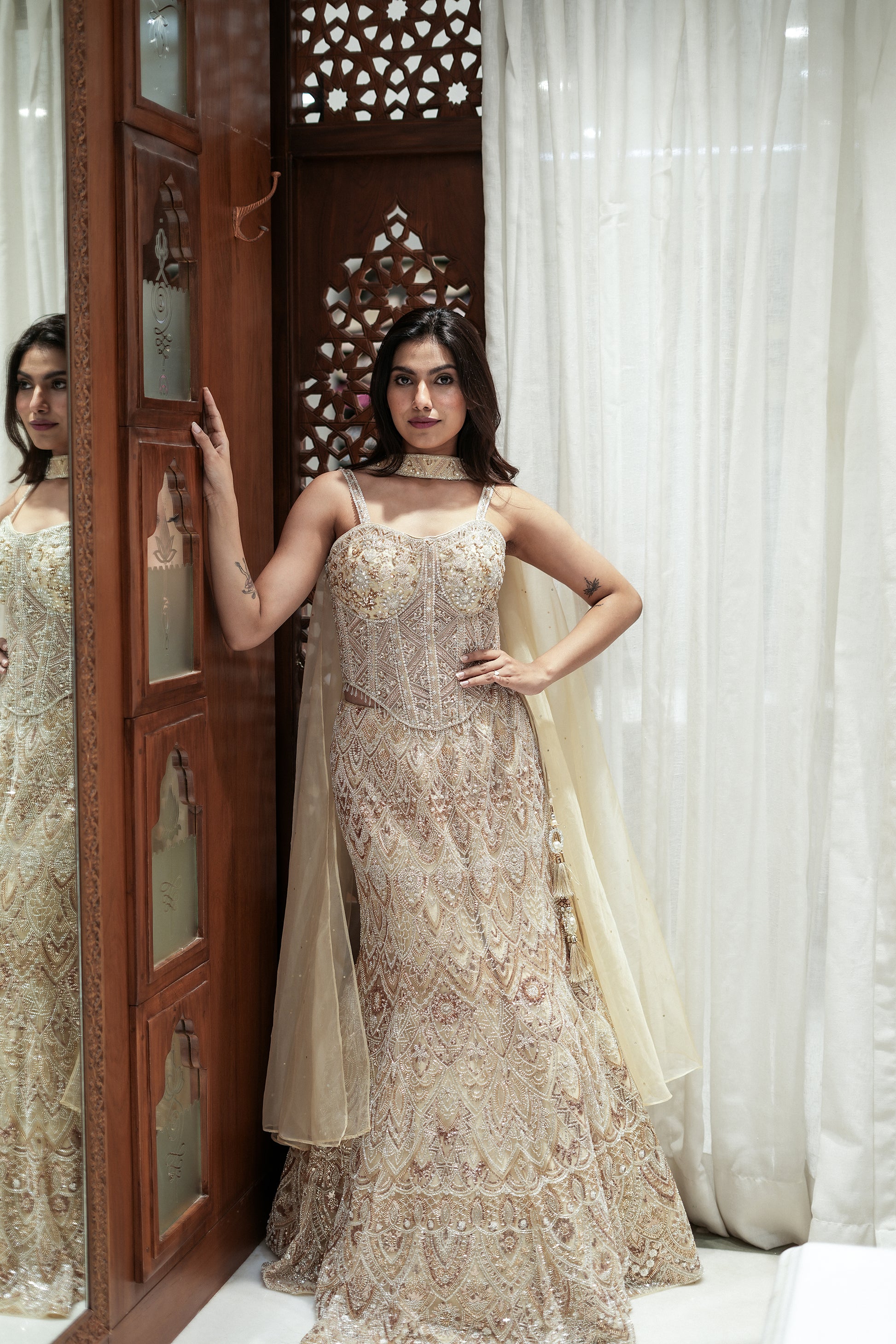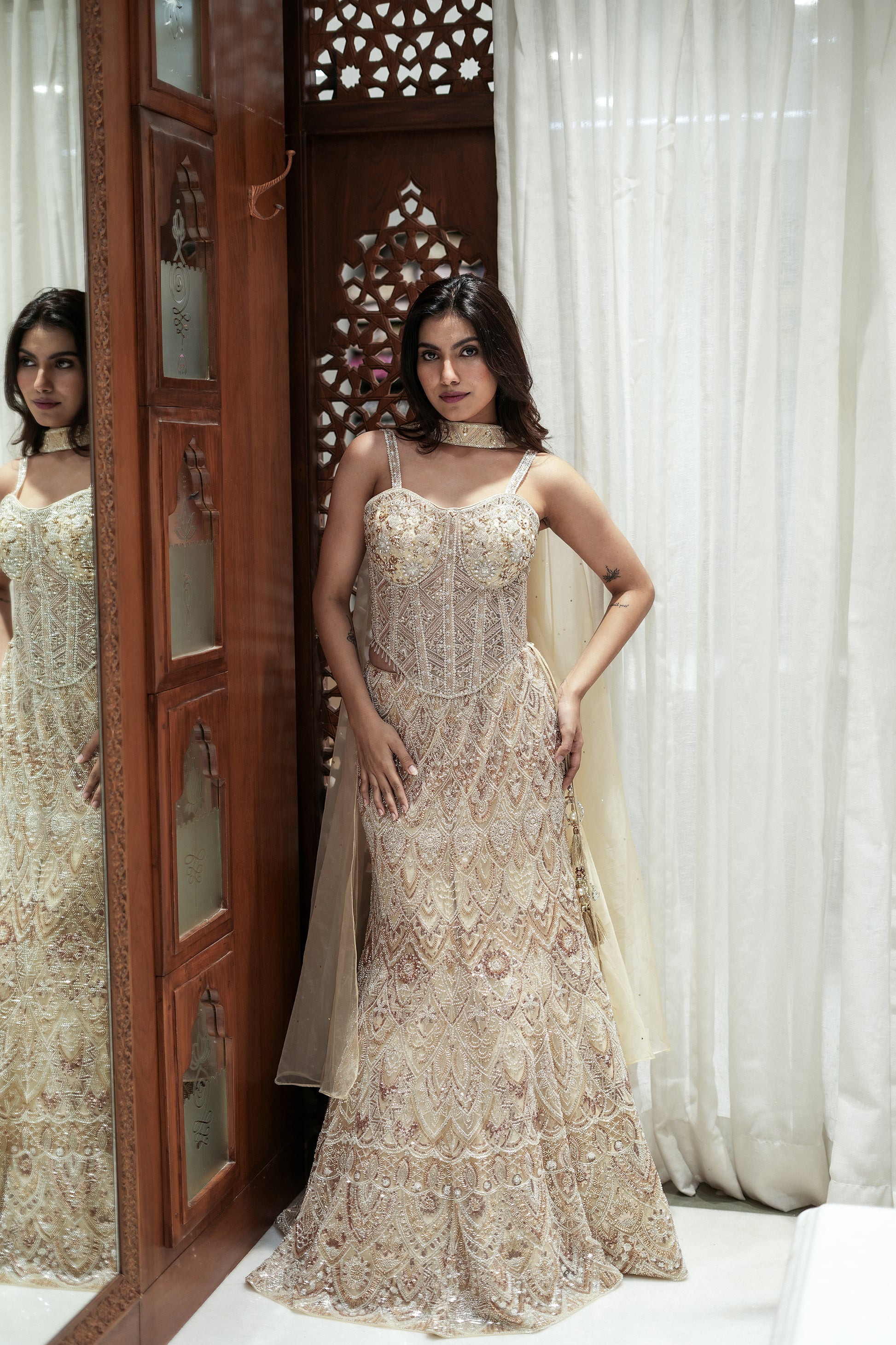 Sophisticated fish-cut silhouette paired with a structured corset-style choli, adorned with intricate tonal embroidery and a sheer dupatta