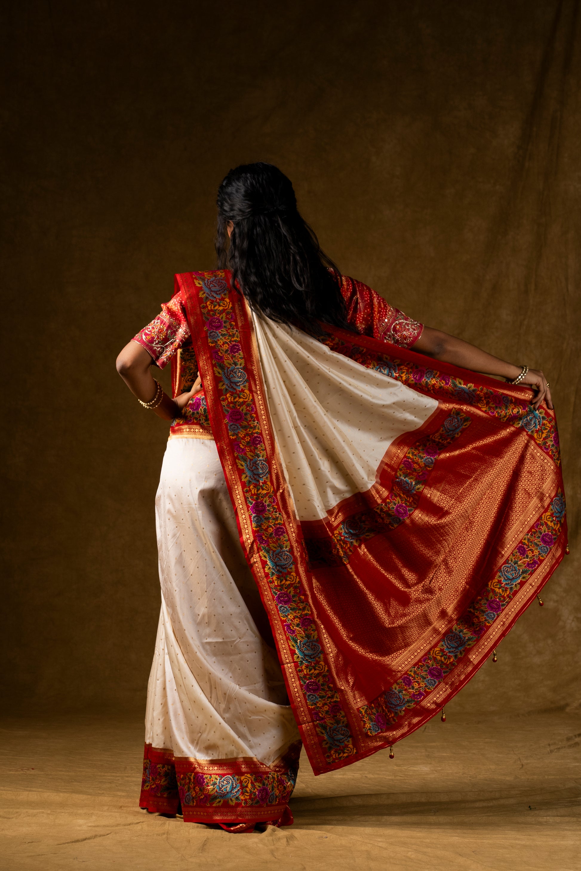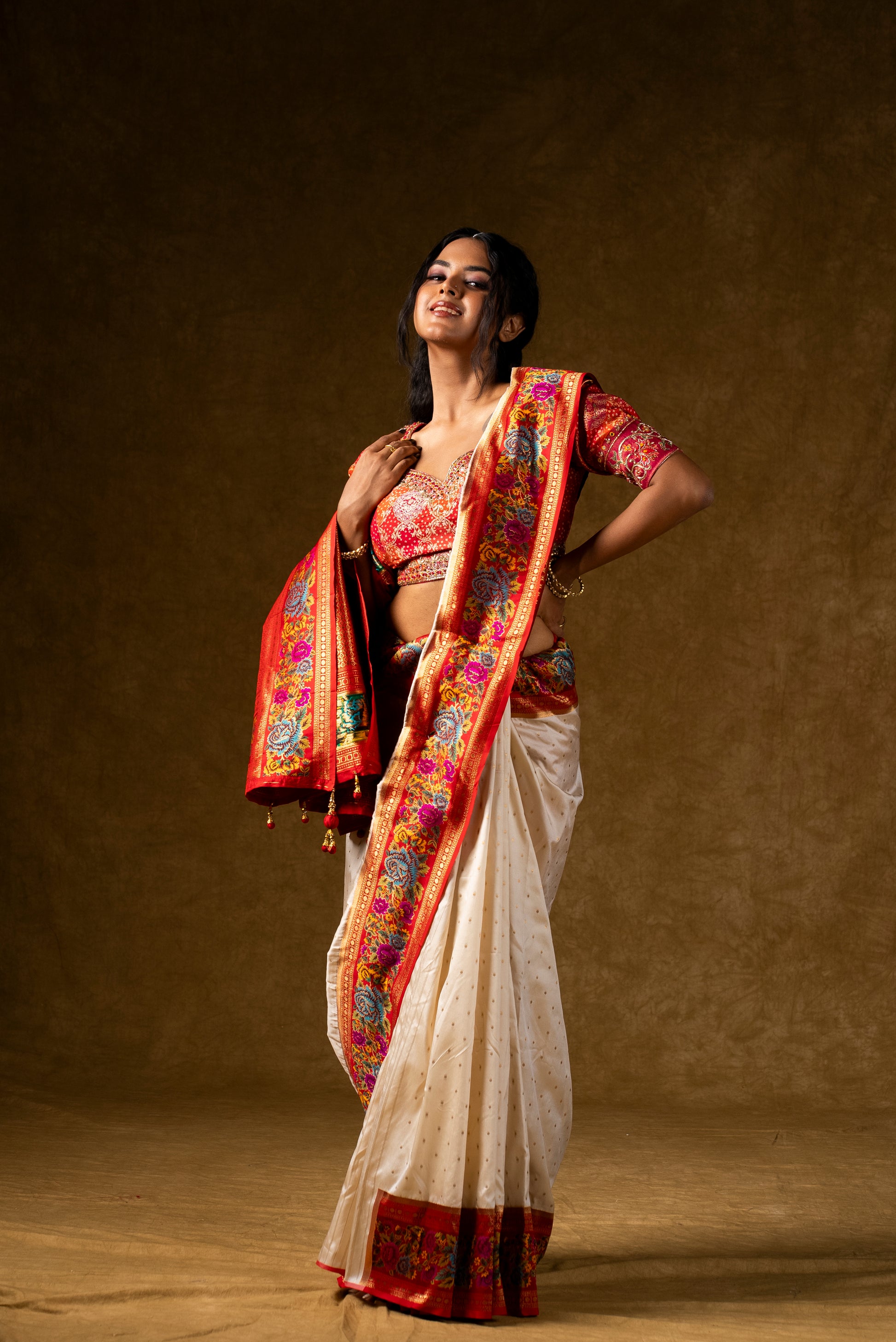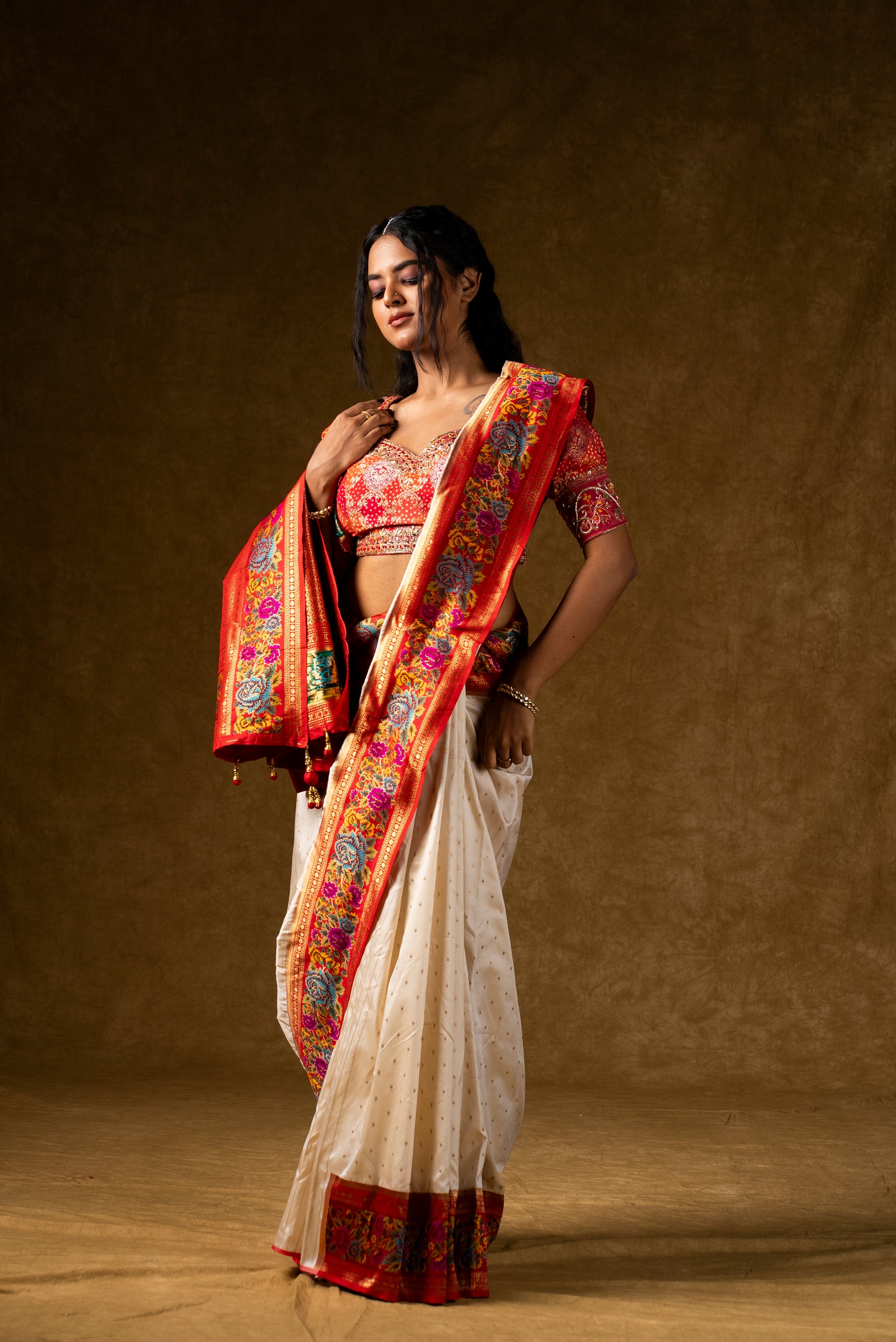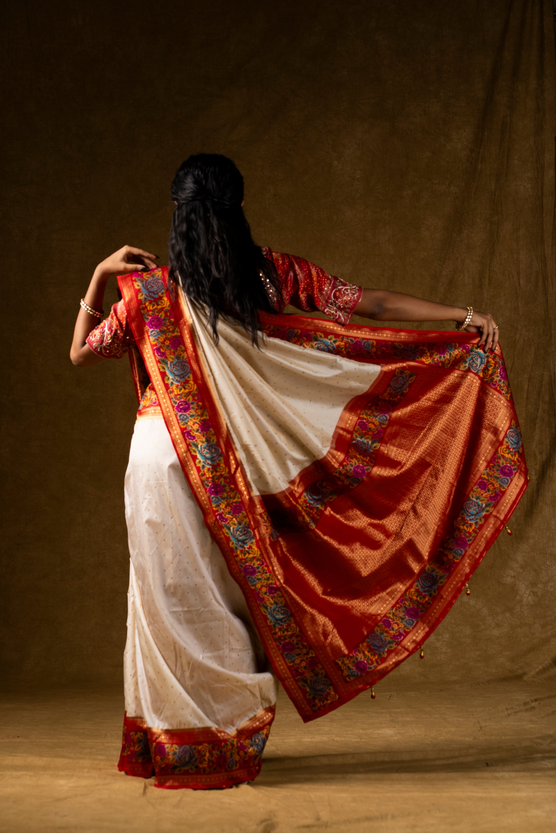 This saree stands out with its timeless ivory base complemented by a bold red pallu adorned with intricate zari work and multicolor border embroidery. Perfect for weddings or festive occasions, this saree blends tradition with vibrant detailing, offering unmatched elegance.