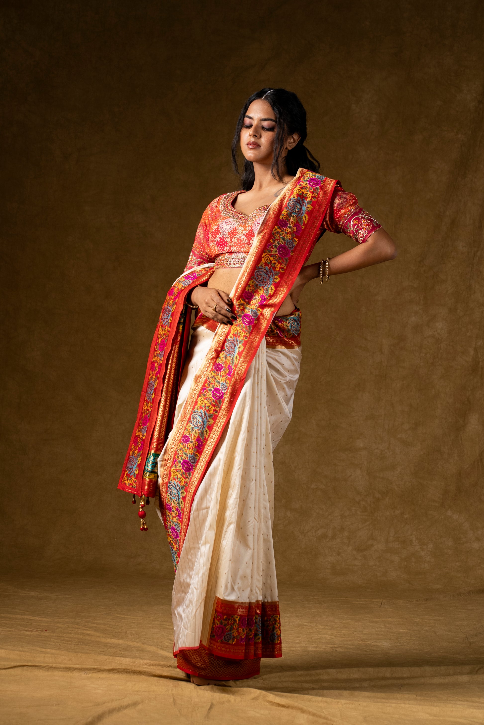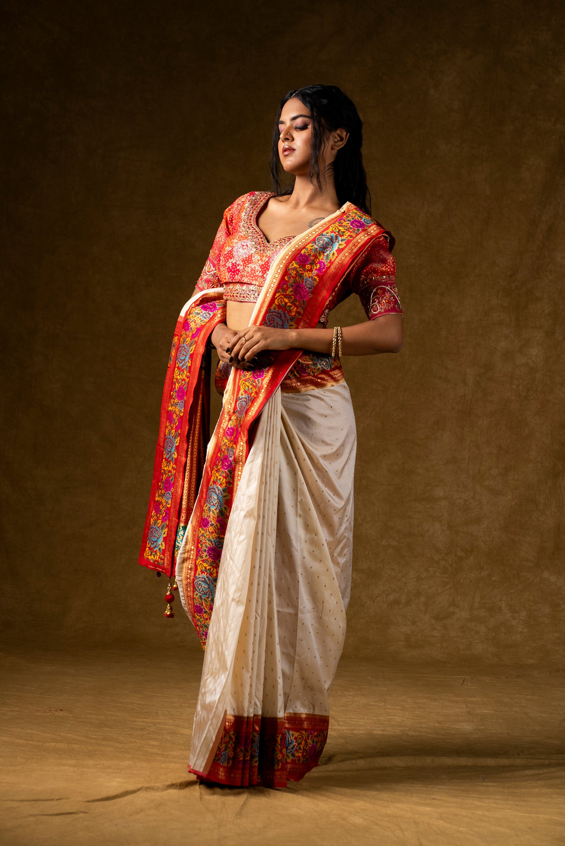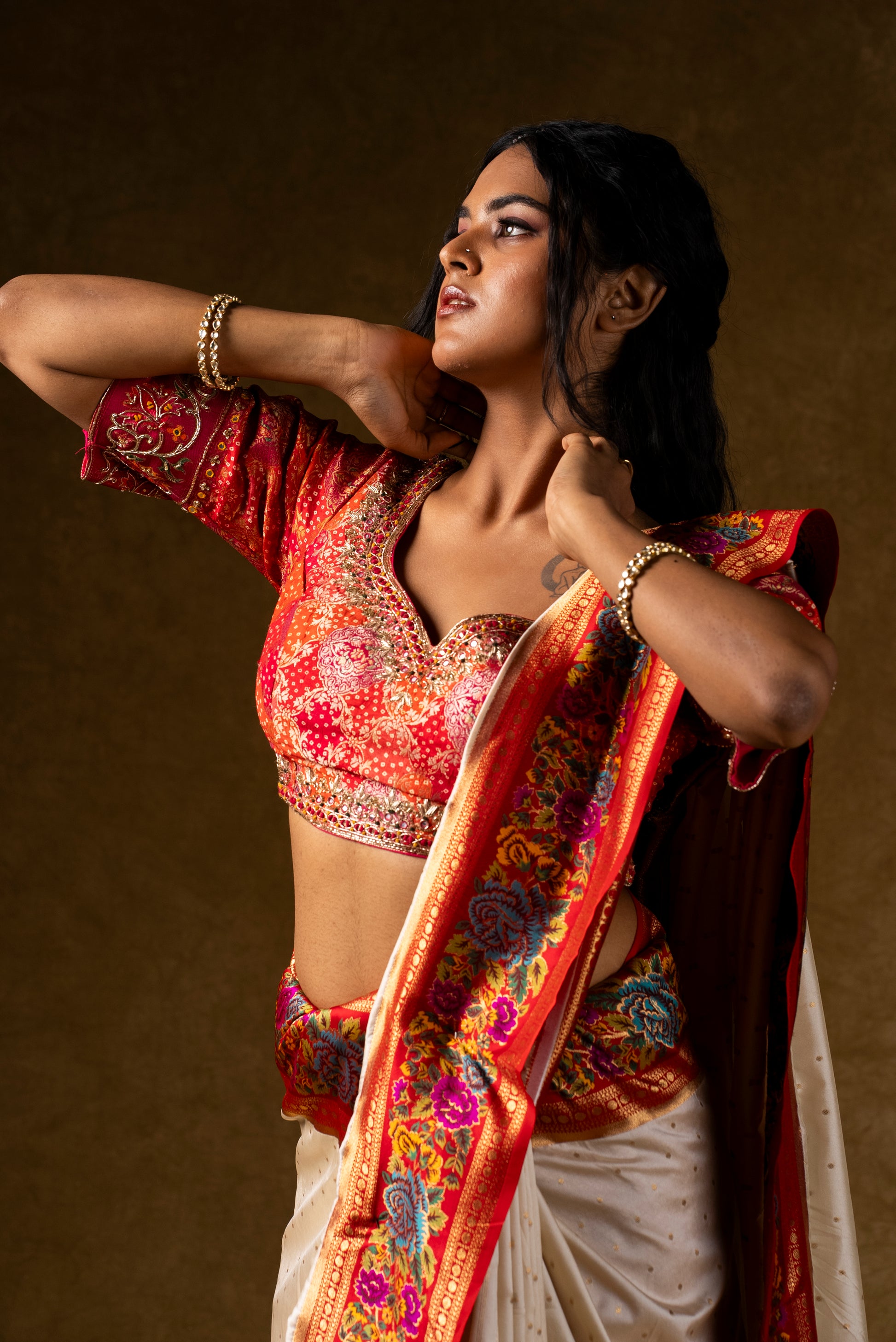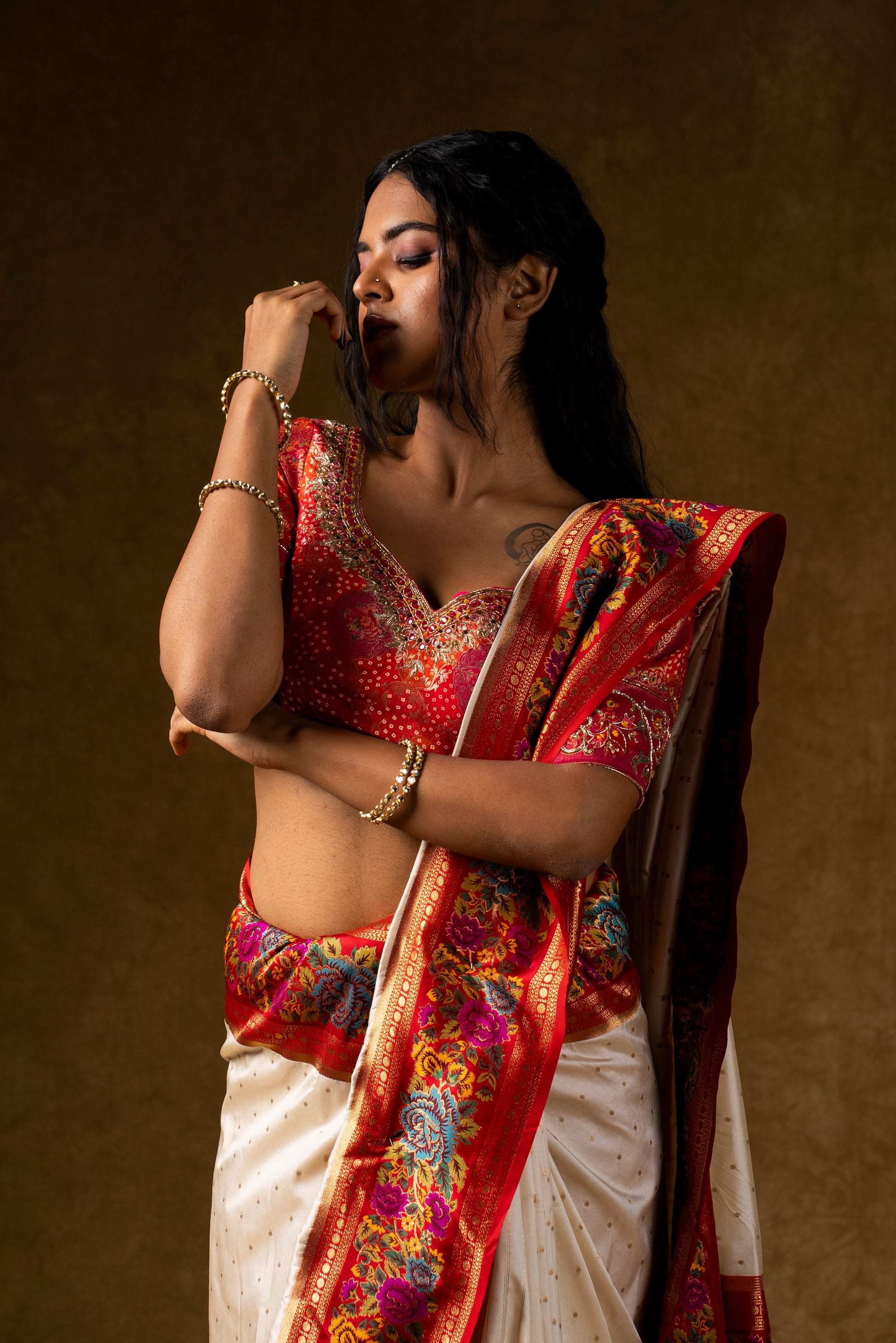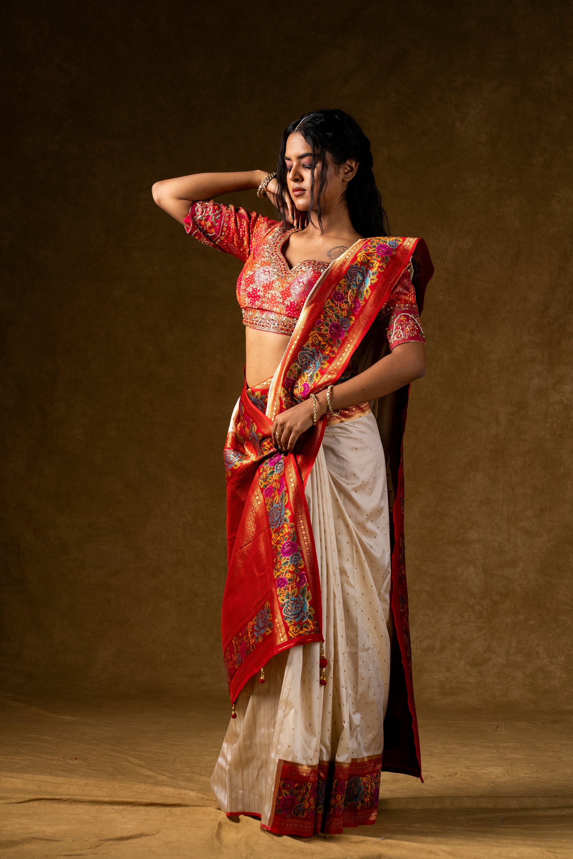 This saree stands out with its timeless ivory base complemented by a bold red pallu adorned with intricate zari work and multicolor border embroidery. Perfect for weddings or festive occasions, this saree blends tradition with vibrant detailing, offering unmatched elegance.