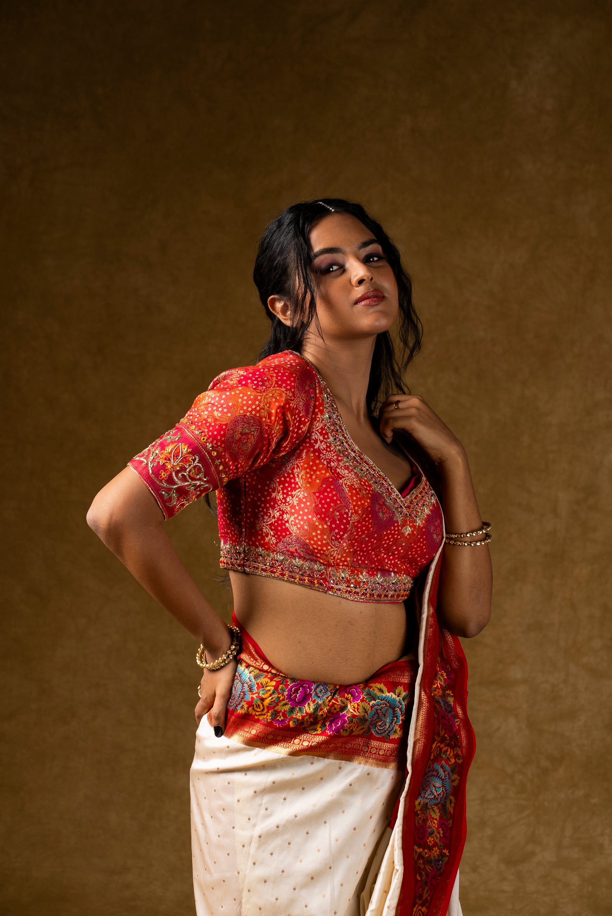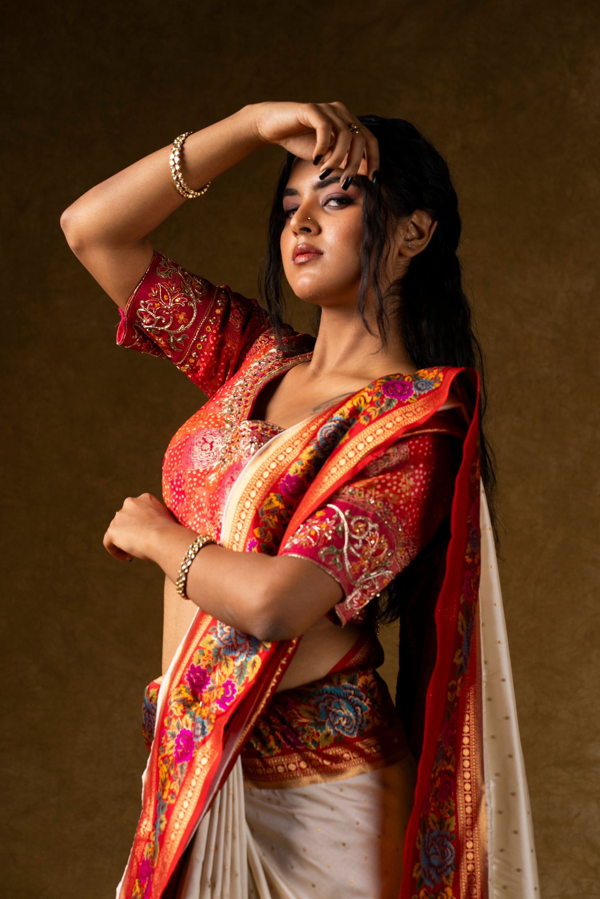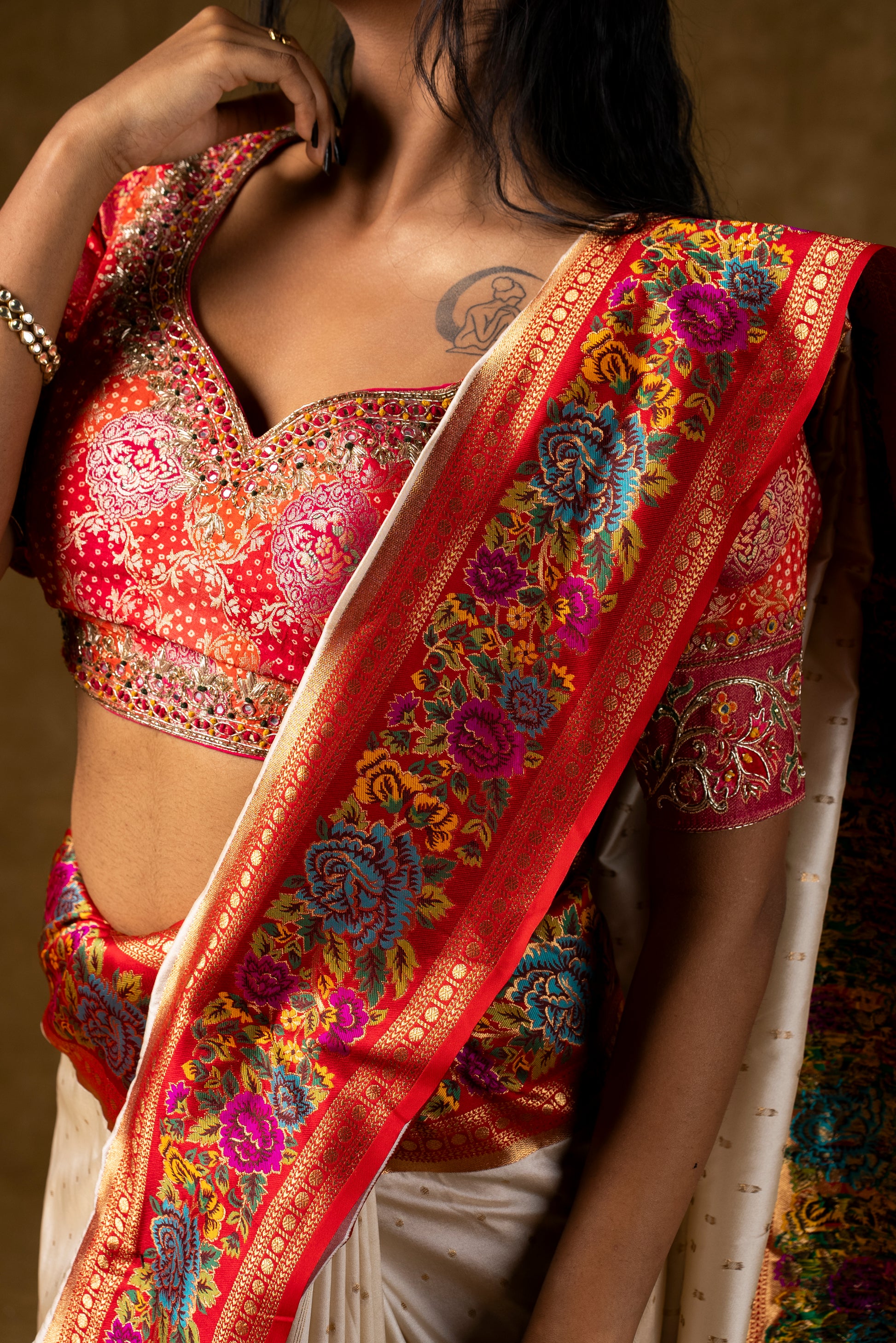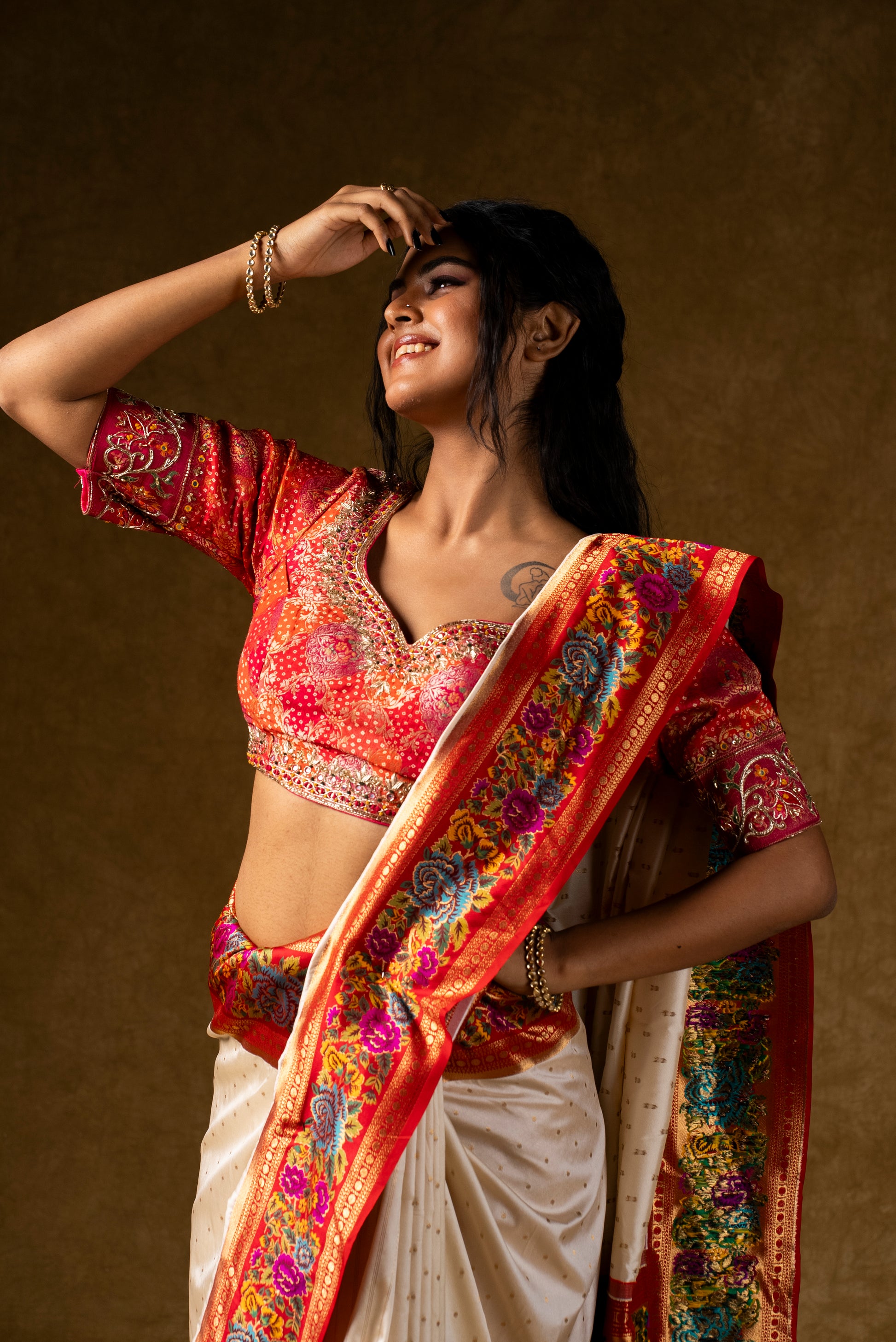 This saree stands out with its timeless ivory base complemented by a bold red pallu adorned with intricate zari work and multicolor border embroidery. Perfect for weddings or festive occasions, this saree blends tradition with vibrant detailing, offering unmatched elegance.