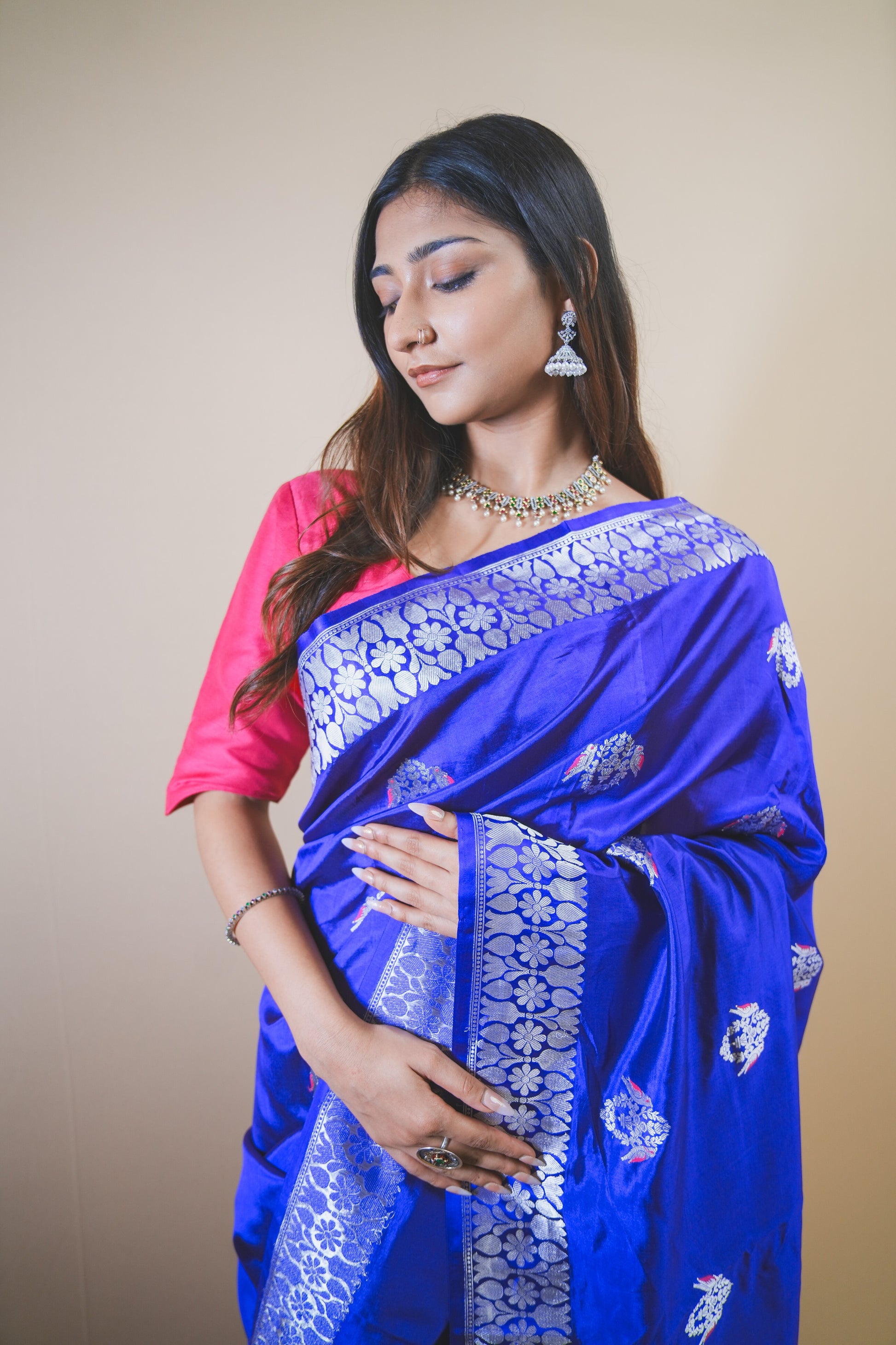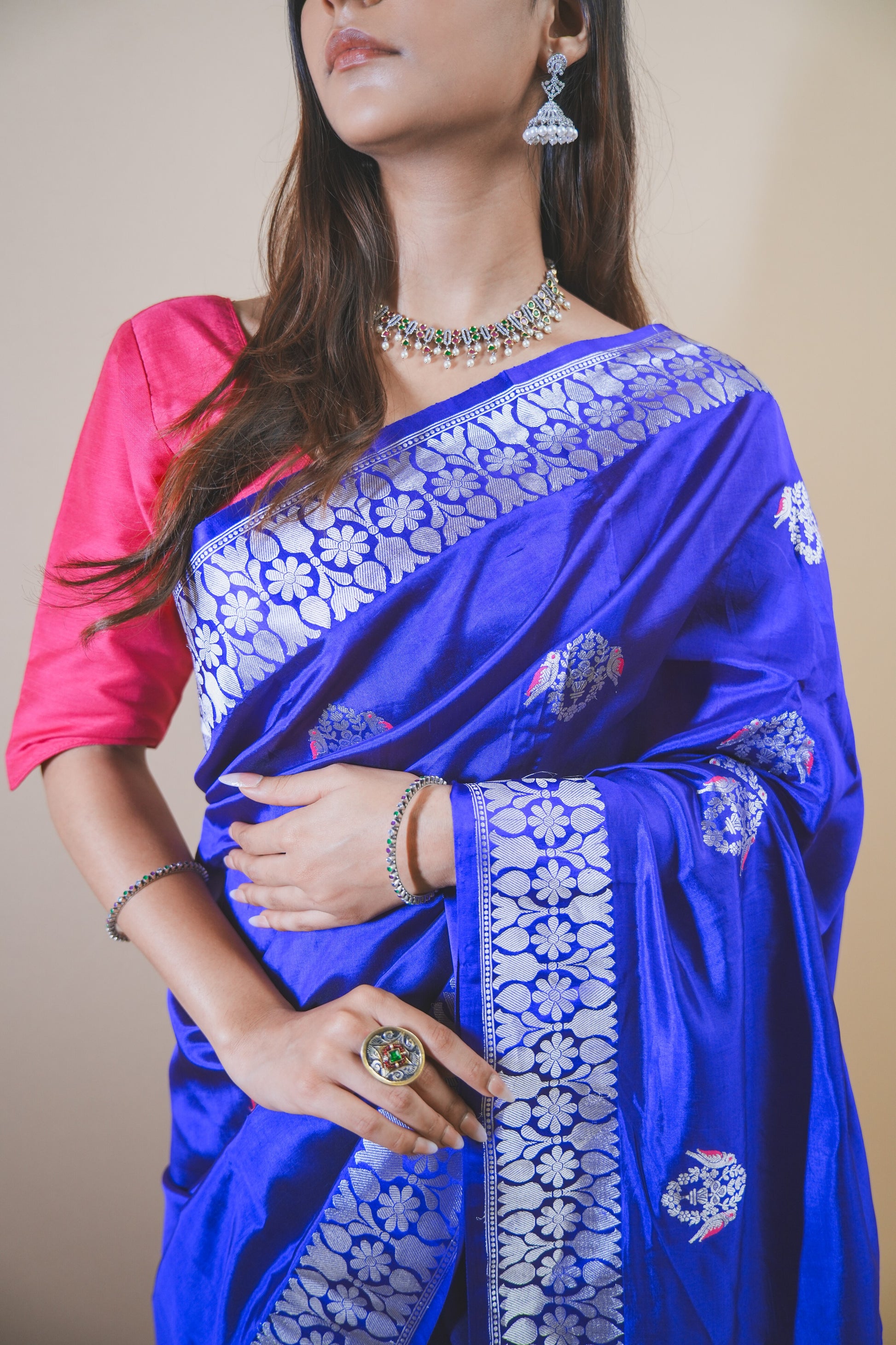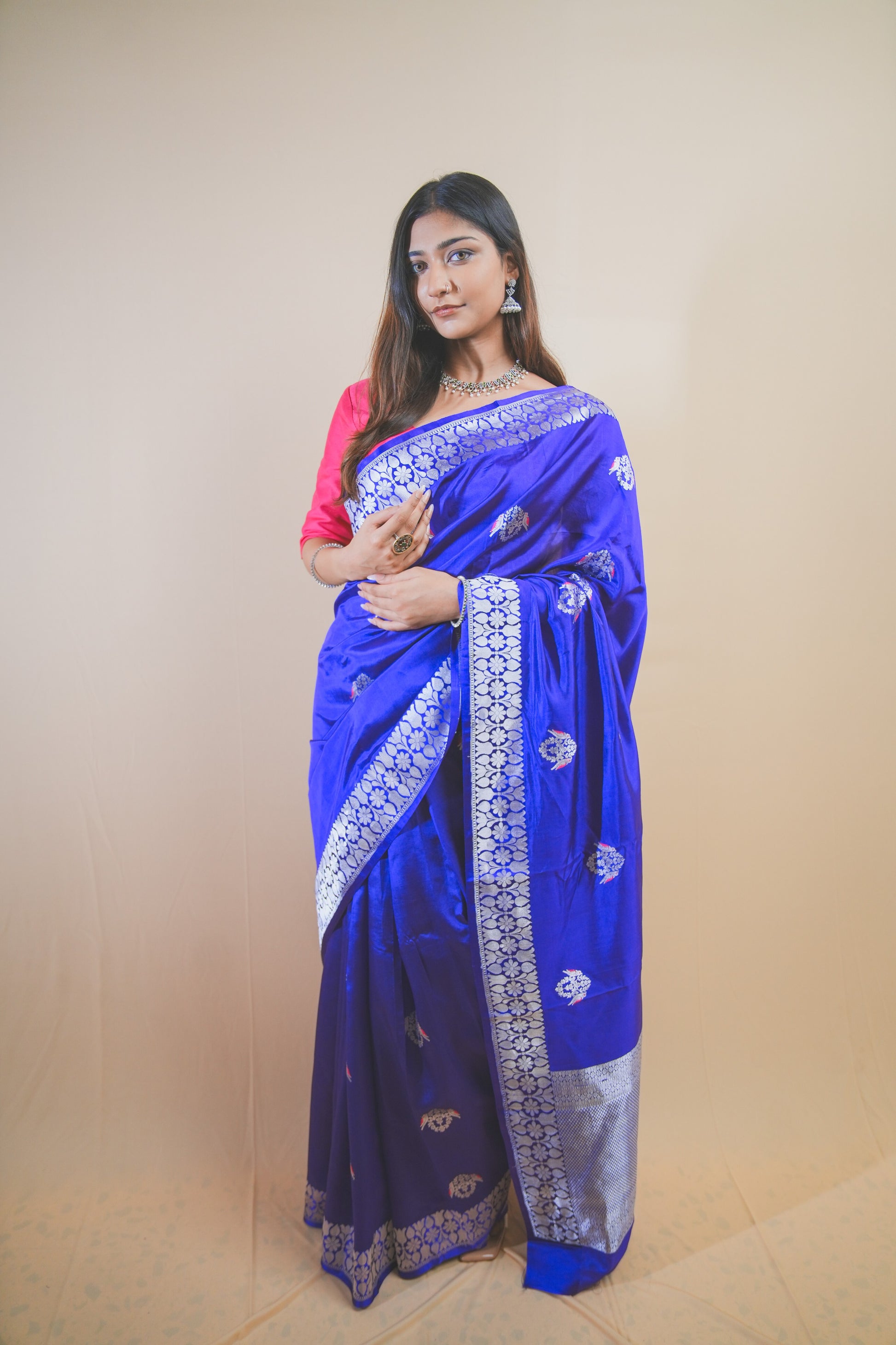 Grace meets tradition in this luxurious Mashru silk saree, adorned with silver zari weaving and intricate Meenakari butta detailing. The deep royal blue base is beautifully contrasted with a rich pink blouse, creating a vibrant and elegant look. Perfect for festive occasions and cultural celebrations, this saree blends classic craftsmanship with modern elegance.