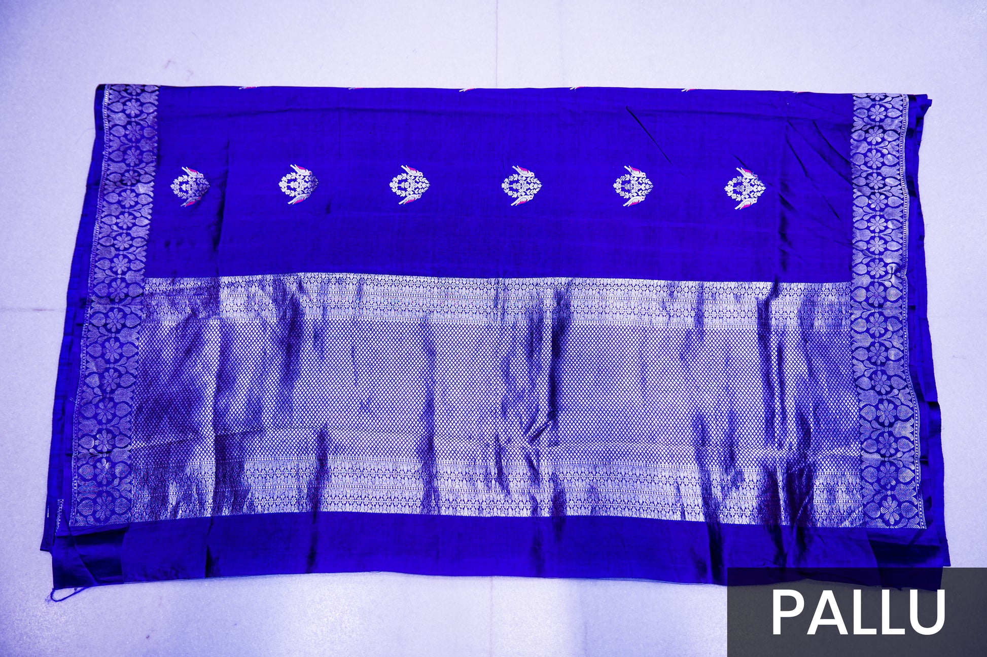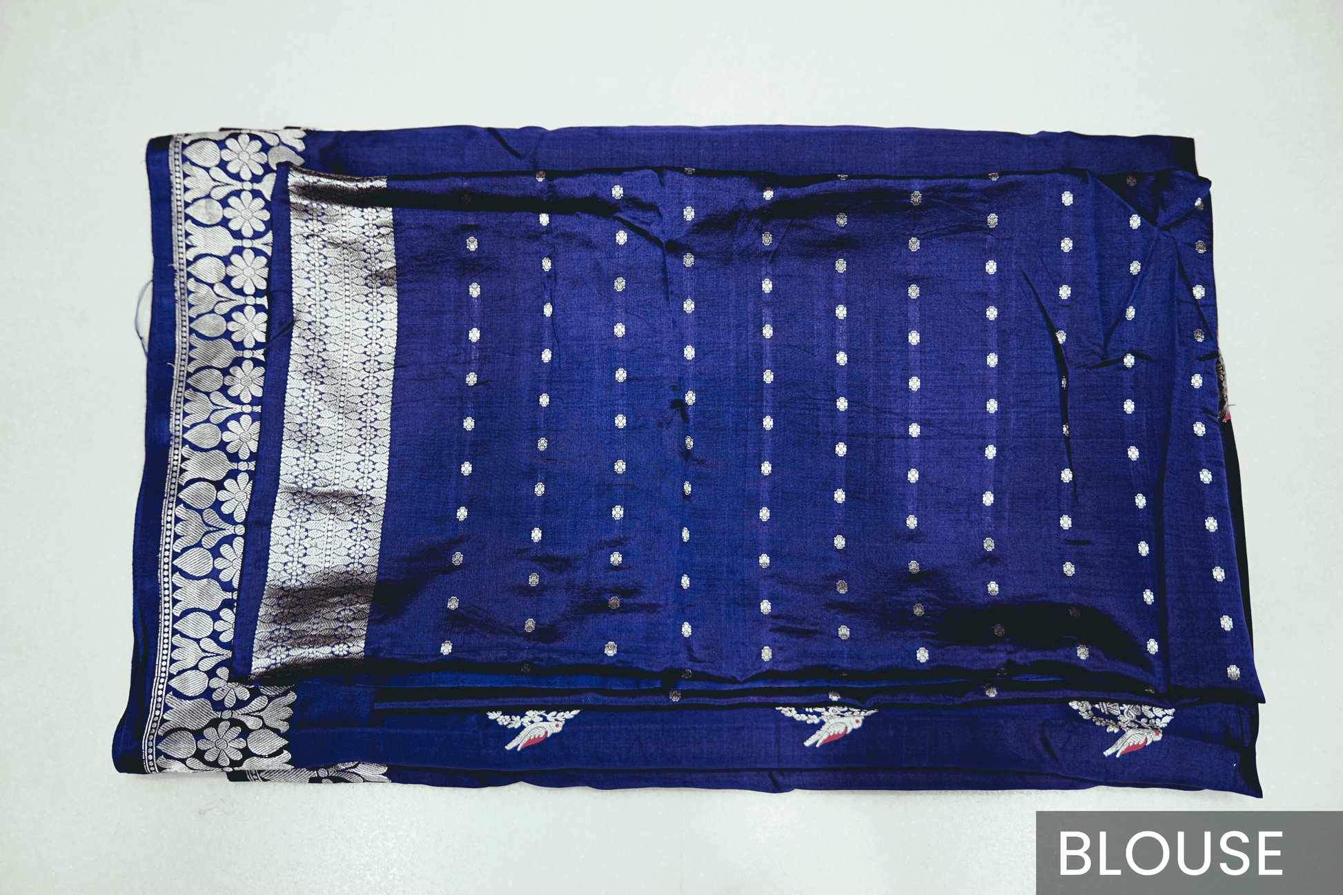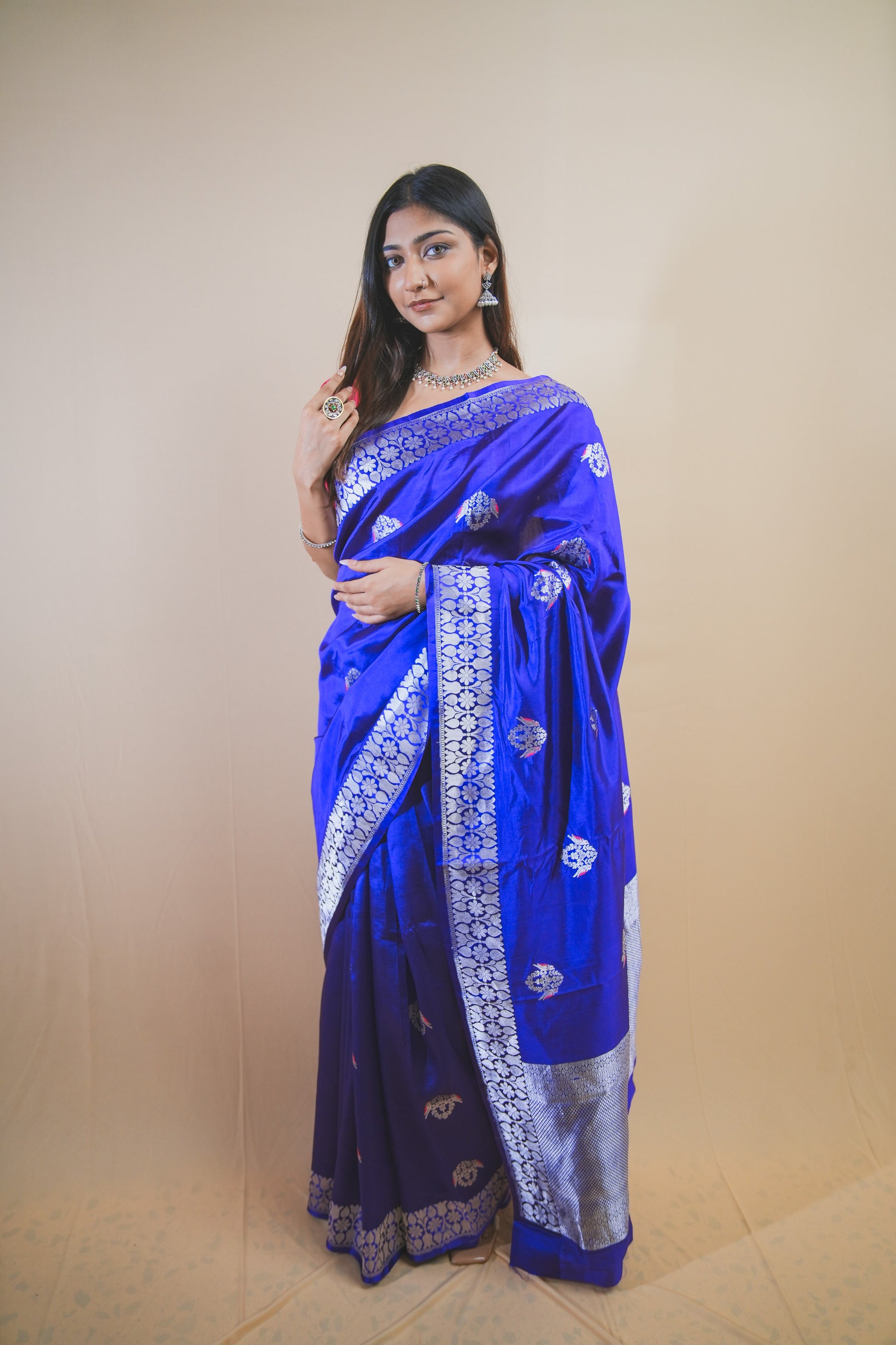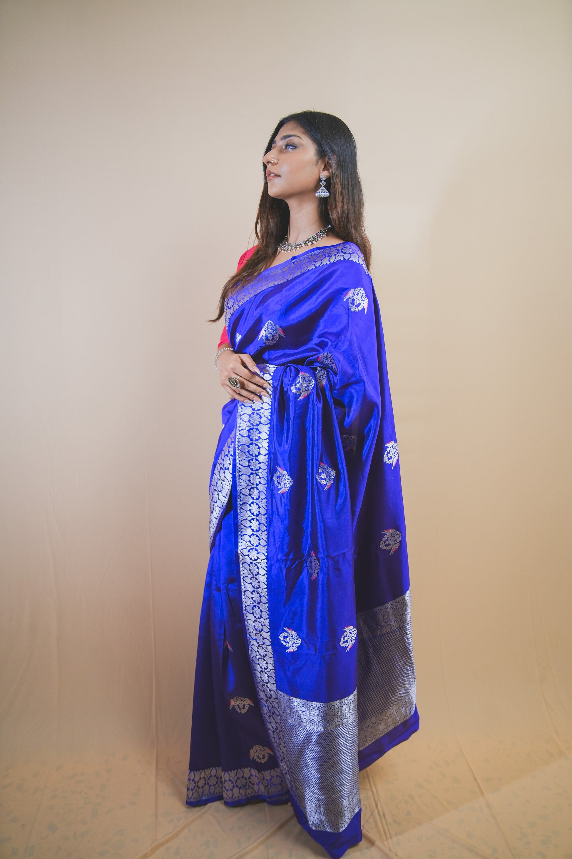 Grace meets tradition in this luxurious Mashru silk saree, adorned with silver zari weaving and intricate Meenakari butta detailing. The deep royal blue base is beautifully contrasted with a rich pink blouse, creating a vibrant and elegant look. Perfect for festive occasions and cultural celebrations, this saree blends classic craftsmanship with modern elegance.