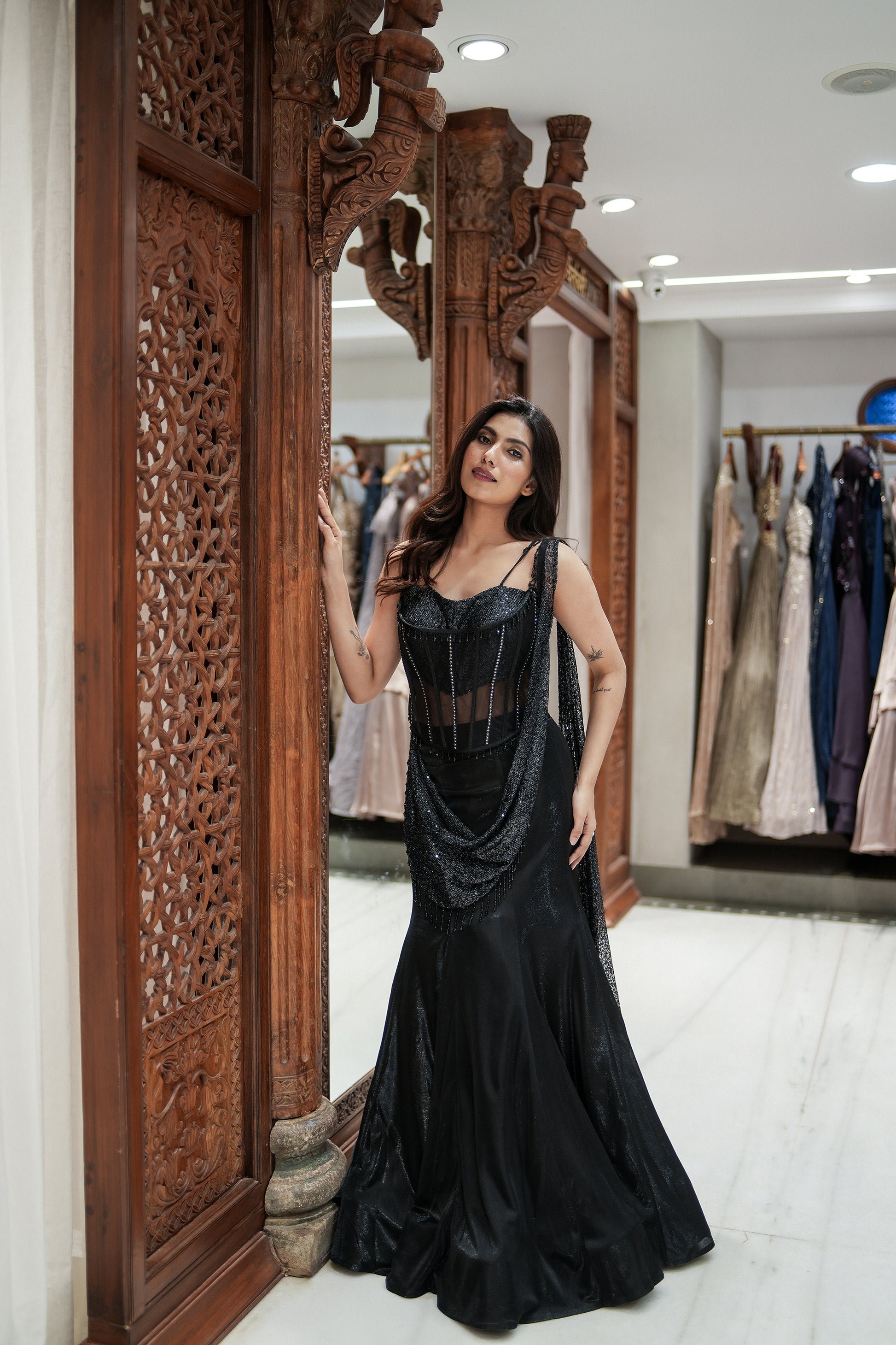 Elegant fish-cut silhouette paired with a fitted corset-style choli, detailed with subtle shimmer and layered drape styling