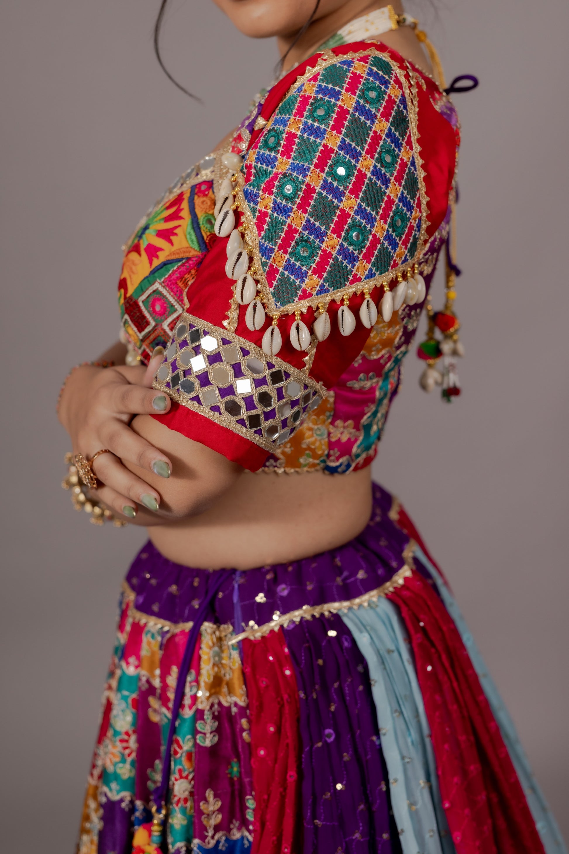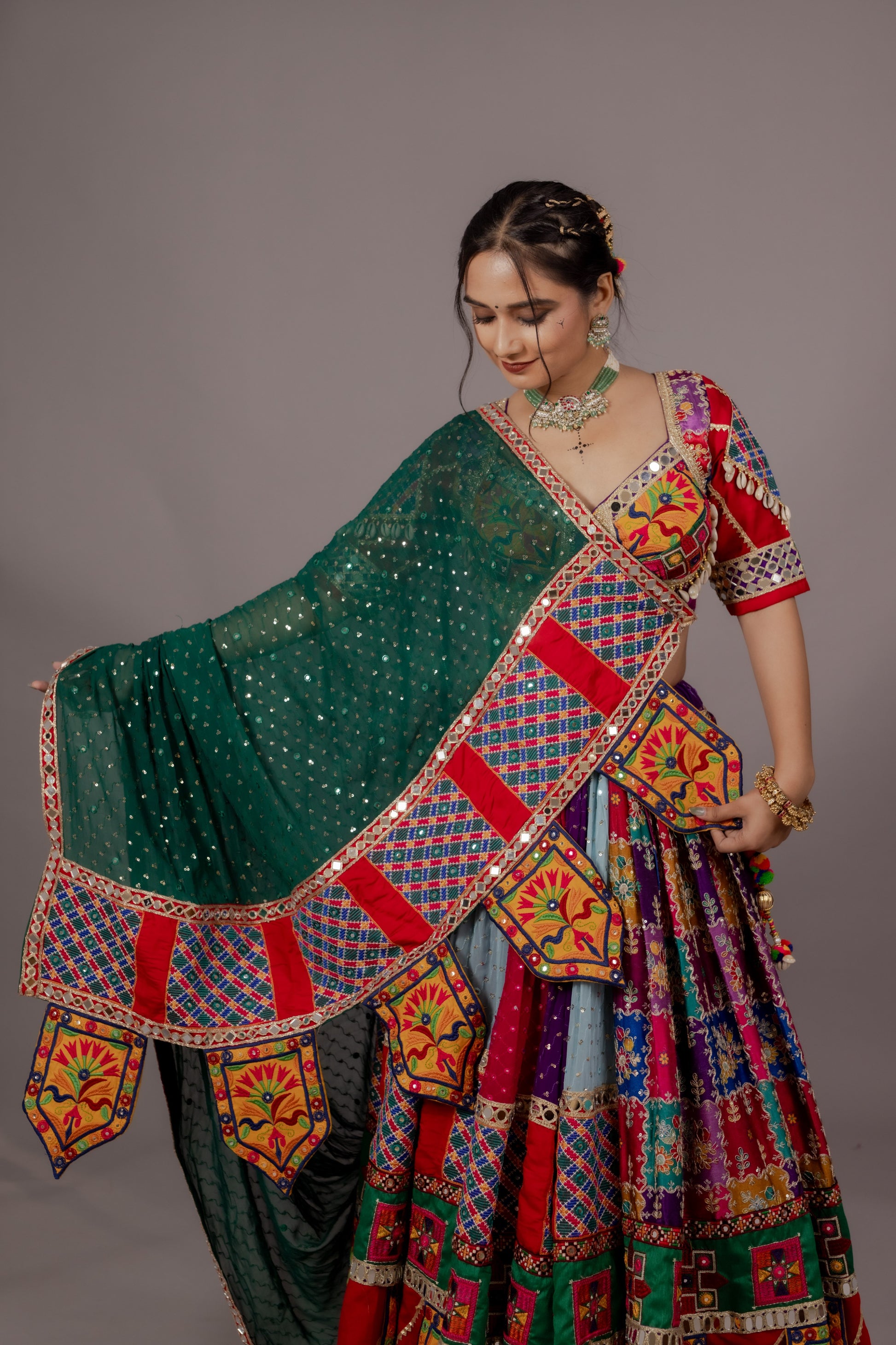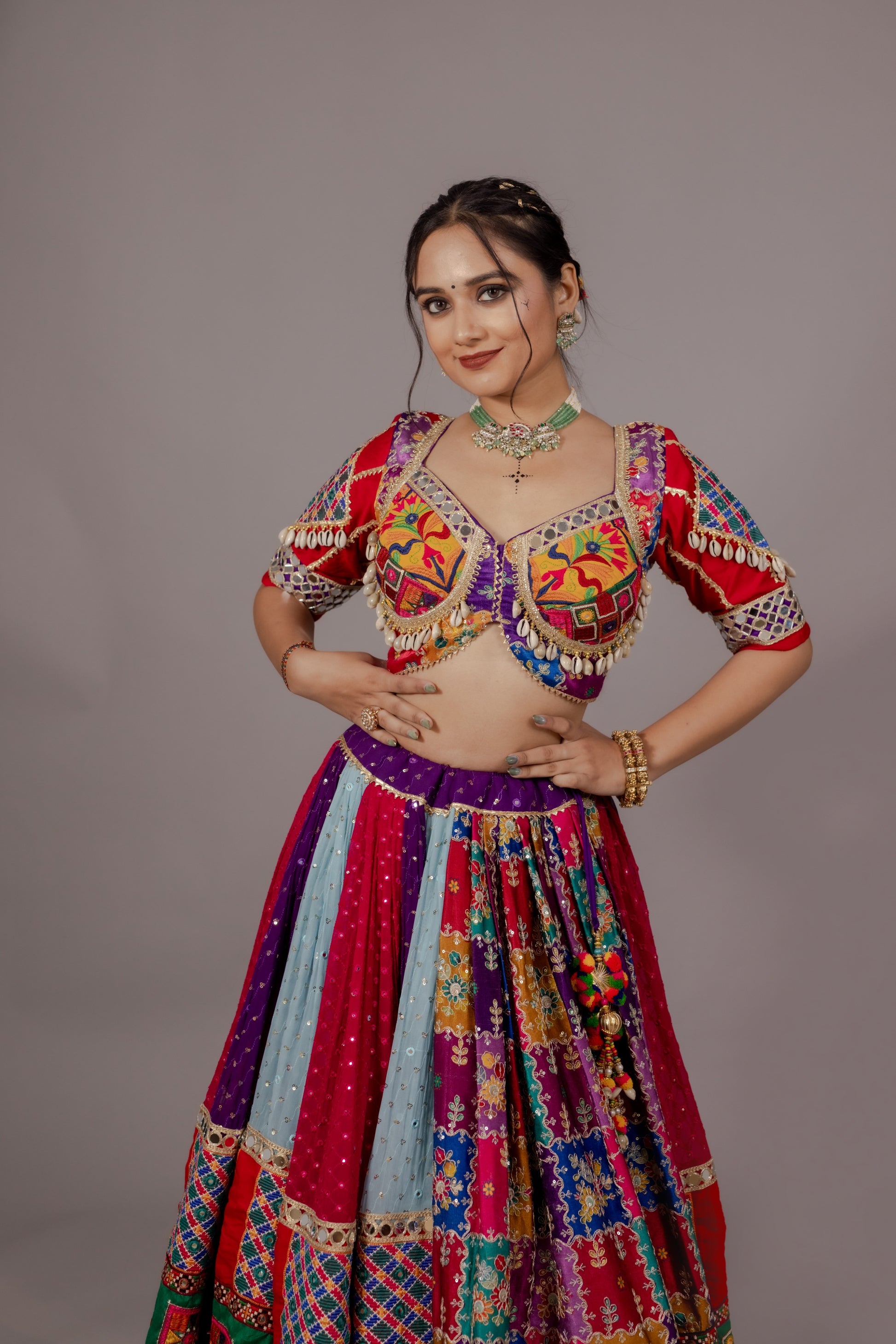 Celebrate heritage and color with this vibrant multicolor chiffon chaniya choli set. The lehenga showcases toran-style patch borders and multi-hued panels that sway with every move, perfect for Garba and festive nights.The blouse features intricate Kachhi embroidery, patchwork, delicate mirror detailing, and kodi shells, reflecting traditional craftsmanship.A soft net dupatta embellished with abhla (mirror) work and patch borders adds the final touch of festive elegance, making this ensemble ideal for Navratri, sangeet nights, or cultural events.