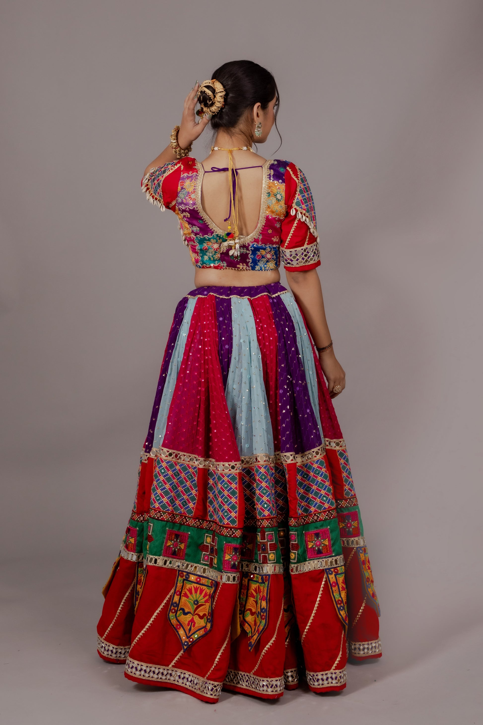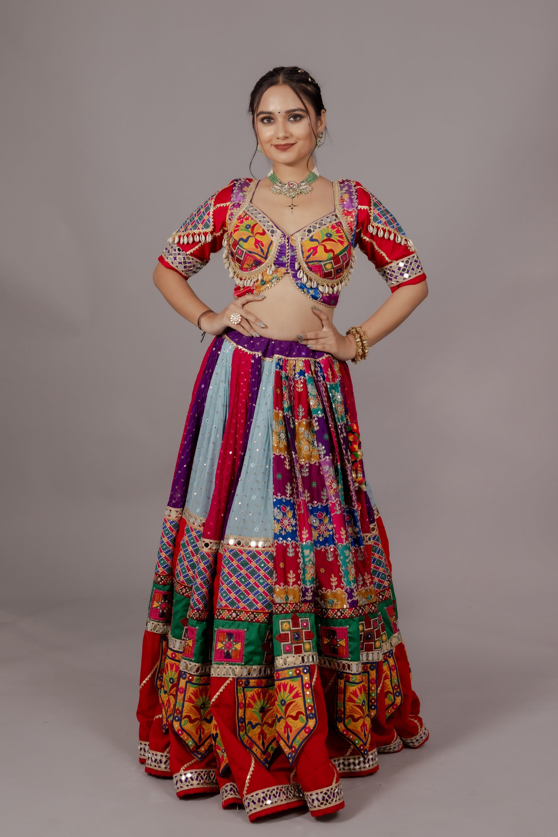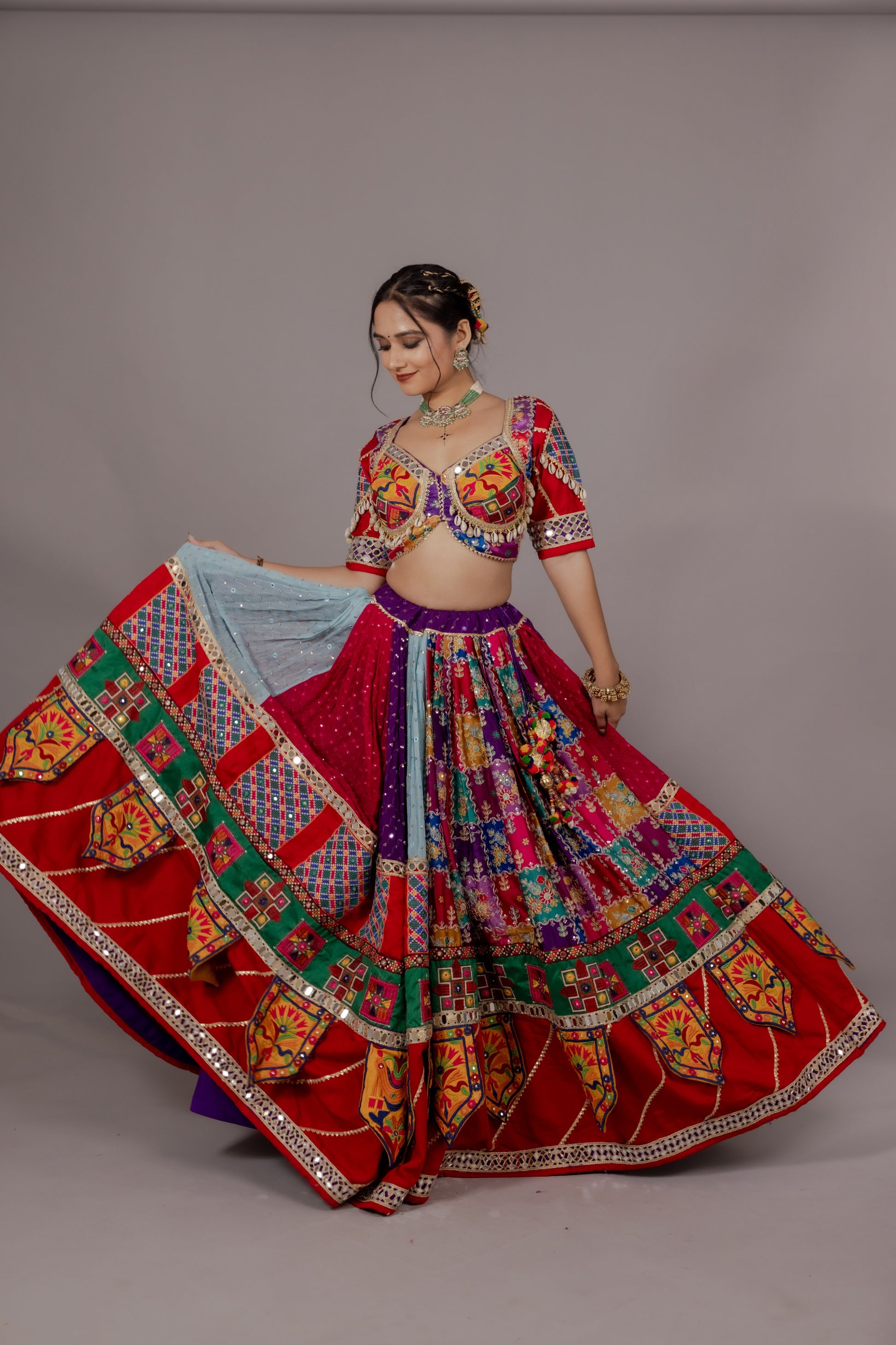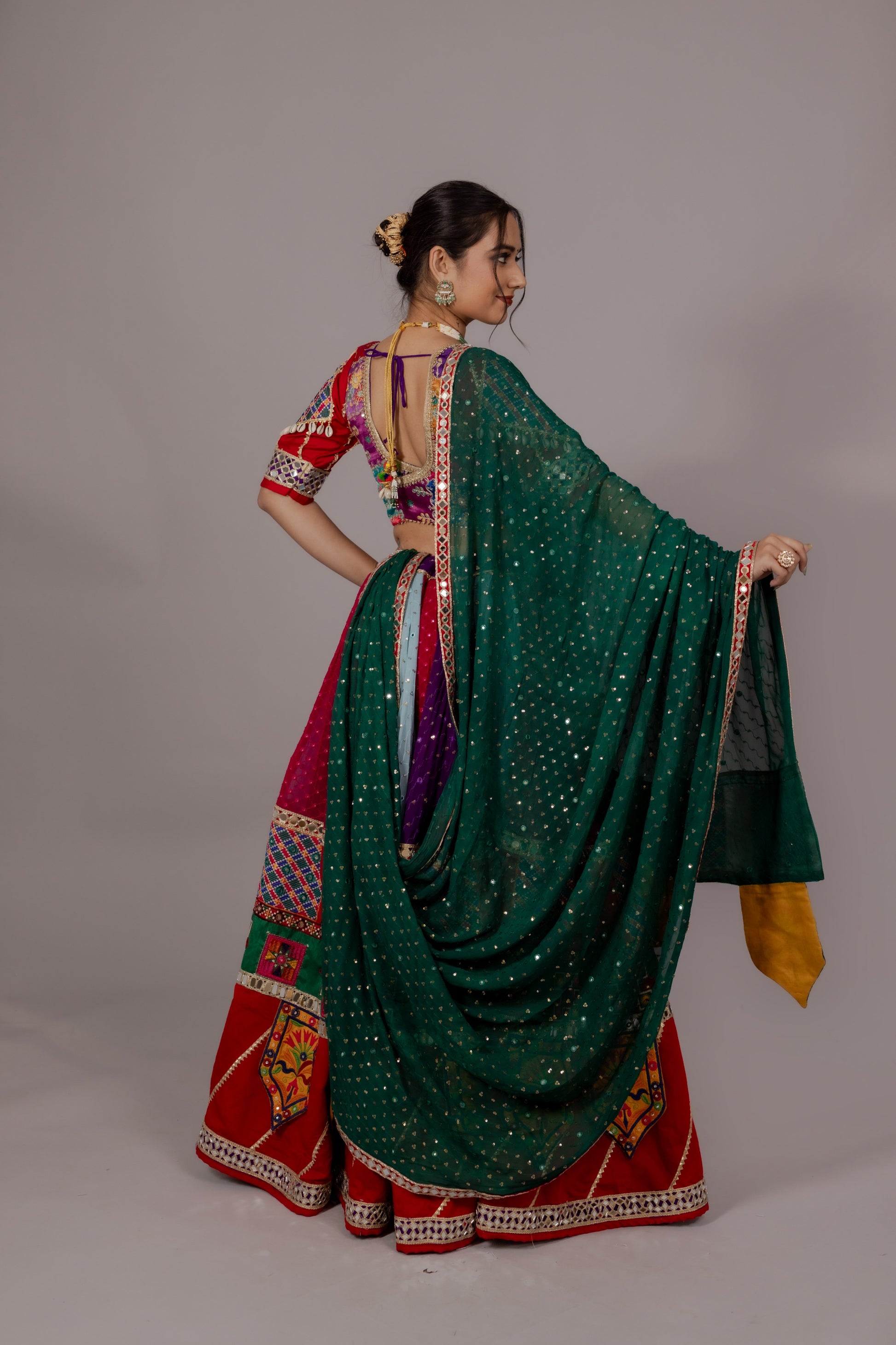 Celebrate heritage and color with this vibrant multicolor chiffon chaniya choli set. The lehenga showcases toran-style patch borders and multi-hued panels that sway with every move, perfect for Garba and festive nights.The blouse features intricate Kachhi embroidery, patchwork, delicate mirror detailing, and kodi shells, reflecting traditional craftsmanship.A soft net dupatta embellished with abhla (mirror) work and patch borders adds the final touch of festive elegance, making this ensemble ideal for Navratri, sangeet nights, or cultural events.