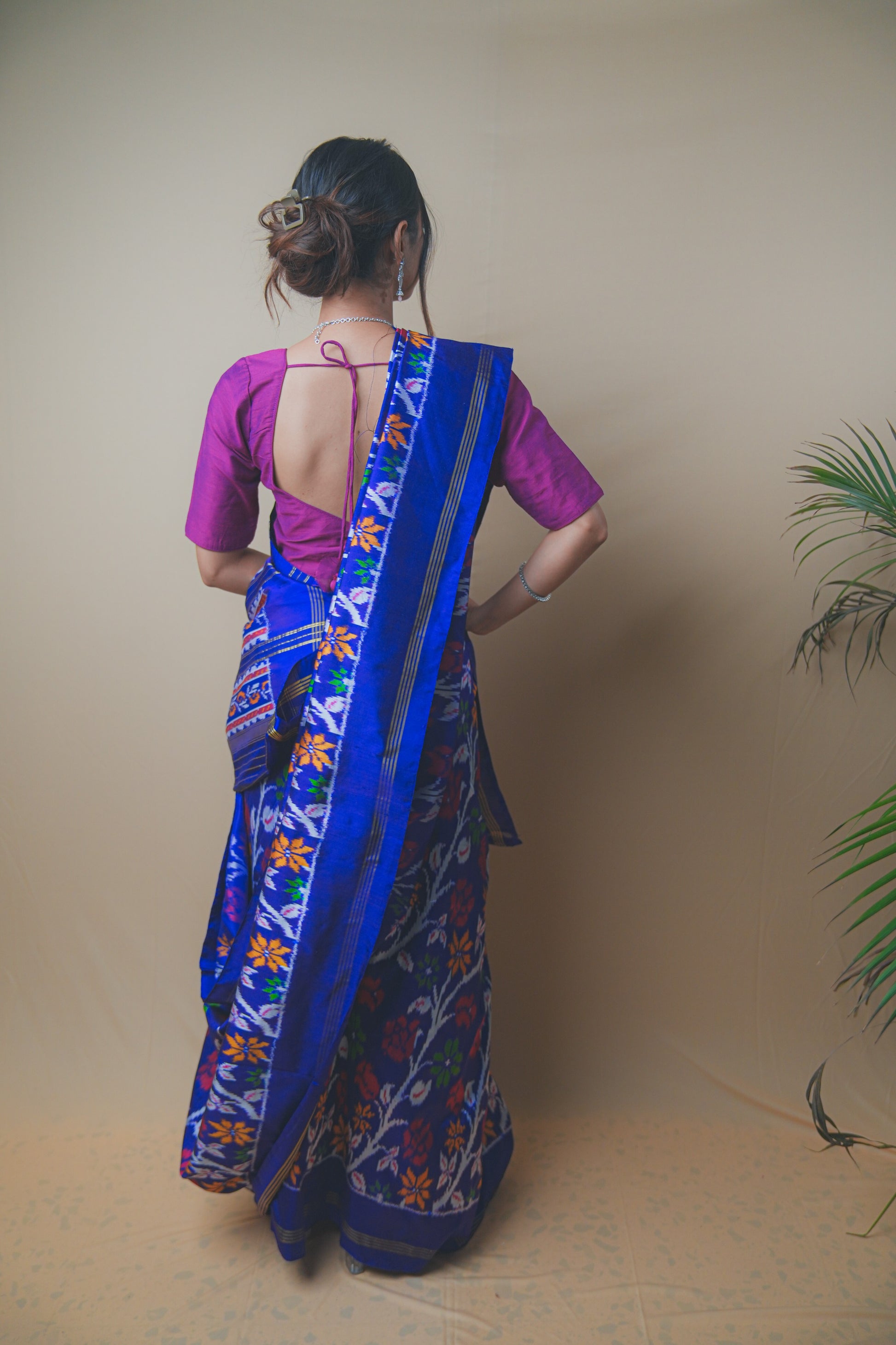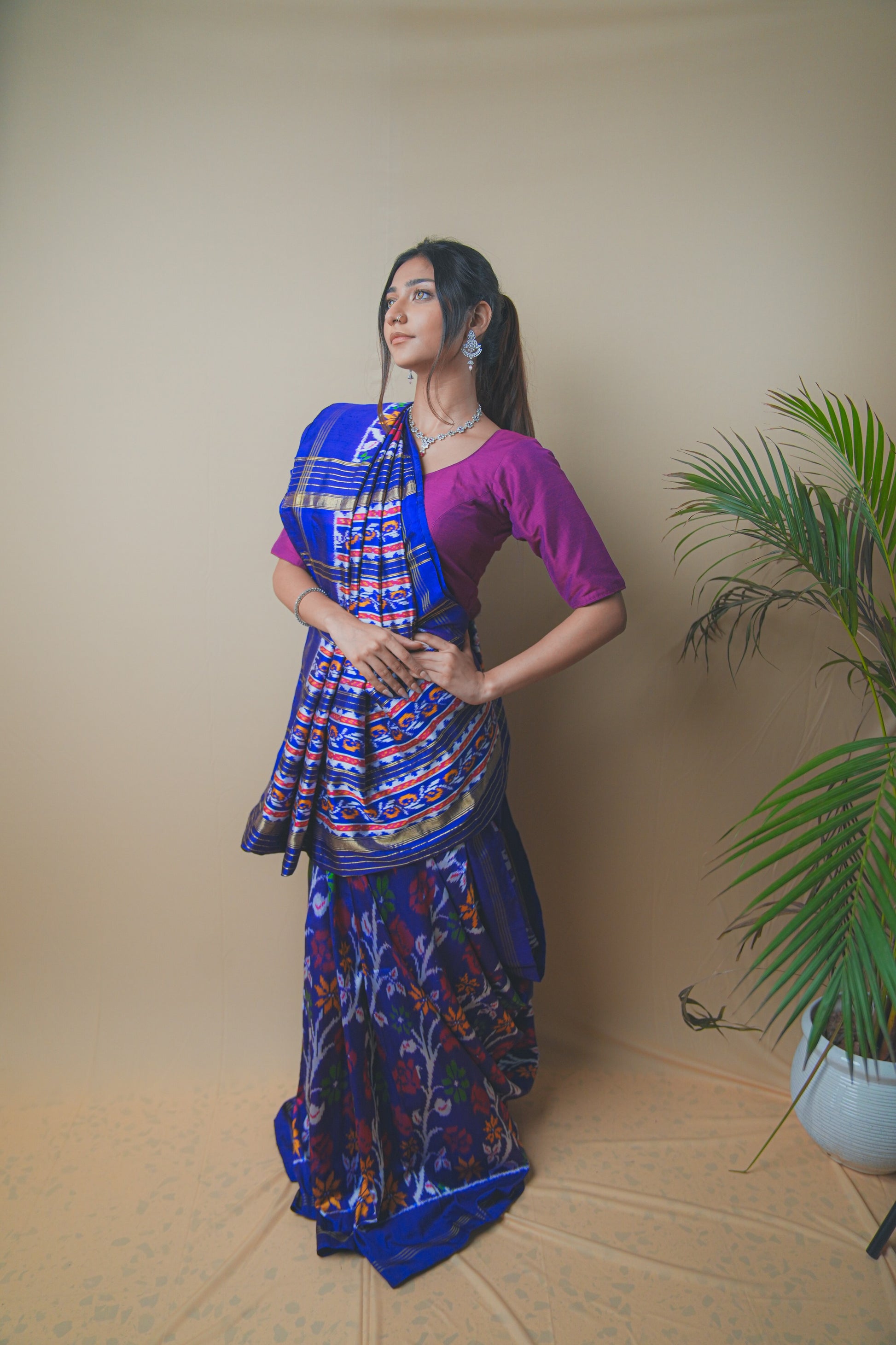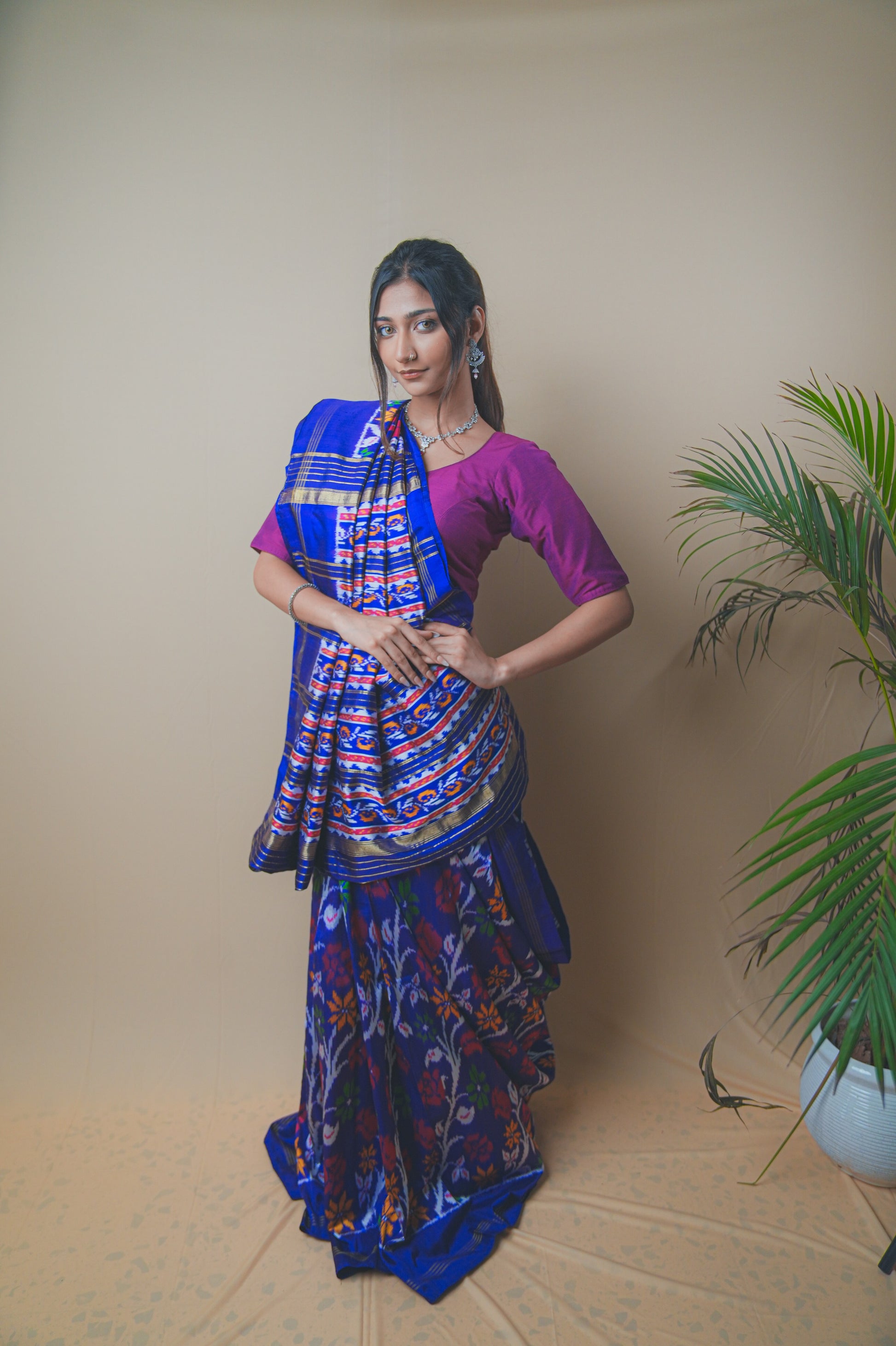 Elevate your ethnic wardrobe with this stunning Hyderabadi Patola Ikat saree crafted in luxurious silk. Featuring vibrant multicolor ikat patterns intricately woven into a rich royal blue base, this saree celebrates timeless craftsmanship. The pallu showcases bold geometric and floral motifs, while the subtle golden zari borders add a touch of elegance. Paired with a contrasting magenta blouse, it’s the perfect blend of traditional artistry and modern grace ideal for festive occasions, weddings, or cultural celebrations.