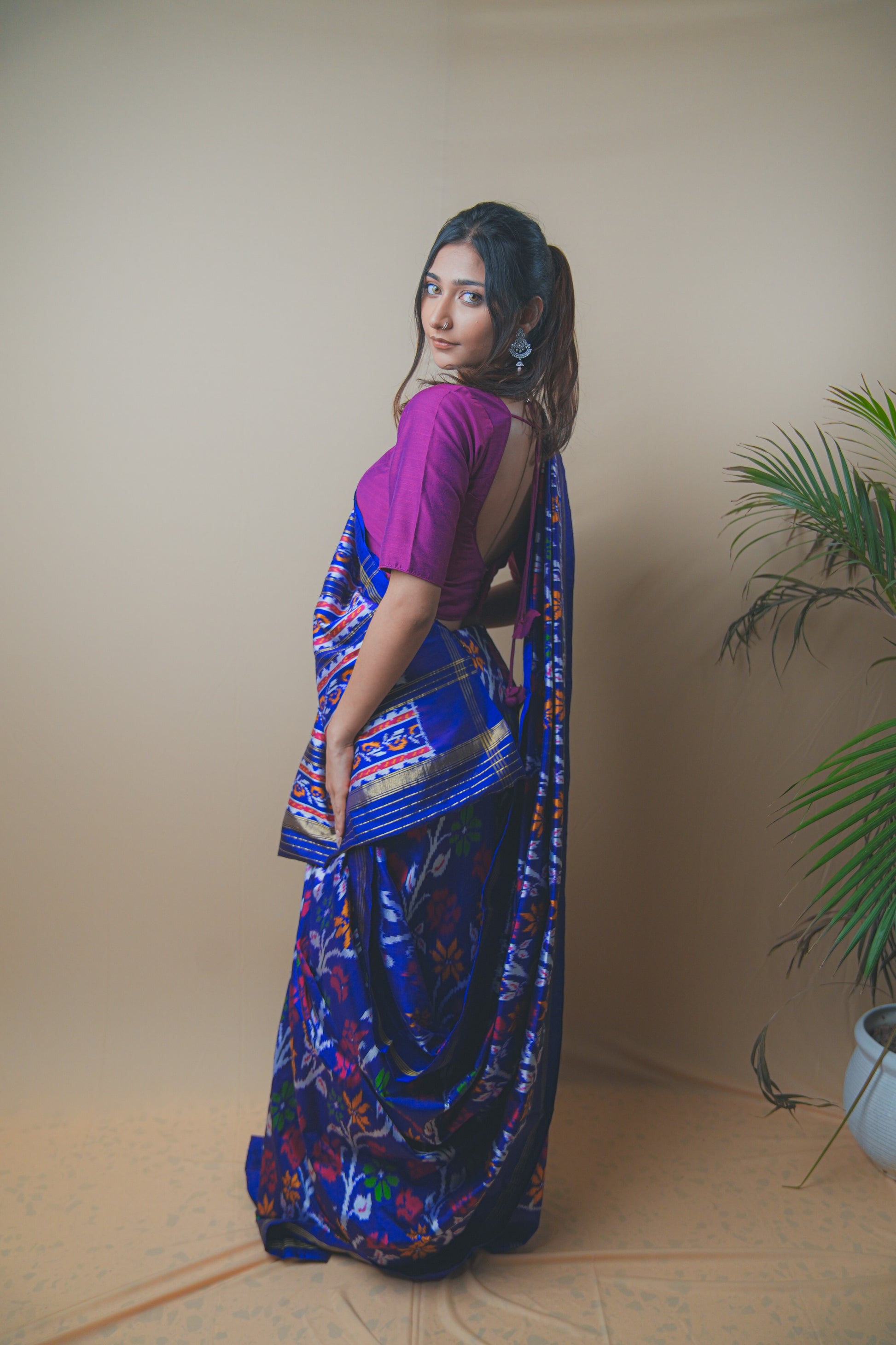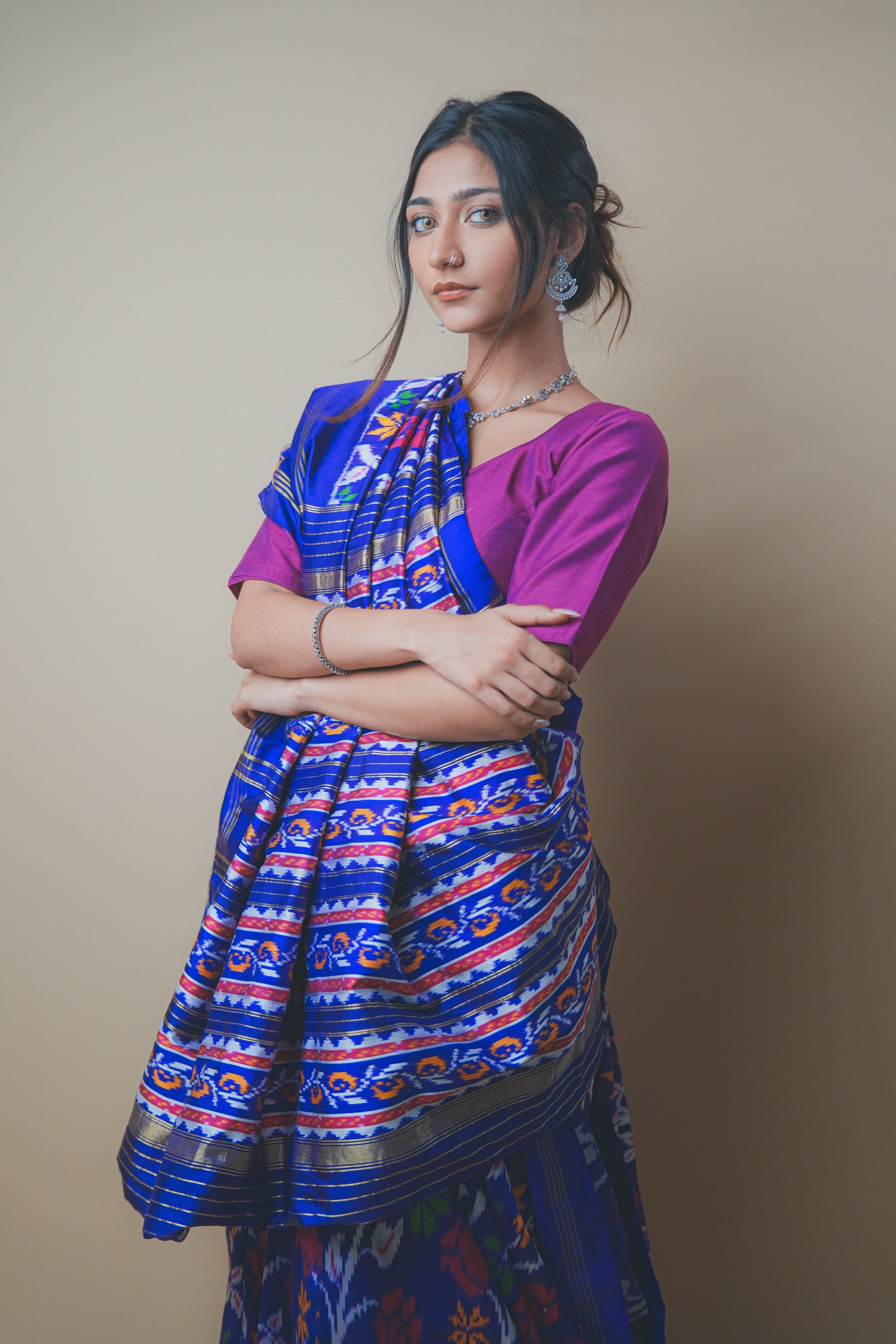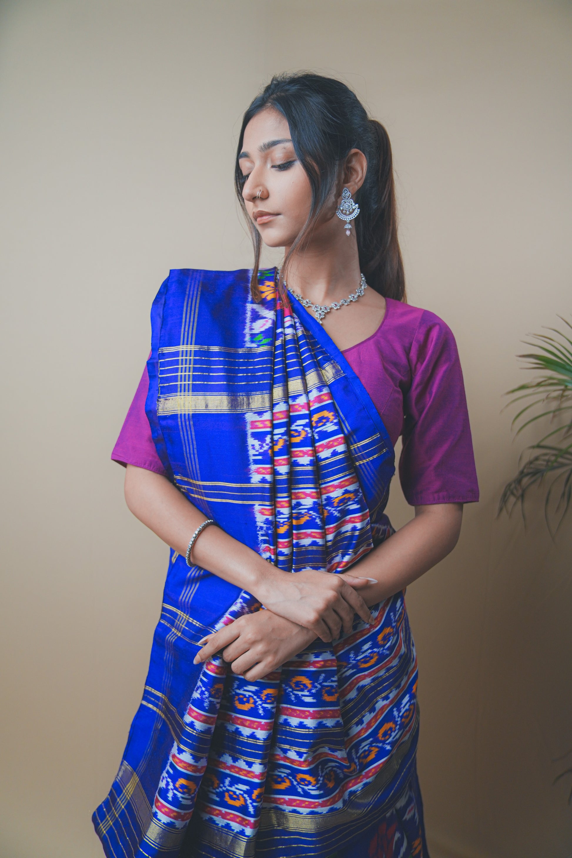 Elevate your ethnic wardrobe with this stunning Hyderabadi Patola Ikat saree crafted in luxurious silk. Featuring vibrant multicolor ikat patterns intricately woven into a rich royal blue base, this saree celebrates timeless craftsmanship. The pallu showcases bold geometric and floral motifs, while the subtle golden zari borders add a touch of elegance. Paired with a contrasting magenta blouse, it’s the perfect blend of traditional artistry and modern grace ideal for festive occasions, weddings, or cultural celebrations.