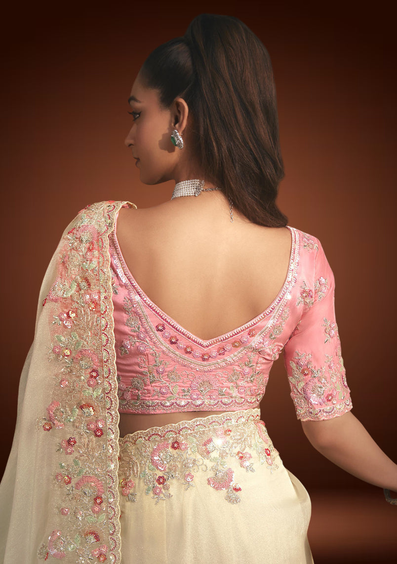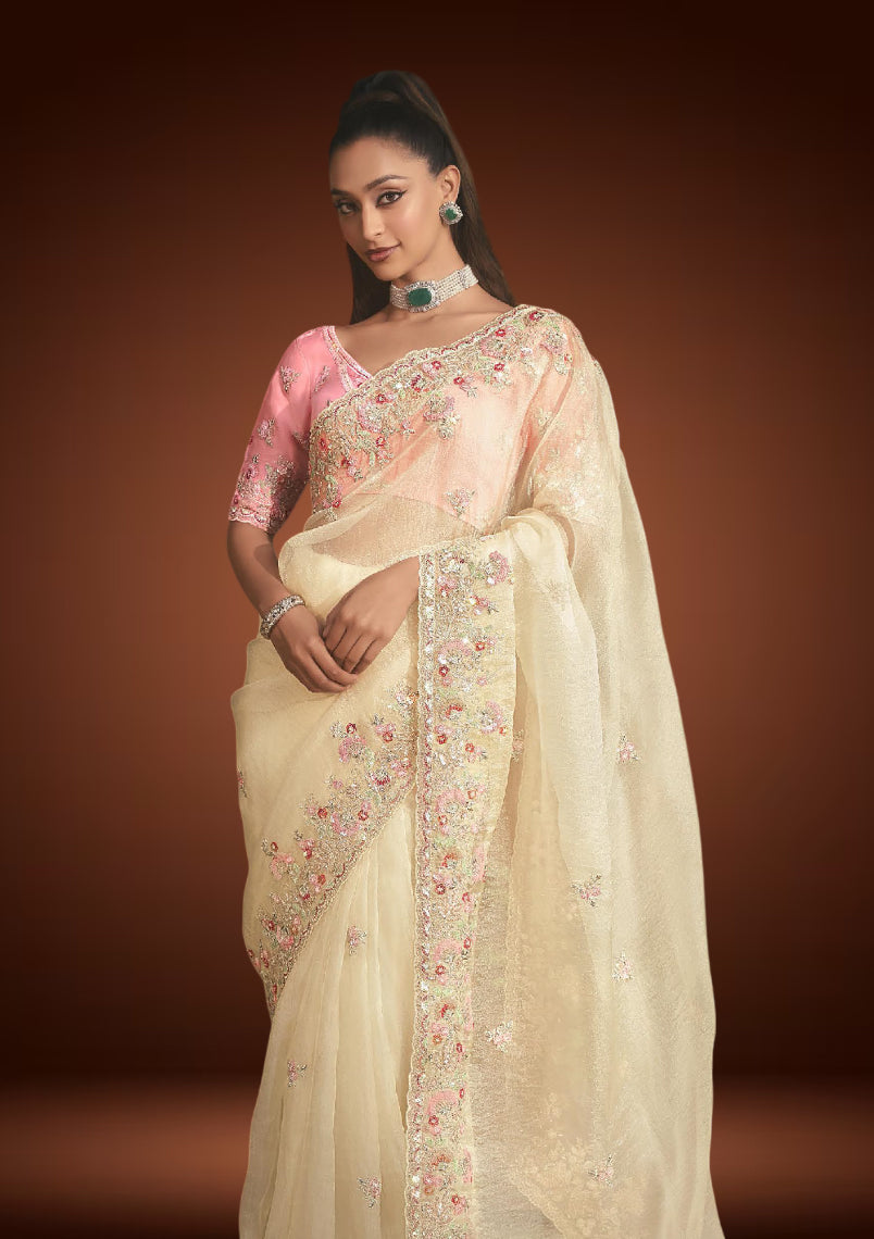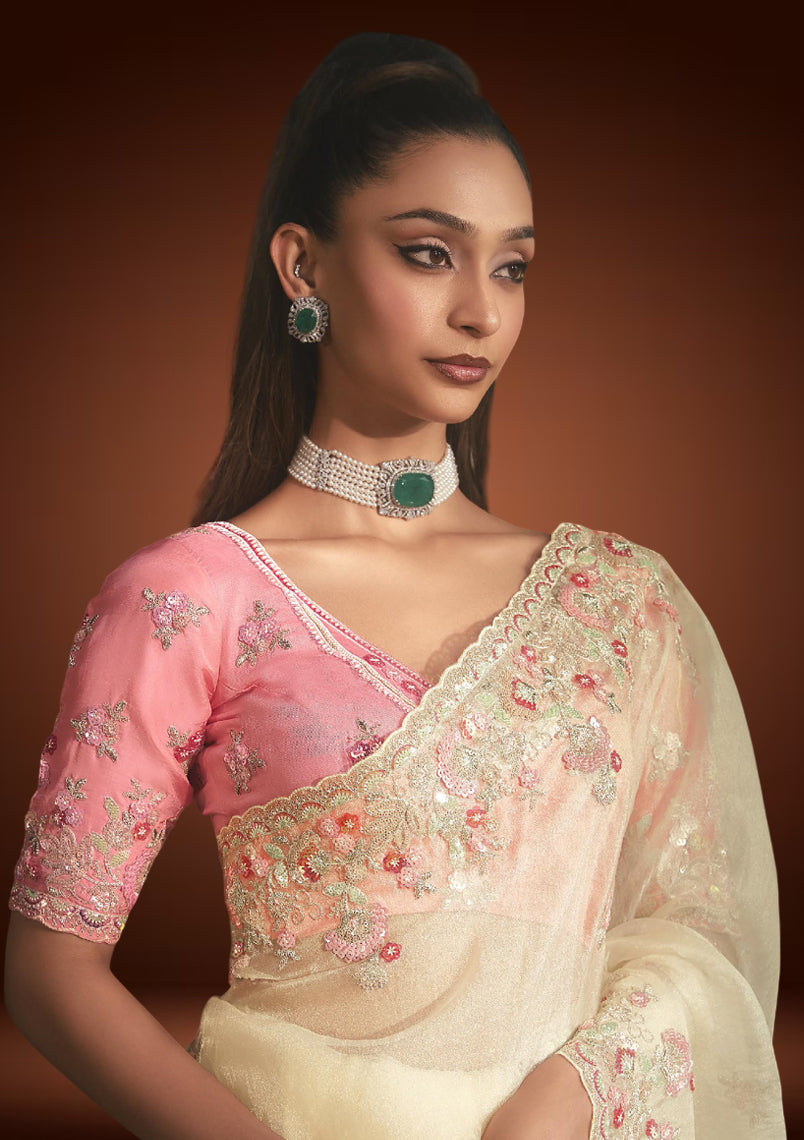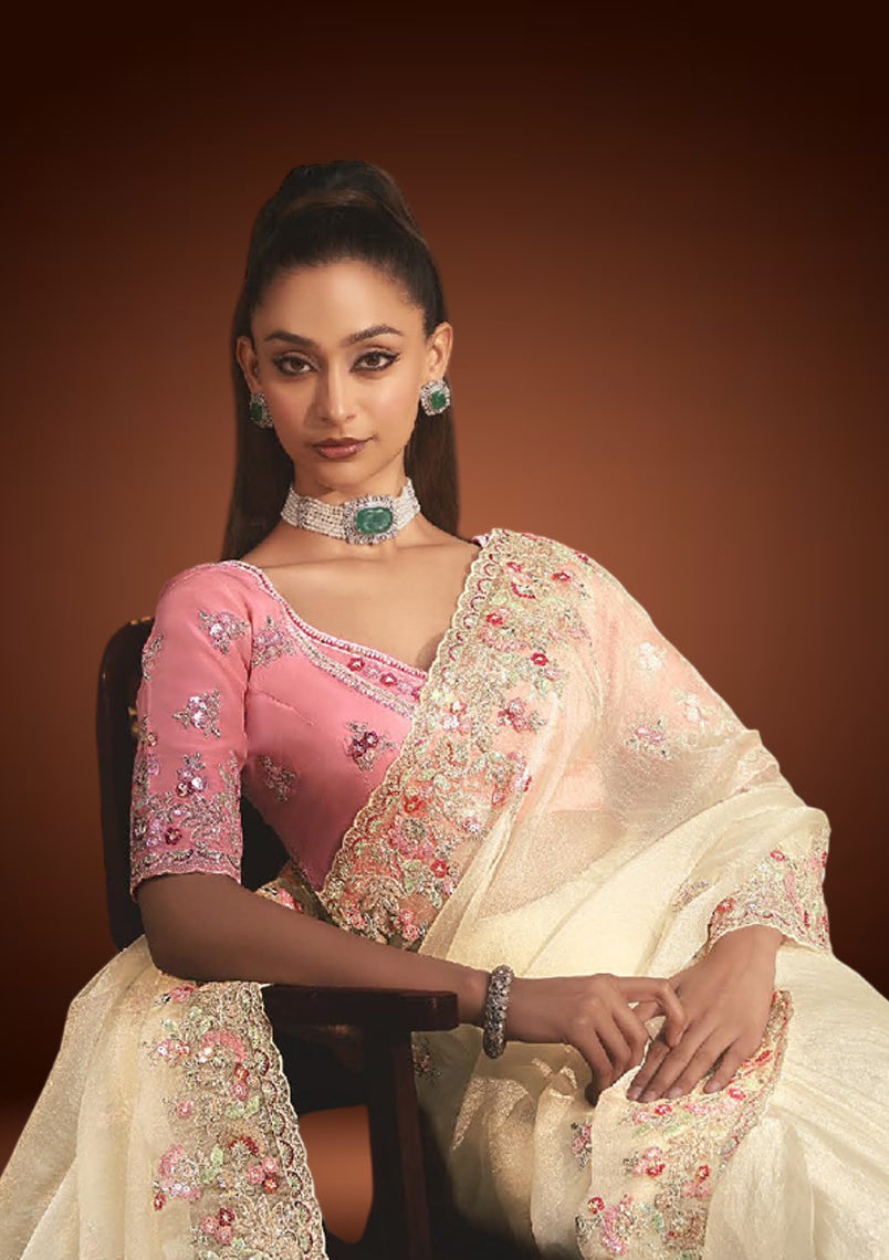 An elegant off-white tissue organza saree enhanced with delicate resham embroidery and shimmering sequin work. Paired with a pastel pink blouse, it strikes the perfect balance of subtle charm and festive sophistication ideal for weddings, receptions, and celebratory occasions.