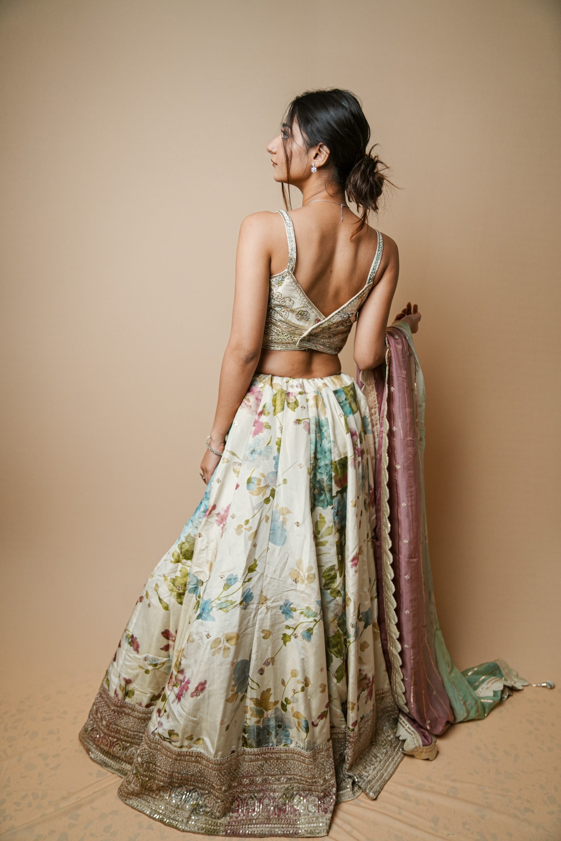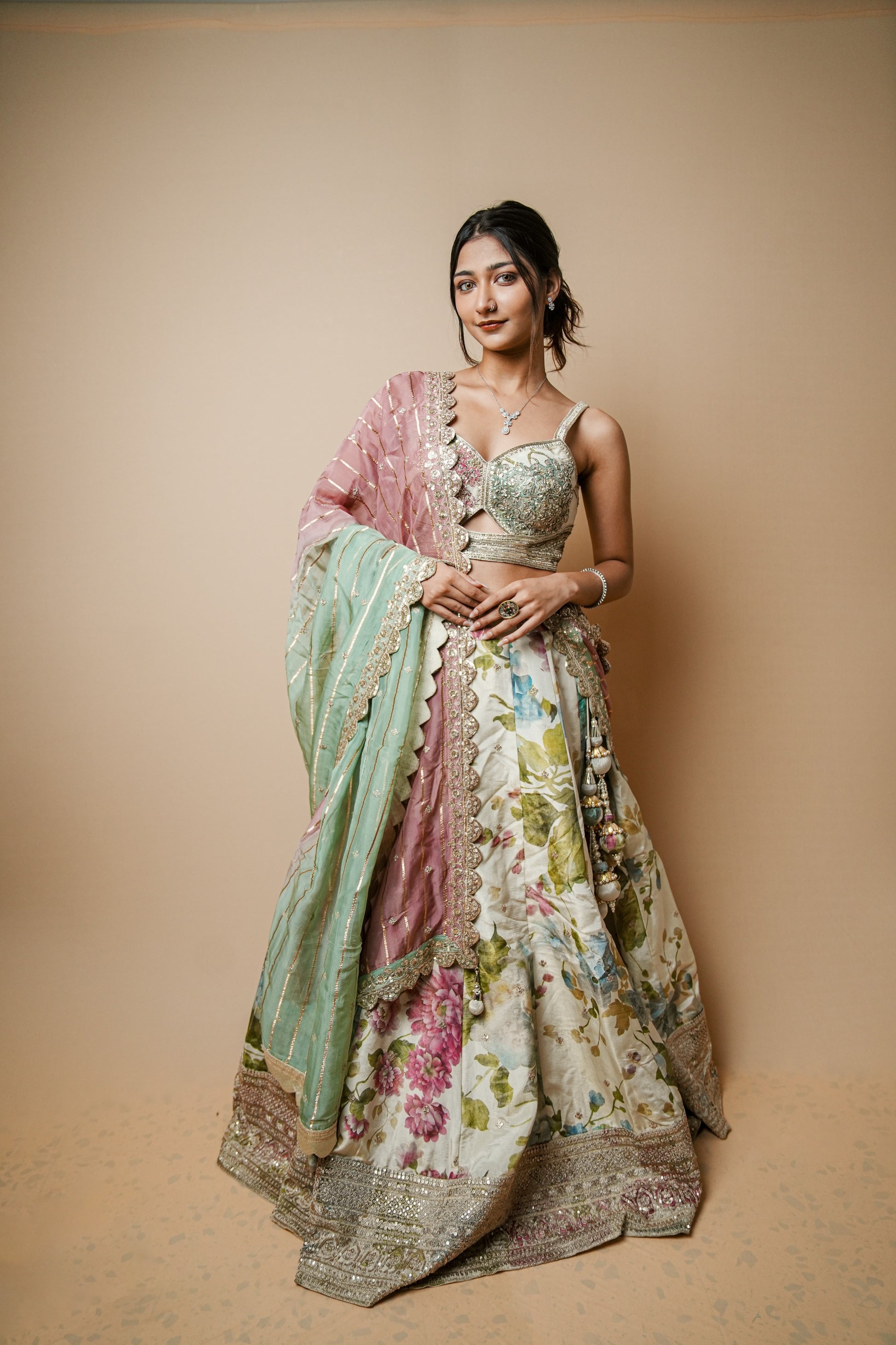 Pastel Floral Tissue Lehenga Set with Hand-Embellished Spaghetti Choli and Organza Dupatta