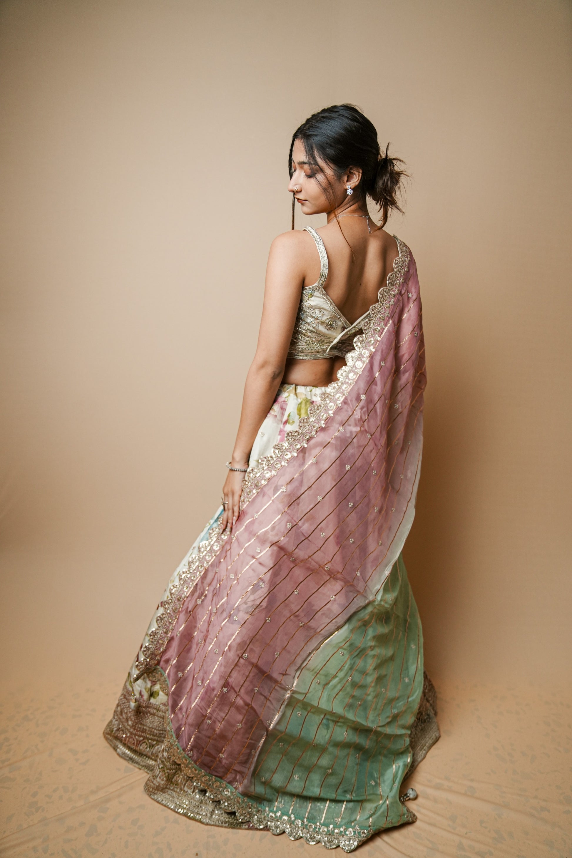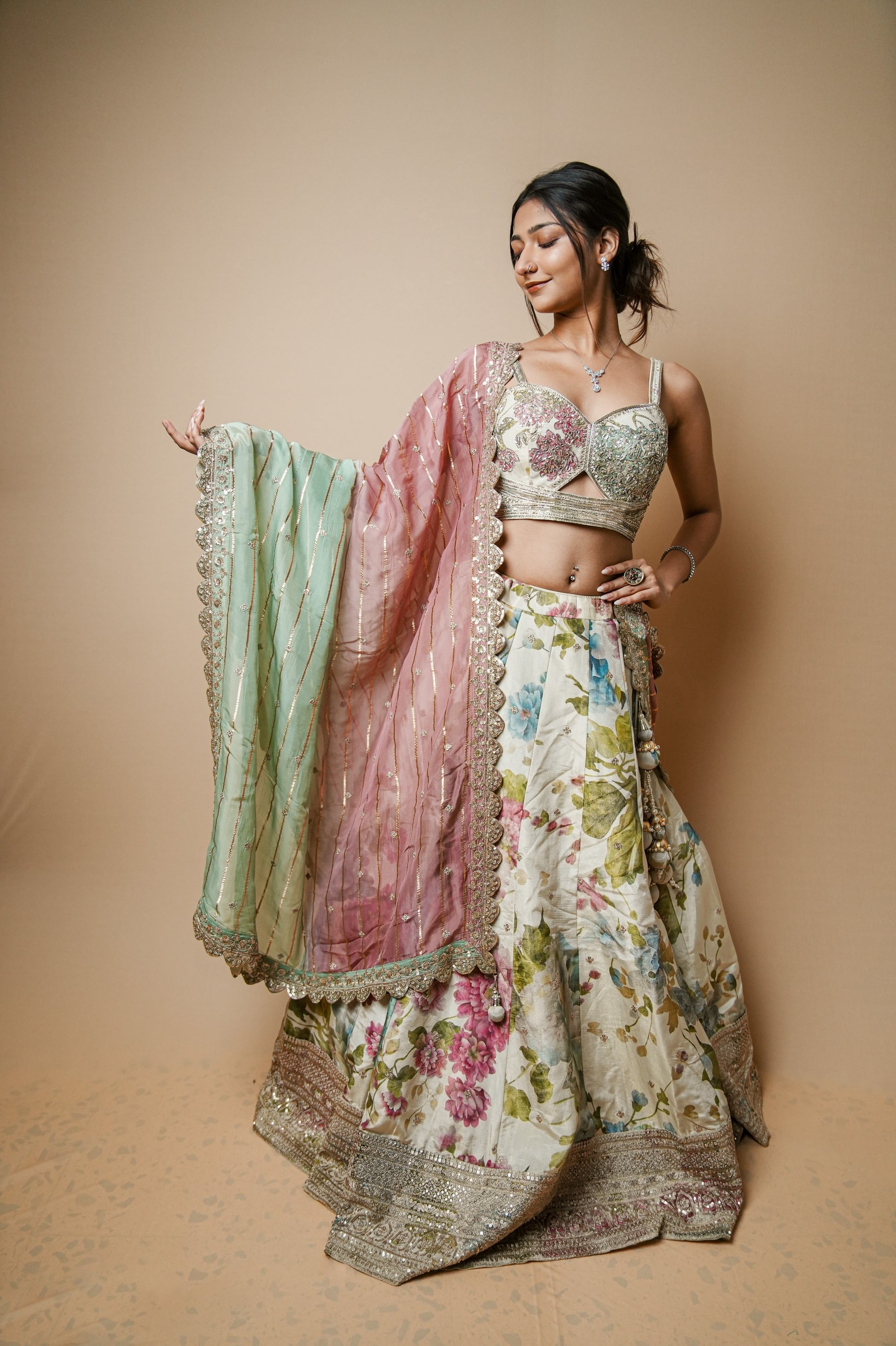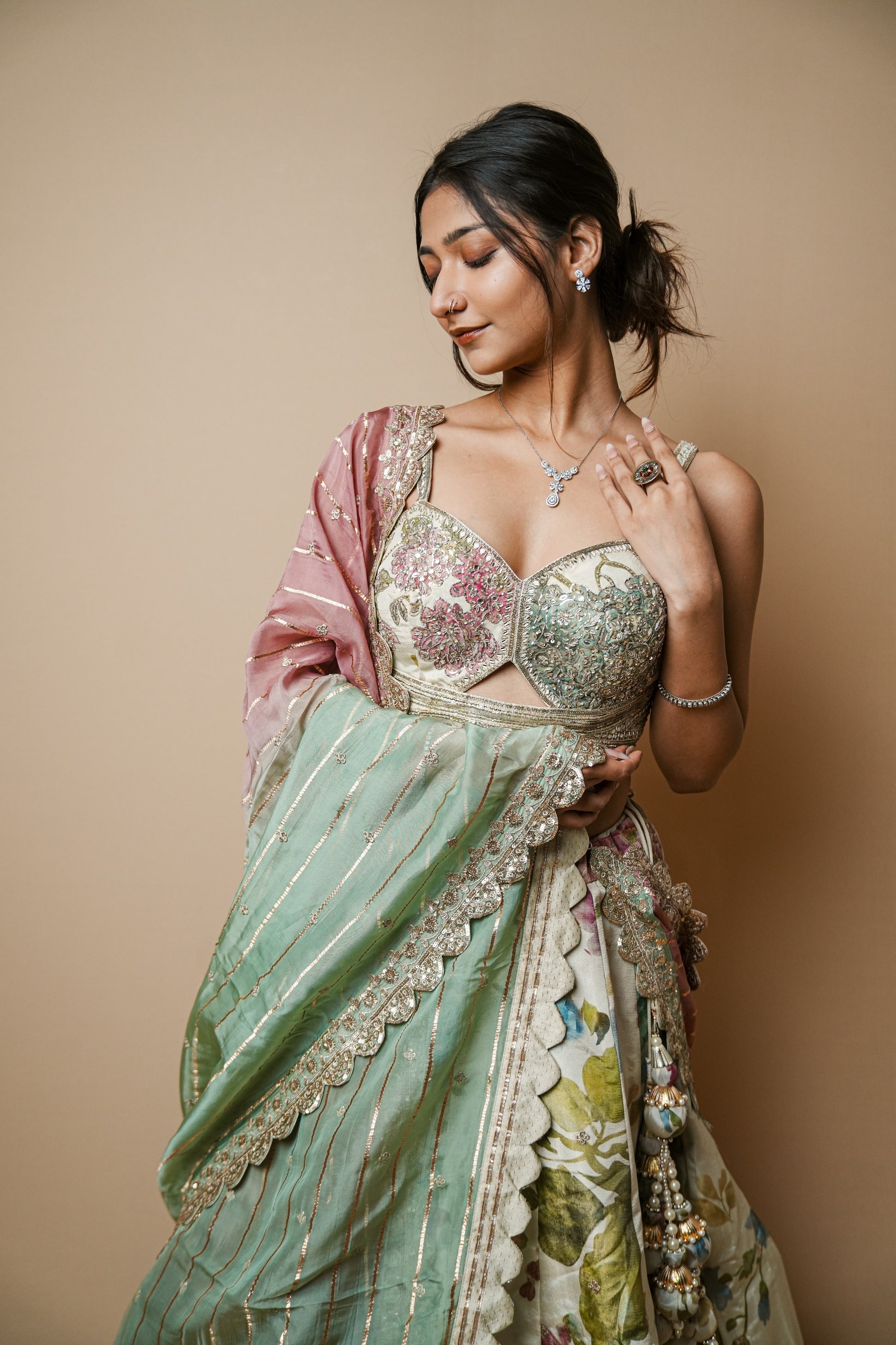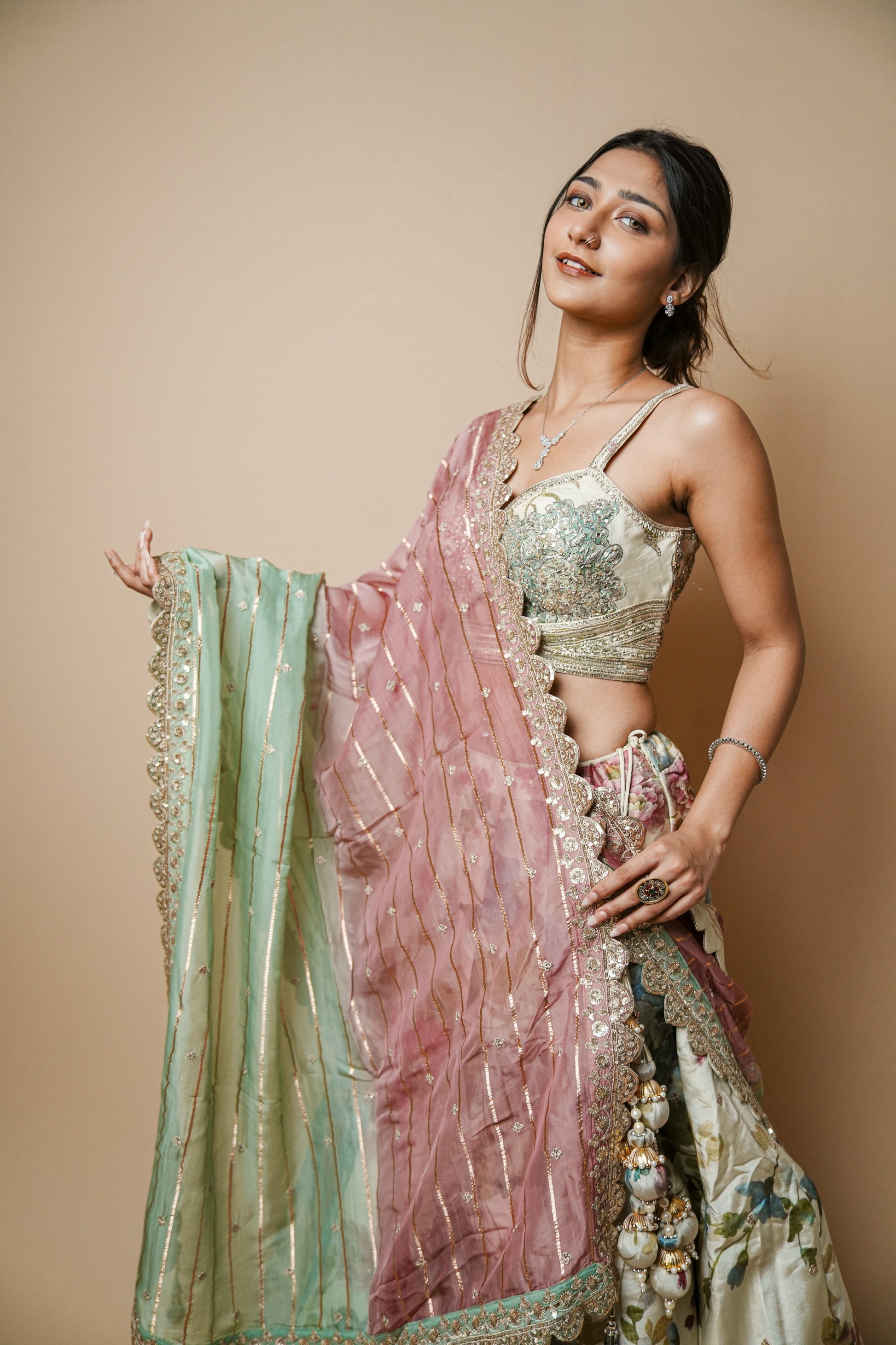 A dreamy blend of elegance and romance, this tissue print lehenga features a vibrant floral base brought to life with soft shimmer and detailed zardozi embroidery. The delicate spaghetti strap choli is hand-embellished to perfection, adding sparkle to every movement. Paired with a dual-toned organza dupatta featuring scalloped borders and golden threadwork, this ensemble is ideal for pastel-themed weddings, receptions, or engagement looks.