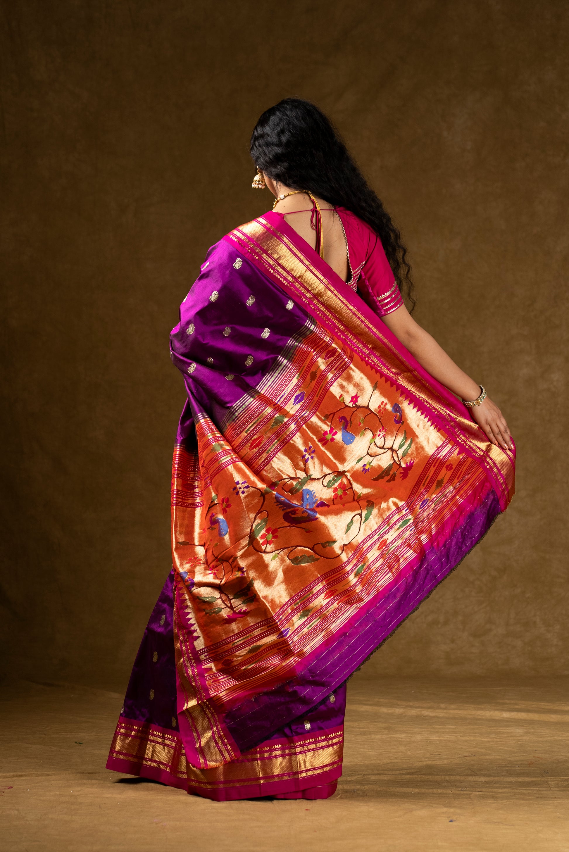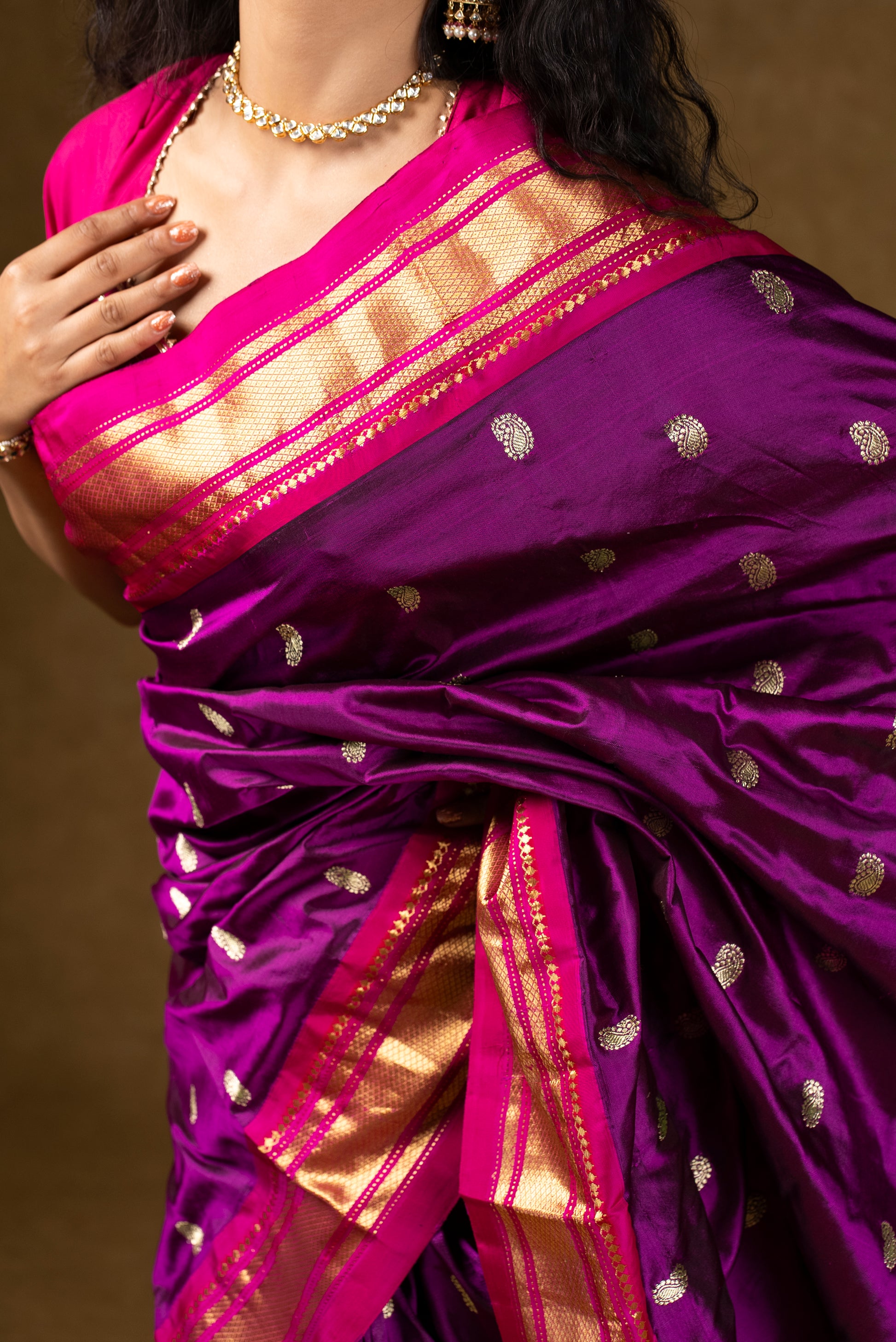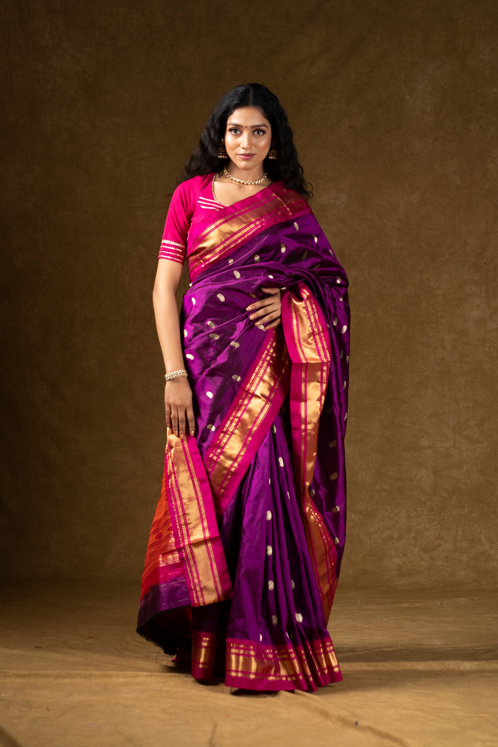 An elegant purple silk saree featuring a gold zari border and delicate motifs for a regal look.