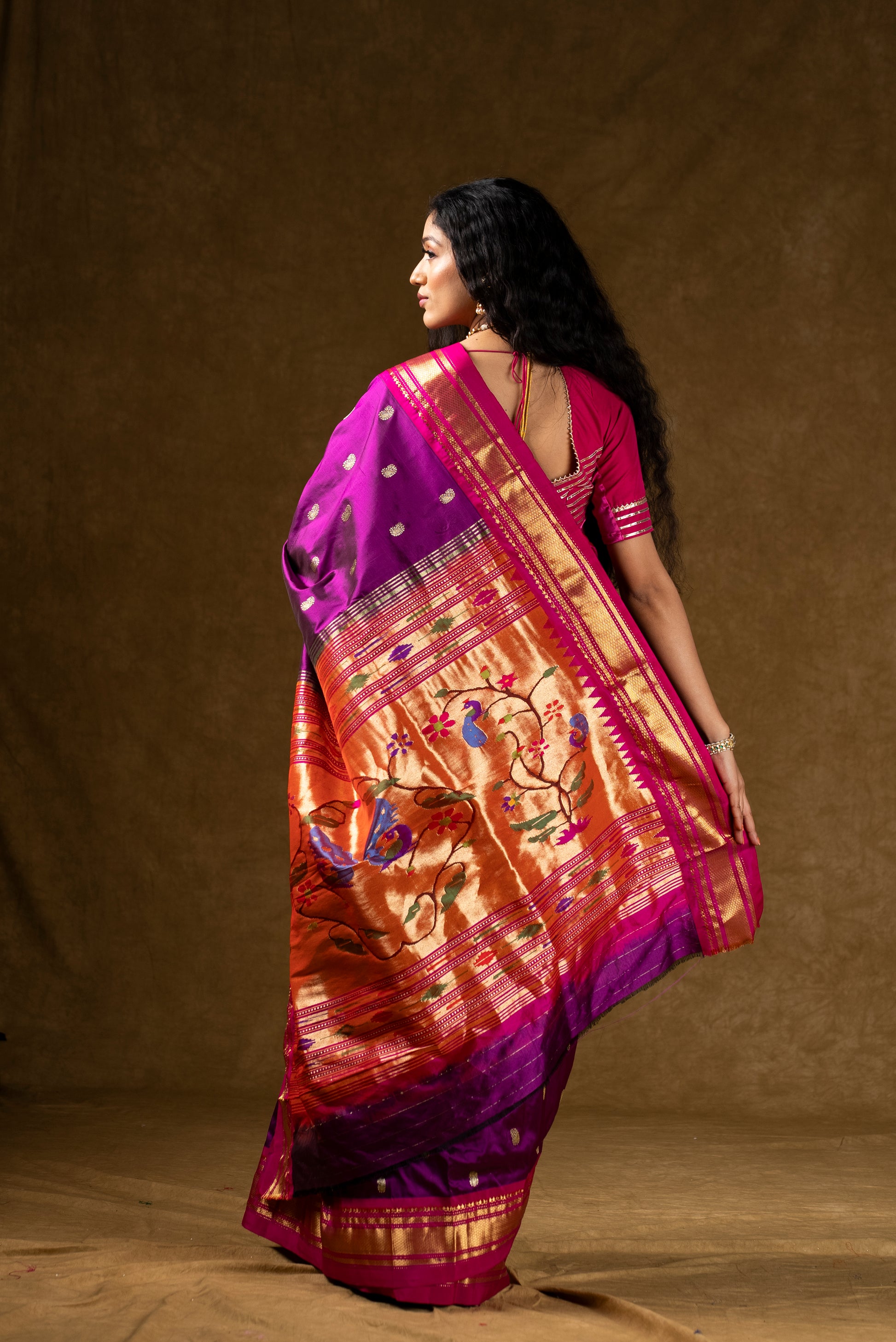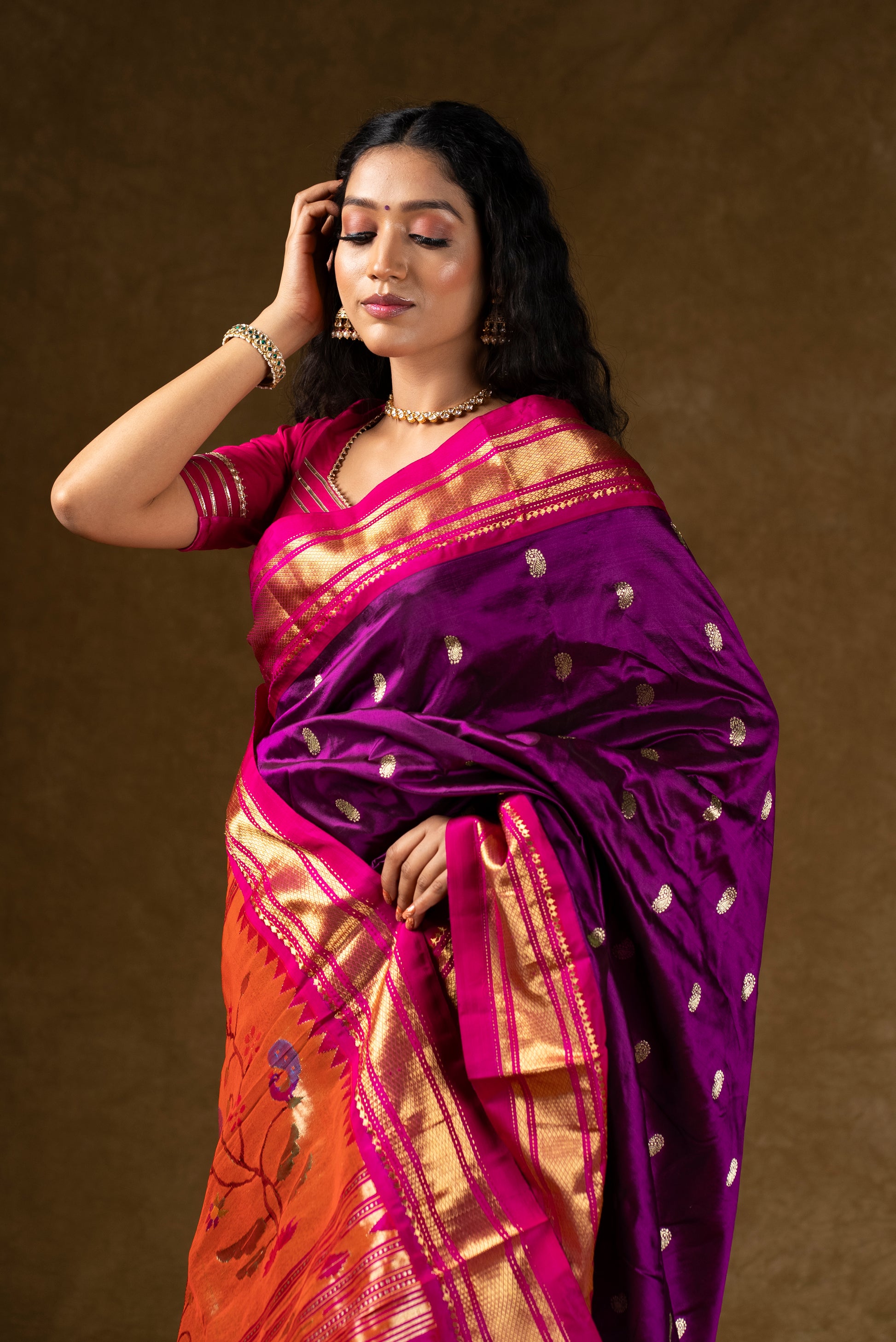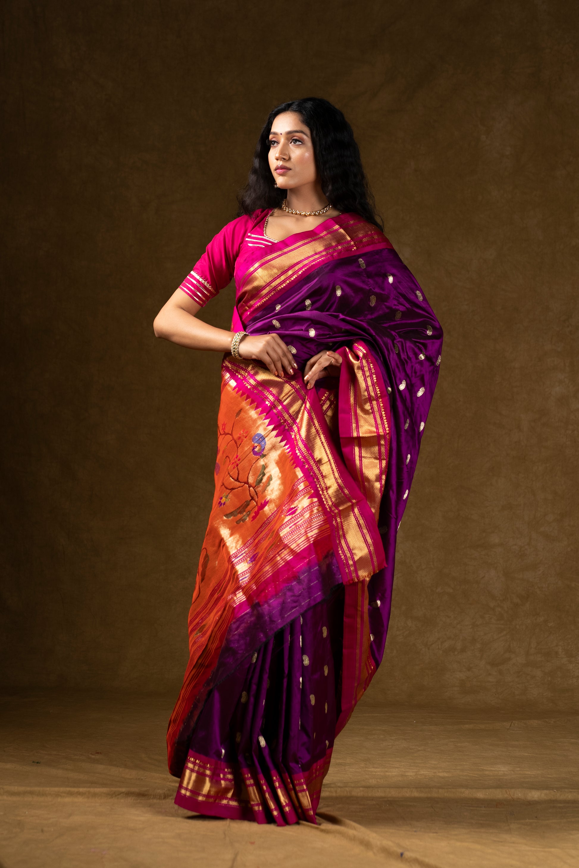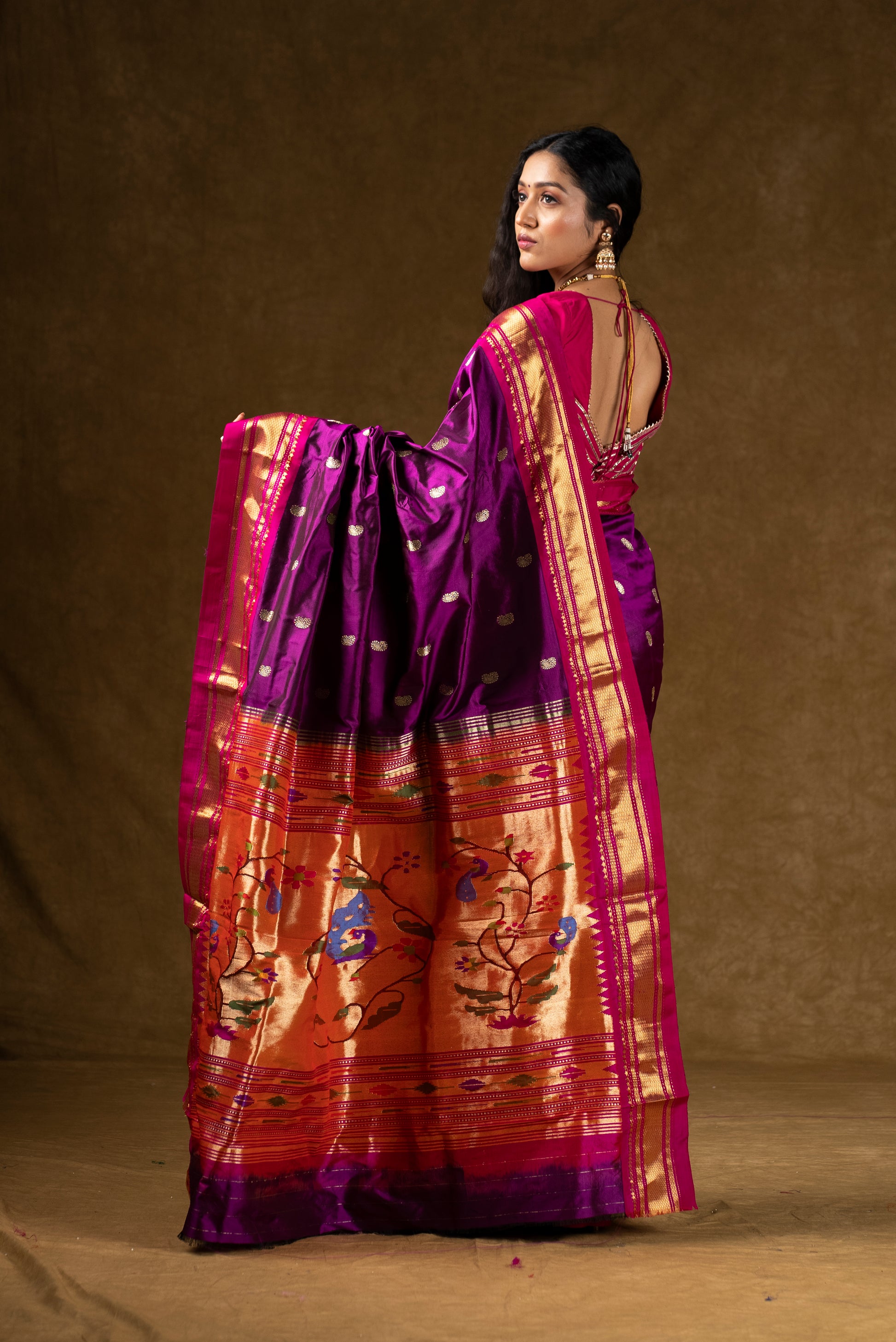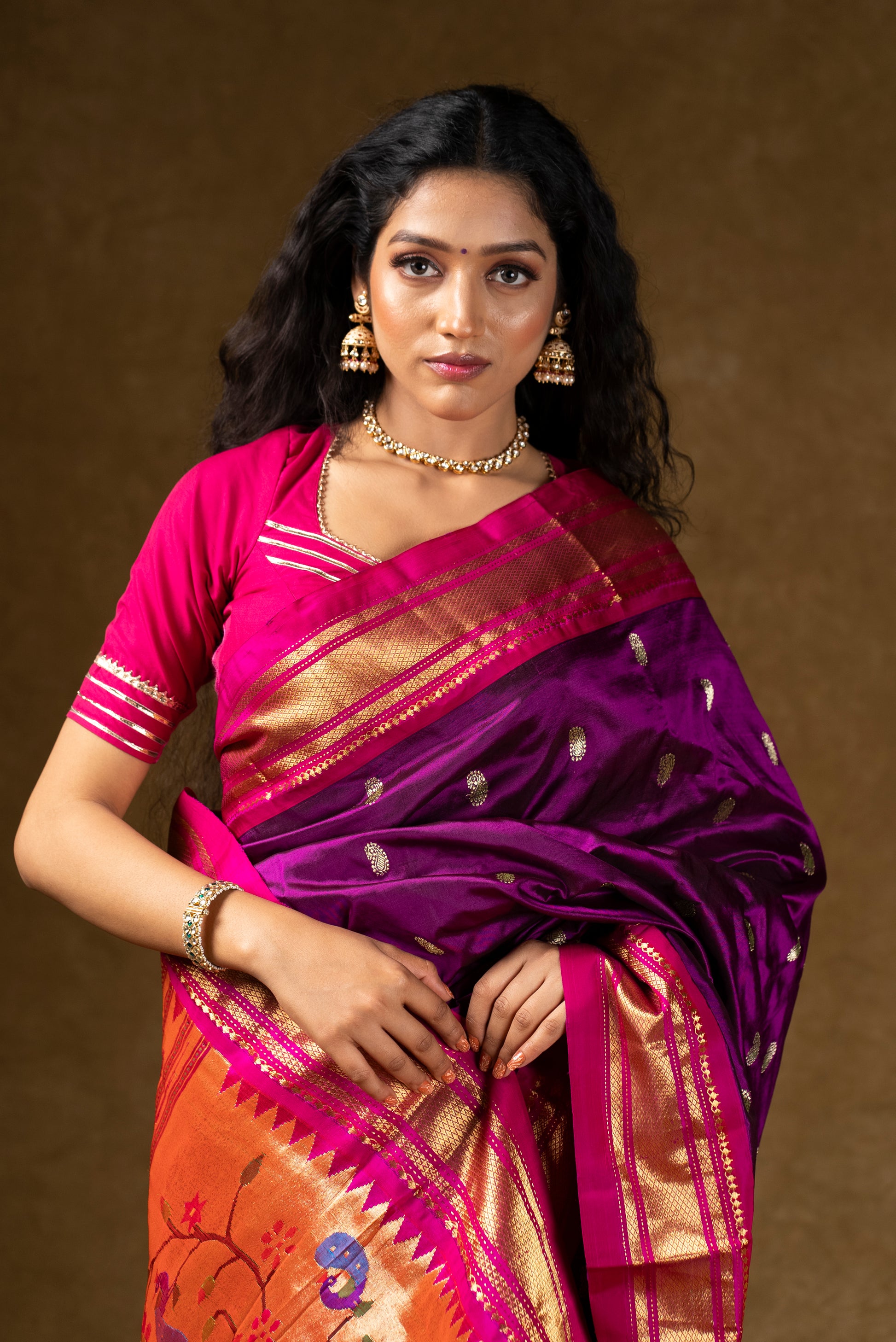This saree combines the richness of purple silk with the sophistication of gold zari work, creating an exquisite ensemble perfect for festive occasions and formal events. The intricate detailing on the border and pallu enhances its regal appeal, making it a timeless addition to your ethnic wardrobe.