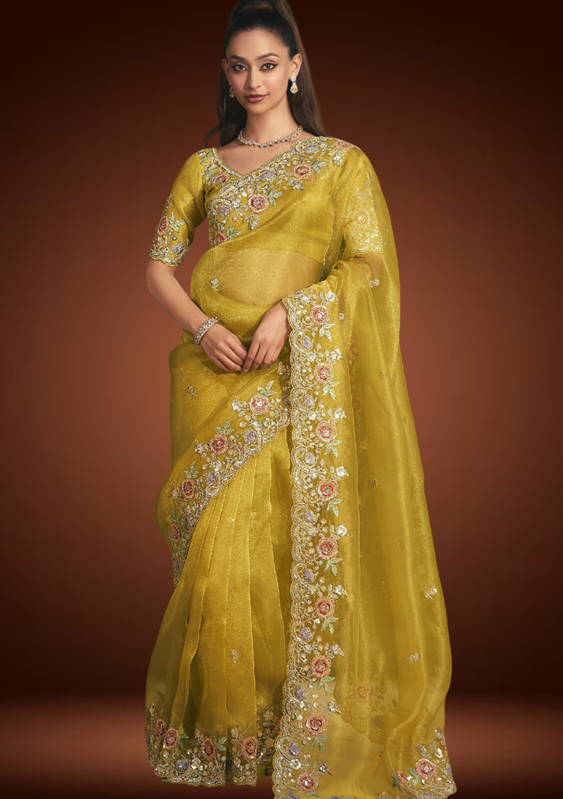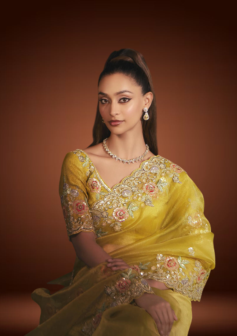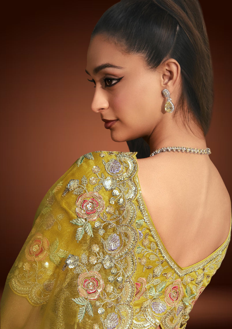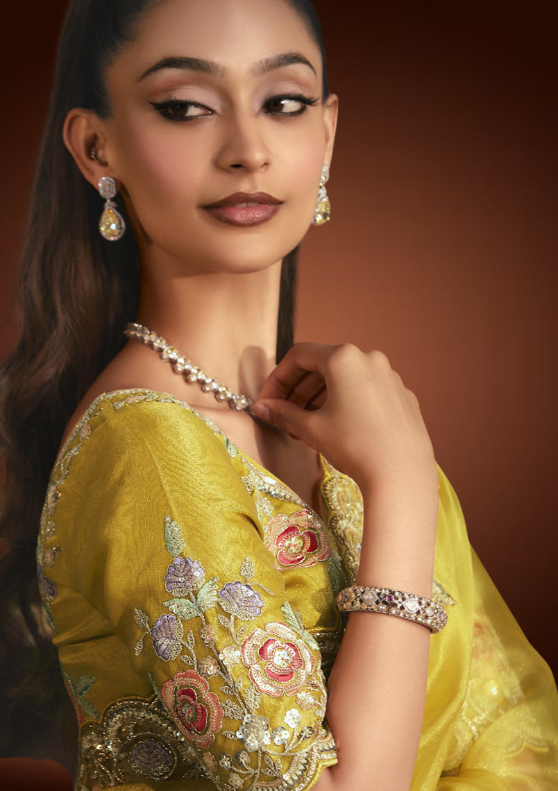 Radiant Yellow Tissue Organza Saree with Sequins Resham Embroidery & Matching Blouse