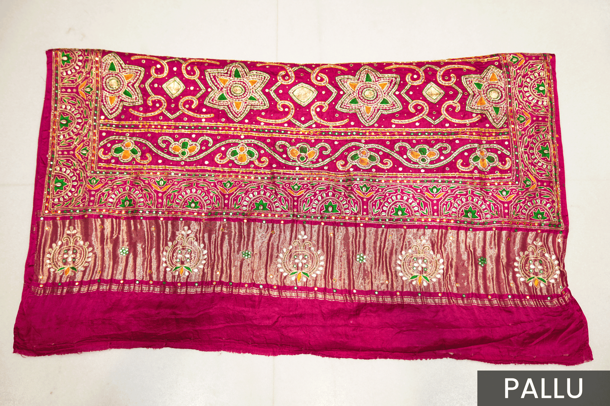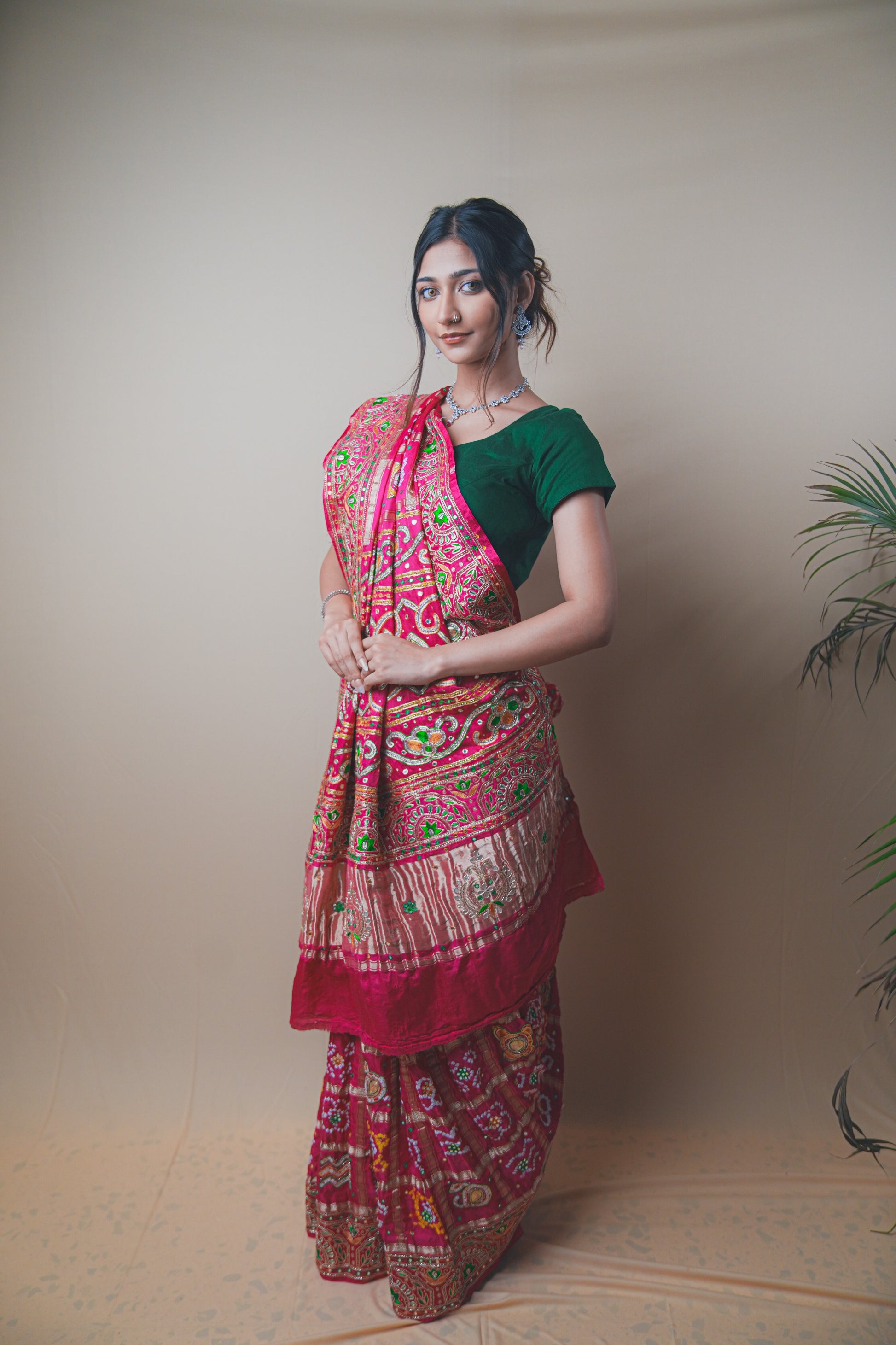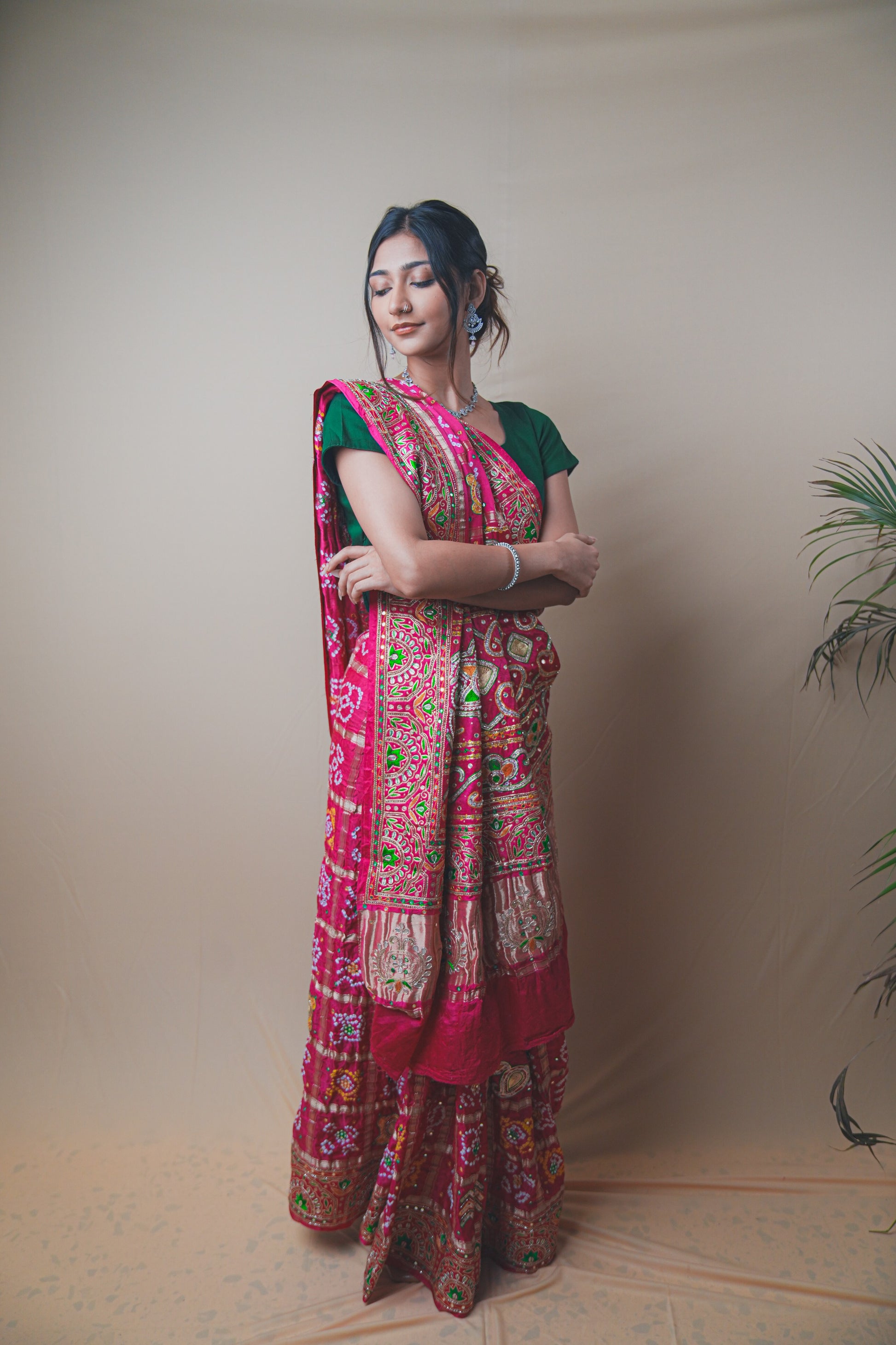 Celebrate tradition with this stunning Gaji silk saree featuring intricate Ghar Chola work, a hallmark of rich Gujarati craftsmanship. The vibrant Rani pink base is adorned with colorful threadwork and mirror detailing, creating a festive and timeless look. Ideal for weddings, Navratri, and special occasions.