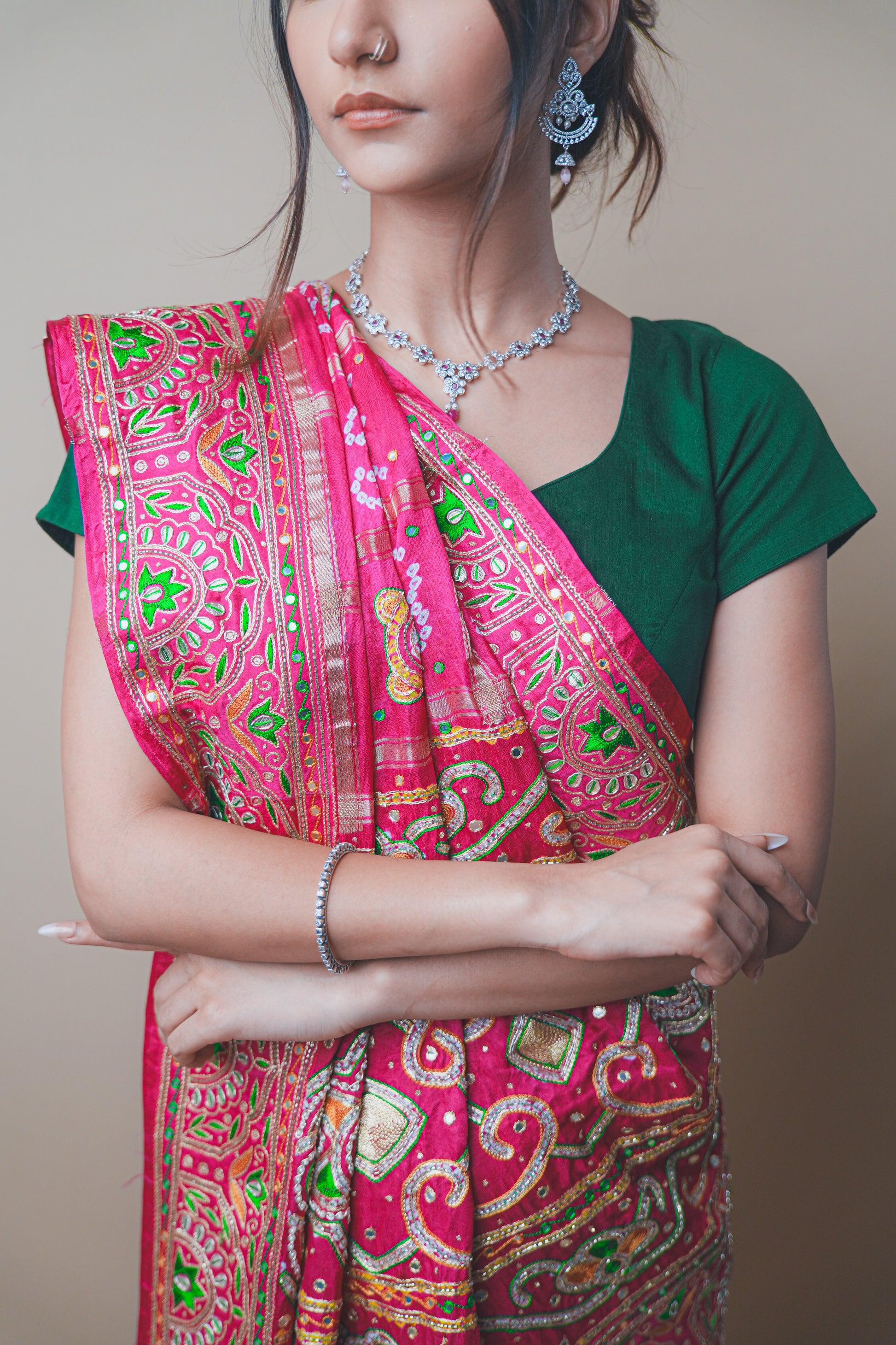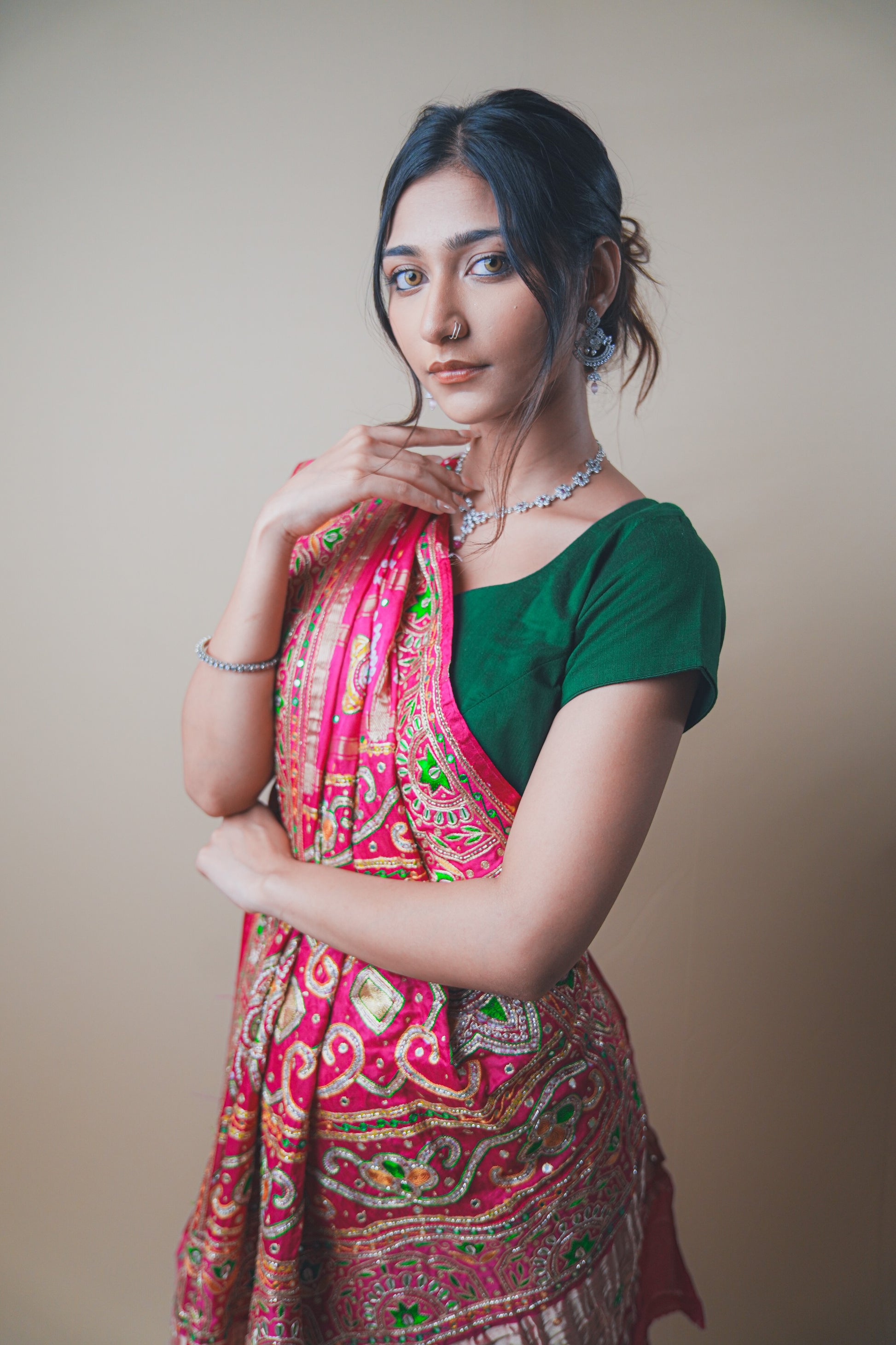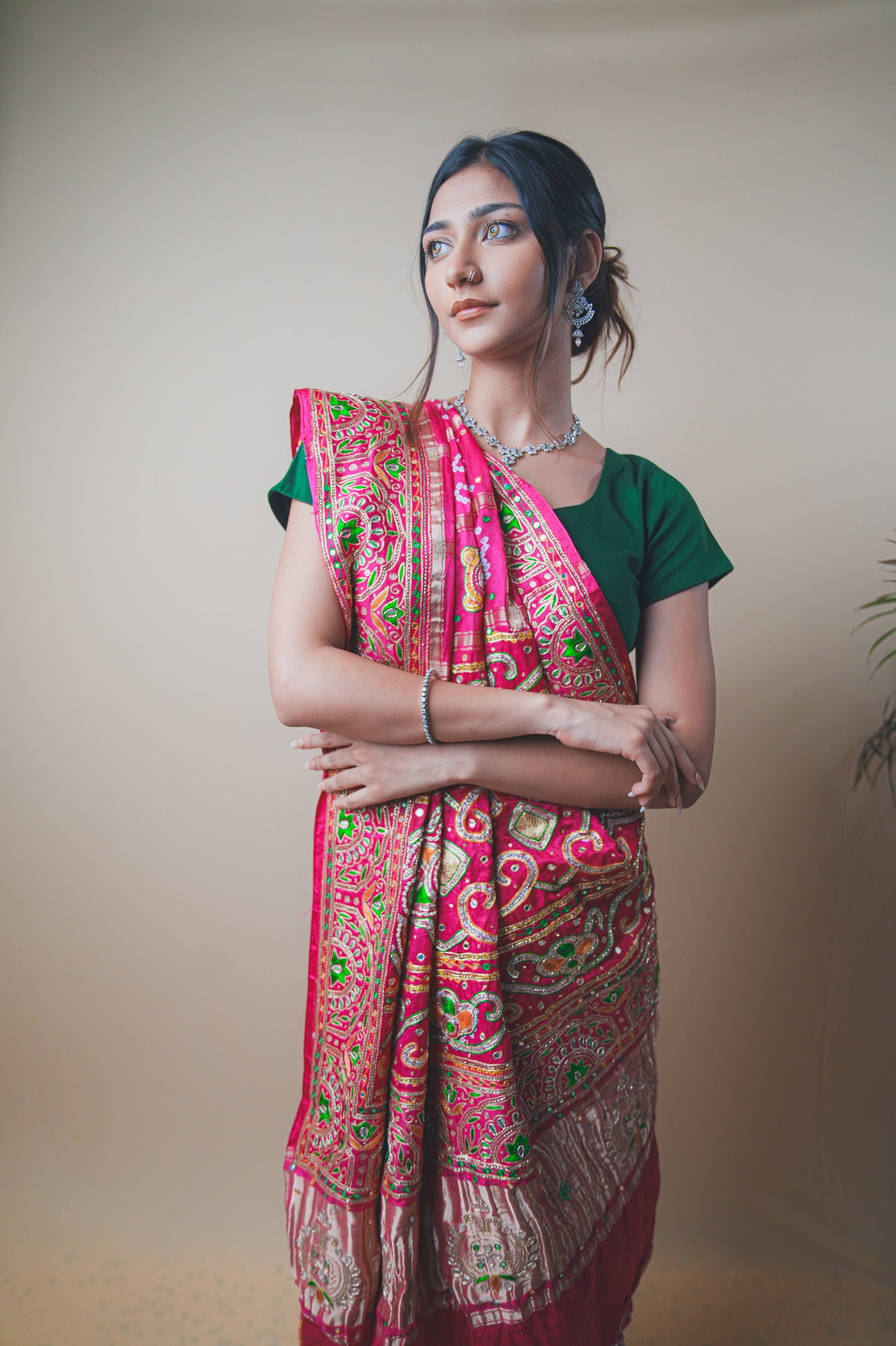 Celebrate tradition with this stunning Gaji silk saree featuring intricate Ghar Chola work, a hallmark of rich Gujarati craftsmanship. The vibrant Rani pink base is adorned with colorful threadwork and mirror detailing, creating a festive and timeless look. Ideal for weddings, Navratri, and special occasions.