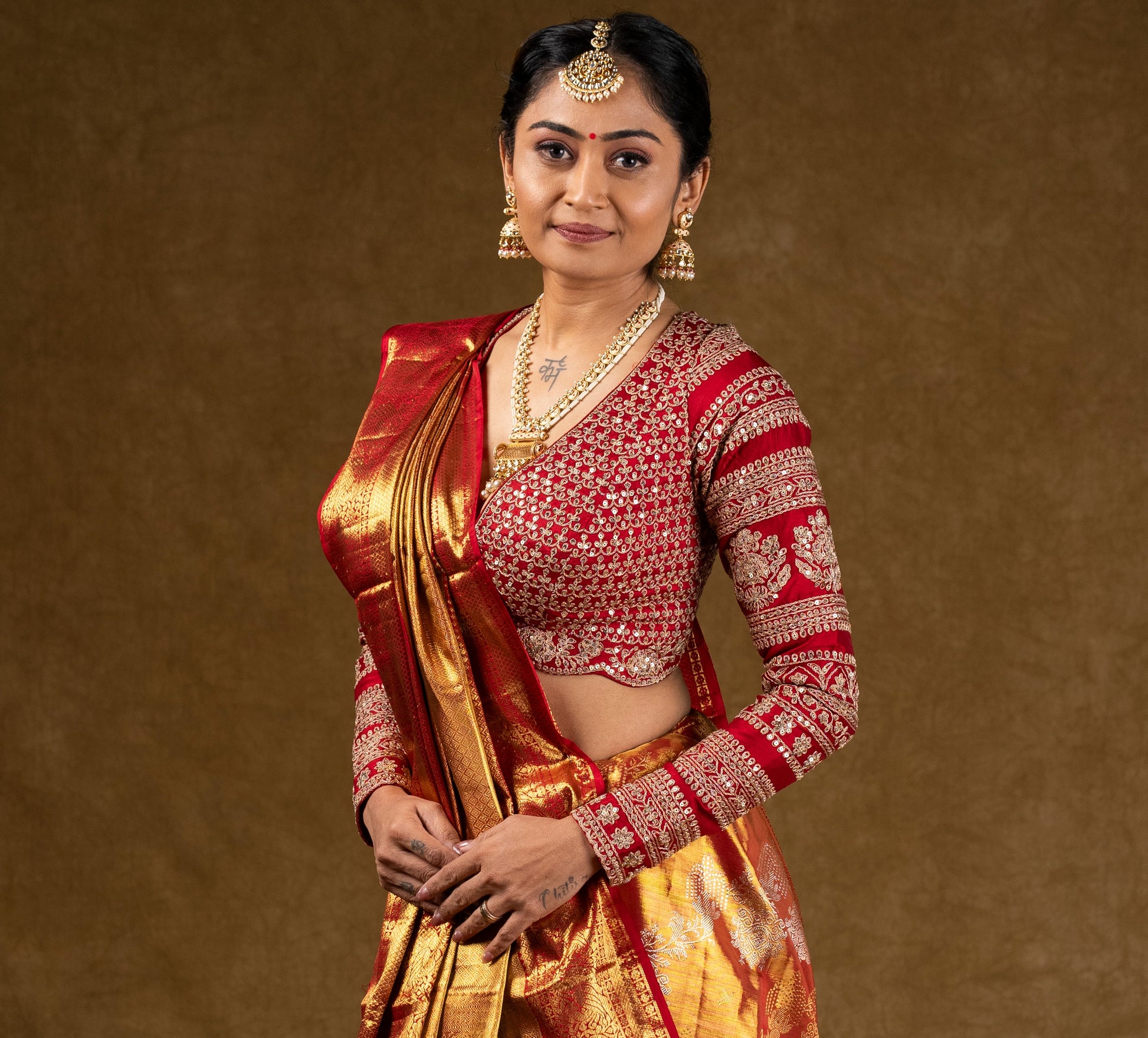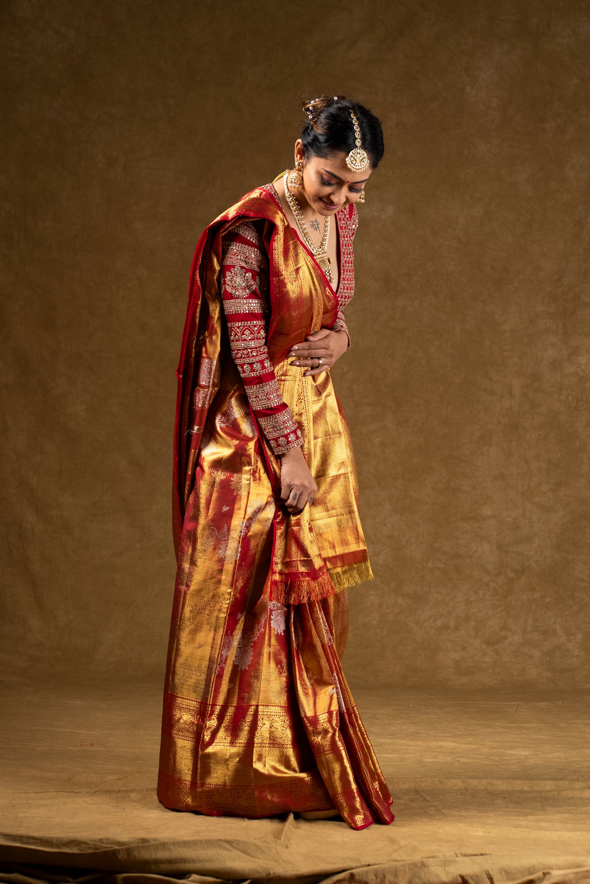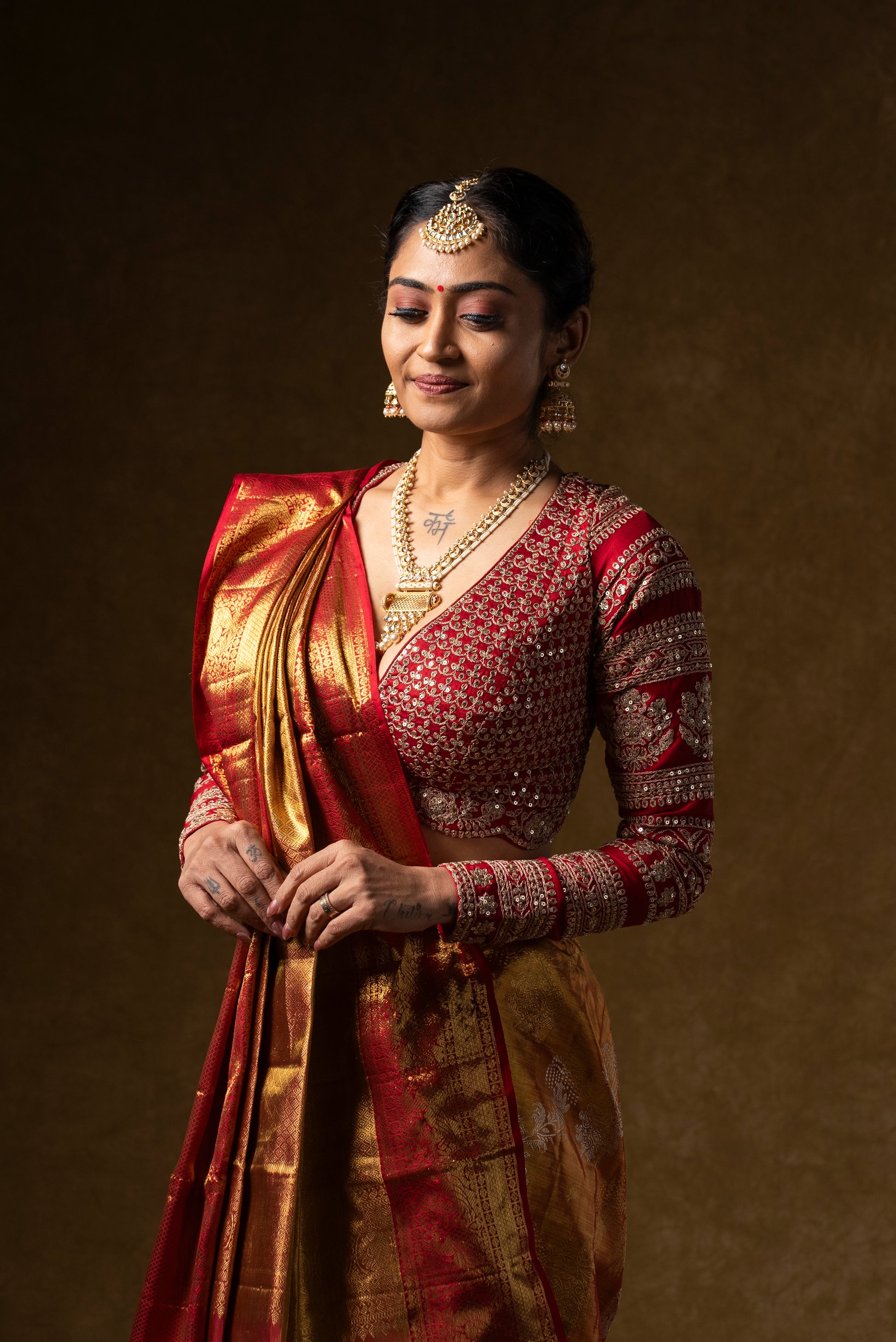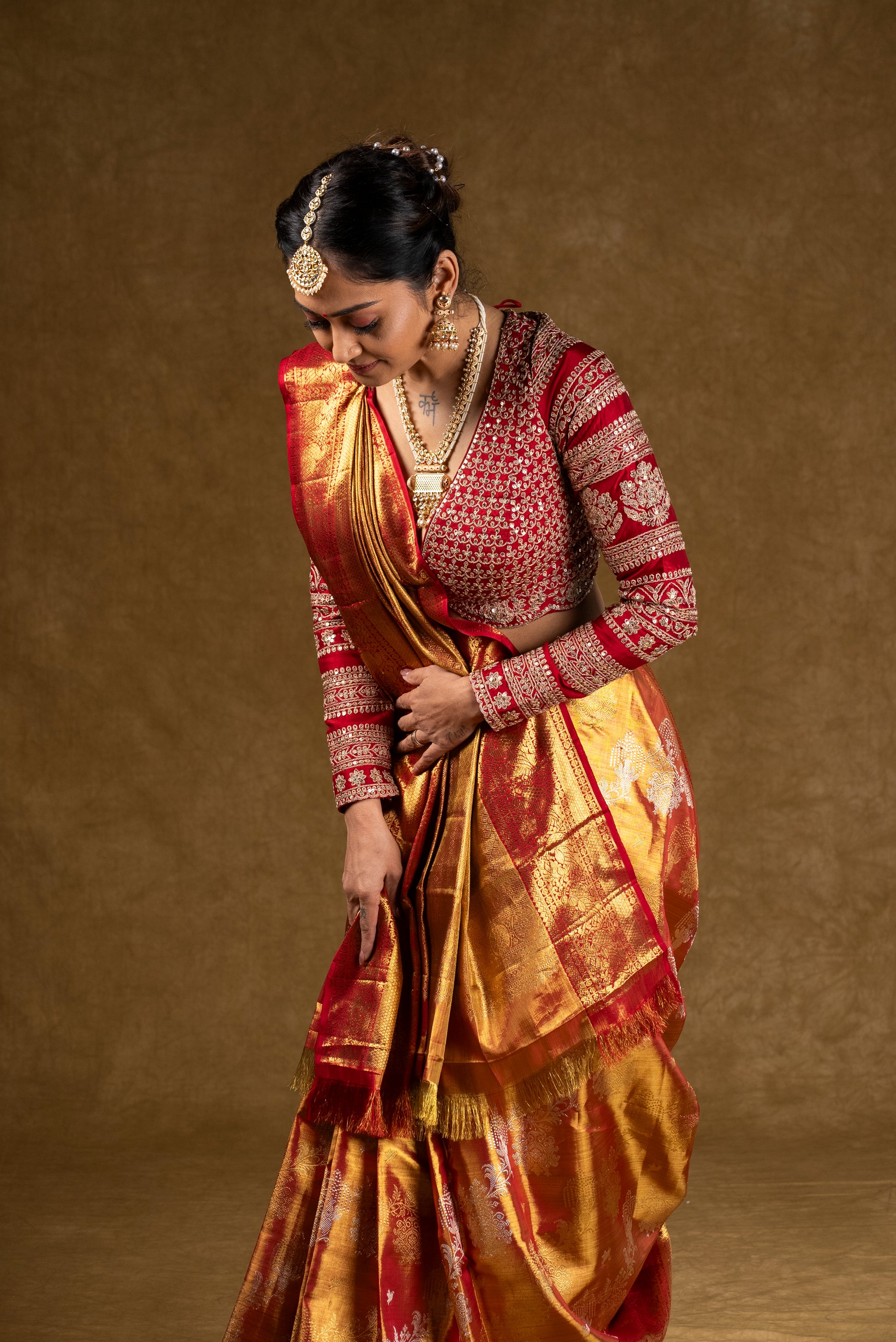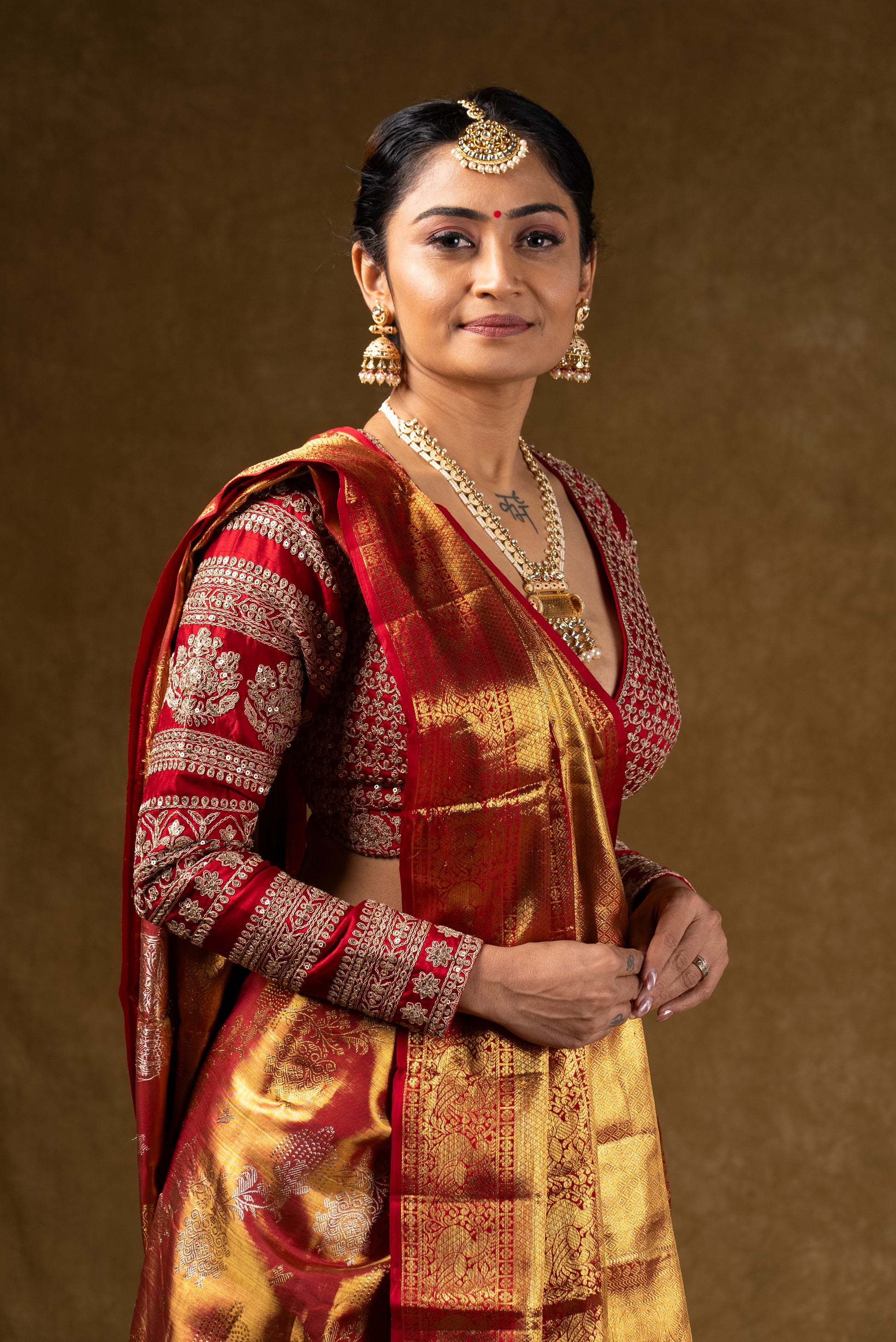 A timeless red and gold Banarasi silk saree paired with an intricately embroidered blouse for a regal look.
