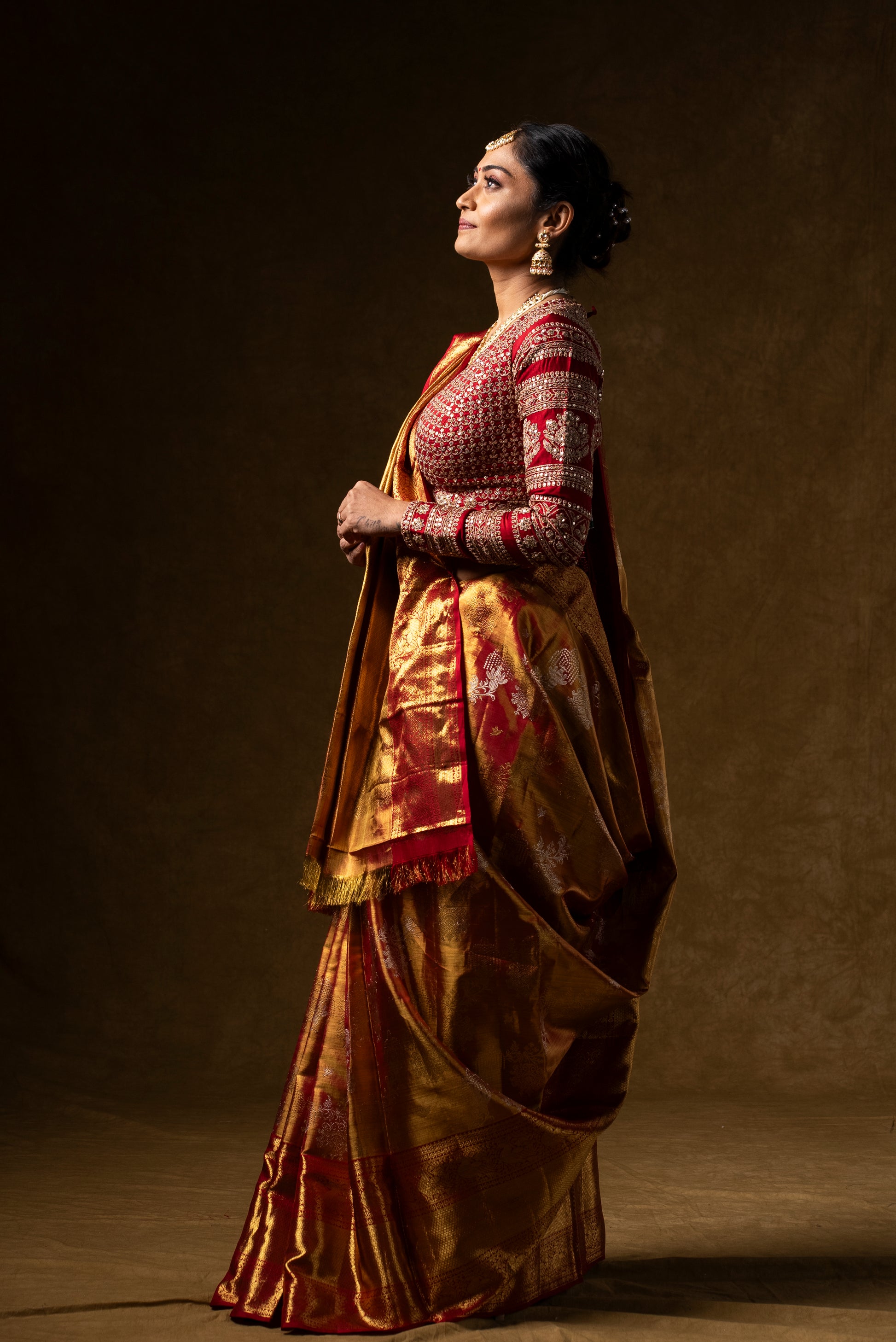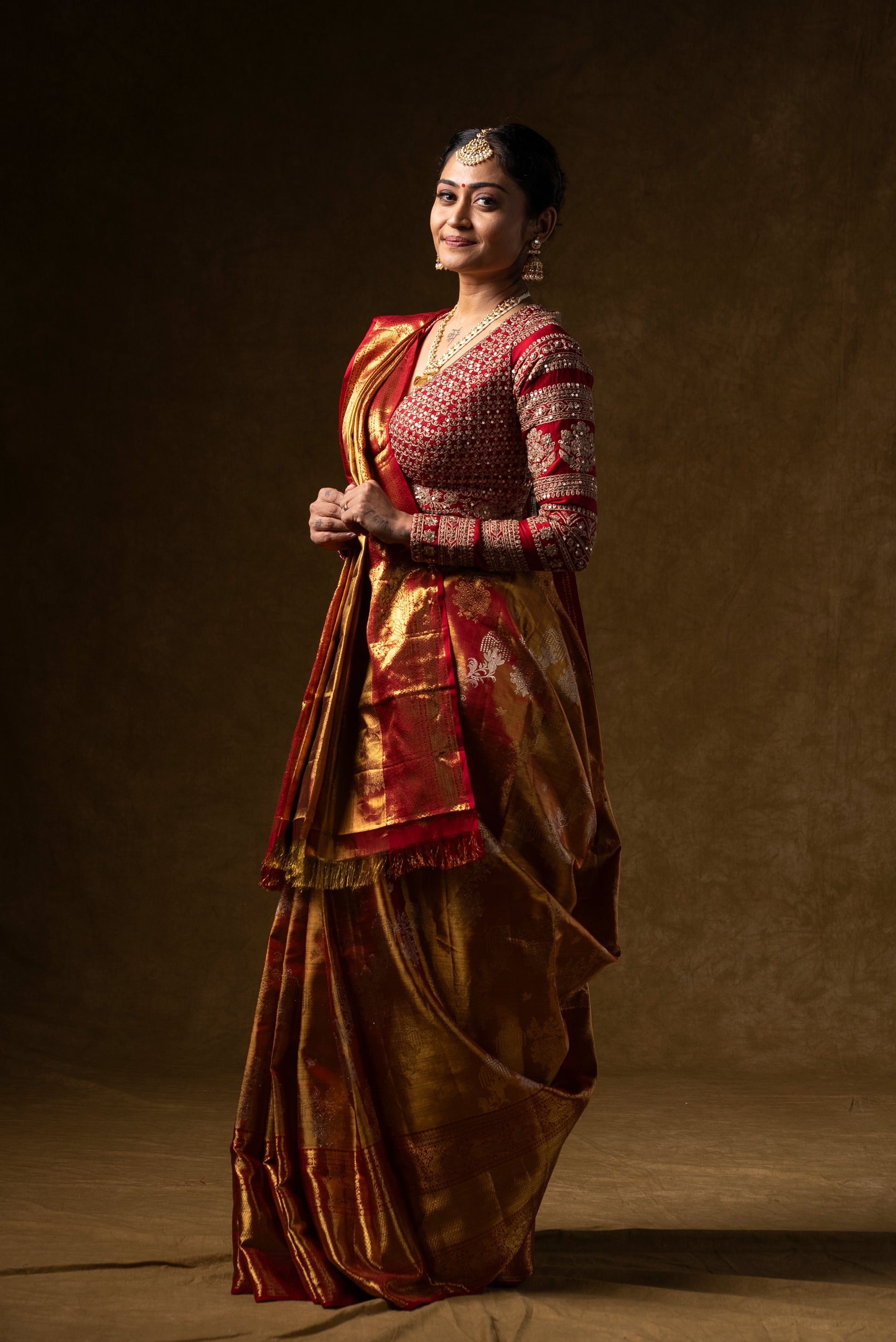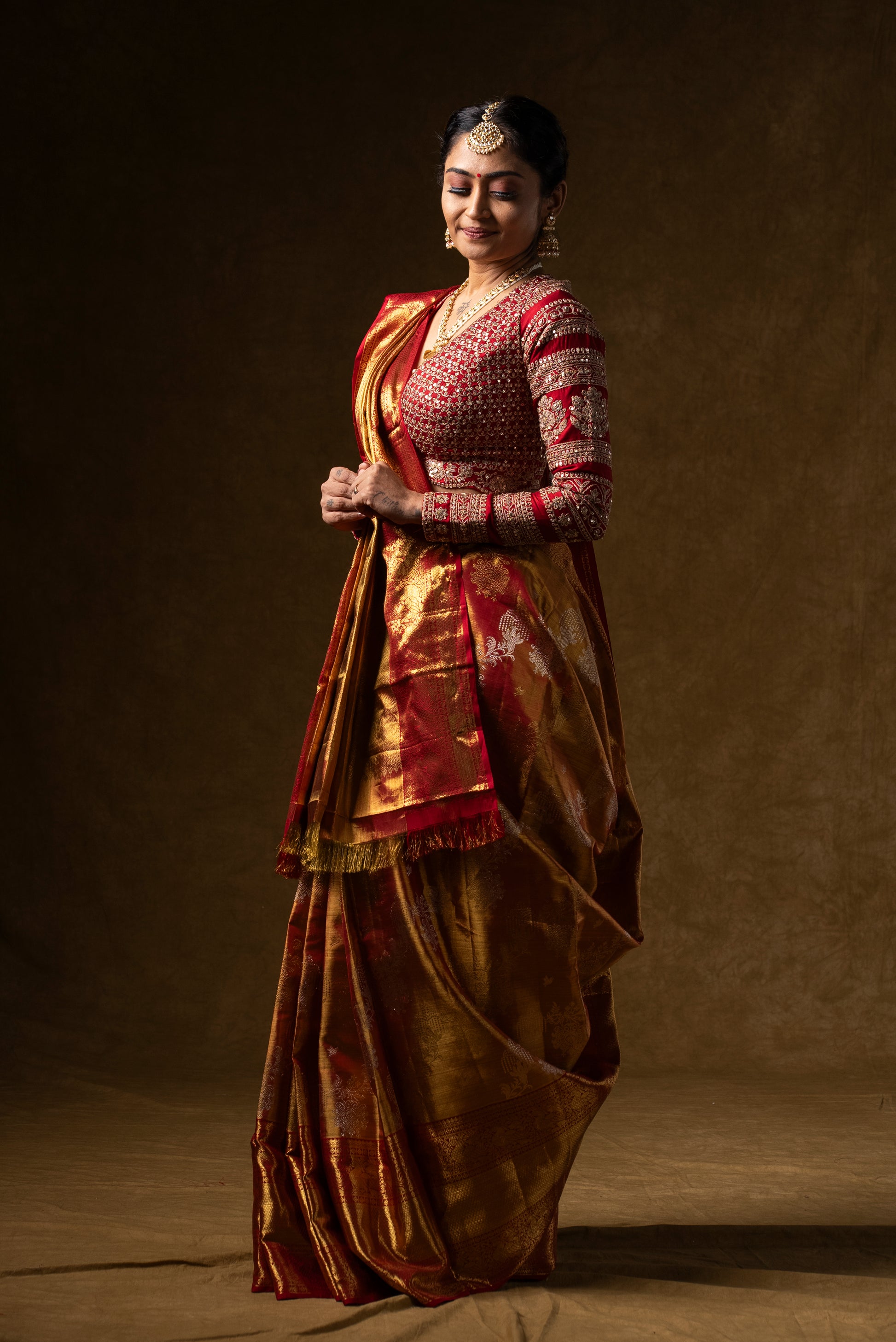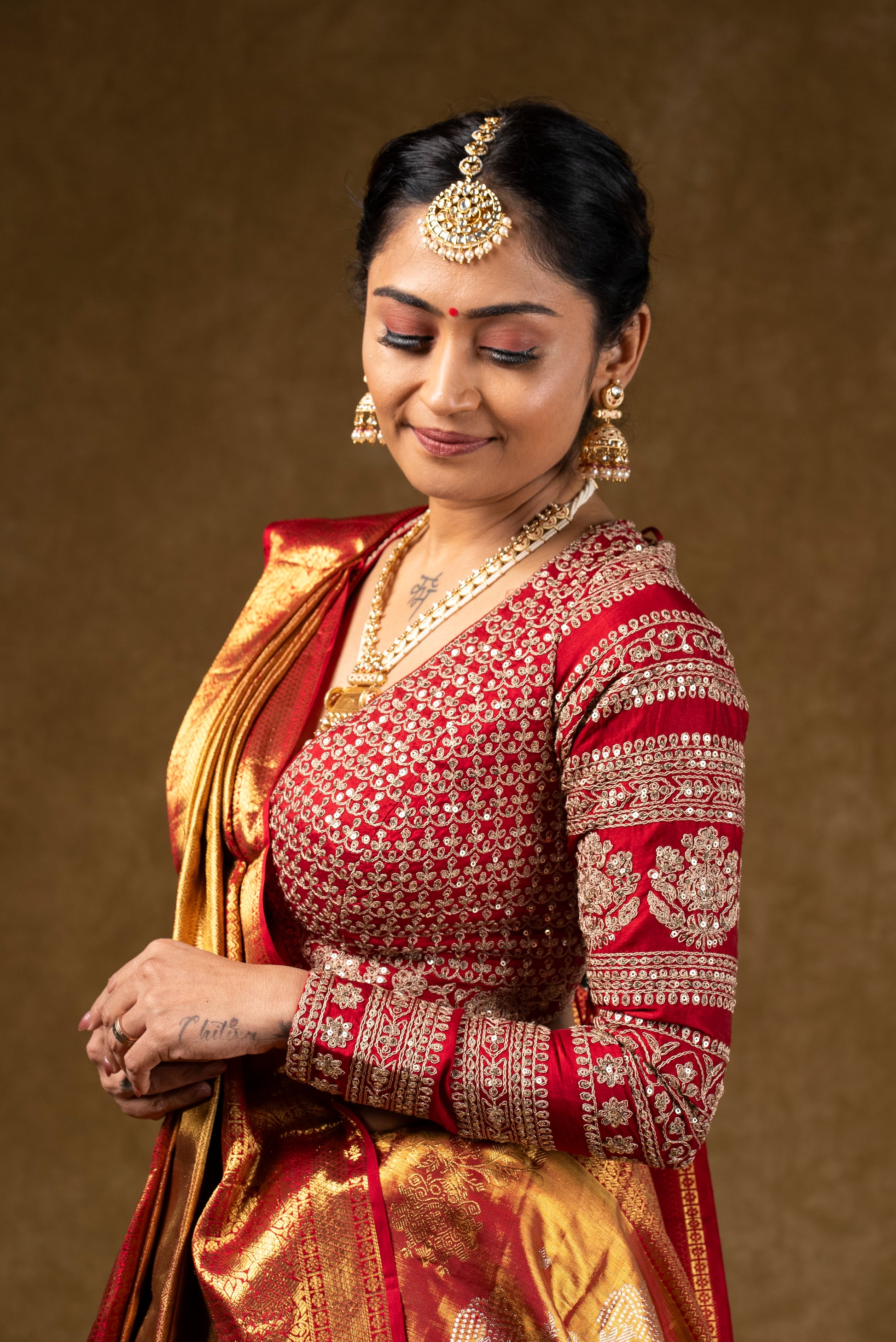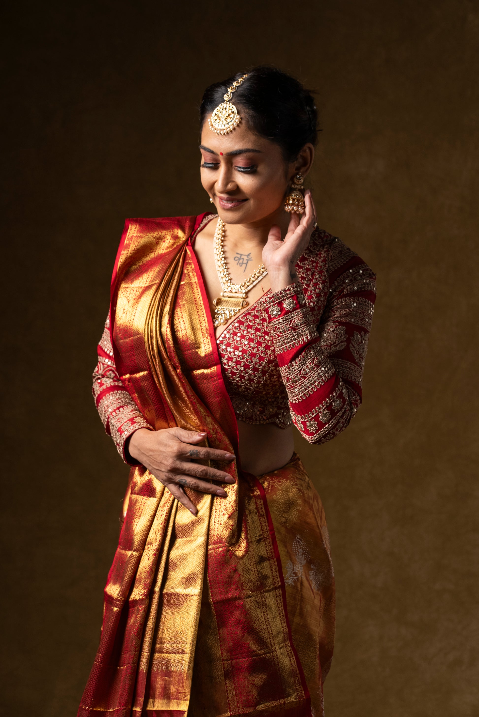 A timeless red and gold Banarasi silk saree paired with an intricately embroidered blouse for a regal look.