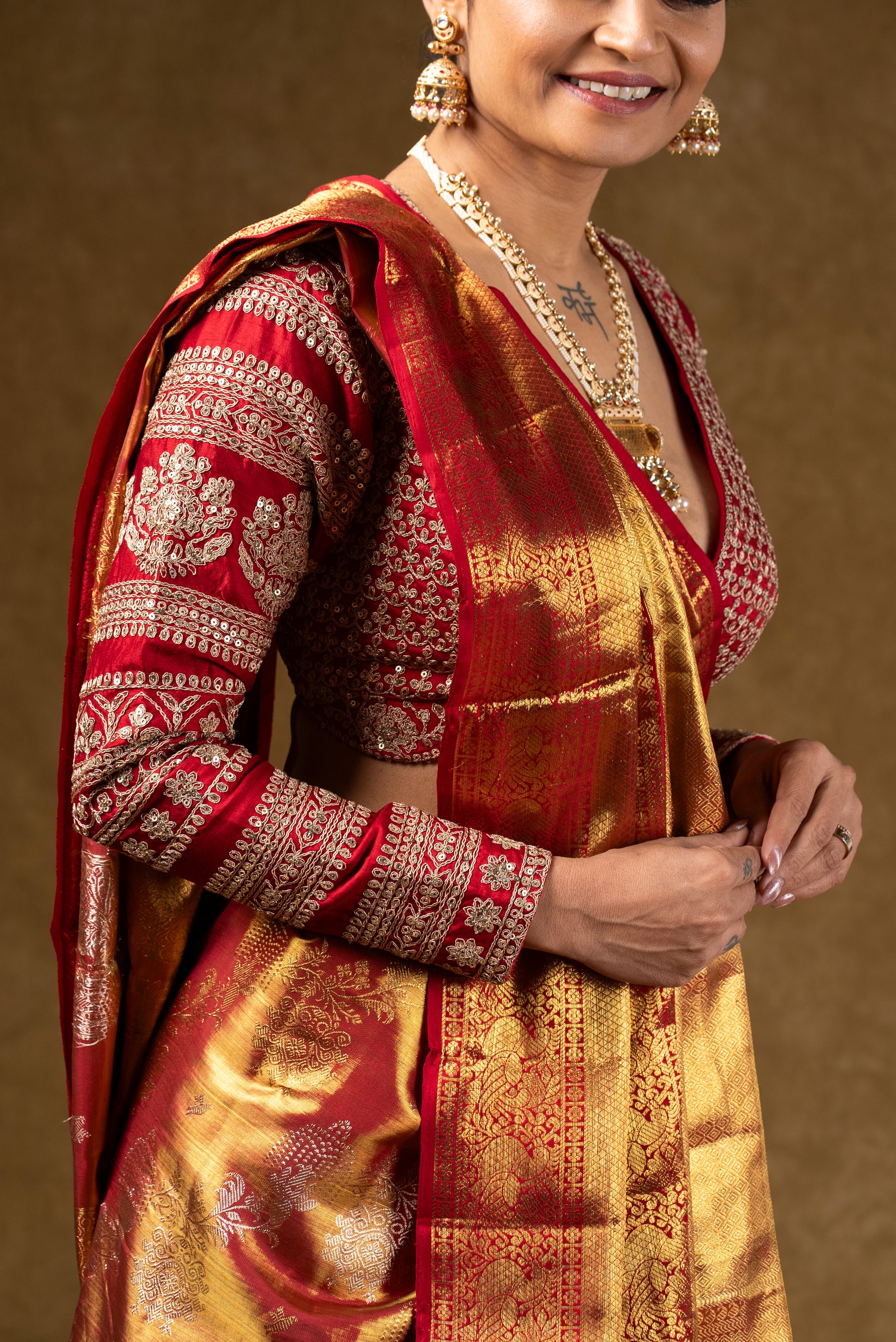 Red and Gold Banarasi Silk Saree with Embroidered Blouse