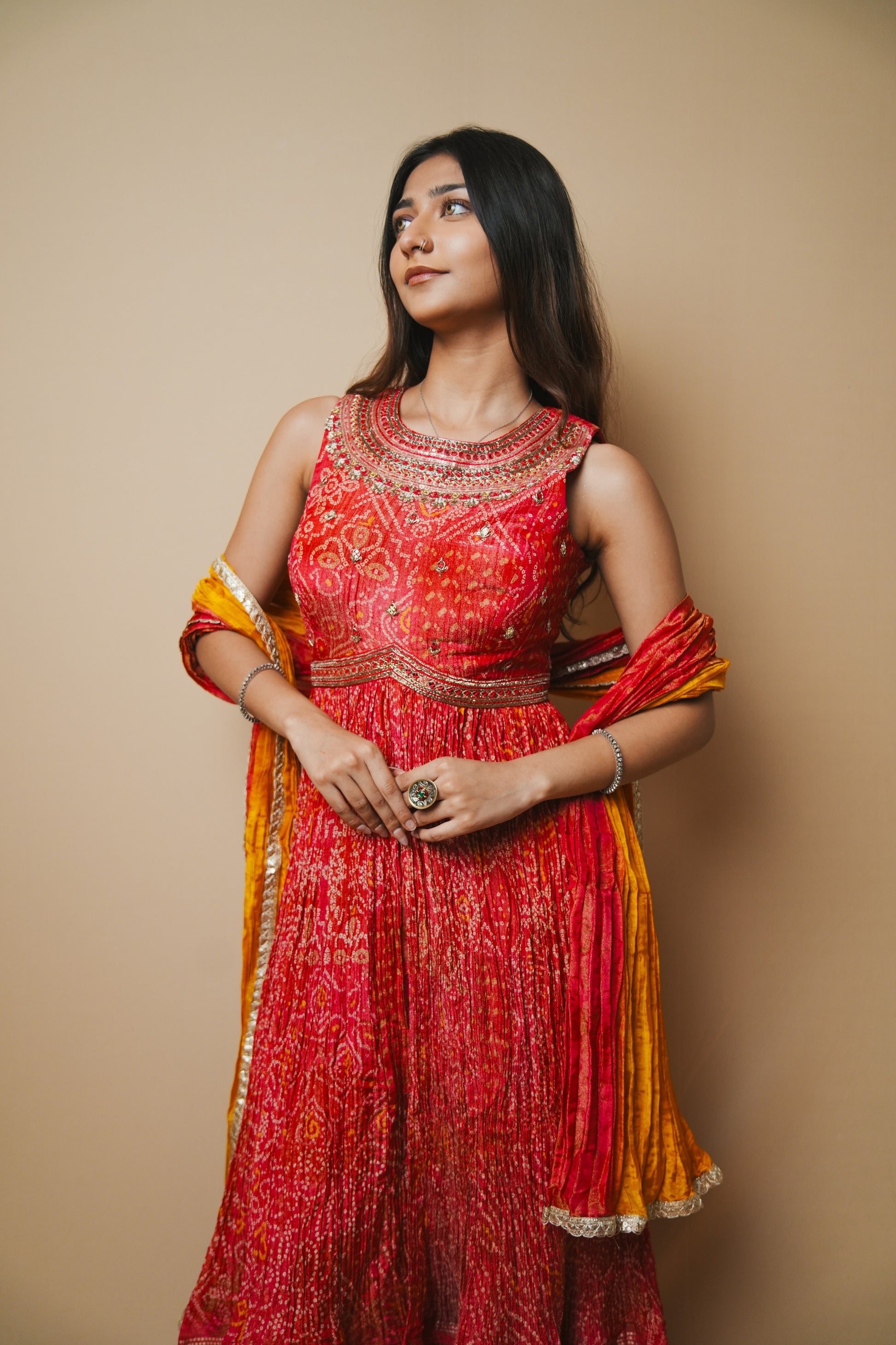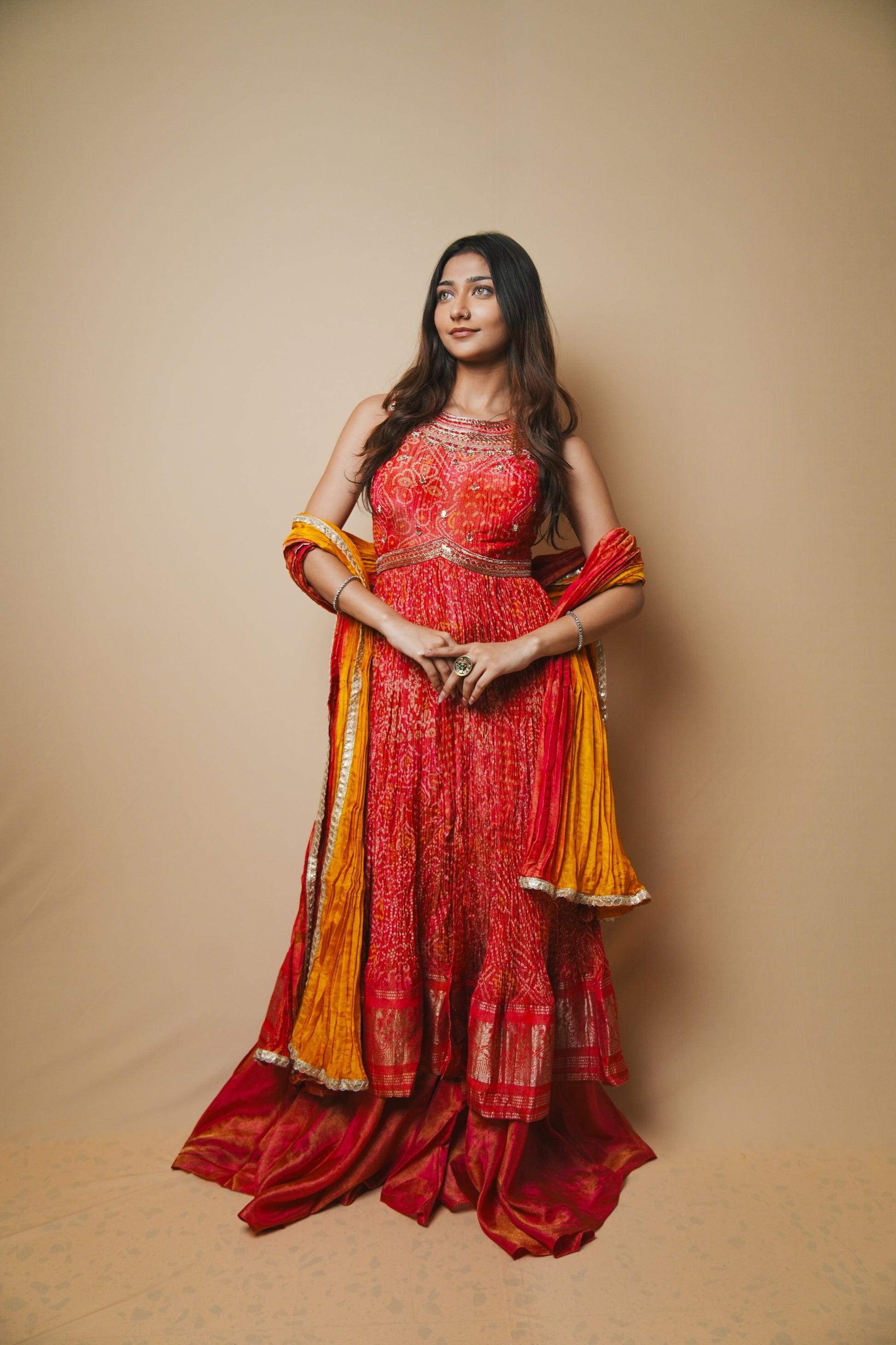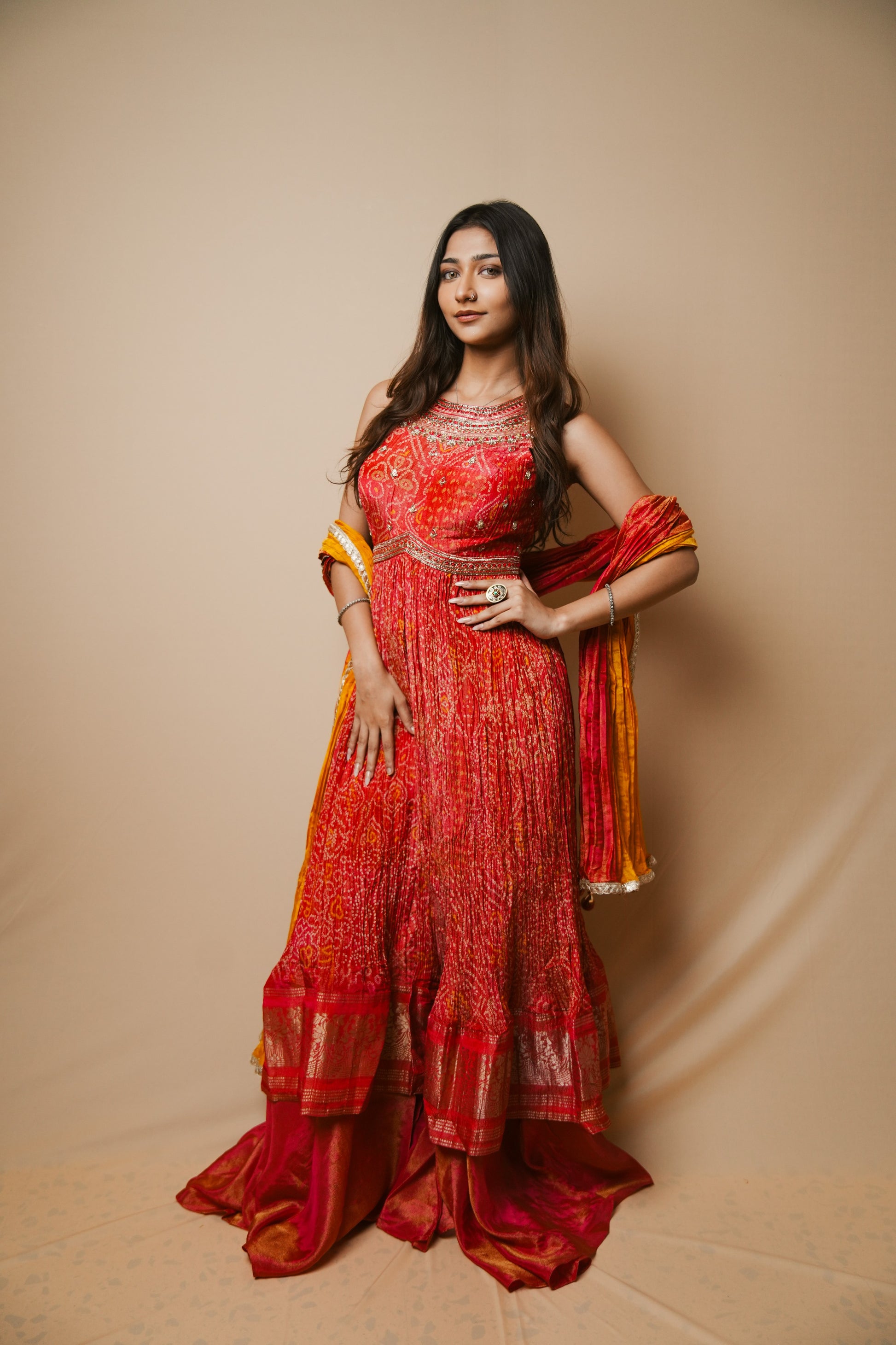 This elegant ensemble features a crushed silk plazo set adorned with a traditional Bandhej print, giving it a rich and vibrant texture. The look is elevated with a beautifully embroidered long top showcasing delicate Jardozi handwork, blending heritage craftsmanship with contemporary style. The outfit is completed with a matching dupatta that adds a pop of contrast and grace.