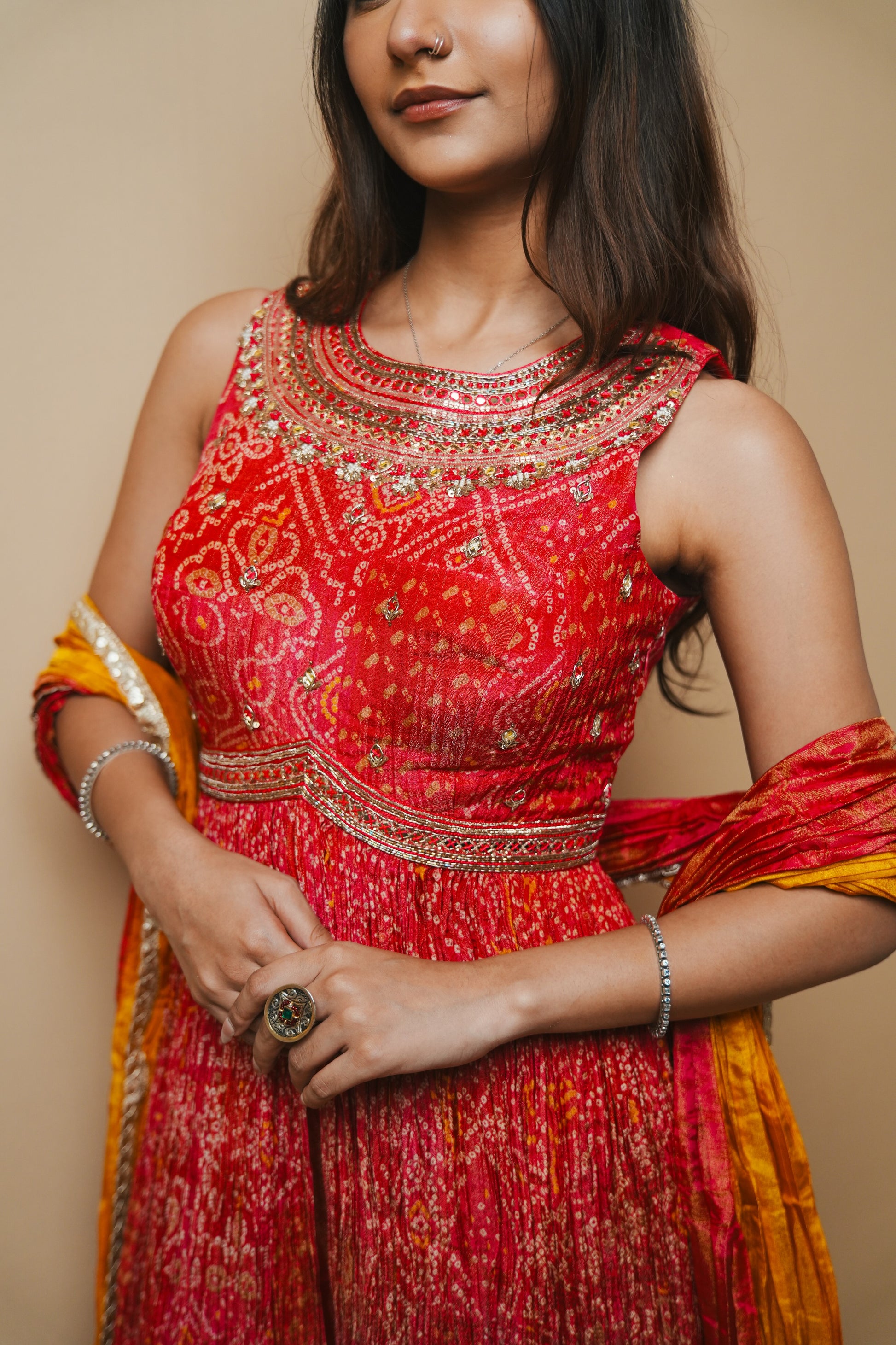 Red Crushed Silk Bandhej Print Plazo Set with Long Top and Jardozi Embroidery