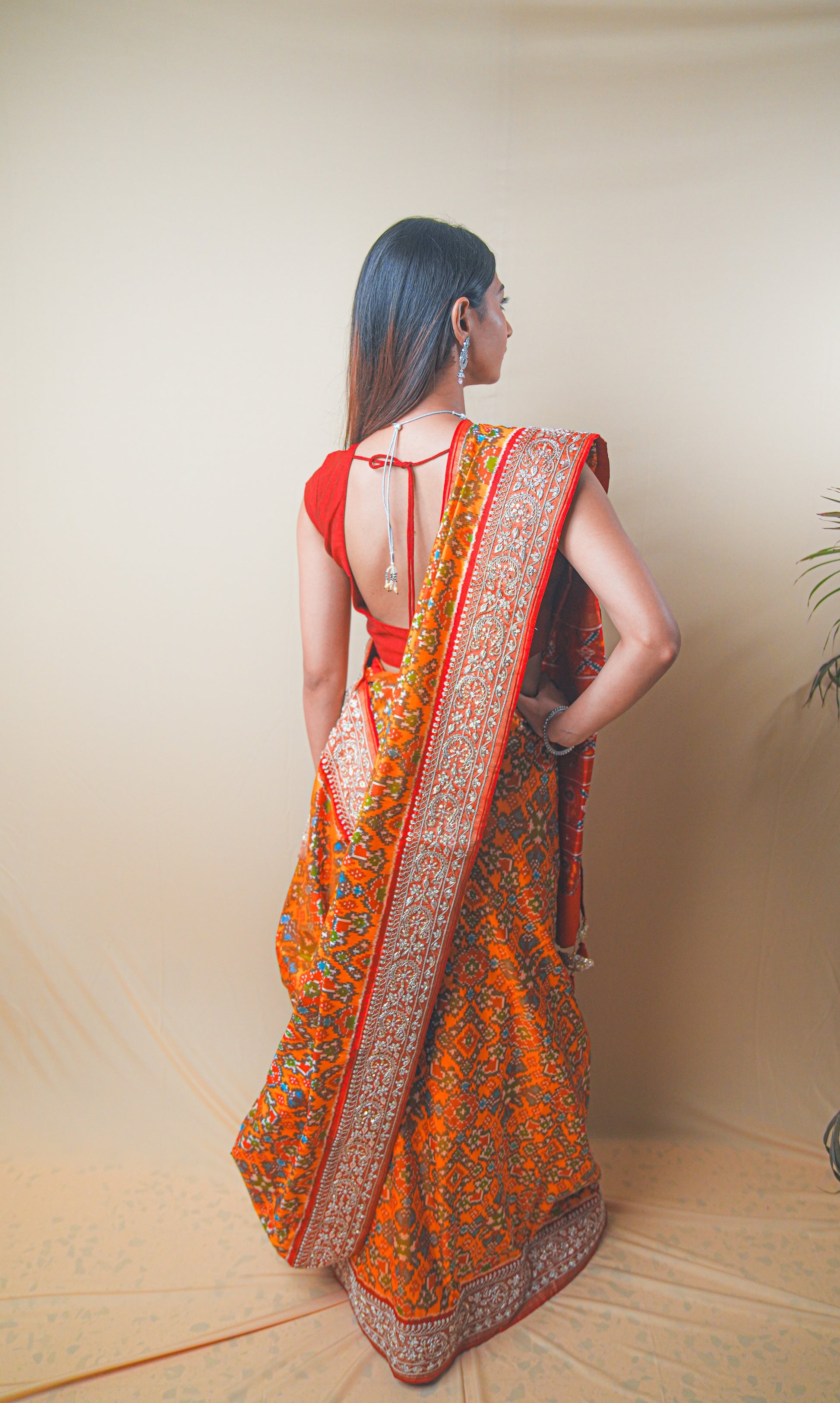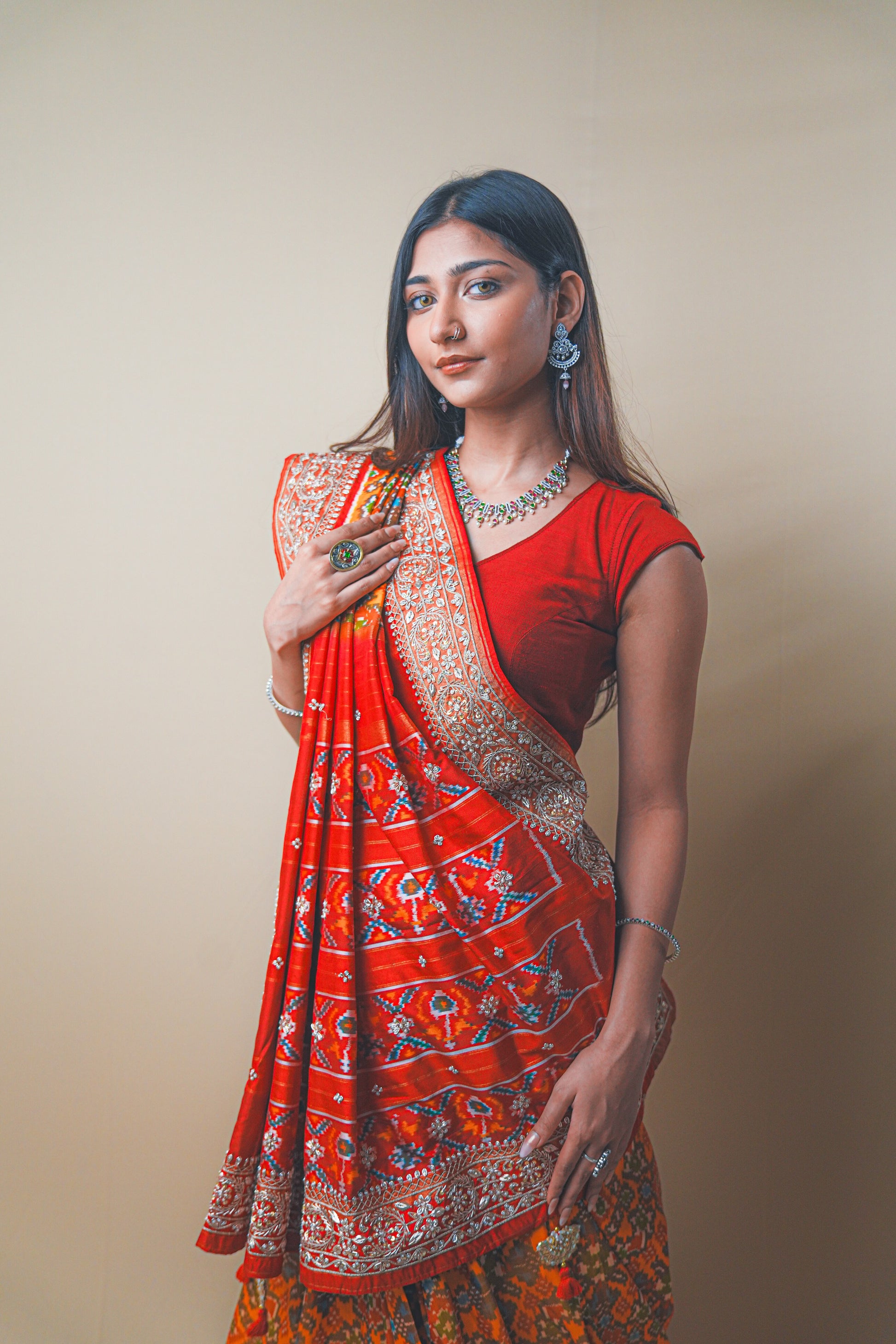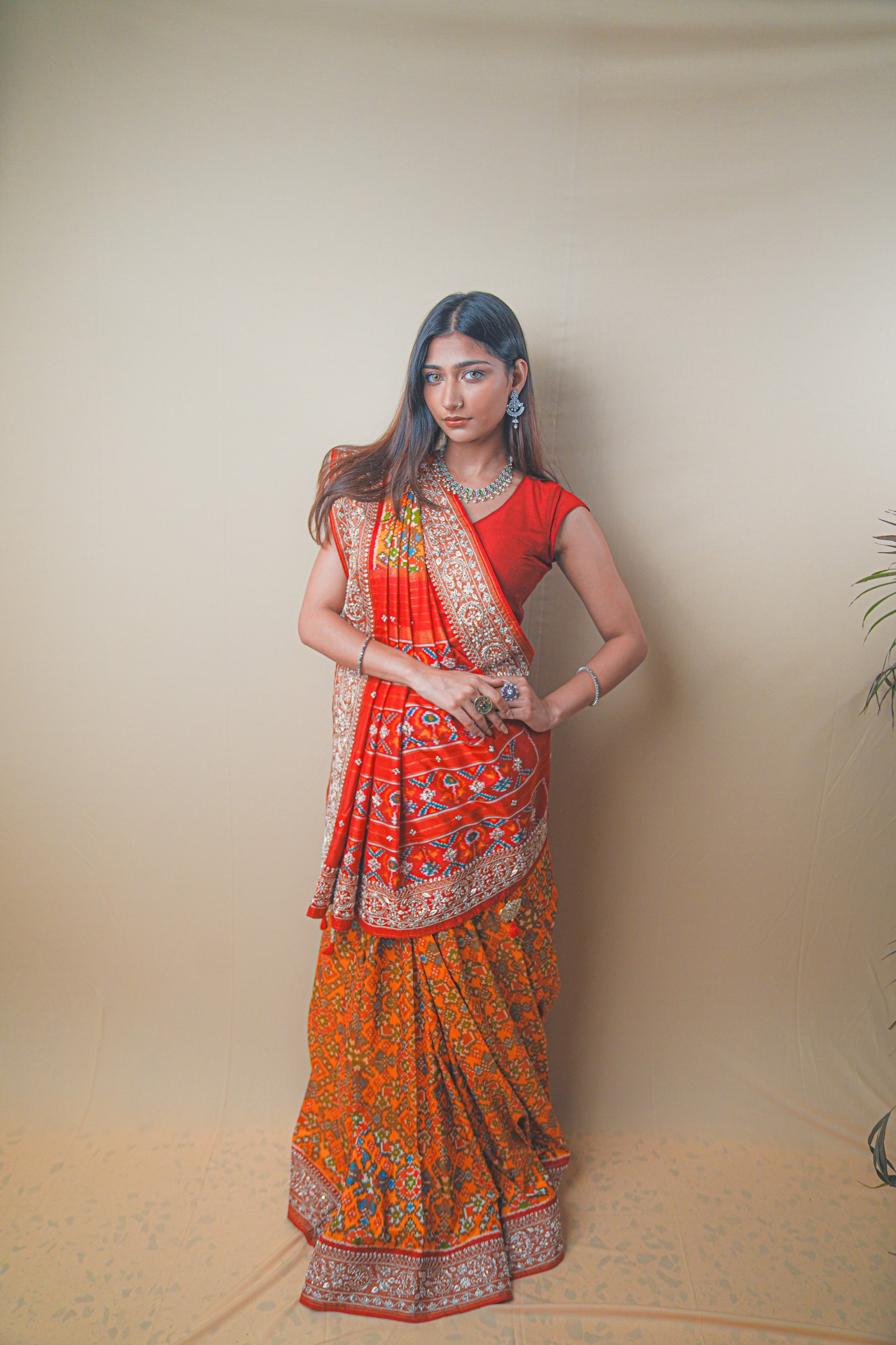Red & Orange Pure Ikat Patola Saree with Zardozi and Aari Embroidery