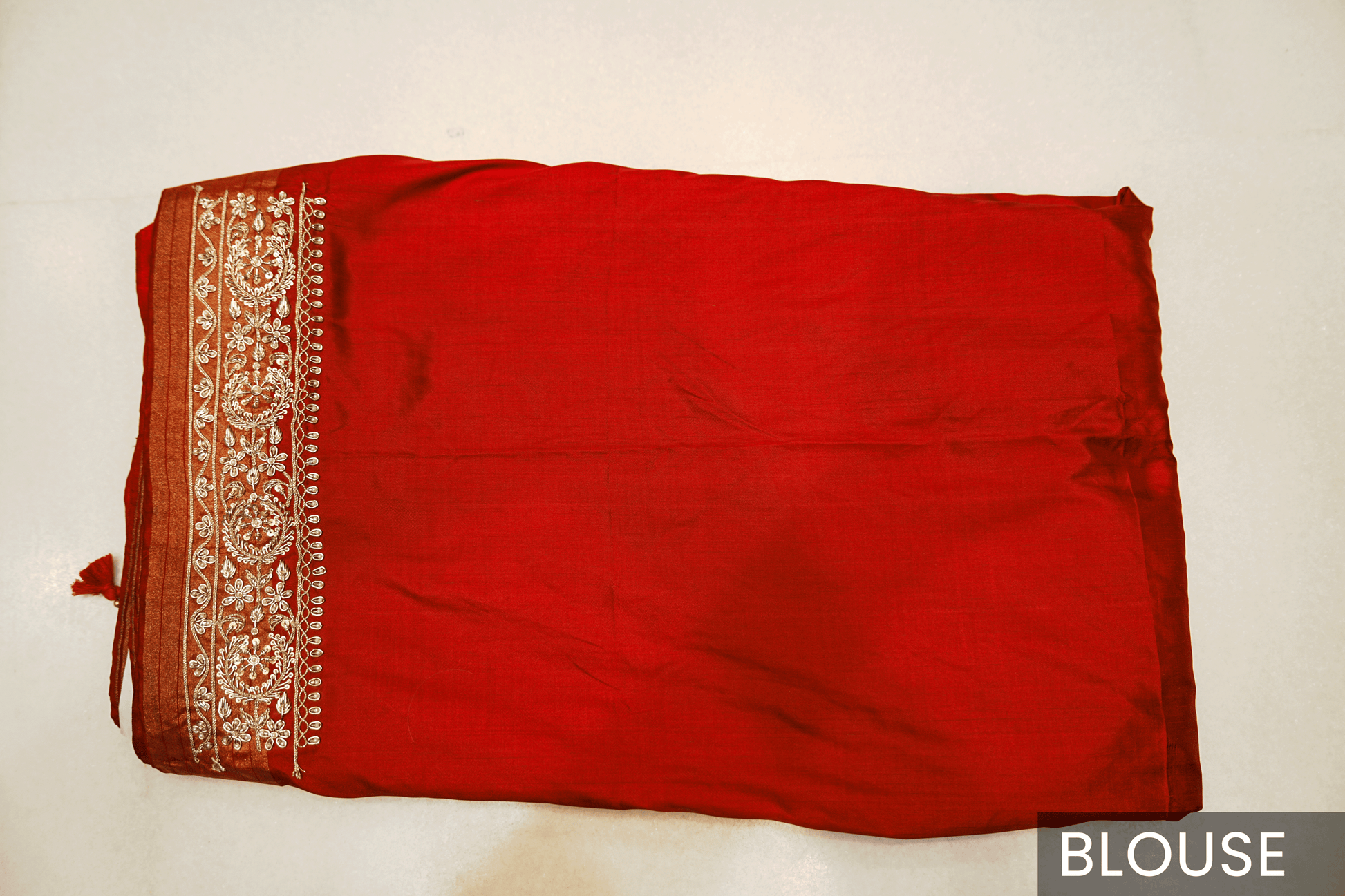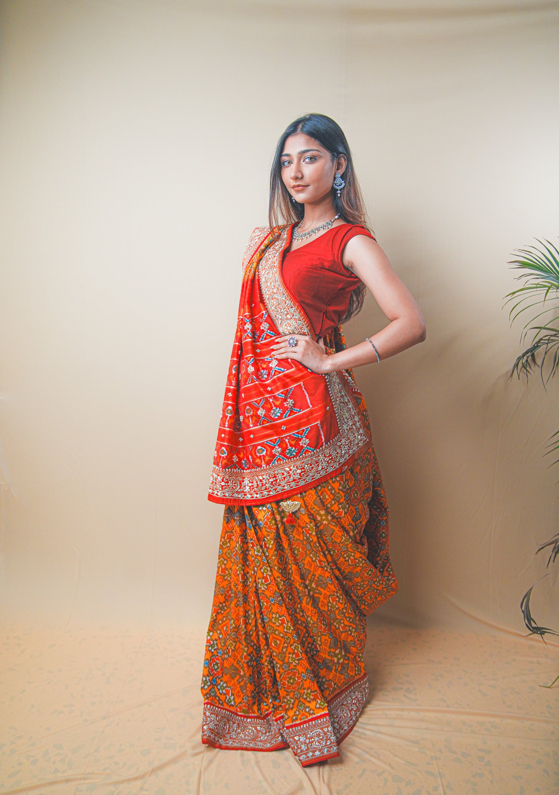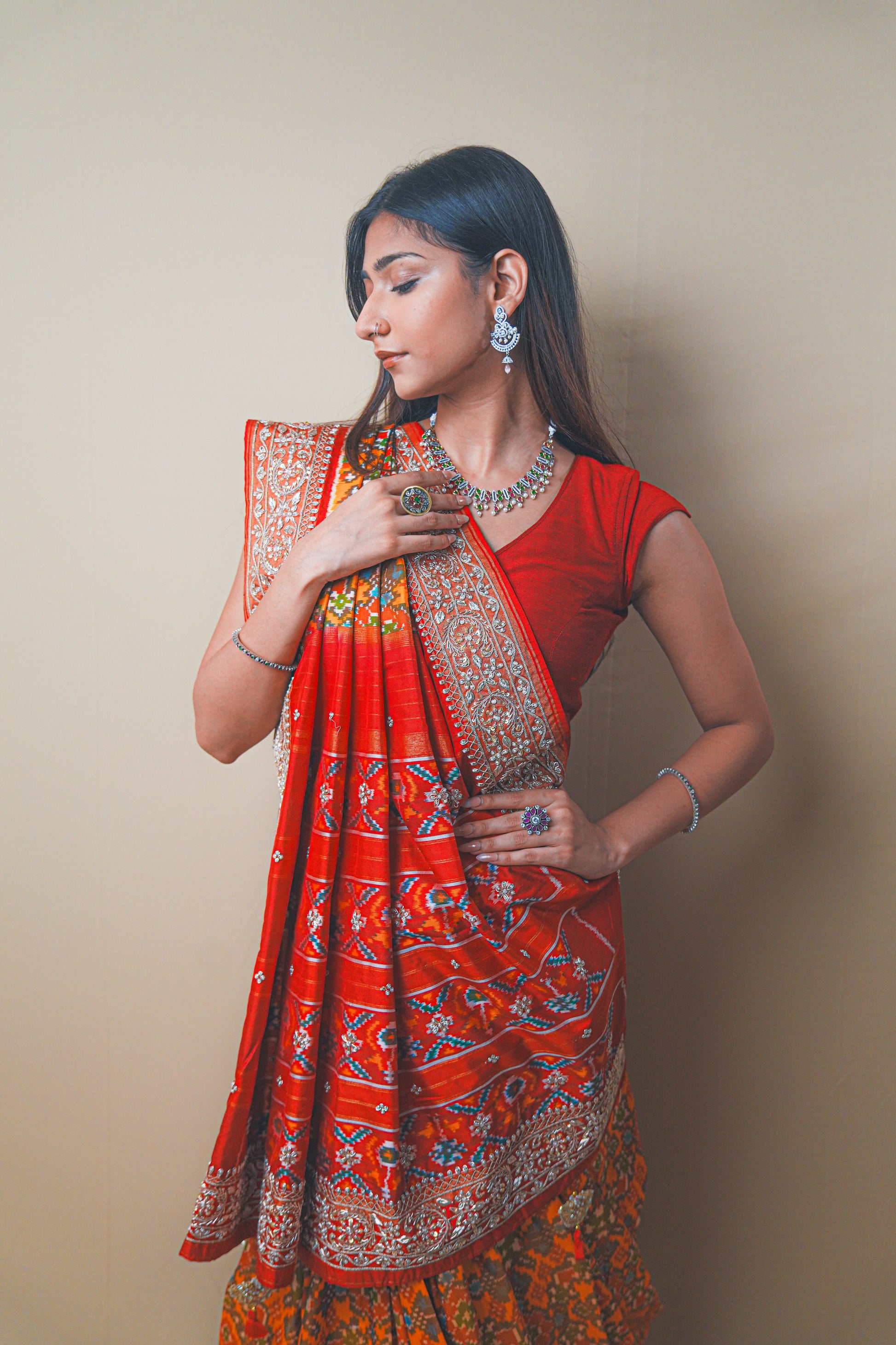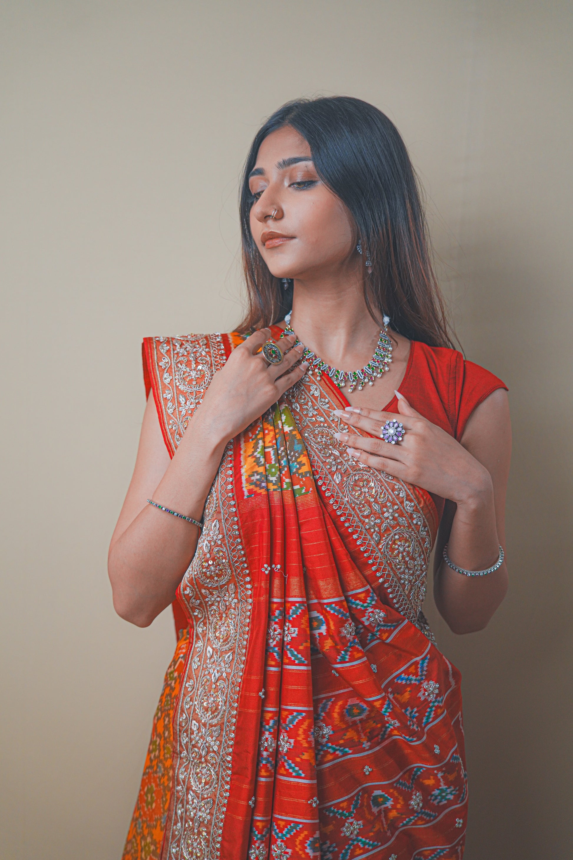 Red & Orange Pure Ikat Patola Saree with Zardozi and Aari Embroidery