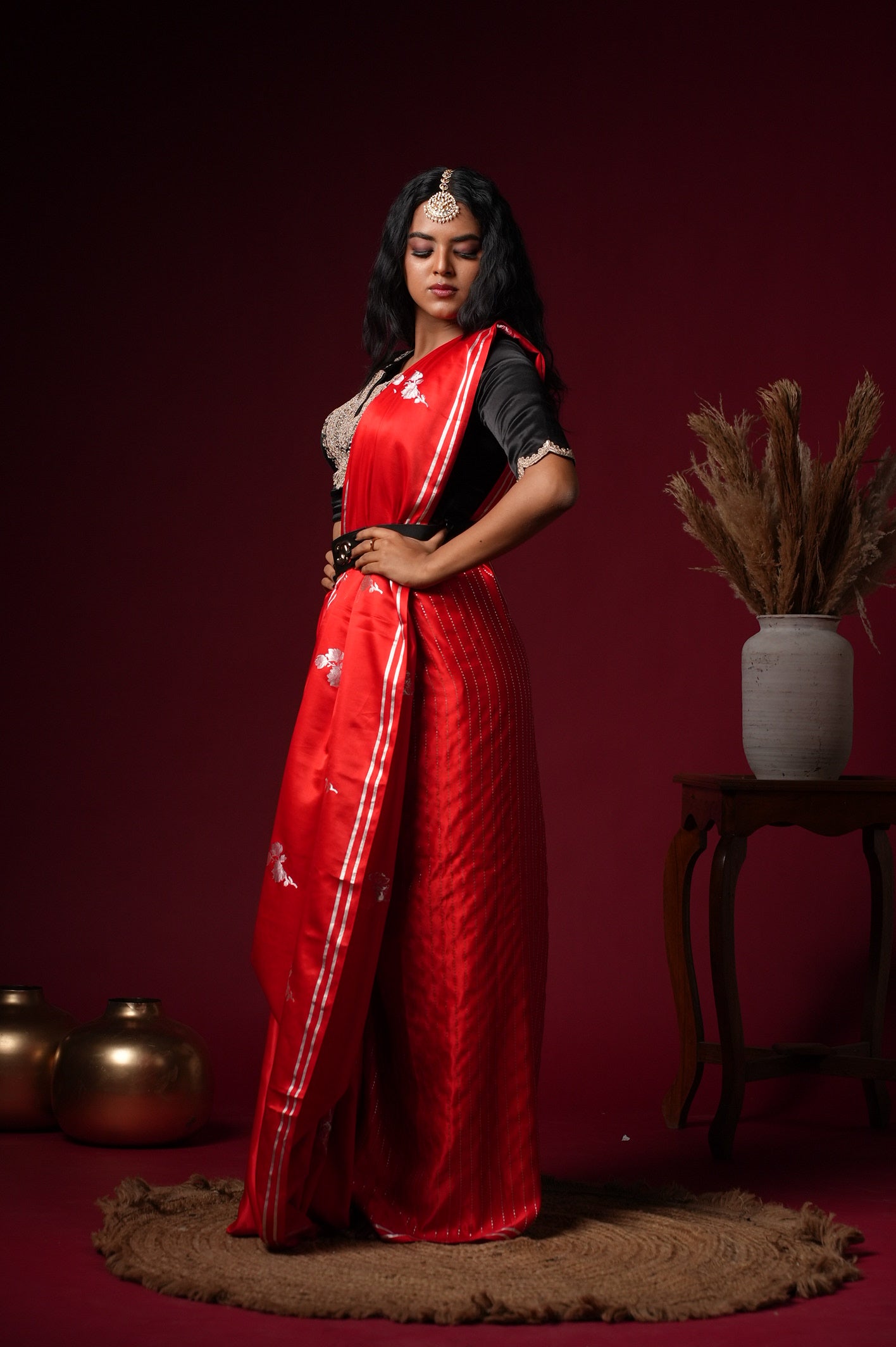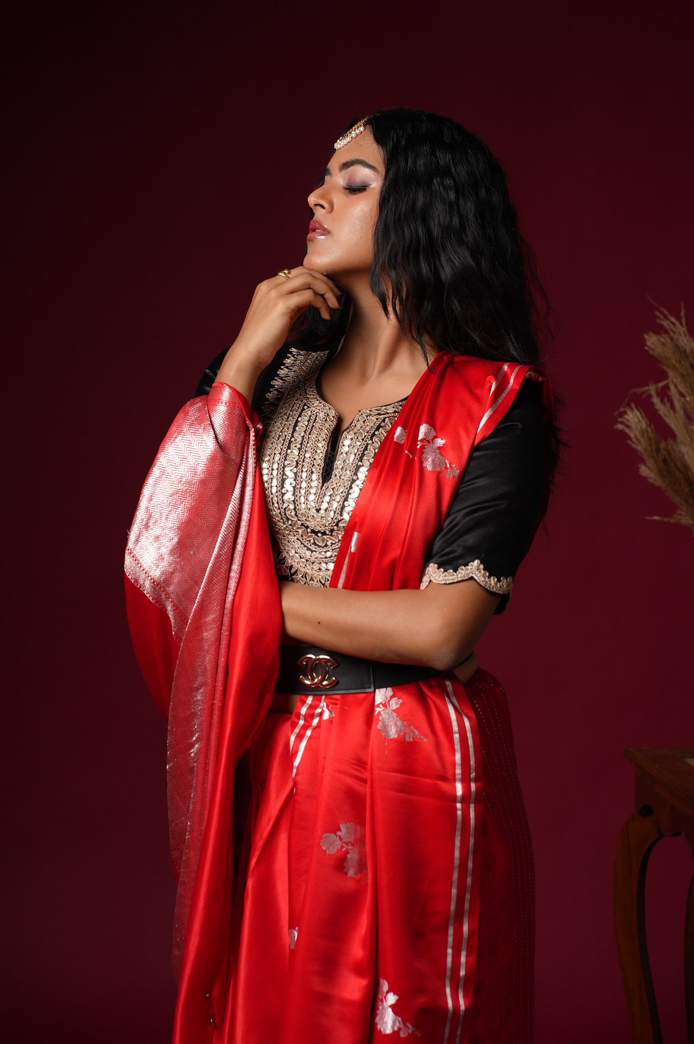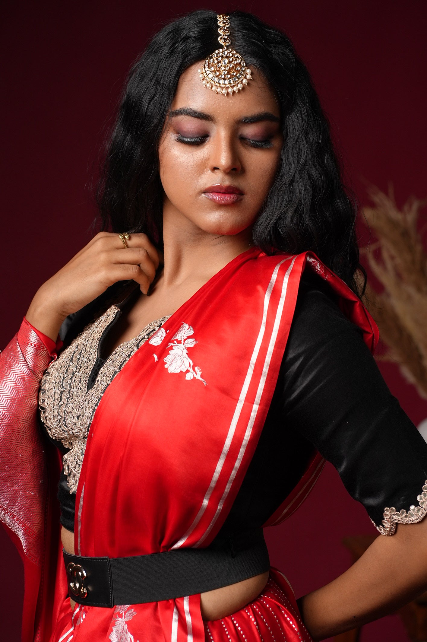 This saree redefines traditional elegance with its vibrant red silk base adorned with silver floral motifs. The contemporary black blouse, embellished with intricate detailing, adds a luxurious touch, while the statement belt gives the ensemble a modern silhouette. Perfect for festive celebrations, weddings, or evening events, this saree effortlessly blends tradition with contemporary fashion.