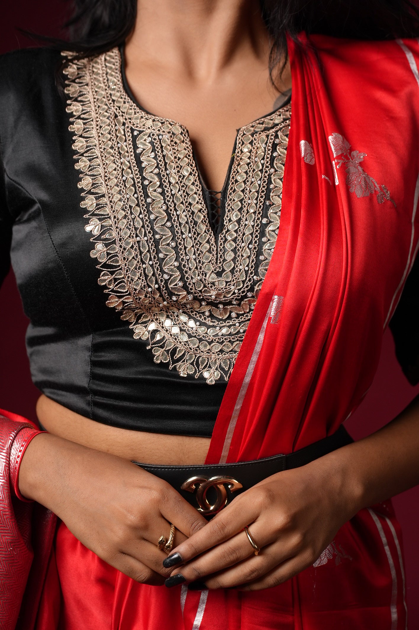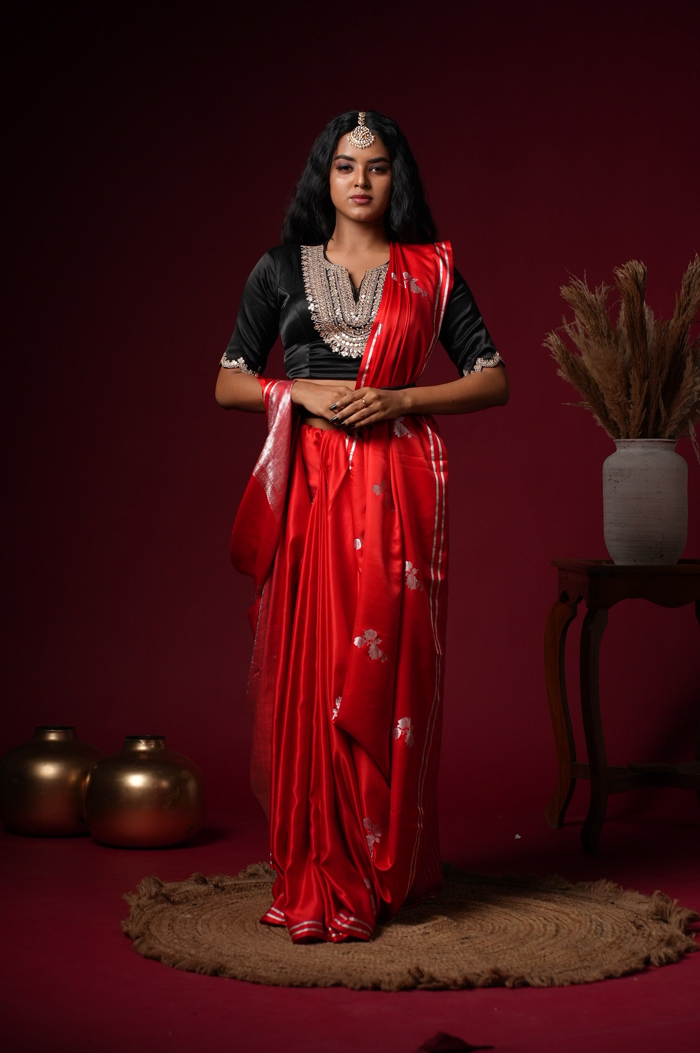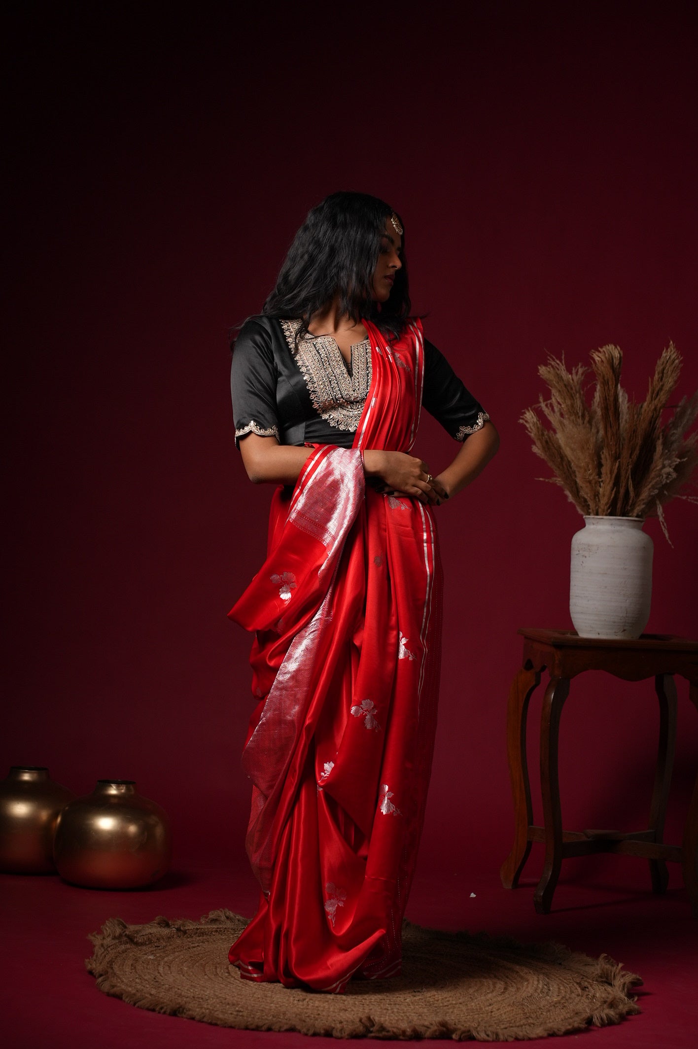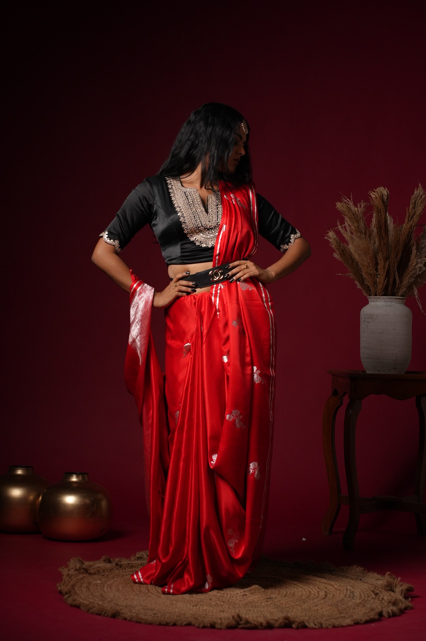 This saree redefines traditional elegance with its vibrant red silk base adorned with silver floral motifs. The contemporary black blouse, embellished with intricate detailing, adds a luxurious touch, while the statement belt gives the ensemble a modern silhouette. Perfect for festive celebrations, weddings, or evening events, this saree effortlessly blends tradition with contemporary fashion.