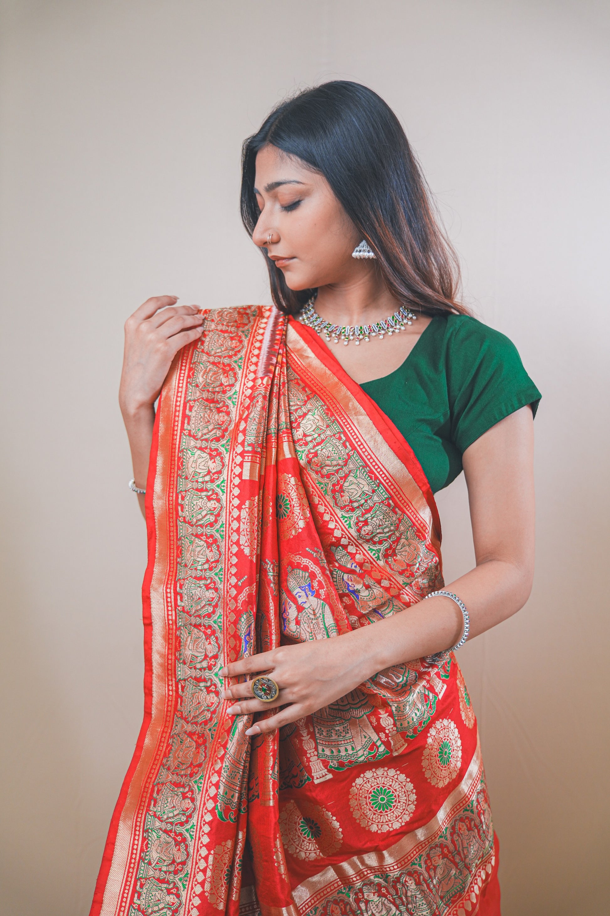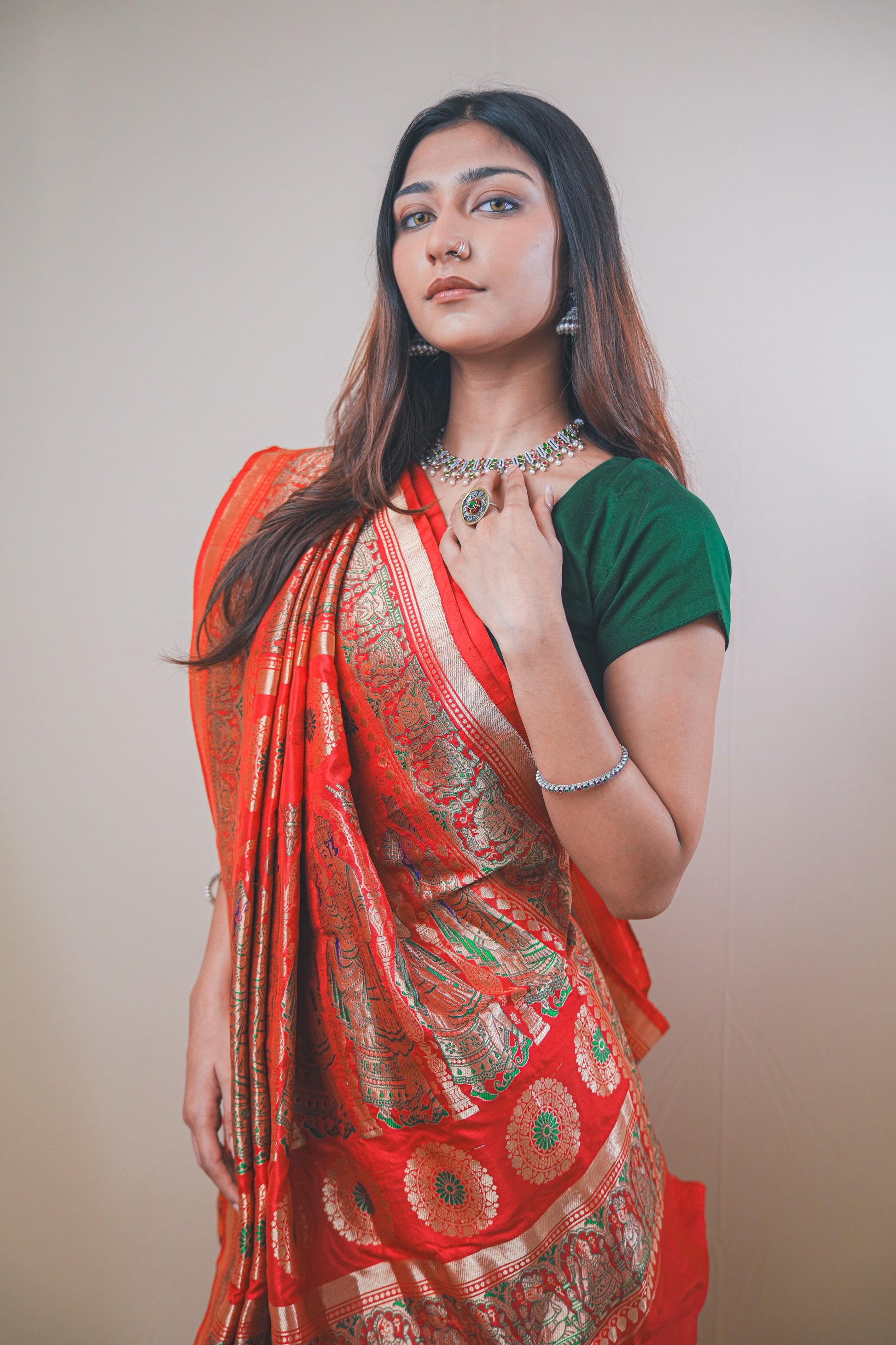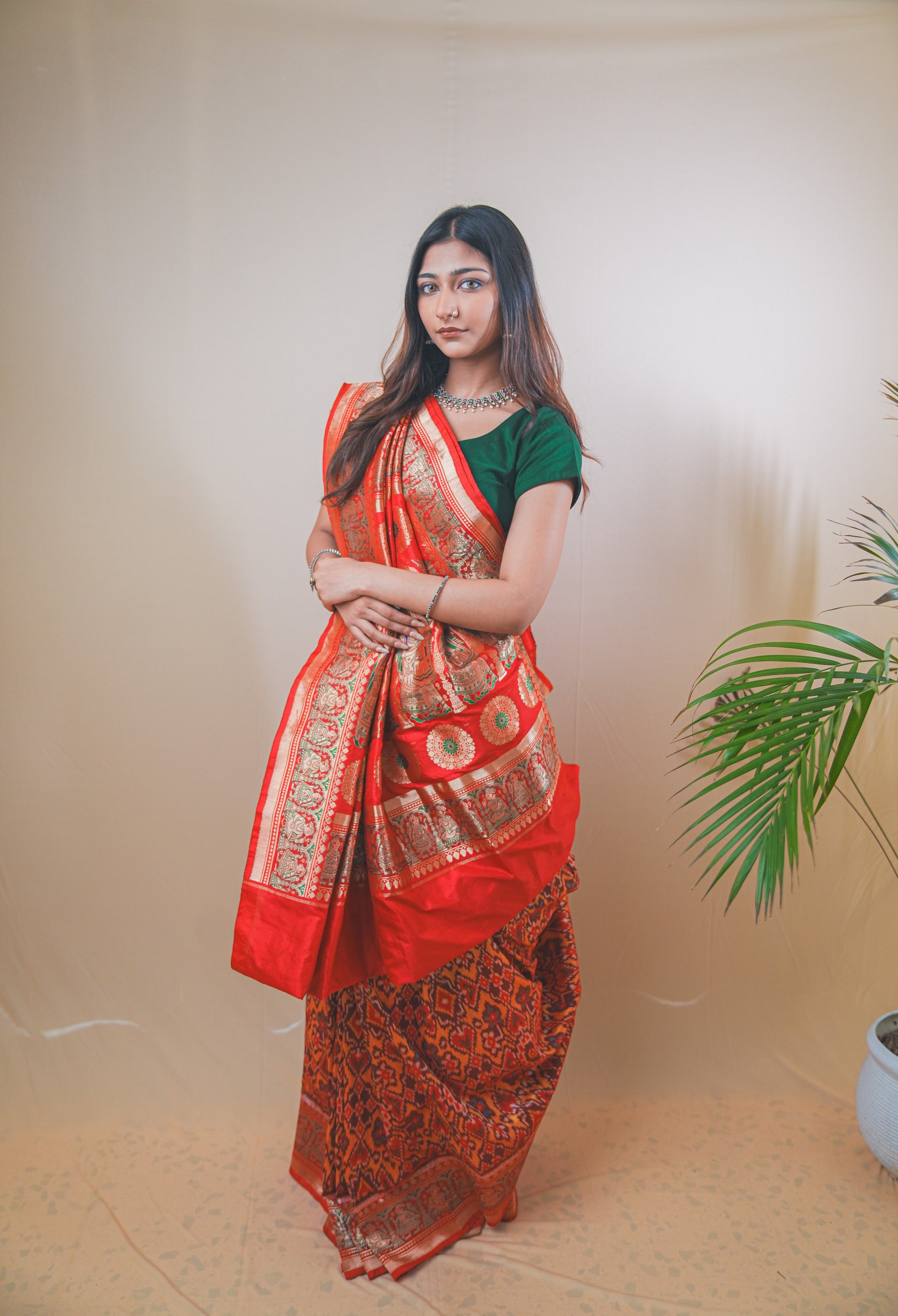 A rich fusion of tradition and elegance, this saree features classic Patola ikkat weaves paired with a bold Amdavadi border. Crafted in pure silk, it's perfect for festive and cultural occasions with a touch of heritage charm.